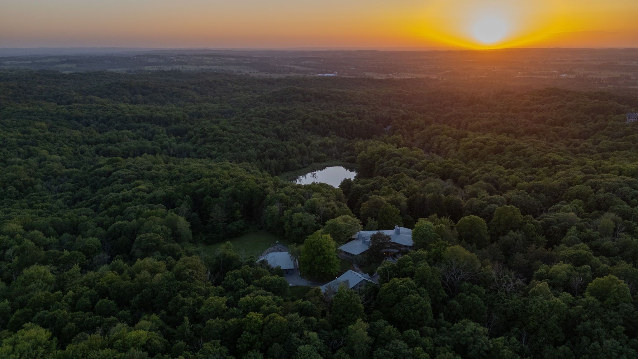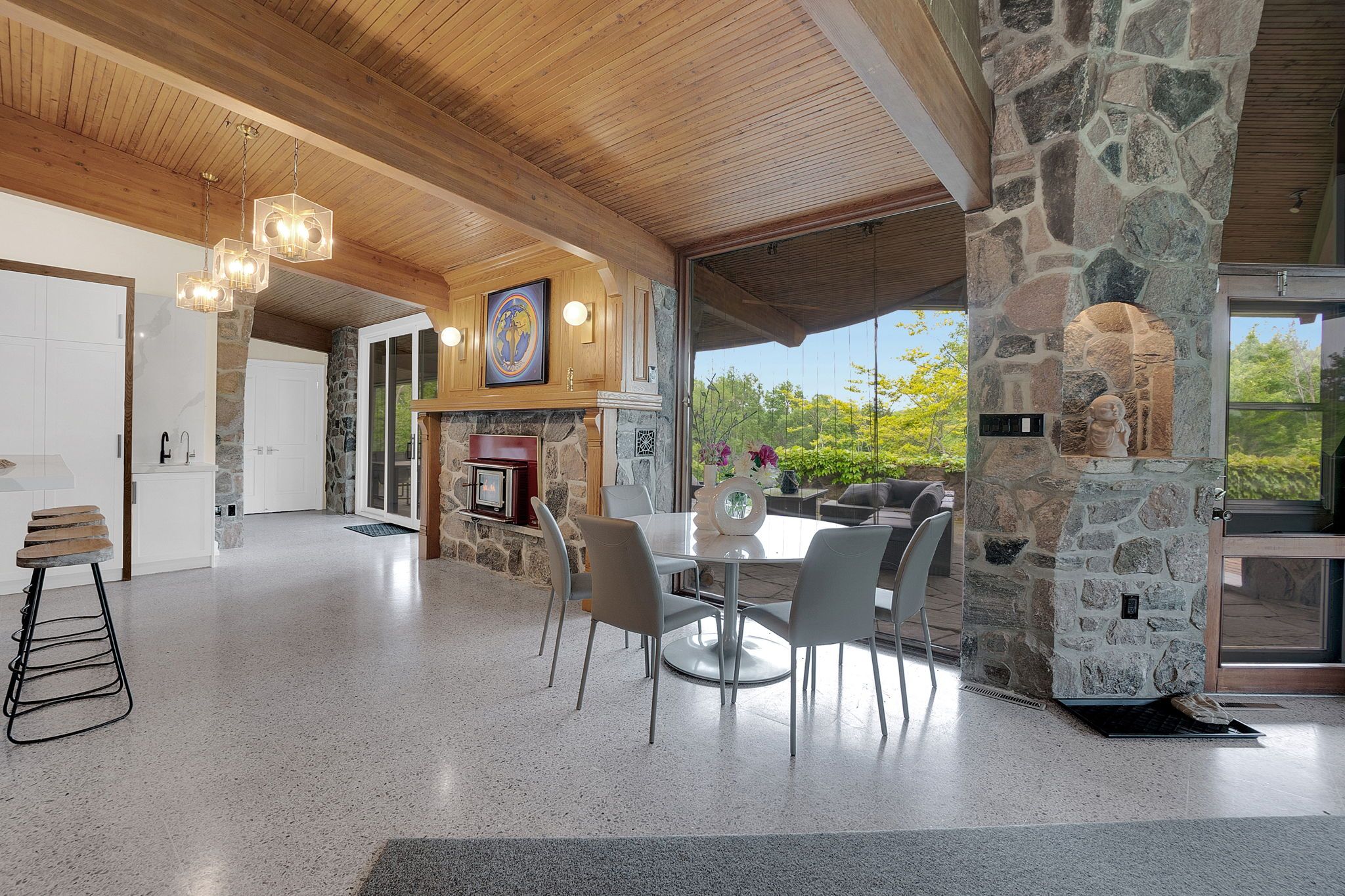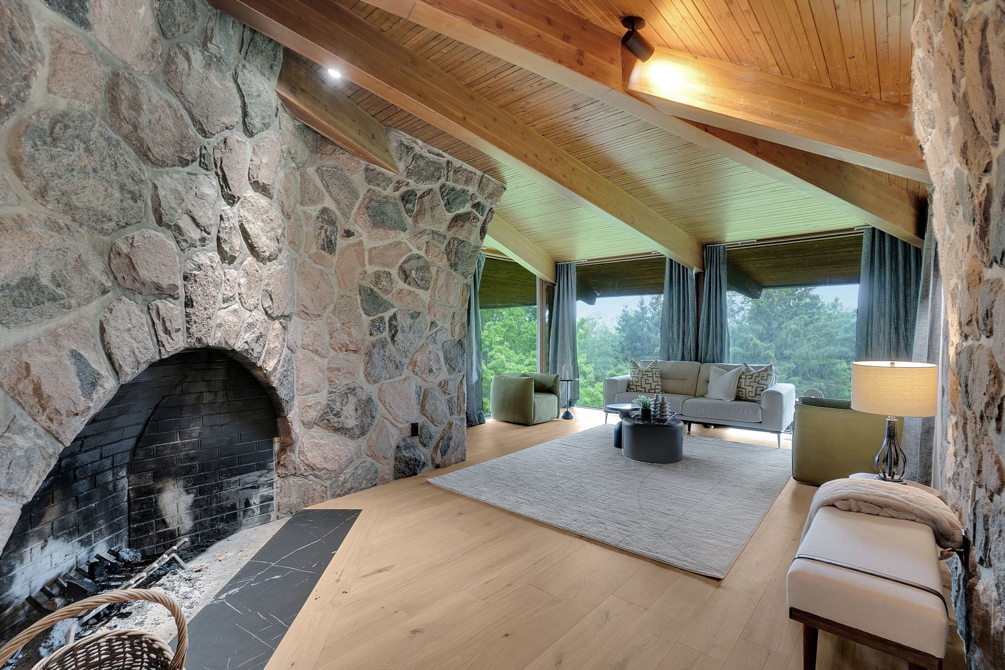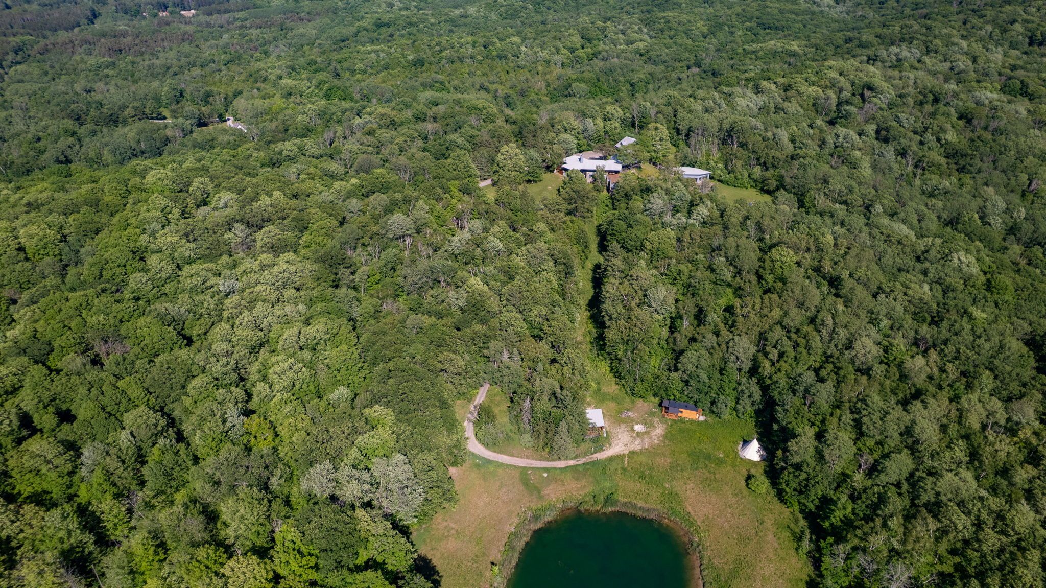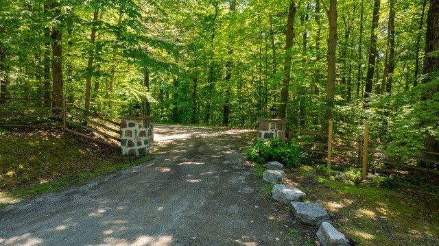 Welcome to an extraordinary estate tucked away behind welcoming stone pillars and a winding forested driveway! This is a work of art designed by the legendary Grant Whatmough and Gardiner Cowan, with distinctive Frank Lloyd Wright style of Architecture. This iconic Mid-Century Modern residence is gracefully integrated into 32 acres of majestic land, where nature and architecture exist in perfect harmony. From the moment you approach the stunning entry door, you're drawn into a world of timeless design and serene beauty. This home is lovingly maintained with extensive renovations, while preserving the character and soul of this home, Including Floor-to-ceiling windows bring the outdoors in, Stone fireplaces indoor and out, original stone walls and impressive wood beams throughout. Spanning approximately 5,000 sq ft, the main residence features 6 bedrooms, 7 bathrooms, an office, a meditation room, and a separate nanny suite. Multiple terraces and decks surround the home, offering breathtaking views of the land, and a tranquil lake creating the feel of a private luxury retreat. This property features a rare second home- fully renovated and approximately 3,500 sq ft-offering 3 bedrooms, 4 bathrooms, and a massive loft space! This second home is ideal for an extended family! There is an additional Yoga studio with an outdoor shower! a Detached garage/ workshop, a charming cedar Cabin with Sauna and Cold plunge, a Covered cabana for entertaining or relaxing on the property. This is a once-in-a-lifetime opportunity to own an architecturally significant estate in the prestigious King Township. With unmatched privacy, lush surroundings, and two beautifully appointed homes, this property is truly a timeless work of art. Don't Miss it!