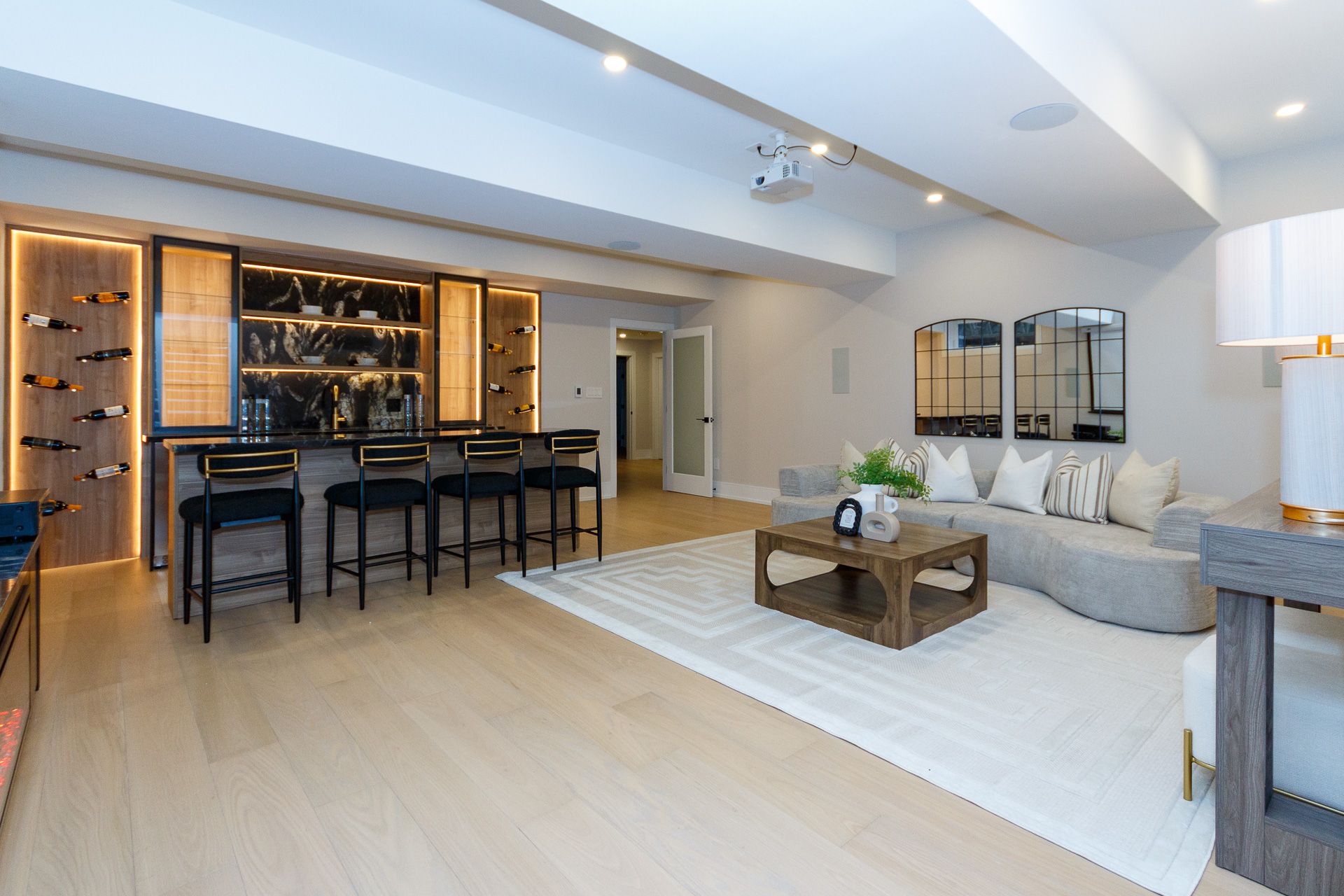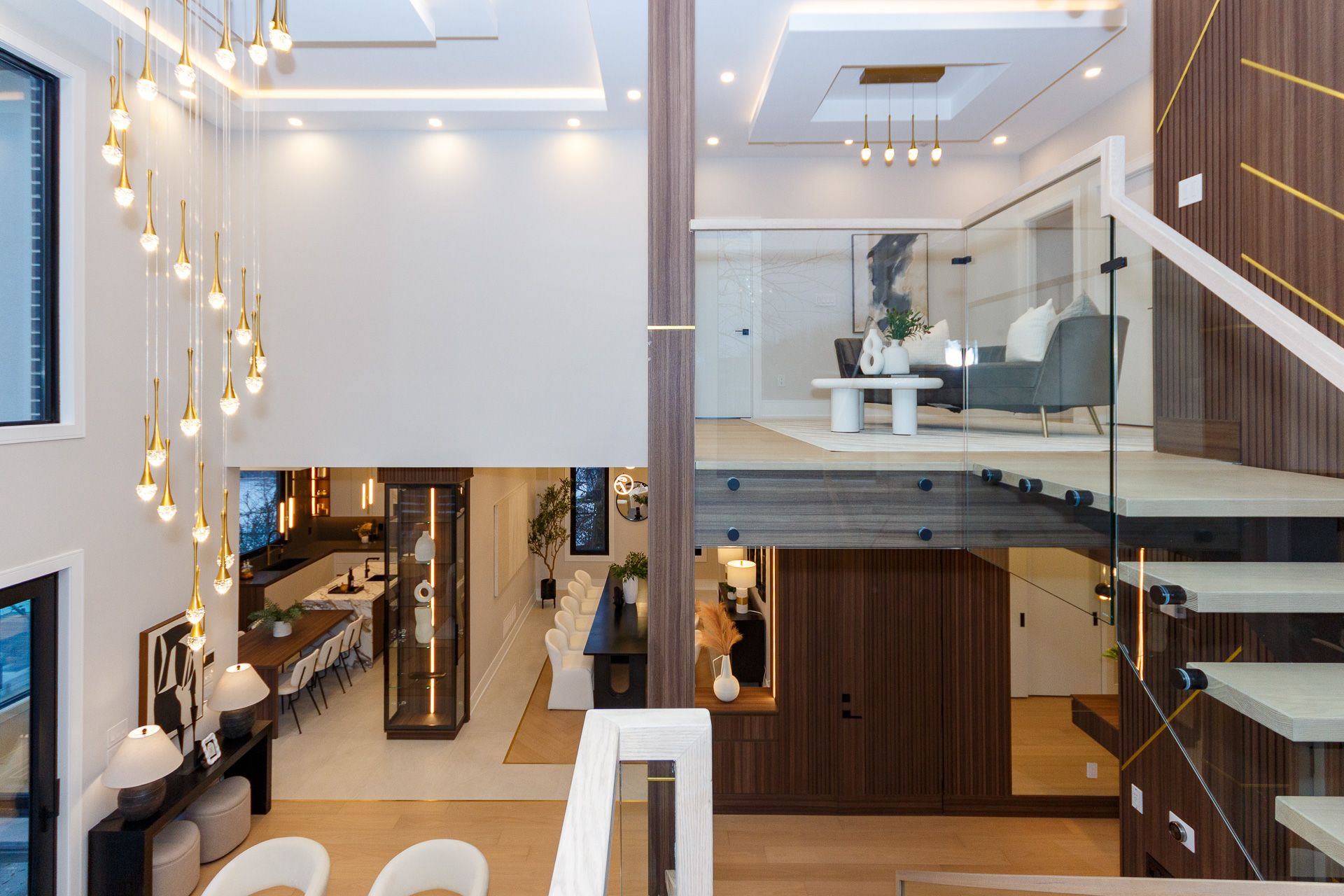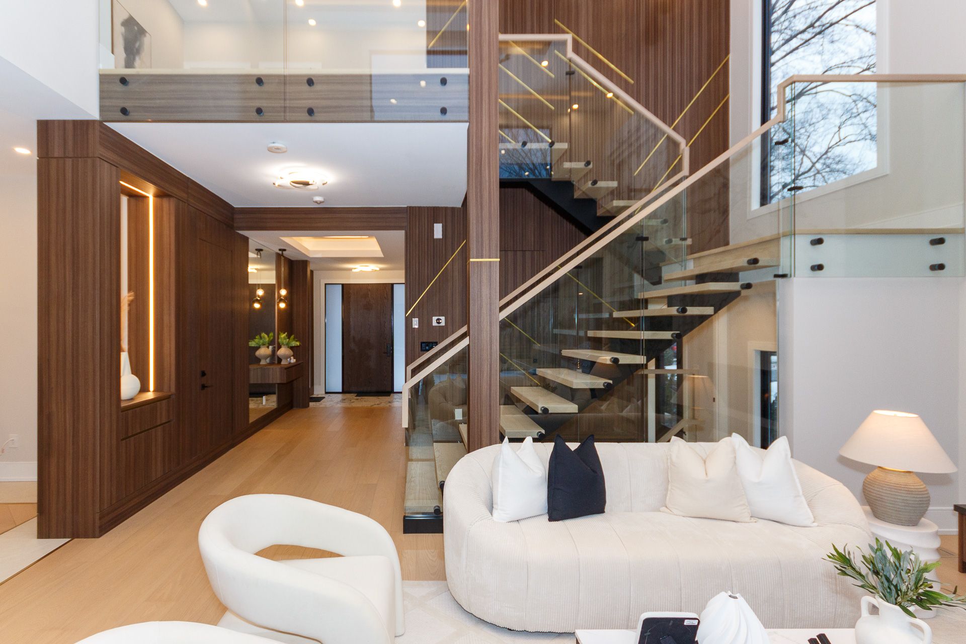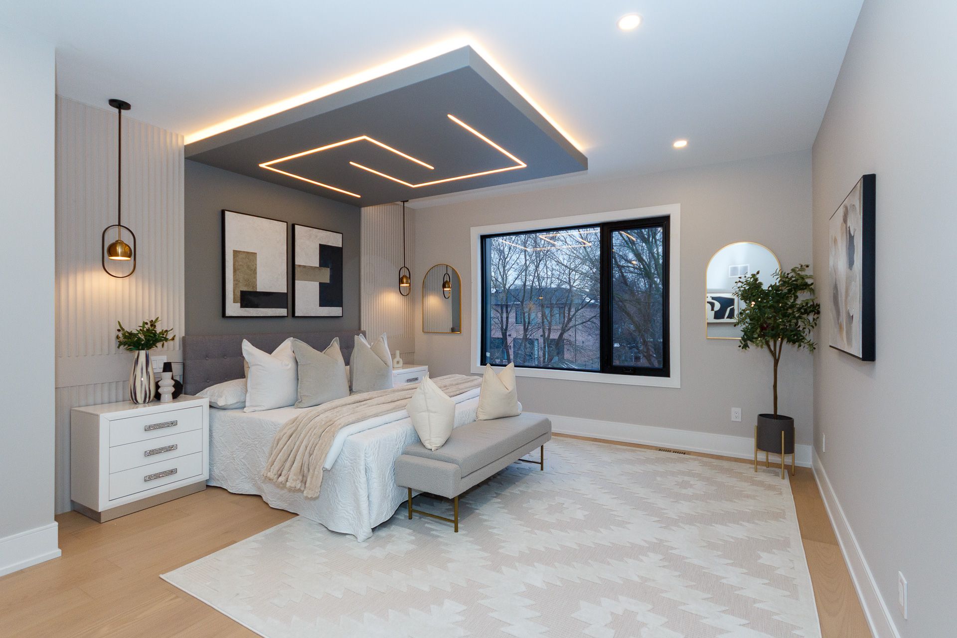 Exquisite custom-built luxury home available for lease in the prestigious Mineola neighbourhood, meticulously designed by Hilal Company & Inspiration Design, and crafted by Eaglecrest New Homes Inc.This breathtaking 5,500+ sq ft residence perfectly combines timeless elegance, modern sophistication, and superior craftsmanship. Every detail has been thoughtfully curated, from the grand entrance to the bespoke millwork, artisan paneling, and striking feature walls that define the interiors.Step into the main floor to experience soaring 20-foot ceilings and floor-to-ceiling windows that flood the space with natural light. The dramatic 17-foot porcelain fireplace serves as a stunning focal point for the open-concept family and living areas. A chef-inspired kitchen, featuring integrated Jenn Air appliances, luxurious countertops, Italian porcelain, and a dedicated breakfast area, seamlessly connects to formal dining and entertaining spaces. A bright home office, ultra-modern powder room, and mudroom with side entrance complete the main level with thoughtful functionality.The upper level offers a serene primary suite retreat, featuring a spa-inspired ensuite and expansive walk-in closet. Three additional bedrooms each include private ensuites and walk-in closets, ensuring comfort and privacy for every family member. A full laundry room adds convenience and efficiency to the upper level. The fully finished lower level is designed for entertainment and wellness, with a vast recreation room featuring a home theatre, granite wet bar with wine display, and walk-up access to the backyard. A dedicated gym and wellness area includes a spa bathroom with jetted tub, while a private in-law suite offers a kitchenette, living space, bathroom, and walk-in closet. Additional storage and laundry complete this level. Step outside to a beautifully landscaped outdoor oasis with covered and open-air decks, built-in BBQ, natural stone patio, and integrated outdoor speakers.