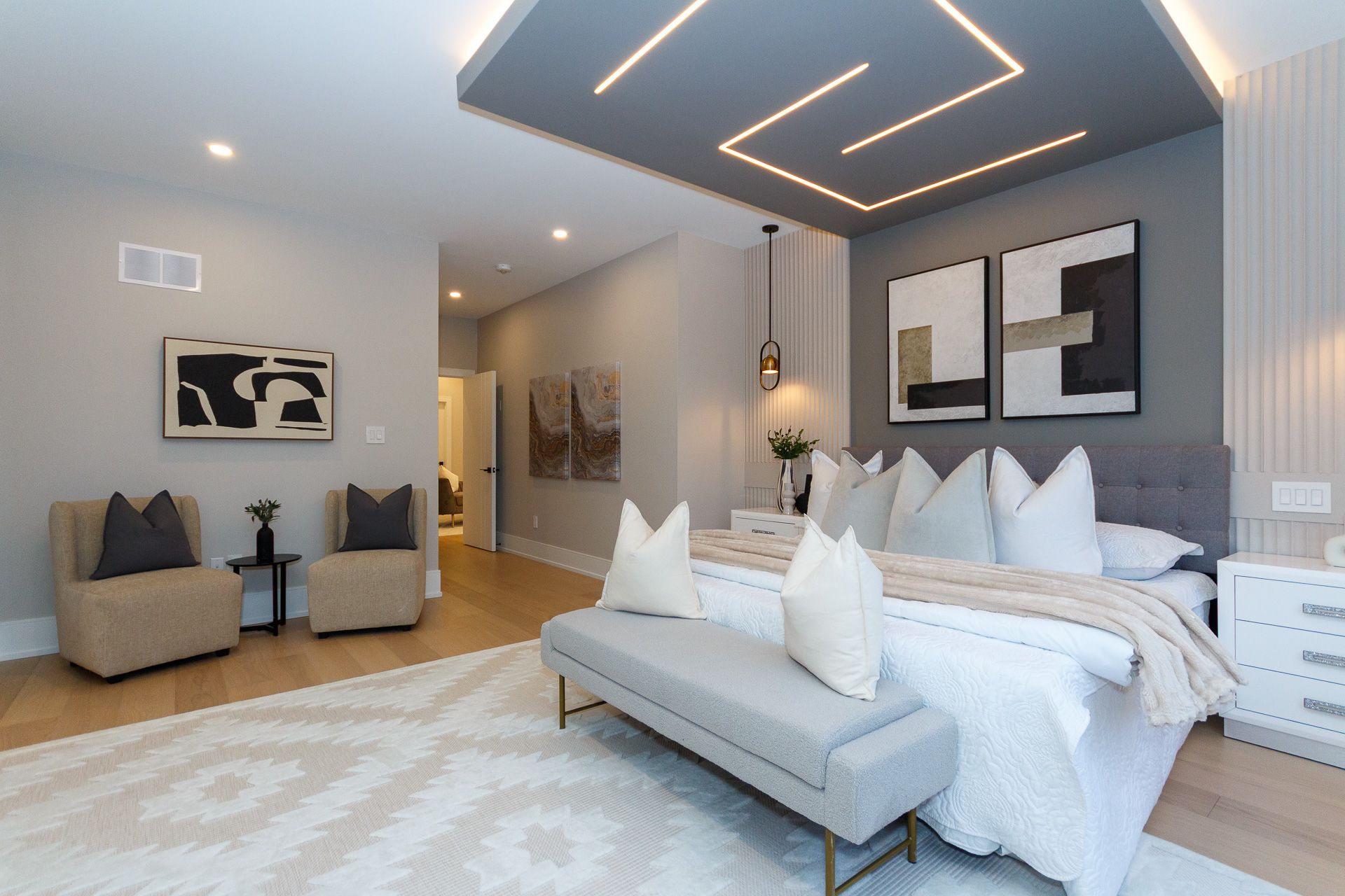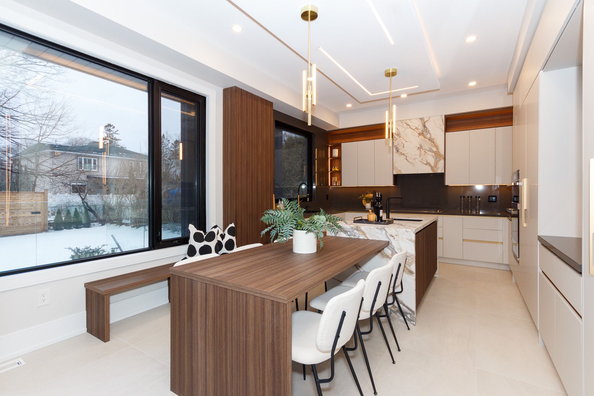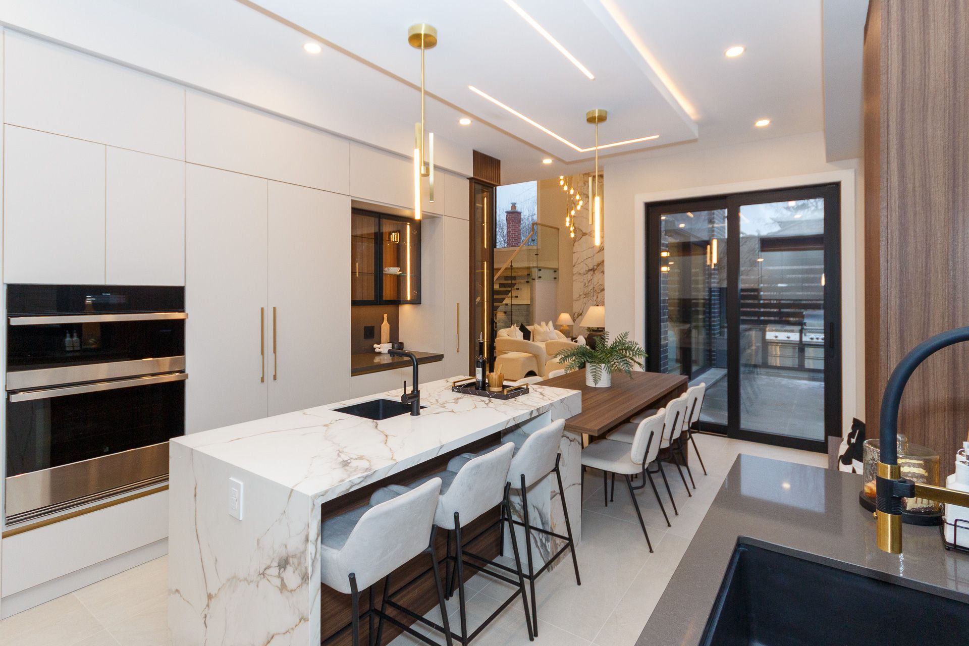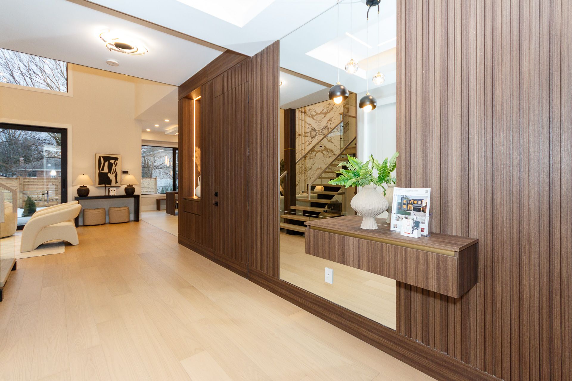 Exquisite custom-built luxury home available for lease in the prestigious Mineola neighbourhood, meticulously designed by Hilal Company & Inspiration Design, and crafted by Eaglecrest New Homes Inc.This breathtaking 5,500+ sq ft residence perfectly combines timeless elegance, modern sophistication, and superior craftsmanship. Every detail has been thoughtfully curated, from the grand entrance to the bespoke millwork, artisan paneling, and striking feature walls that define the interiors.Step into the main floor to experience soaring 20-foot ceilings and floor-to-ceiling windows that flood the space with natural light. The dramatic 17-foot porcelain fireplace serves as a stunning focal point for the open-concept family and living areas. A chef-inspired kitchen, featuring integrated Jenn Air appliances, luxurious countertops, Italian porcelain, and a dedicated breakfast area, seamlessly connects to formal dining and entertaining spaces. A bright home office, ultra-modern powder room, and mudroom with side entrance complete the main level with thoughtful functionality.The upper level offers a serene primary suite retreat, featuring a spa-inspired ensuite and expansive walk-in closet. Three additional bedrooms each include private ensuites and walk-in closets, ensuring comfort and privacy for every family member. A full laundry room adds convenience and efficiency to the upper level. The fully finished lower level is designed for entertainment and wellness, with a vast recreation room featuring a home theatre, granite wet bar with wine display, and walk-up access to the backyard. A dedicated gym and wellness area includes a spa bathroom with jetted tub, while a private in-law suite offers a kitchenette, living space, bathroom, and walk-in closet. Additional storage and laundry complete this level. Step outside to a beautifully landscaped outdoor oasis with covered and open-air decks, built-in BBQ, natural stone patio, and integrated outdoor speakers.