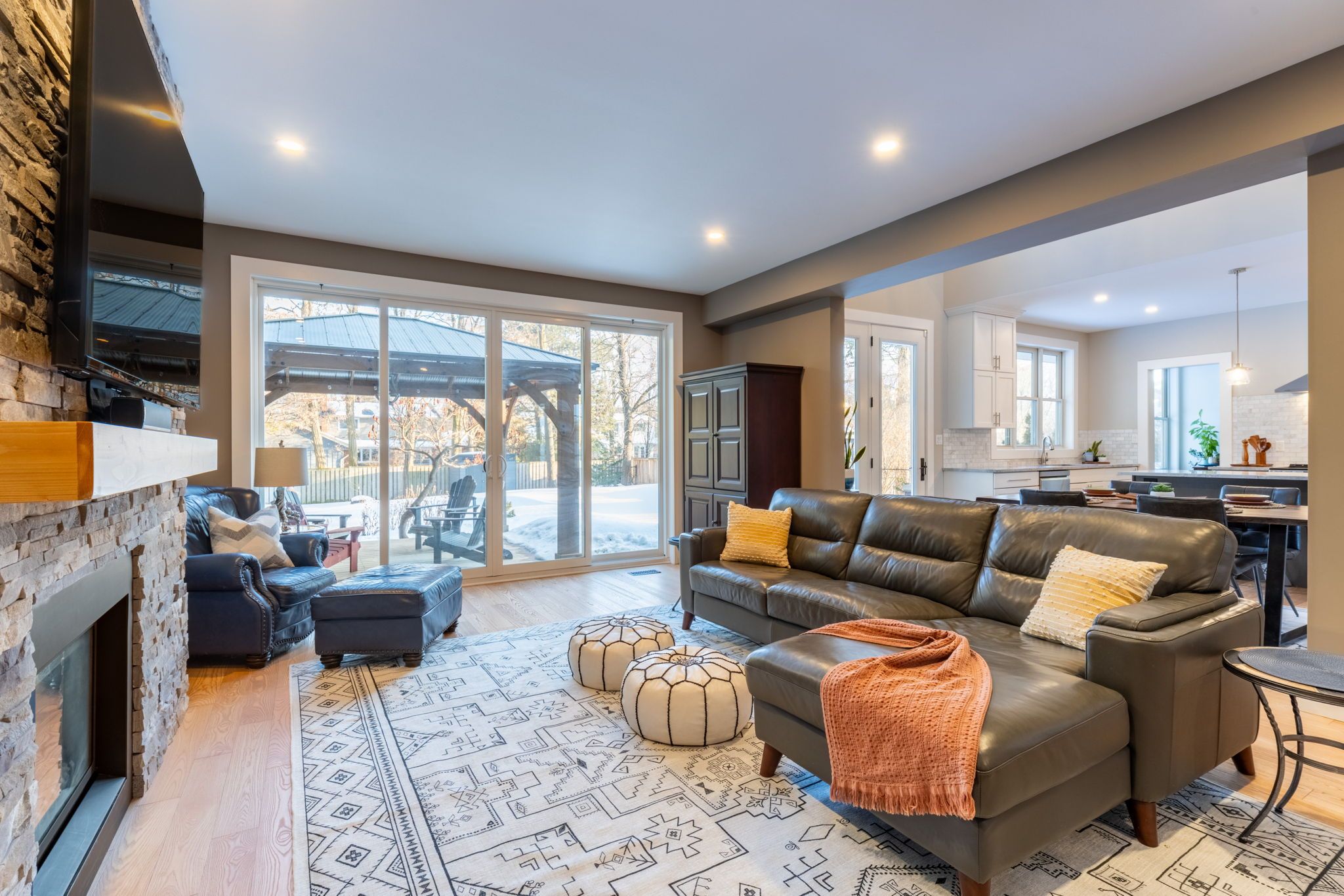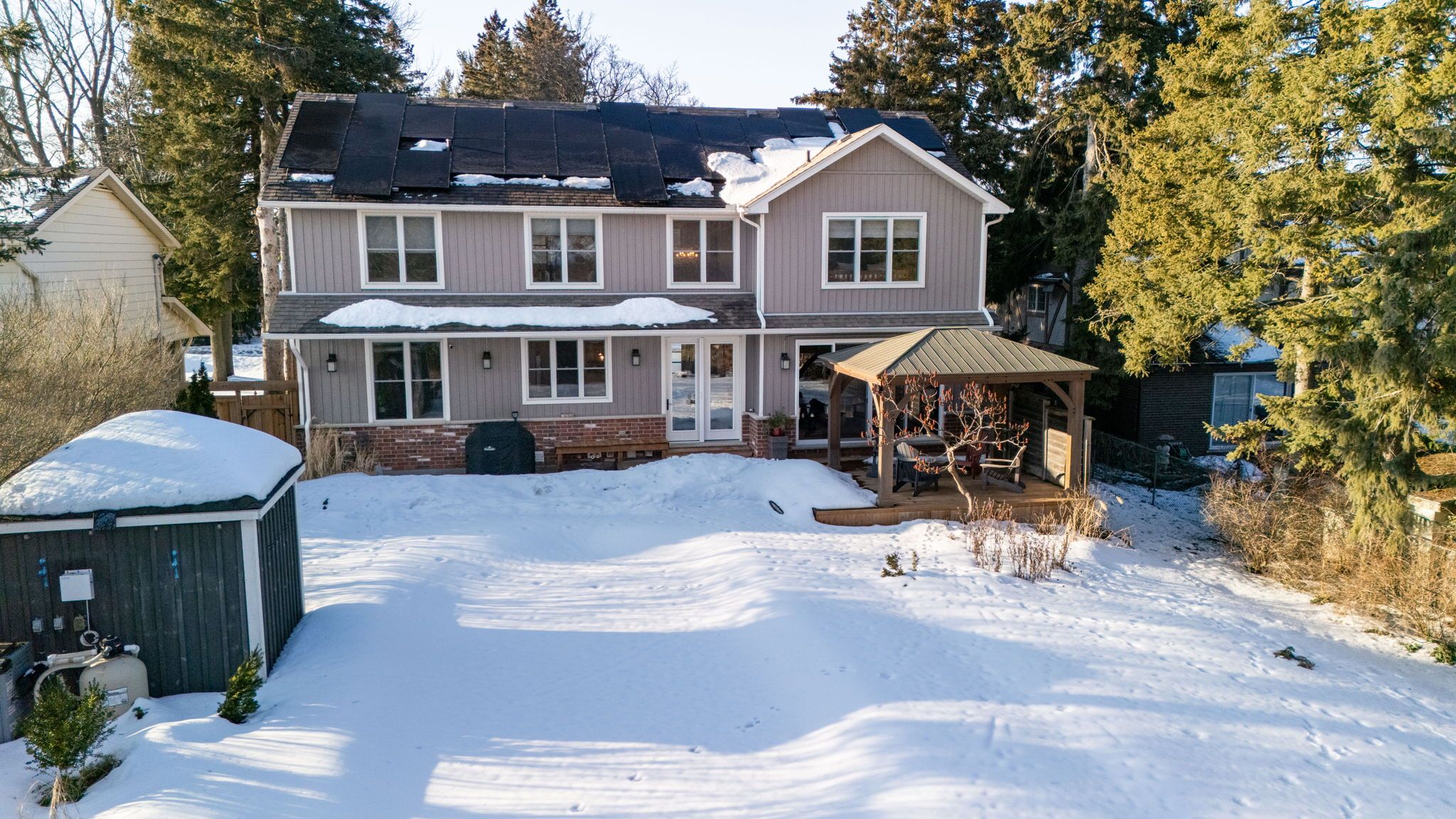 | Colonial Acres Multigenerational Home with Legal Accessory Suite & Heated Saltwater Pool | Located in Waterloo's highly sought-after Colonial Acres neighbourhood, this beautifully designed multigenerational home with legal accessory suite offers exceptional flexibility for extended family living or rental income. Built in 2013 and offering nearly 3,000 sq ft above grade, the main home features an open-concept kitchen with breakfast bar, coffee station and pantry, a dining area with soaring ceilings, spacious living room with gas fireplace, family room or flex space, separate office, and convenient main floor laundry. Upstairs you'll find three spacious bedrooms including a primary retreat with walk-in closet and spa-like 5-piece ensuite. The fully finished legal accessory apartment features its own kitchen, living and dining areas, bedroom, bathroom, ensuite laundry, and a private walk-up entrance, while still allowing for multiple options to re-establish interior access from the main floor should a future owner wish to integrate the space. Step outside to a private, landscaped backyard oasis featuring a heated in-ground saltwater pool, patio, gas bbq hookup, gazebo, and plenty of space to entertain. Energy-conscious buyers will appreciate the 24 panel solar system generating approximately 8600kWh annually, significantly offsetting the home's energy consumption, two separate heat pumps (one per unit), and fire and sound separation insulation between units. Situated on a generous 66 x 171 ft lot with double garage and parking for six vehicles, this is a rare opportunity to own a versatile family home in one of Waterloo's most established and desirable communities.