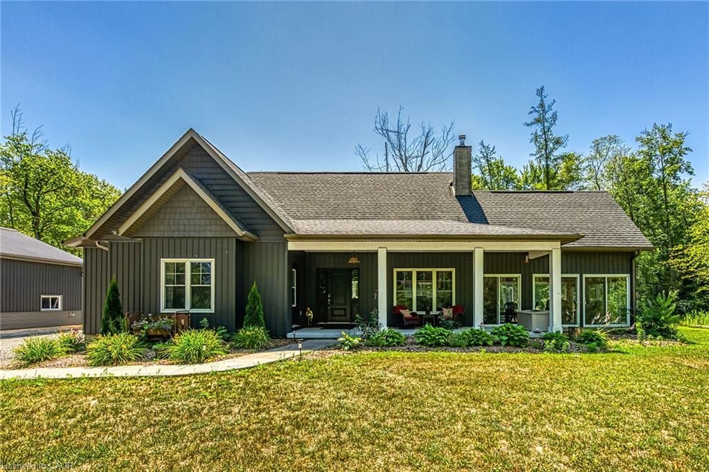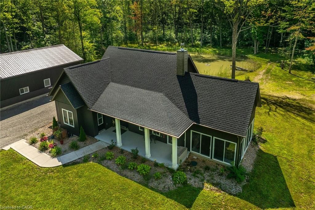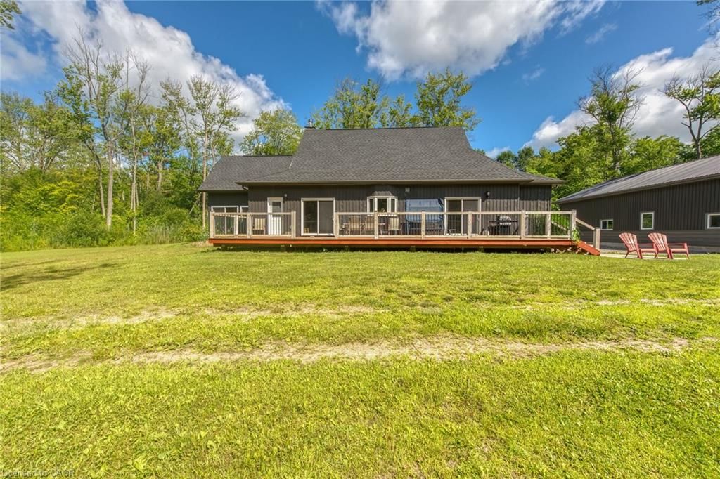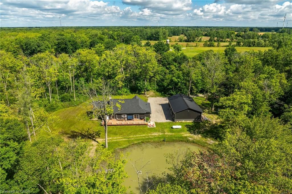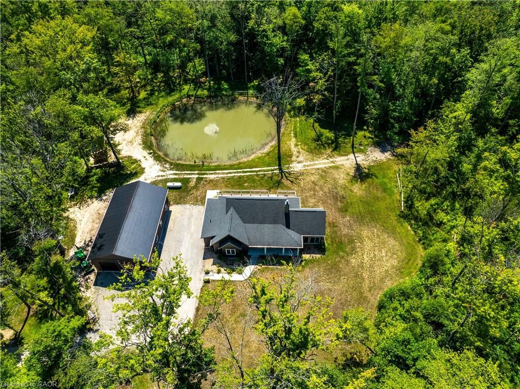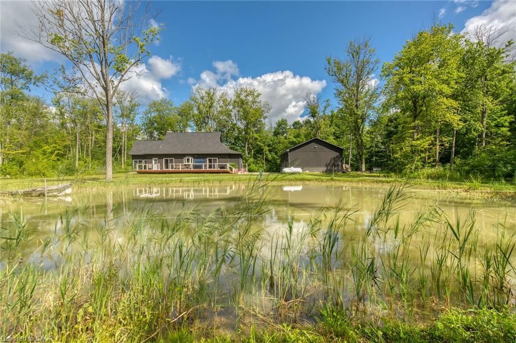 Perfect country package! Rare opportunity to own a secluded 52-acre multi-purpose property, frequented by deer, wild turkeys, rabbits, and various bird species. The land comprises mature forest and wetlands, including maple, ash, and oak trees, with nature trails and road frontages on three sides for privacy. The property features a 1,436 sq ft bungalow, custom built in 2020, with two main floor bedrooms, two and a half bathrooms, and an unfinished basement suitable for additional living space and more bedrooms. Additional structures include a 50'x30'x18' workshop equipped with a car hoist, suited for hobbyists or contractors. The main floor has an open concept with a cathedral ceiling finished in tongue-and-groove pine, an eat-in kitchen with custom maple cabinetry, quartz countertops, a bay window, and stainless-steel appliances. The living room includes a wood fireplace, scraped hardwood floors, and patio doors to a rear deck overlooking the aerated pond and wooded area. The great room provides panoramic outdoor views through wall-to-wall sliding patio doors, a cathedral pine ceiling, and an electric fireplace. Both main floor bedrooms are spacious; the principal bedroom has an ensuite, walk-in closet, and deck access. The basement contains laundry facilities, a utility room, storage, and roughed-in plumbing for bathrm with sewage ejector. Notable amenities include a hi-eff propane furnace, central air, a 2,500-gal water cistern, indoor and outdoor sump pumps, a modern septic system, and 100-amp electrical service. The property is situated on a year-round paved road in a tranquil setting surrounded by a serene forest, with landscaped grounds, vibrant perennial gardens, and a large driveway that can accommodate multiple vehicles and a boat or RV. Located near Dunnville's amenities, it is within a 30-60 minute drive to Hamilton and Niagara. This property offers a cottage-like ambiance for those interested in outdoor recreation and nature!