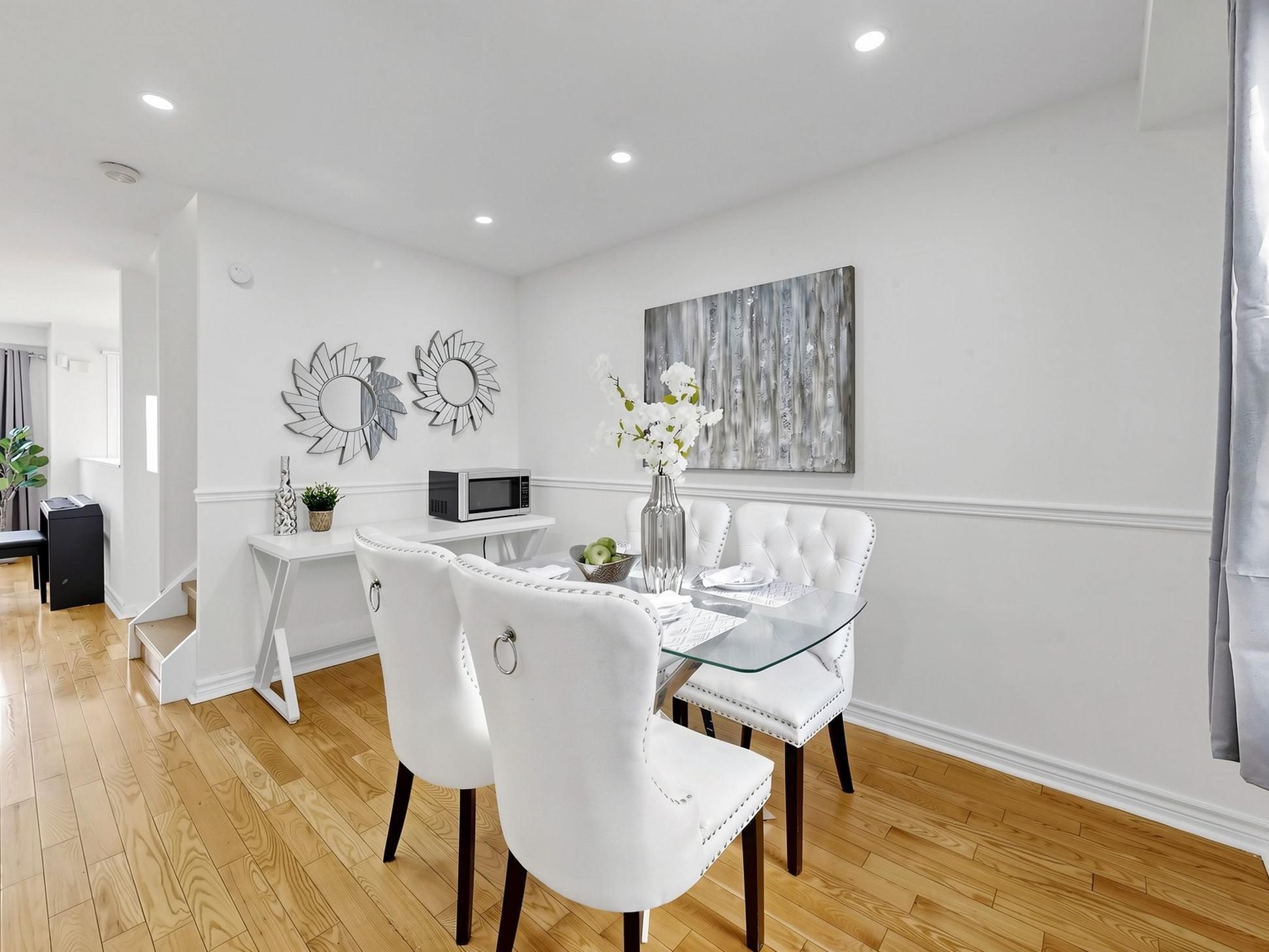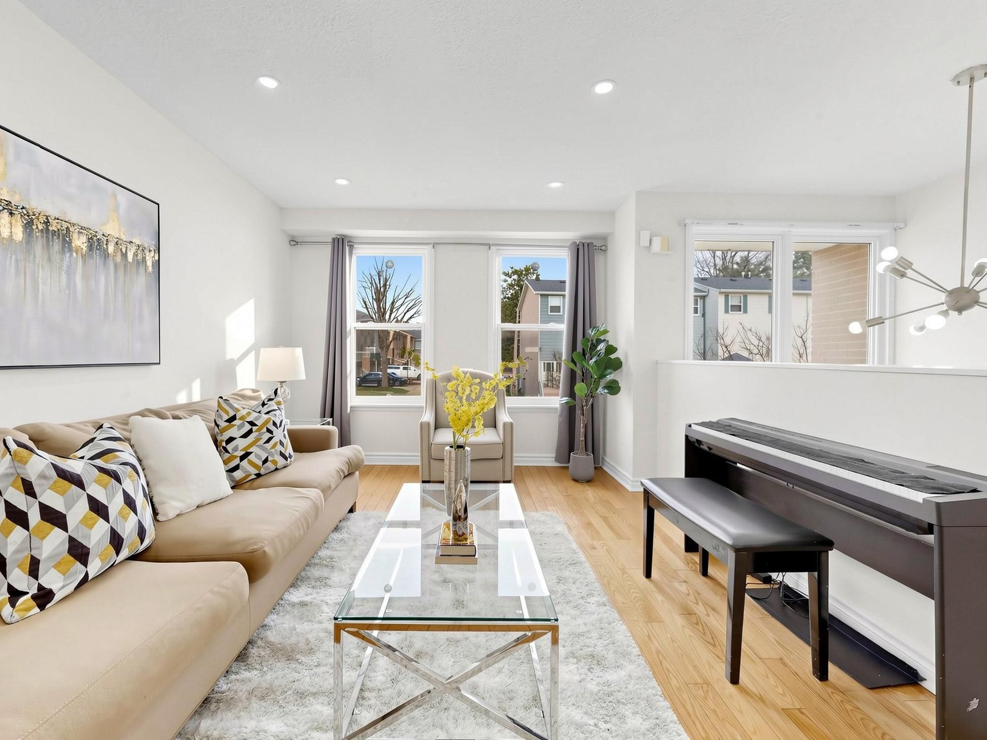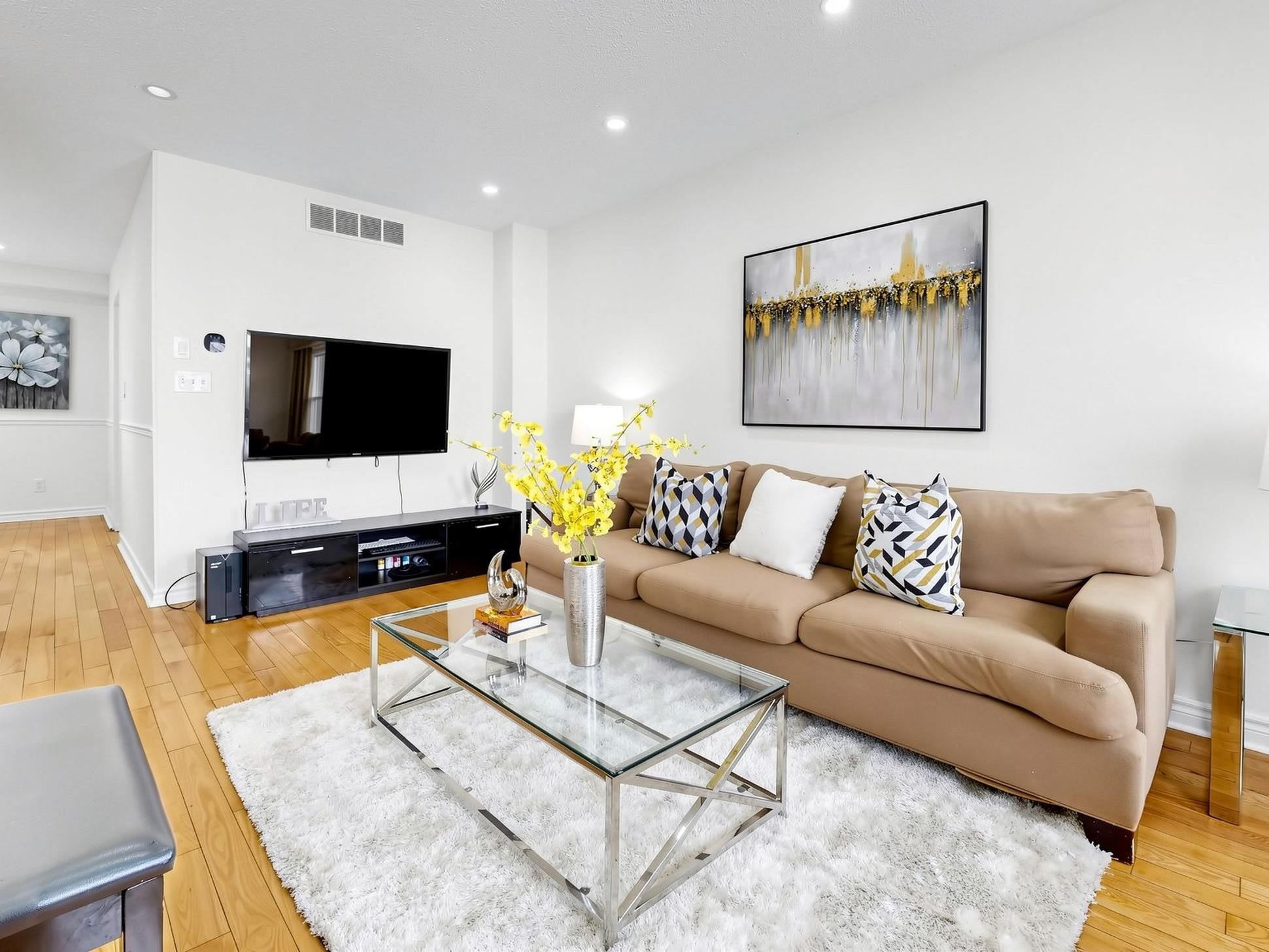 Bright and well-maintained corner-unit townhouse in a highly sought-after Thornhill neighborhood, featuring a bright west-facing backyard with open views and abundant natural light throughout. Freshly painted, this spacious home offers 4 bedrooms, separate living and family rooms, and a finished walk-out basement complete with a full bathroom and gas fireplace-ideal for extended family or additional living space. The modern kitchen is equipped with quartz countertops, stainless steel appliances, and complemented by pot lights throughout, hardwood flooring on the main level, laminate on the upper level, and a stylish wood staircase. The large primary bedroom features his and hers closets. Located just steps to Bayview Fairways Public School and approximately 1.5 km to top-ranked St. Robert Catholic High School, with convenient access to Hwy 407 & 404, public transit, parks, library, golf, shopping, and supermarkets. Maintenance fees include water, building insurance, landscaping, snow removal, and exterior maintenance. Recent updates include garage door (2024) and heat pump (2024).
