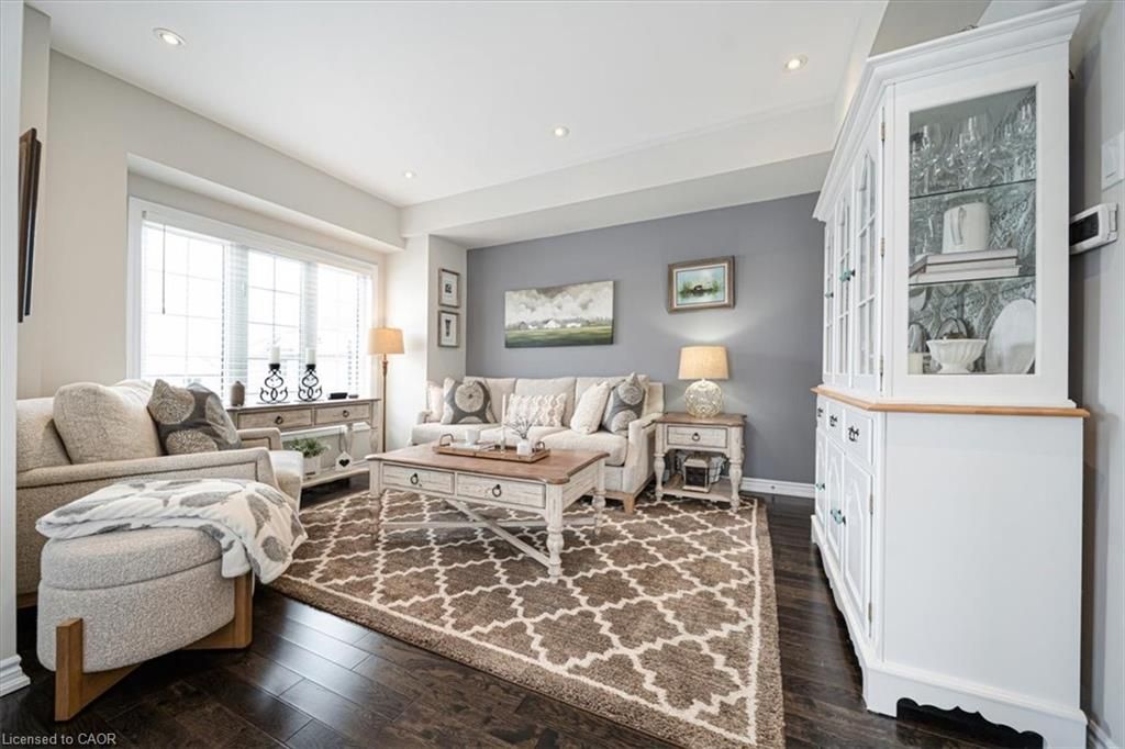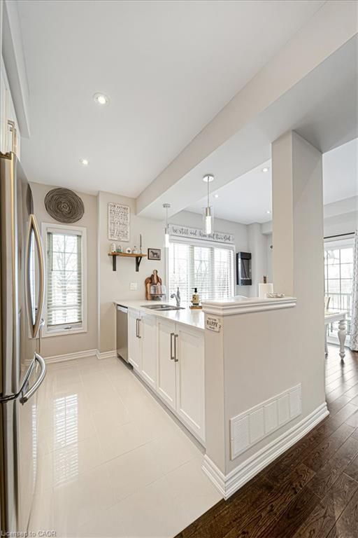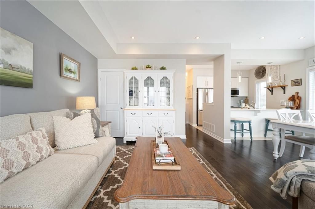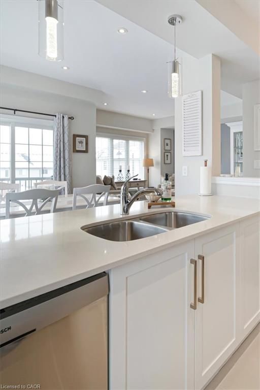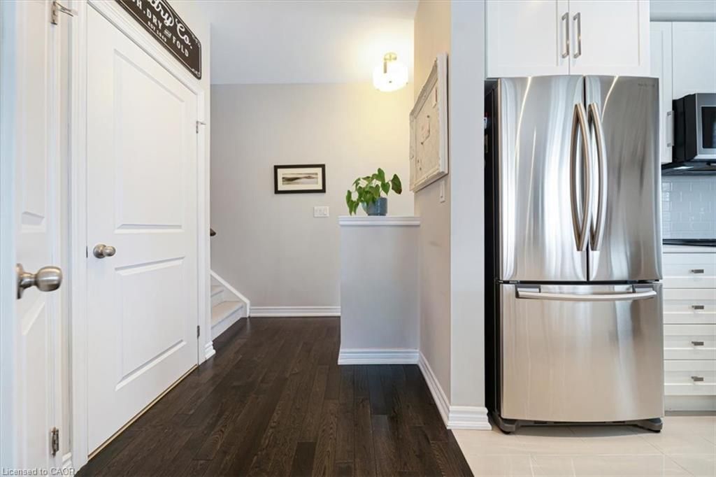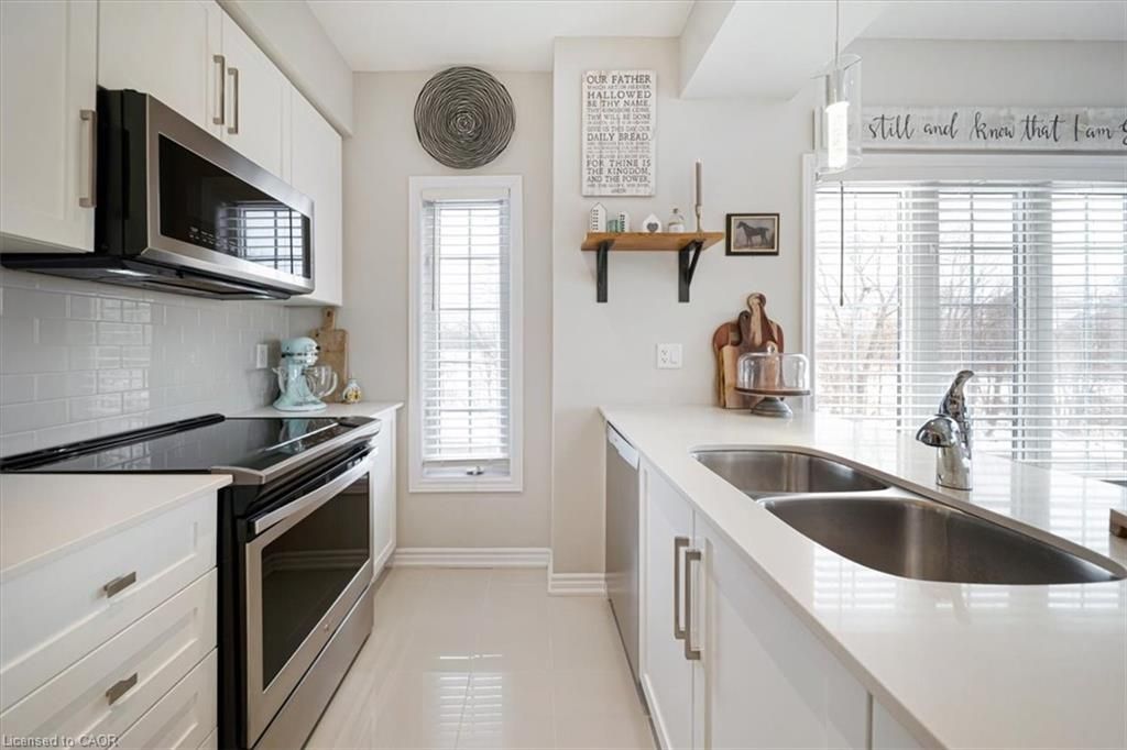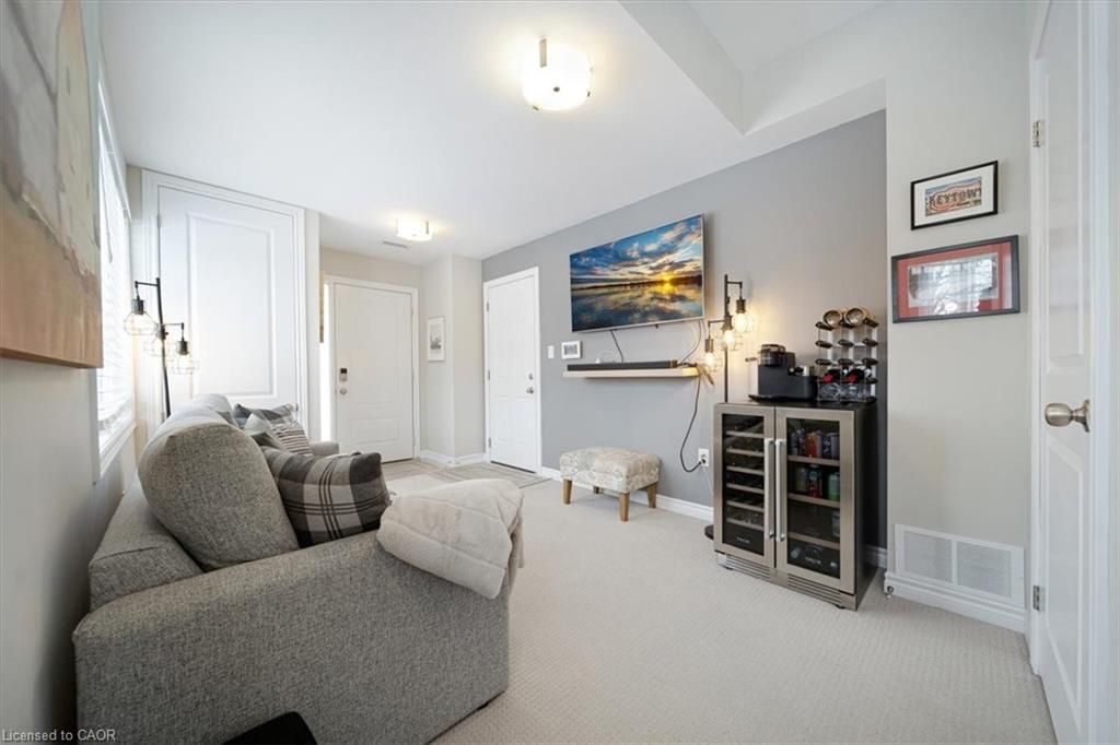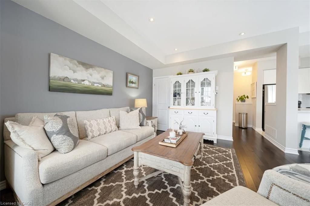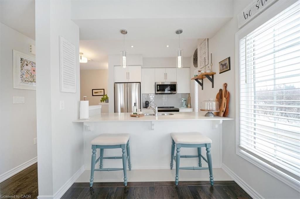 This bright end-unit condo townhome delivers clean lines, thoughtful upgrades, and a smart vertical layout designed for today's lifestyle. With exterior maintenance covered by the condo fee and visitor parking conveniently located across from the home, everyday living feels effortless from the start. The entry level offers a den or home office, ideal for remote work, a quiet retreat, or flexible living; plus convenient inside access from the garage. Upstairs, the heart of the home opens into a light-filled, open-concept kitchen, dining, and living room. Engineered hardwood floors, pot lights, and a cohesive flow create a space that's equally suited for entertaining or unwinding. The kitchen is both stylish and functional, featuring stainless steel appliances, quartz countertops, floating shelves, ceramic flooring, and a breakfast bar open to the dining area. Sliding doors lead to a private balcony perfect for morning coffee, casual meals, or a quiet moment to recharge. A two-piece bath and laundry complete this level for everyday convenience. The upper floor is designed with flexibility in mind. The primary bedroom features an oversized closet and a sleek ensuite with a glass-enclosed super shower. A second bedroom and full bathroom offer options for a nursery, an adult child, guests, or visiting family, all without sacrificing comfort or privacy. Move-in ready, filled with natural light, and finished with today's modern touches, this home offers low-maintenance luxury in a location that keeps you connected to Ancaster, the West Mountain, Bennett's Apples, Ancaster Power Centre, and quick highway access.