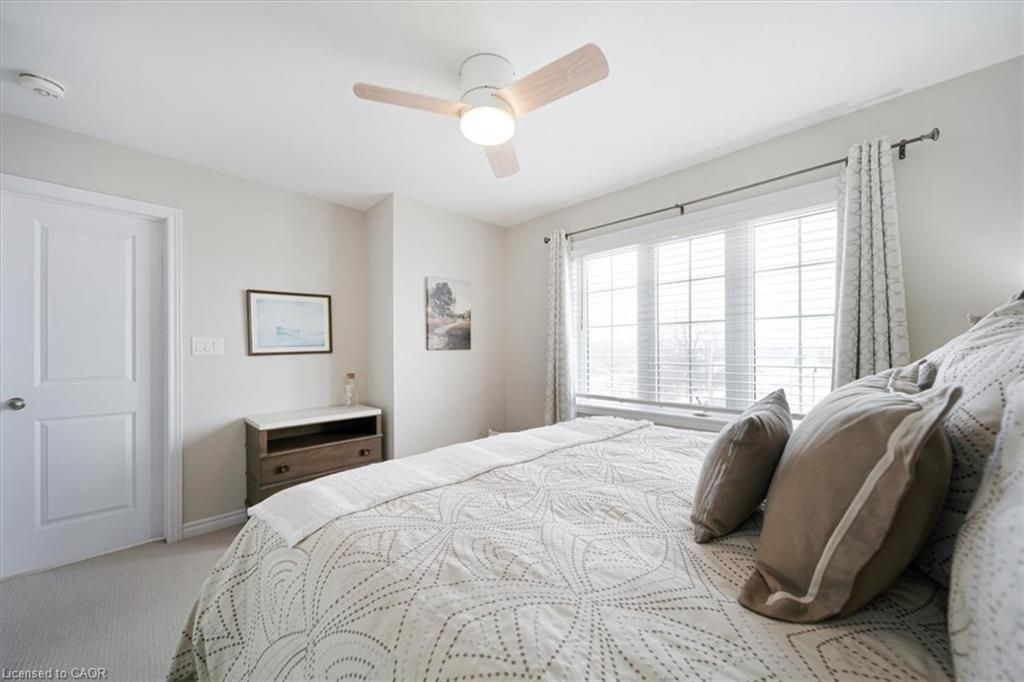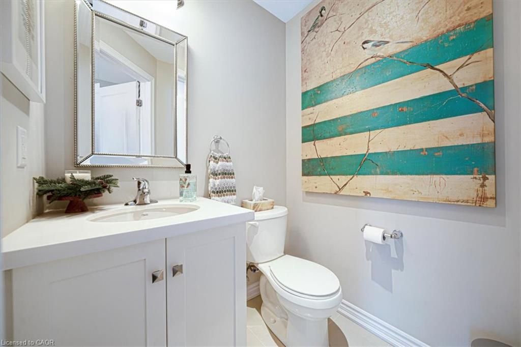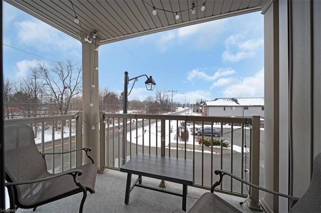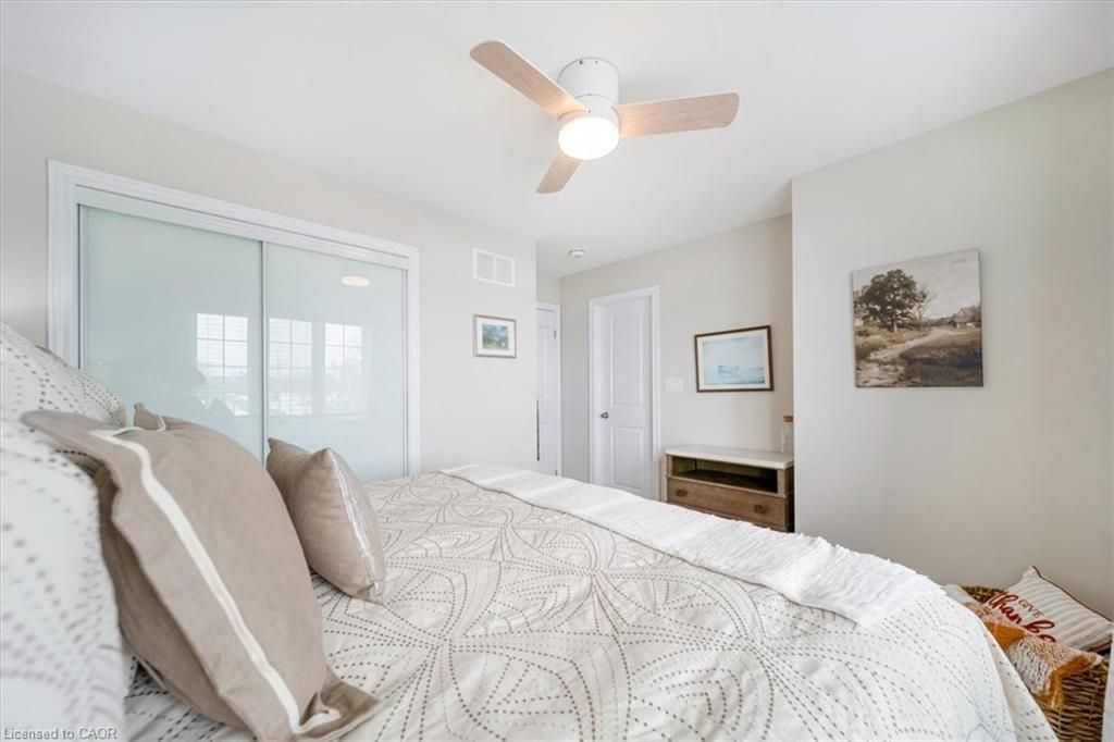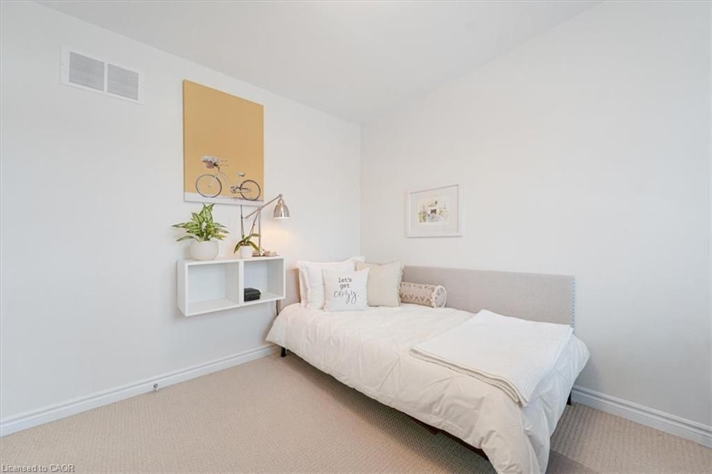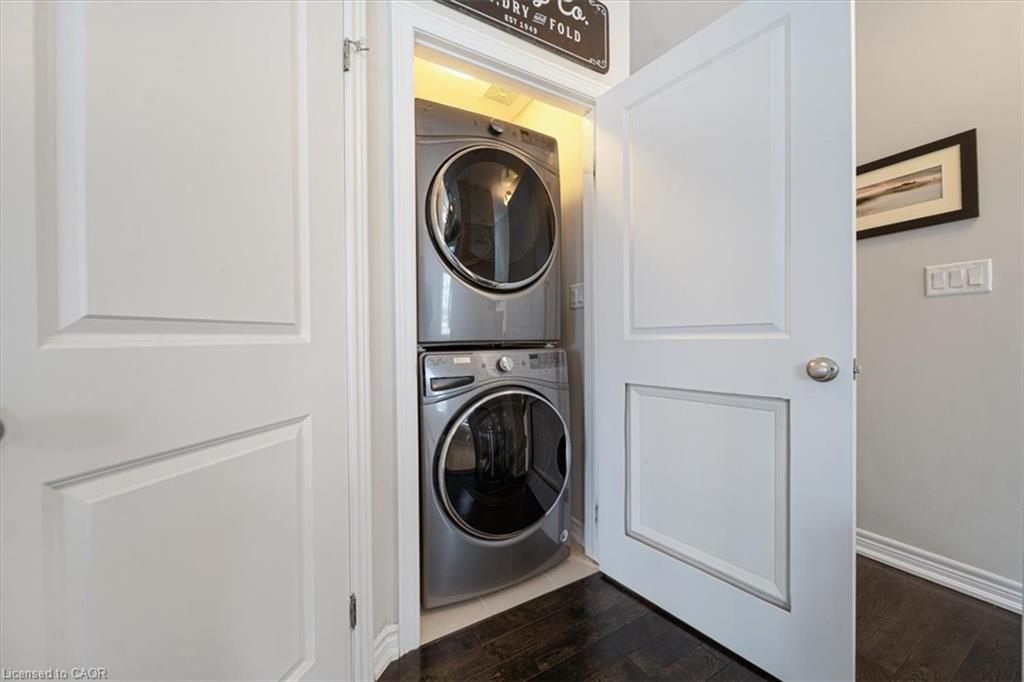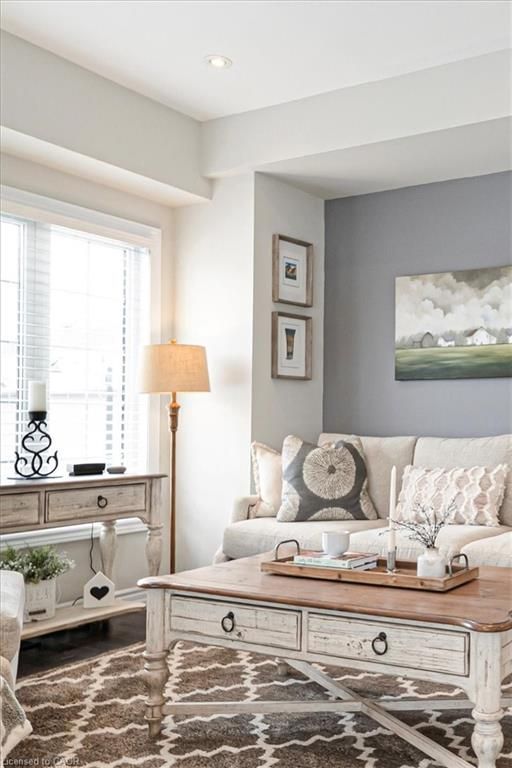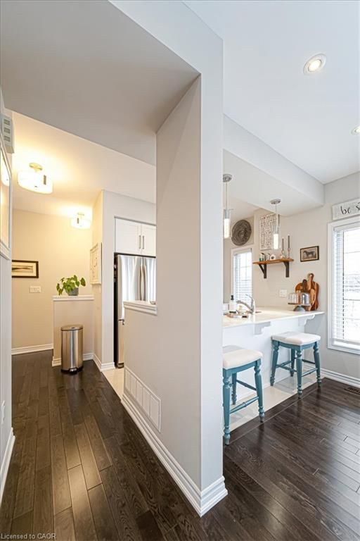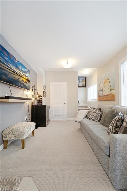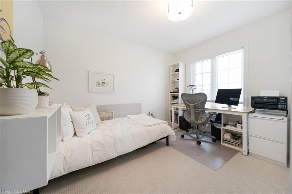 This bright end-unit condo townhome delivers clean lines, thoughtful upgrades, and a smart vertical layout designed for today's lifestyle. With exterior maintenance covered by the condo fee and visitor parking conveniently located across from the home, everyday living feels effortless from the start. The entry level offers a den or home office, ideal for remote work, a quiet retreat, or flexible living; plus convenient inside access from the garage. Upstairs, the heart of the home opens into a light-filled, open-concept kitchen, dining, and living room. Engineered hardwood floors, pot lights, and a cohesive flow create a space that's equally suited for entertaining or unwinding. The kitchen is both stylish and functional, featuring stainless steel appliances, quartz countertops, floating shelves, ceramic flooring, and a breakfast bar open to the dining area. Sliding doors lead to a private balcony perfect for morning coffee, casual meals, or a quiet moment to recharge. A two-piece bath and laundry complete this level for everyday convenience. The upper floor is designed with flexibility in mind. The primary bedroom features an oversized closet and a sleek ensuite with a glass-enclosed super shower. A second bedroom and full bathroom offer options for a nursery, an adult child, guests, or visiting family, all without sacrificing comfort or privacy. Move-in ready, filled with natural light, and finished with today's modern touches, this home offers low-maintenance luxury in a location that keeps you connected to Ancaster, the West Mountain, Bennett's Apples, Ancaster Power Centre, and quick highway access.