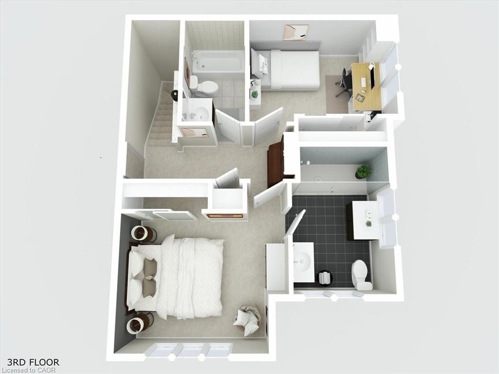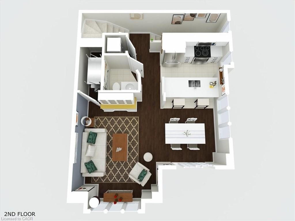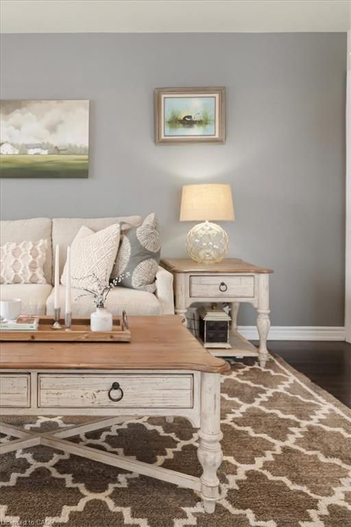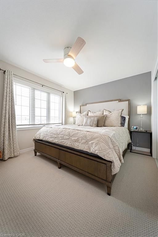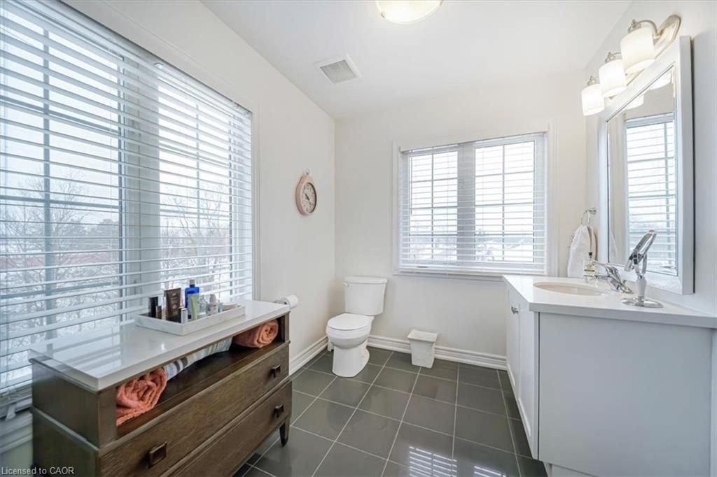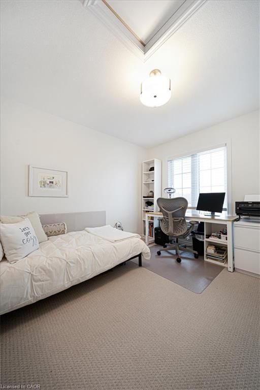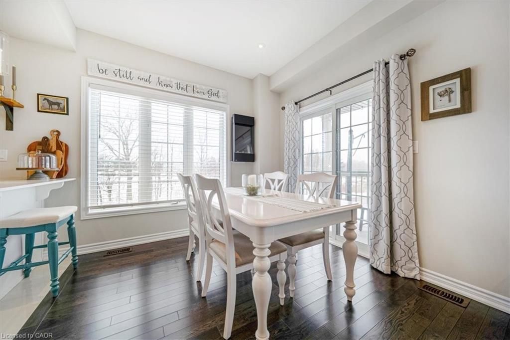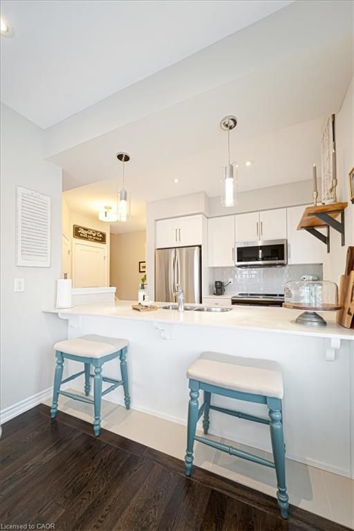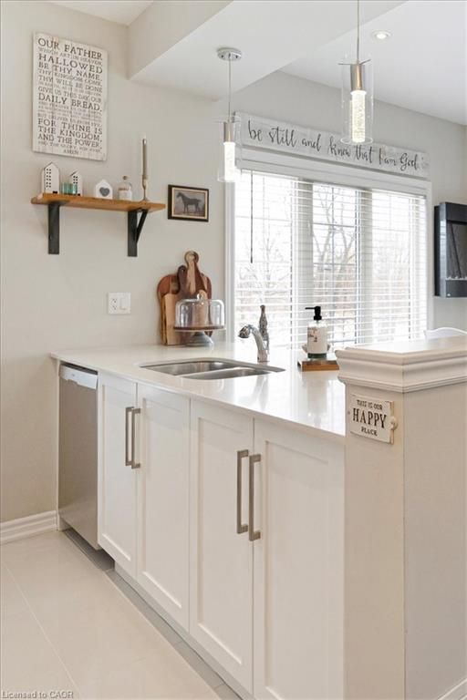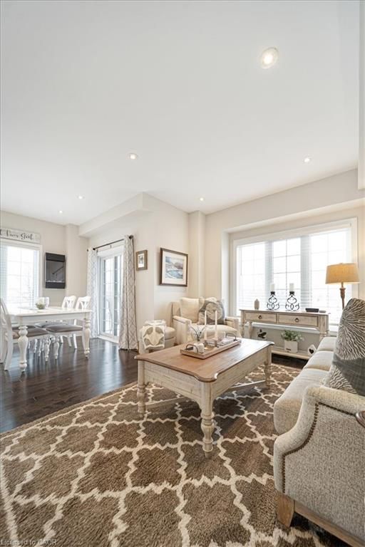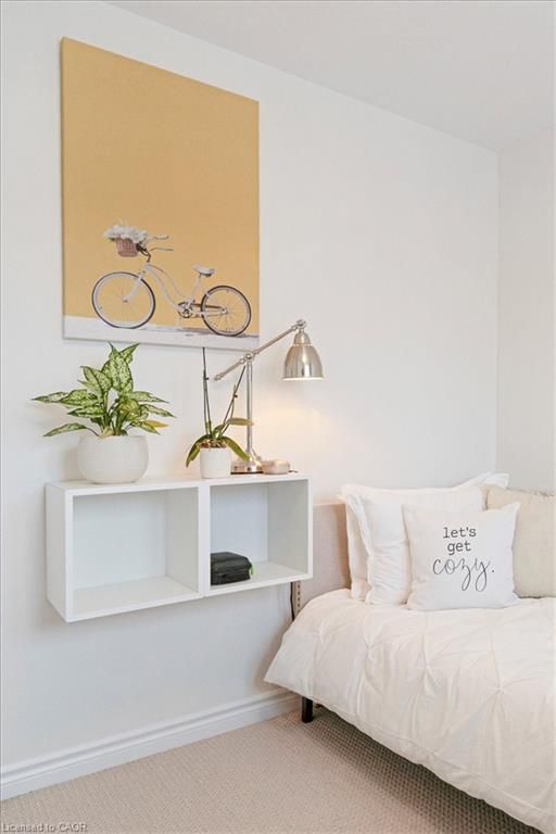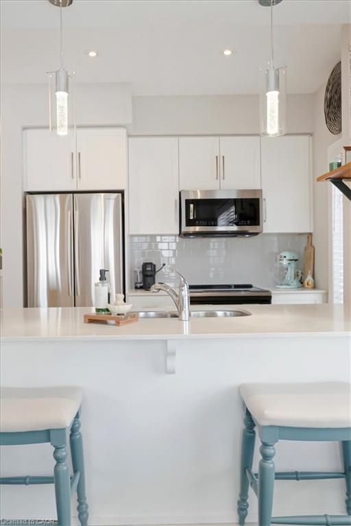 This bright end-unit condo townhome delivers clean lines, thoughtful upgrades, and a smart vertical layout designed for today's lifestyle. With exterior maintenance covered by the condo fee and visitor parking conveniently located across from the home, everyday living feels effortless from the start. The entry level offers a den or home office, ideal for remote work, a quiet retreat, or flexible living; plus convenient inside access from the garage. Upstairs, the heart of the home opens into a light-filled, open-concept kitchen, dining, and living room. Engineered hardwood floors, pot lights, and a cohesive flow create a space that's equally suited for entertaining or unwinding. The kitchen is both stylish and functional, featuring stainless steel appliances, quartz countertops, floating shelves, ceramic flooring, and a breakfast bar open to the dining area. Sliding doors lead to a private balcony perfect for morning coffee, casual meals, or a quiet moment to recharge. A two-piece bath and laundry complete this level for everyday convenience. The upper floor is designed with flexibility in mind. The primary bedroom features an oversized closet and a sleek ensuite with a glass-enclosed super shower. A second bedroom and full bathroom offer options for a nursery, an adult child, guests, or visiting family, all without sacrificing comfort or privacy. Move-in ready, filled with natural light, and finished with today's modern touches, this home offers low-maintenance luxury in a location that keeps you connected to Ancaster, the West Mountain, Bennett's Apples, Ancaster Power Centre, and quick highway access.