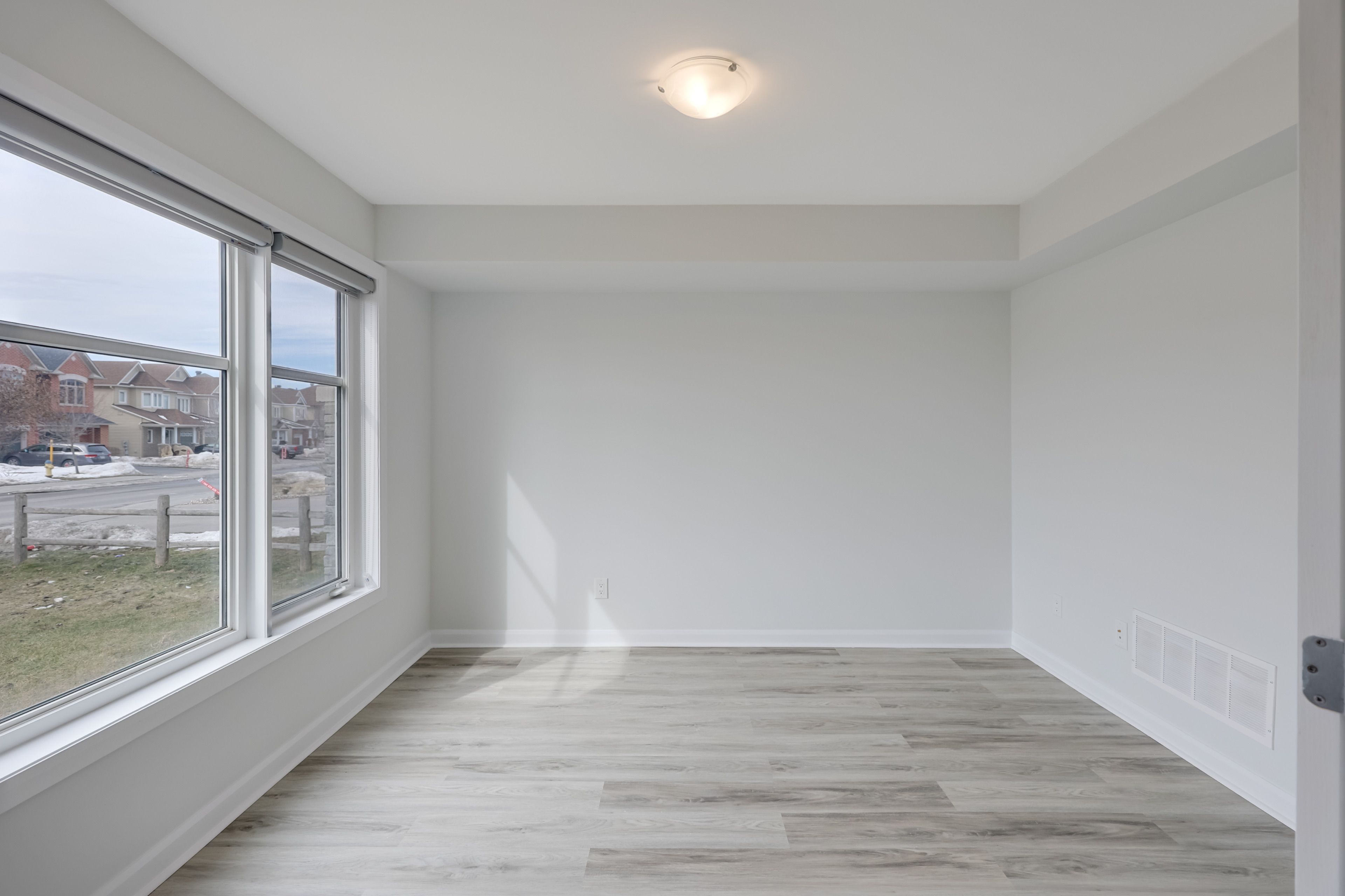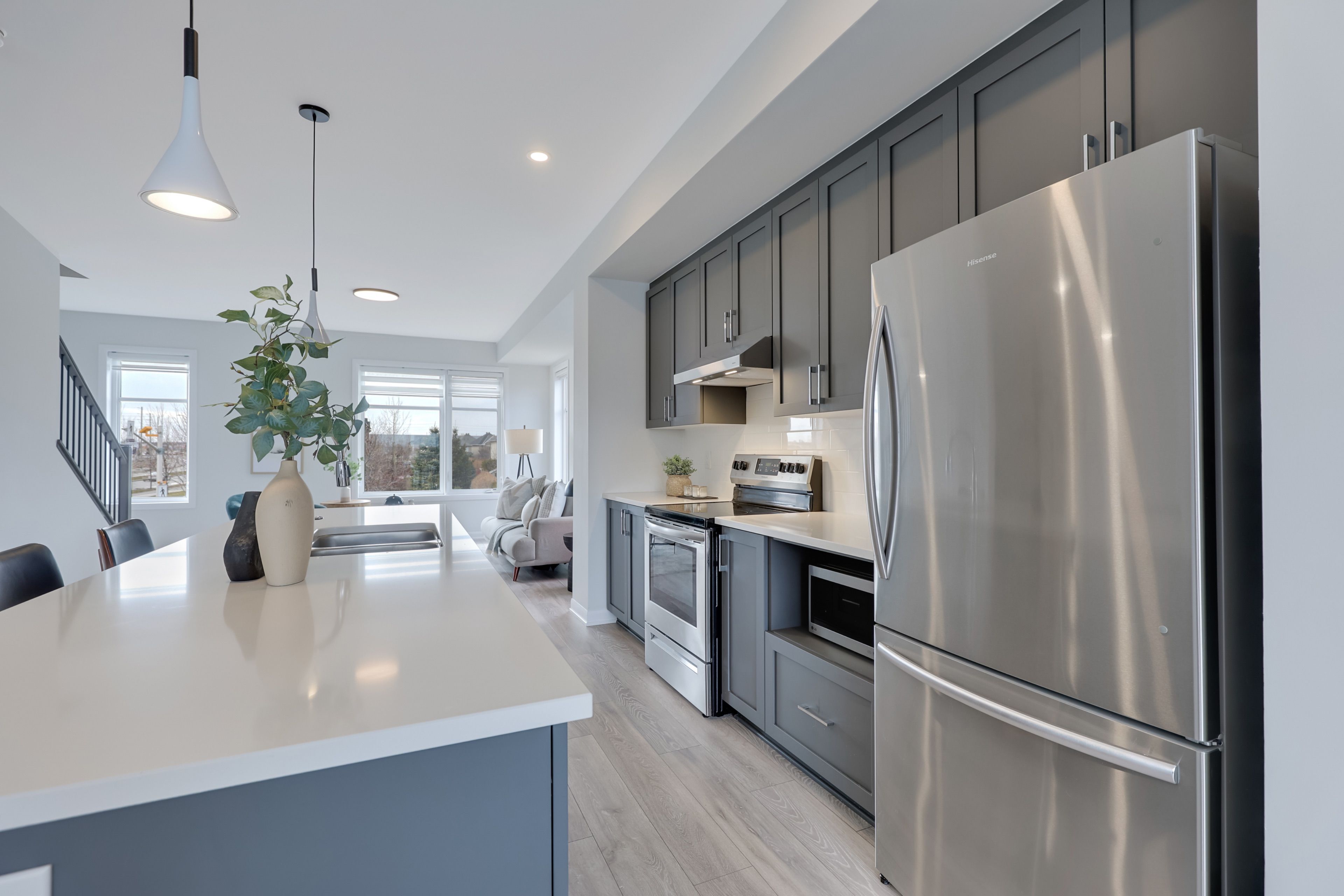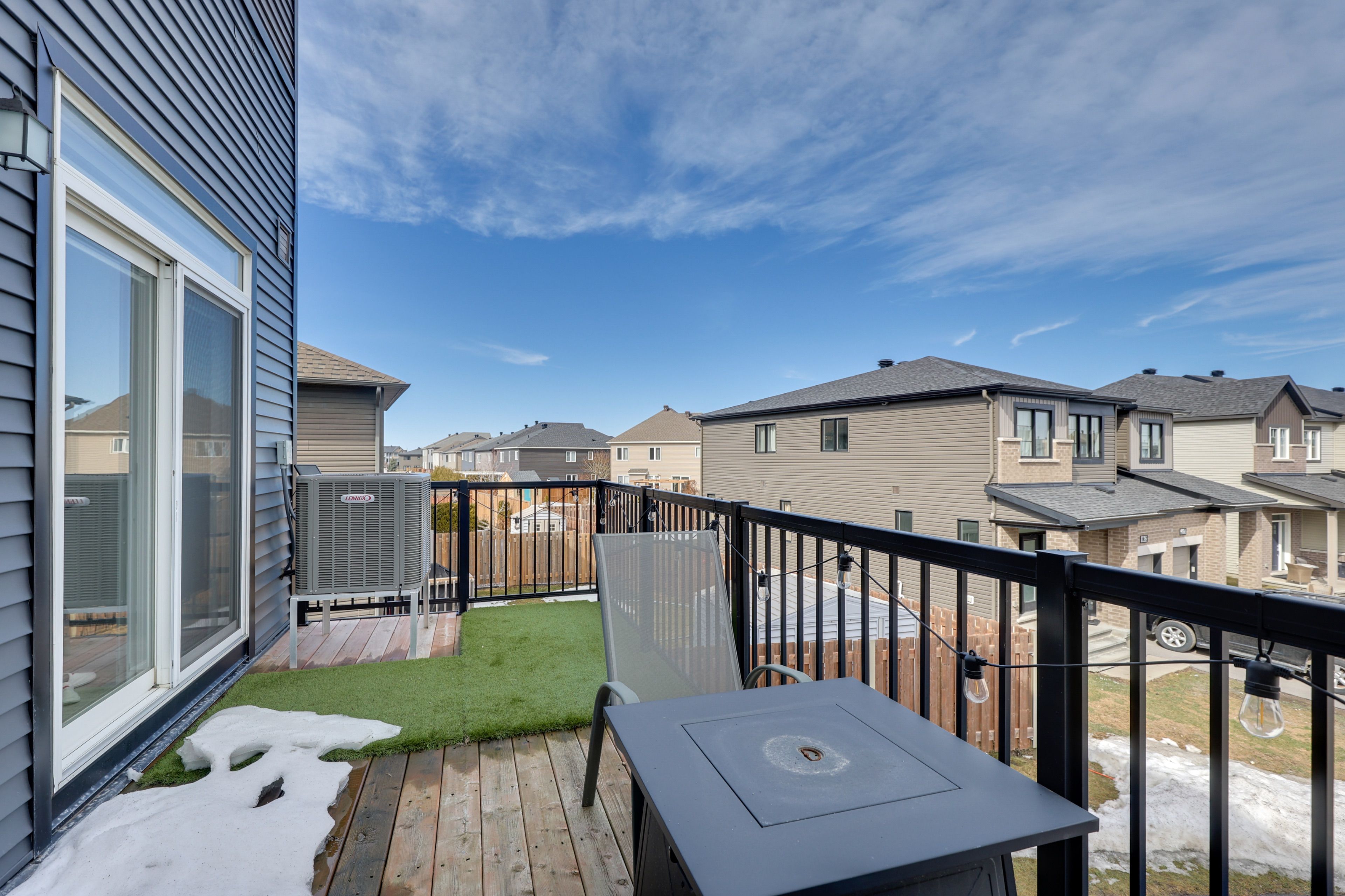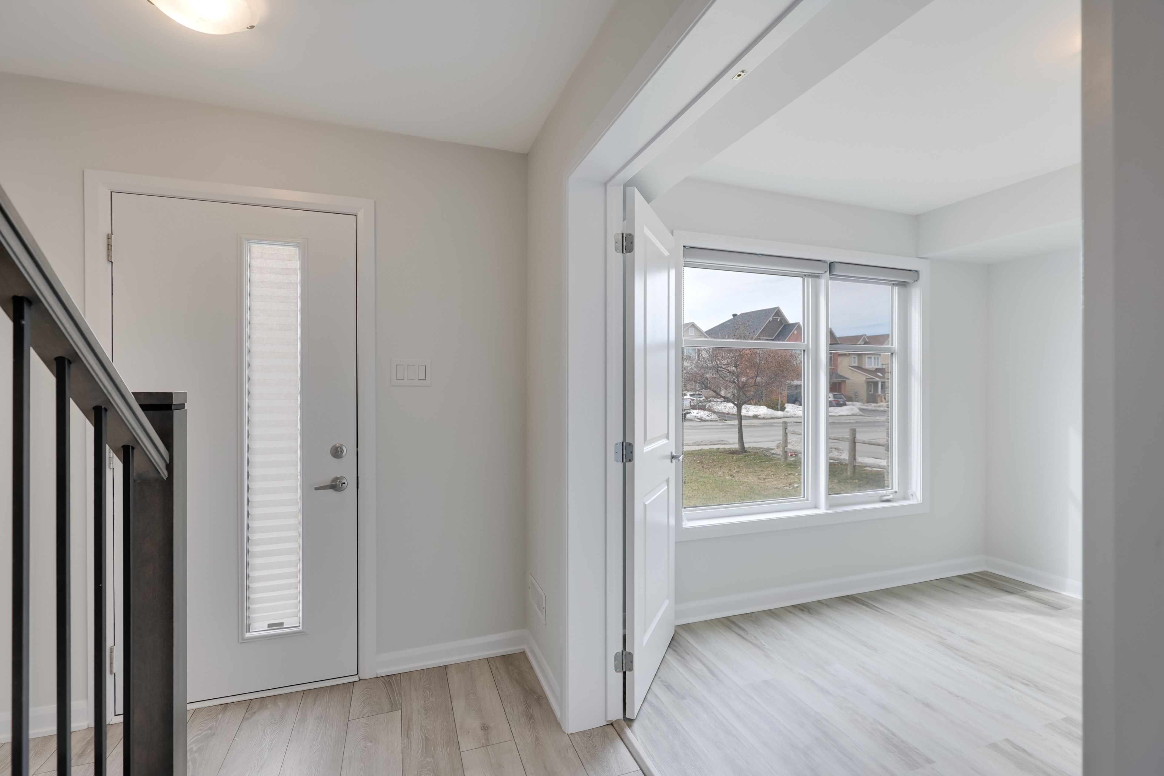 Discover a rare END-UNIT townhome with a DOUBLE GARAGE in one of Kanata's most desirable family communities. Offering over 1,800 sq ft of bright living space, this well-designed home features a rare through layout (NOT BACK-TO-BACK) that allows natural light to flow from both sides. The flexible 4 bedrooms design, ideal for growing families or those working from home. With dirveway parking for 4+ vehicles plus the double garage, this property offers convenience that is seldom found in townhomes. The home welcomes you with a wide front yard that adds curb appeal and usable outdoor space, with no private road fees or HVAC rental contracts. On the main level, the foyer leads to a bright and versatile bedroom with large windows, can also be used as a home business. The 2nd level features an open-concept living area designed for comfortable everyday living and entertaining. The spacious living and dining areas are filled with natural light and connect to a large private balcony, ideal for relaxing or hosting friends. The modern kitchen features quartz countertops, a large island with breakfast bar, and ample cabinetry for storage and functionality. Upstairs, the 3rd level offers 3 well-sized bedrooms, including a primary bedroom with a walk-in closet and a full ensuite, along with convenient an upper-level laundry room. At the back, the home enjoys its own green space (back width of 38.34 ft), offering more privacy and outdoor flexibility than many townhomes. Located in a quiet, family-friendly neighbourhood with excellent schools, the home is within walking distance to parks, transit, and cafés, and just minutes from shopping, recreation facilities, major tech employers, and Highway 417 for easy commuting.