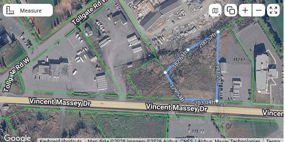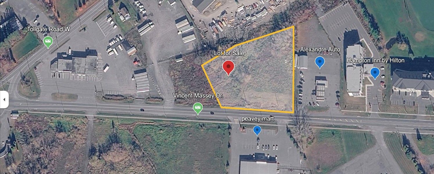 Fine opportunity to acquire vacant commercial land 1.82 Acres with 203 feet frontage on high traffic Vincent Massey Drive located between Tollgate & Brookdale. Not many lots left in this stretch and this one is priced to sell. The lot is mostly clear and has an entrance with culvert in place. There is a new hotel Hampton Inn being built one lot over. Great location with lots of exposure to hotels, motels, retirement homes. Bike path across the street provides additional traffic. Perfect for new commercial development.