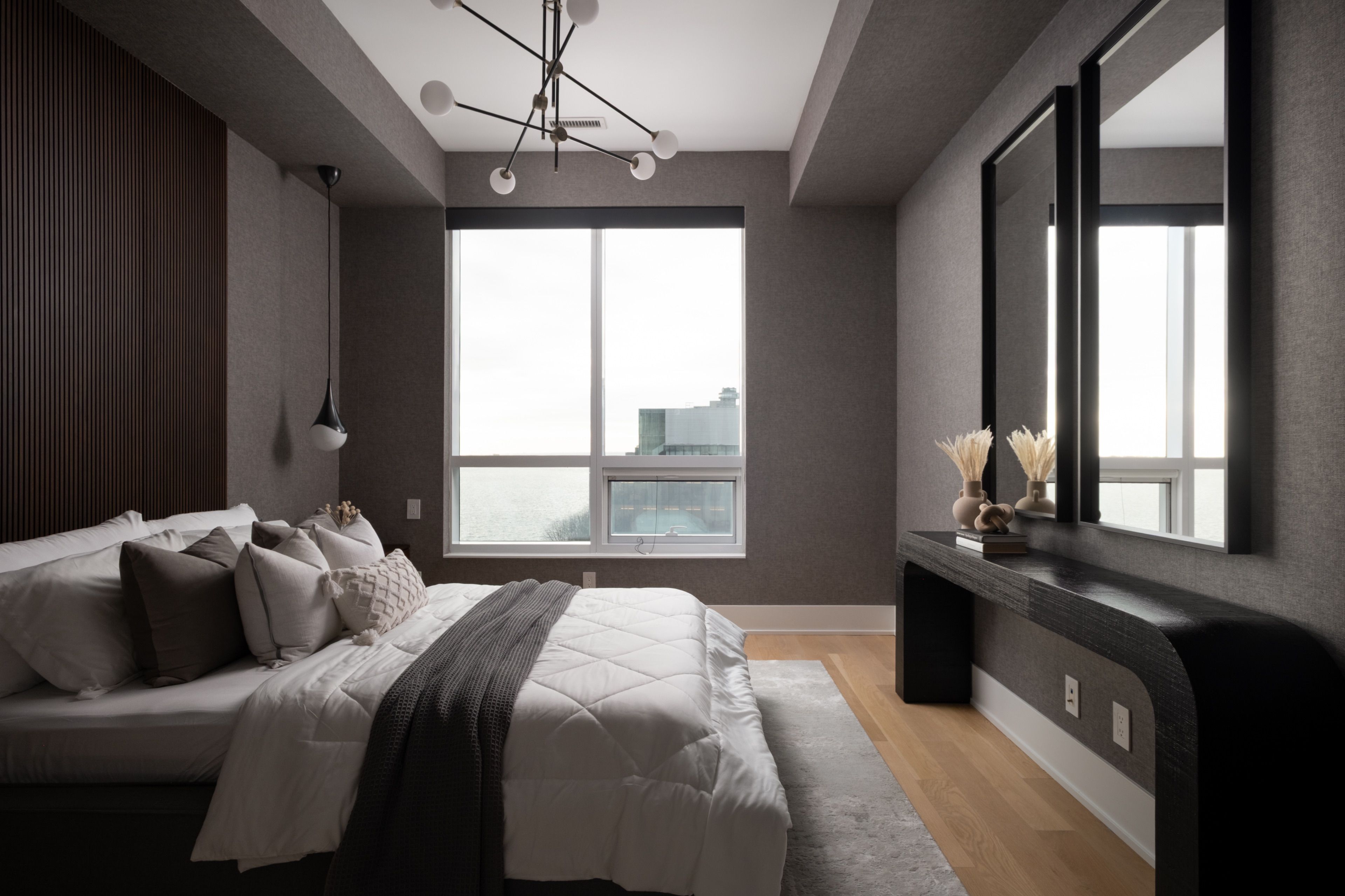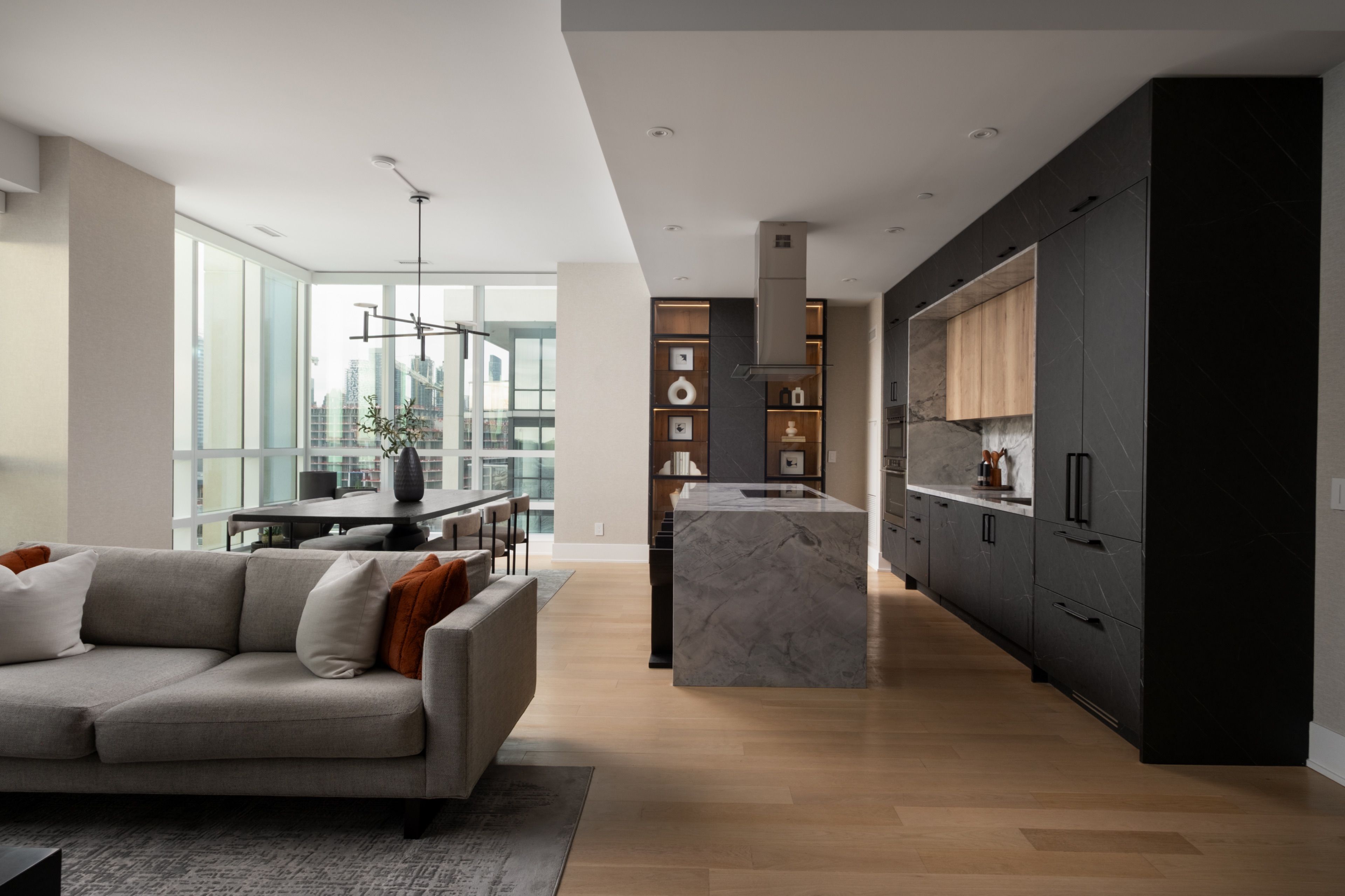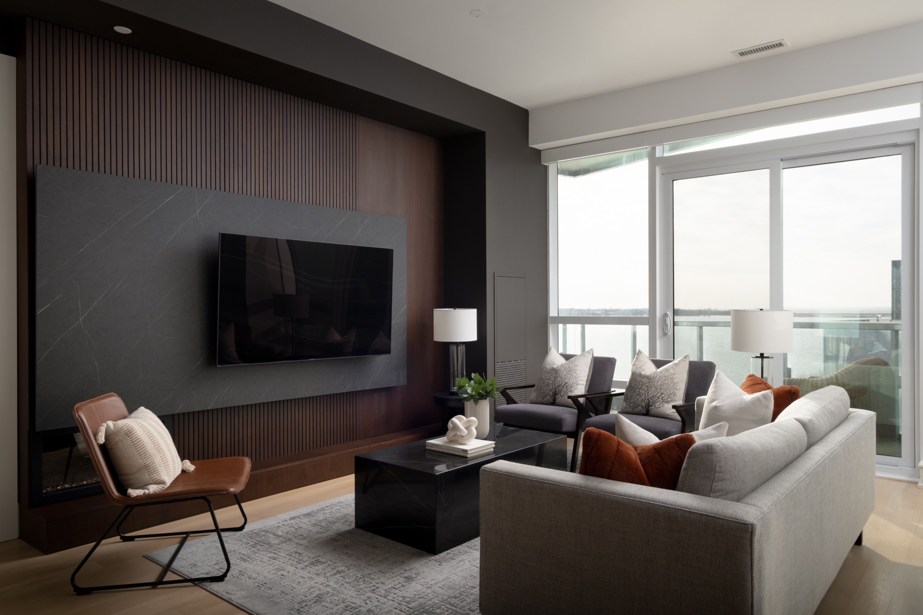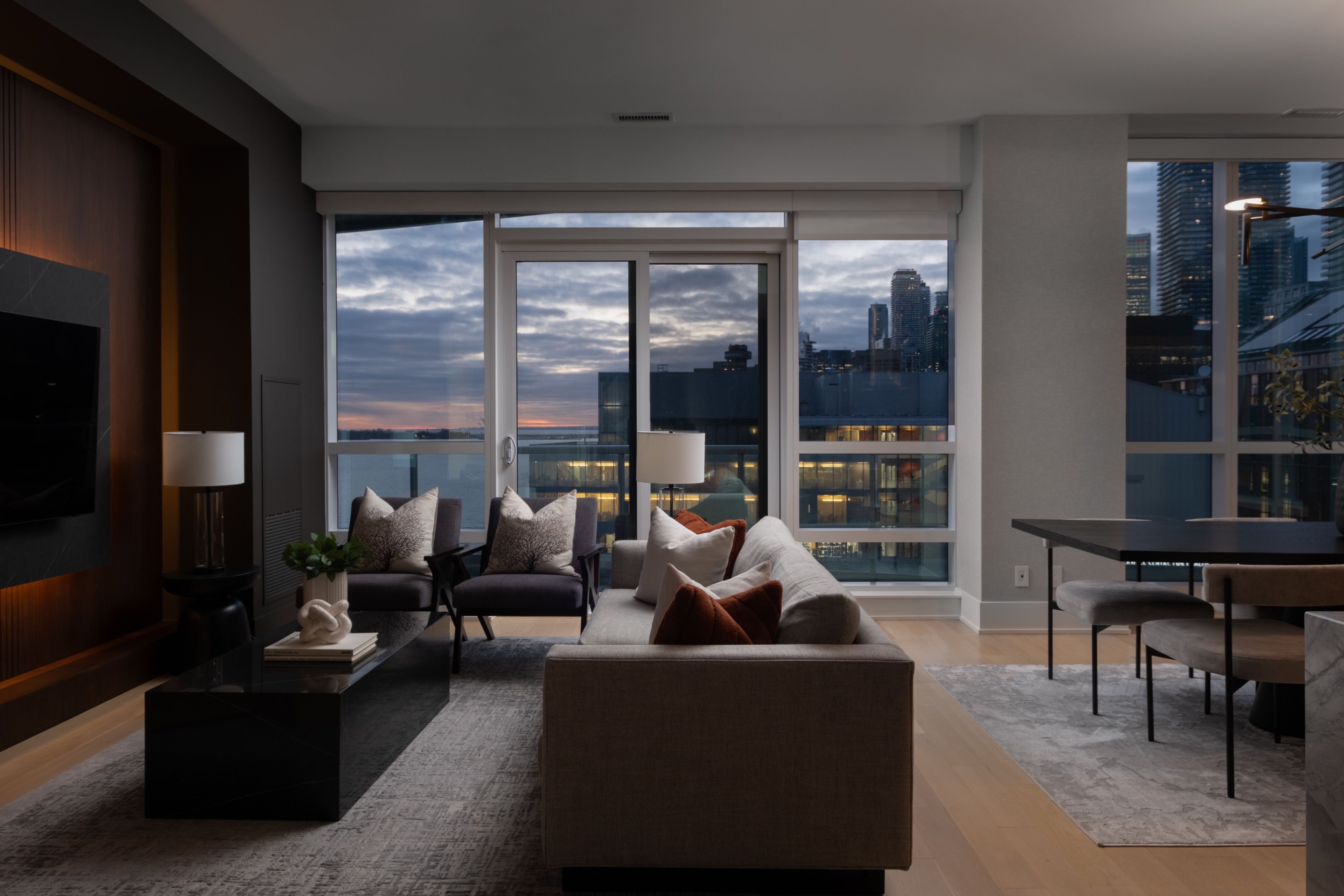 Welcome to 55 Merchants' Wharf, an exceptional waterfront residence where sophisticated design, bespoke finishes, and sweeping lake and city views define elevated downtown living. Thoughtfully curated throughout, this home offers a seamless blend of modern elegance and timeless craftsmanship.The expansive open-concept living space is anchored by a dramatic custom wood-slat feature wall with integrated ambient lighting and a sleek wall-mounted TV, creating an architectural focal point ideal for both refined entertaining and everyday living. Floor-to-ceiling windows bathe the interior in natural light and frame tranquil water views, while neutral tones, clean lines, and premium finishes create a calm, upscale atmosphere that flows effortlessly into the chef-inspired kitchen featuring a dramatic waterfall island, integrated appliances, bespoke cabinetry and striking architectural details that blend warmth with modern sophistication. The dining area is perfectly positioned beside expansive windows, offering an ever-changing urban and waterfront backdrop for memorable meals and gatherings.he primary bedroom is a serene, hotel-inspired retreat with floor-to-ceiling windows, wide-plank hardwood flooring, designer lighting and detailing. The spa-like ensuite offers a freestanding soaker tub, glass-enclosed rainfall shower, double vanity with stone countertops, and elegant wood and marble finishes.A generously sized second bedroom provides flexibility as a guest suite or executive home office complemented by a private ensuite with sleek modern finishes. Step onto the private balcony and enjoy unobstructed views of Lake Ontario-perfect for morning coffee or sunset relaxation. Ideally located steps from the waterfront boardwalk and minutes from the Financial District, St. Lawrence Market, and Toronto's premier dining and cultural destinations, this residence delivers a rare opportunity for luxury waterfront living in one of the city's most sought-after addresses.