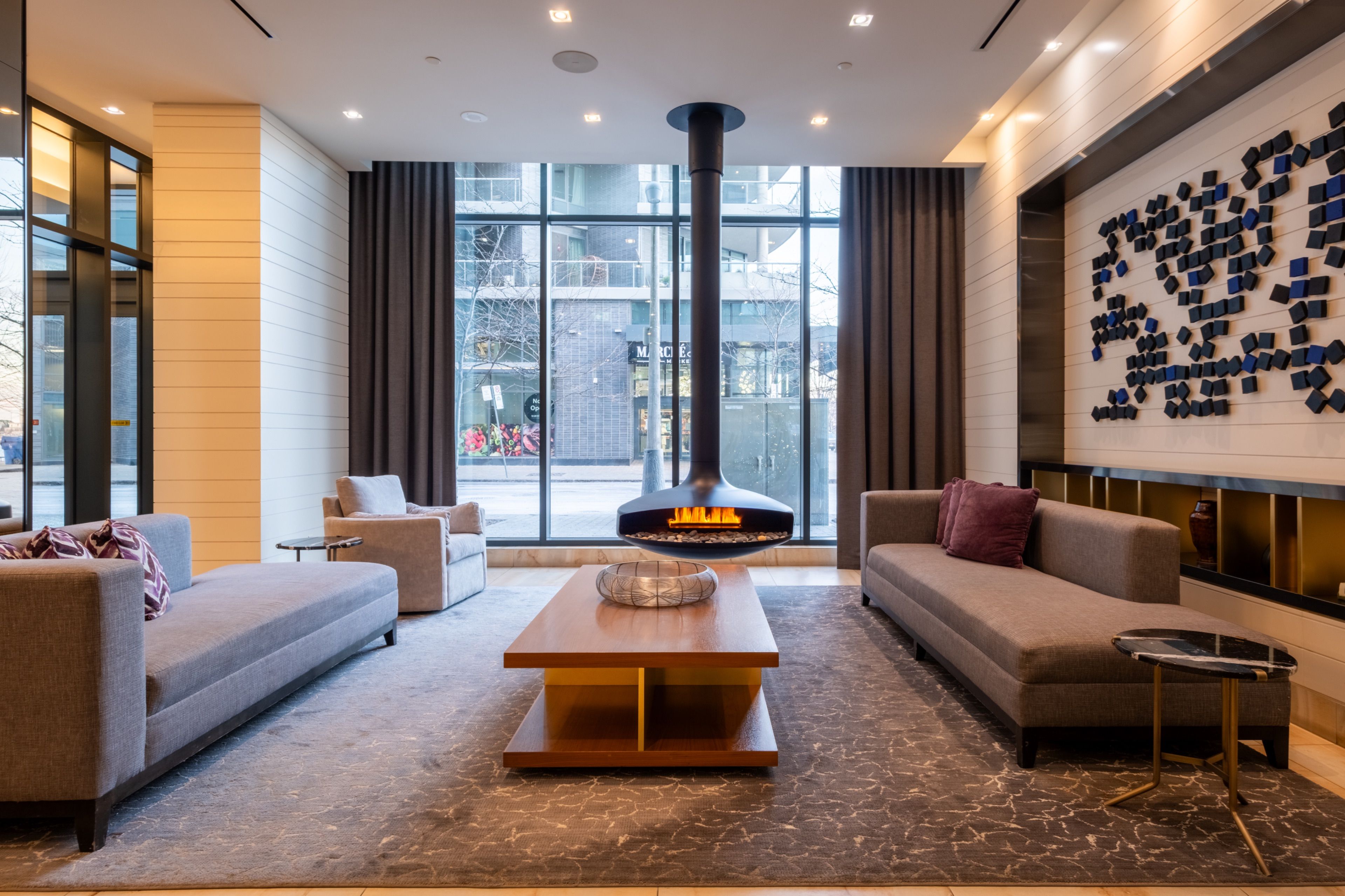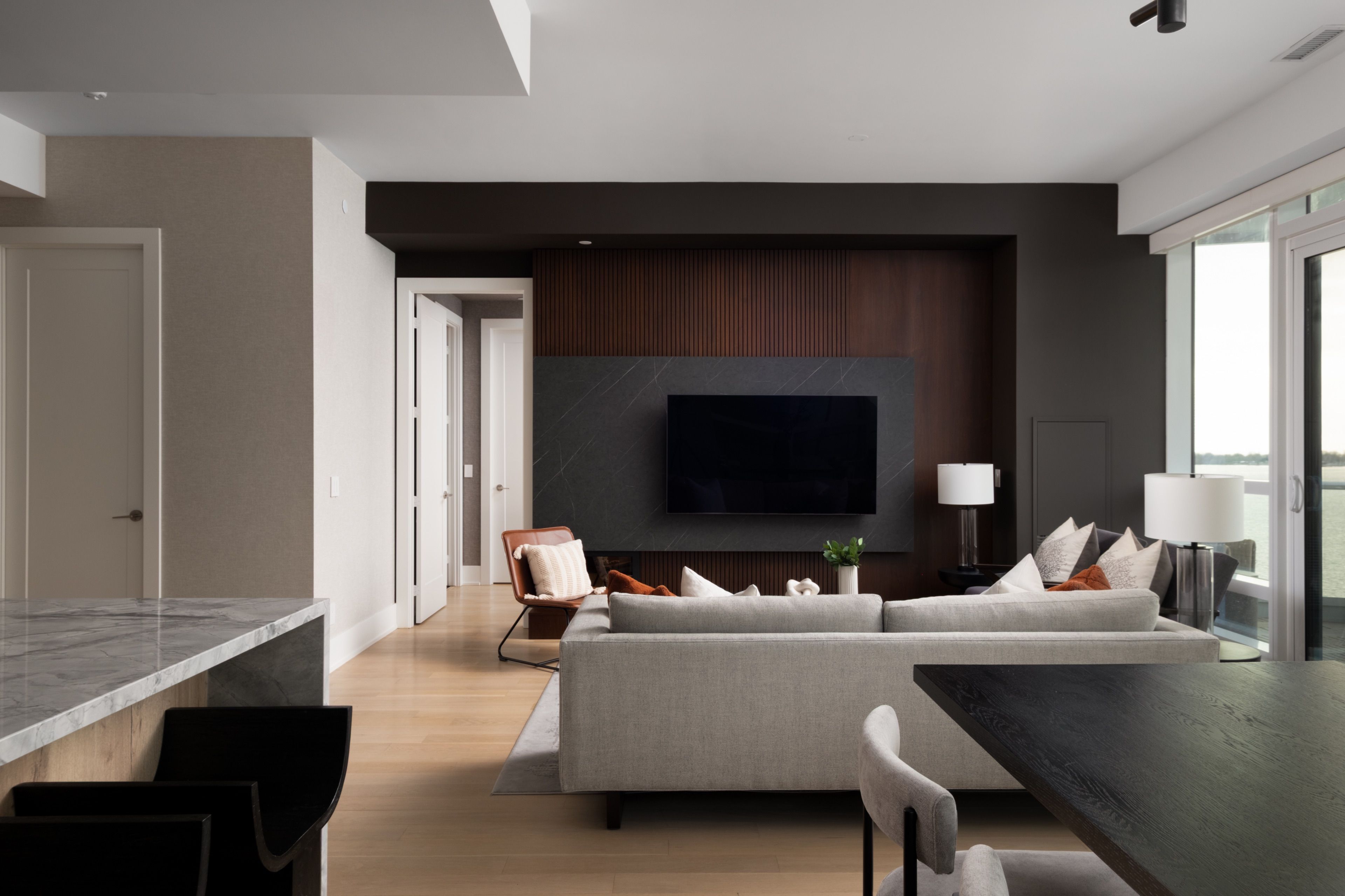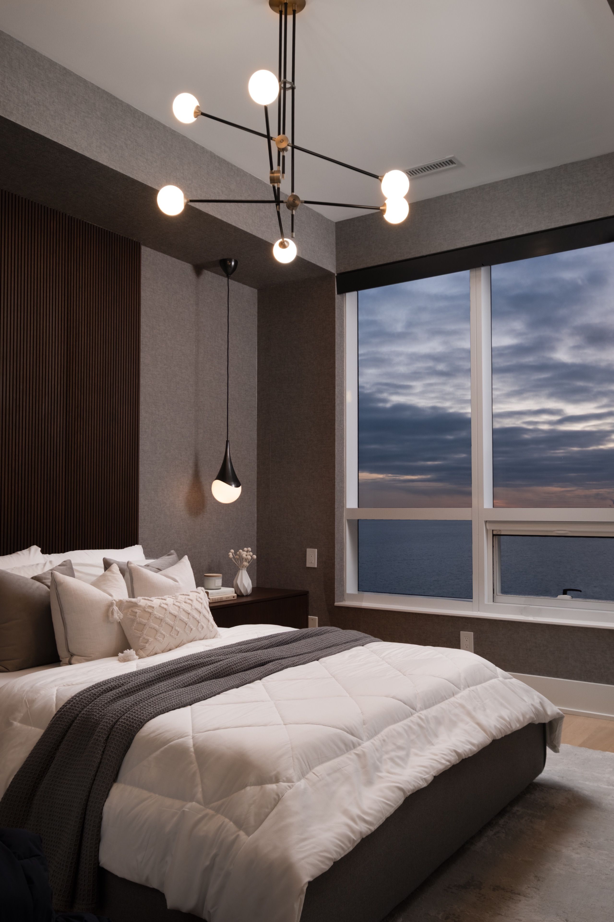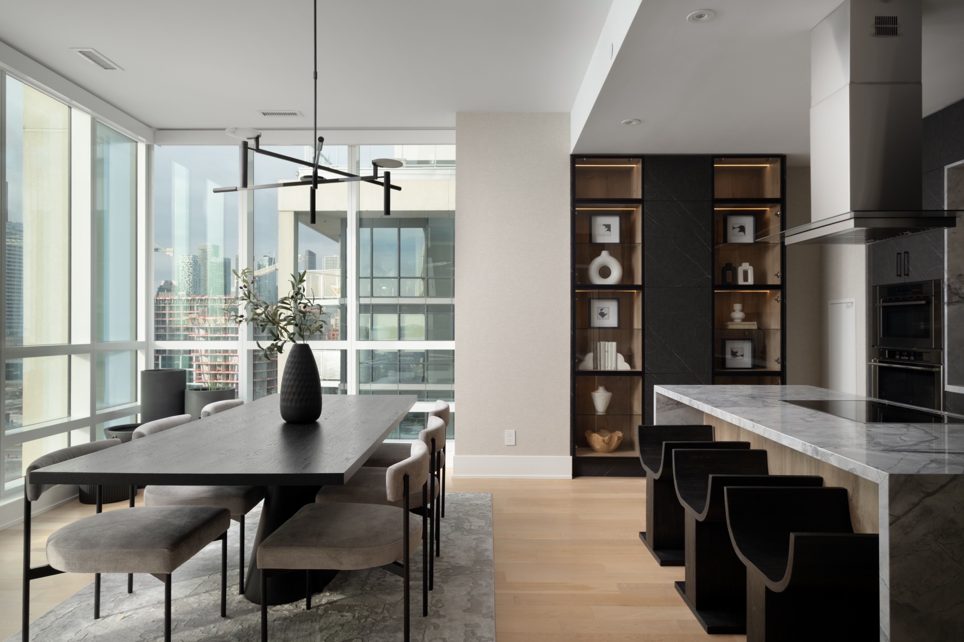 Welcome to 55 Merchants' Wharf, an exceptional waterfront residence where sophisticated design, bespoke finishes, and sweeping lake and city views define elevated downtown living. Thoughtfully curated throughout, this home offers a seamless blend of modern elegance and timeless craftsmanship.The expansive open-concept living space is anchored by a dramatic custom wood-slat feature wall with integrated ambient lighting and a sleek wall-mounted TV, creating an architectural focal point ideal for both refined entertaining and everyday living. Floor-to-ceiling windows bathe the interior in natural light and frame tranquil water views, while neutral tones, clean lines, and premium finishes create a calm, upscale atmosphere that flows effortlessly into the chef-inspired kitchen featuring a dramatic waterfall island, integrated appliances, bespoke cabinetry and striking architectural details that blend warmth with modern sophistication. The dining area is perfectly positioned beside expansive windows, offering an ever-changing urban and waterfront backdrop for memorable meals and gatherings.he primary bedroom is a serene, hotel-inspired retreat with floor-to-ceiling windows, wide-plank hardwood flooring, designer lighting and detailing. The spa-like ensuite offers a freestanding soaker tub, glass-enclosed rainfall shower, double vanity with stone countertops, and elegant wood and marble finishes.A generously sized second bedroom provides flexibility as a guest suite or executive home office complemented by a private ensuite with sleek modern finishes. Step onto the private balcony and enjoy unobstructed views of Lake Ontario-perfect for morning coffee or sunset relaxation. Ideally located steps from the waterfront boardwalk and minutes from the Financial District, St. Lawrence Market, and Toronto's premier dining and cultural destinations, this residence delivers a rare opportunity for luxury waterfront living in one of the city's most sought-after addresses.