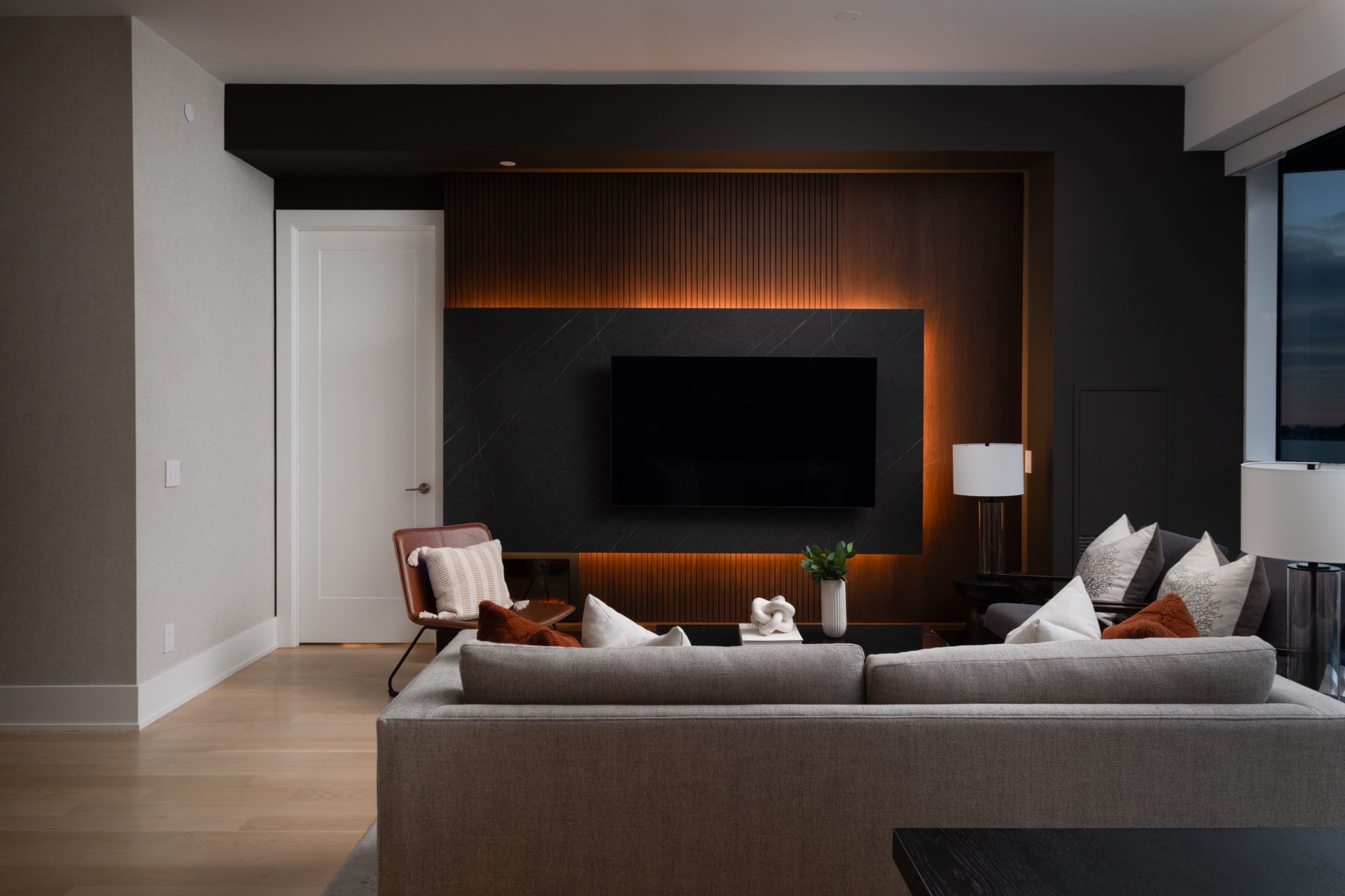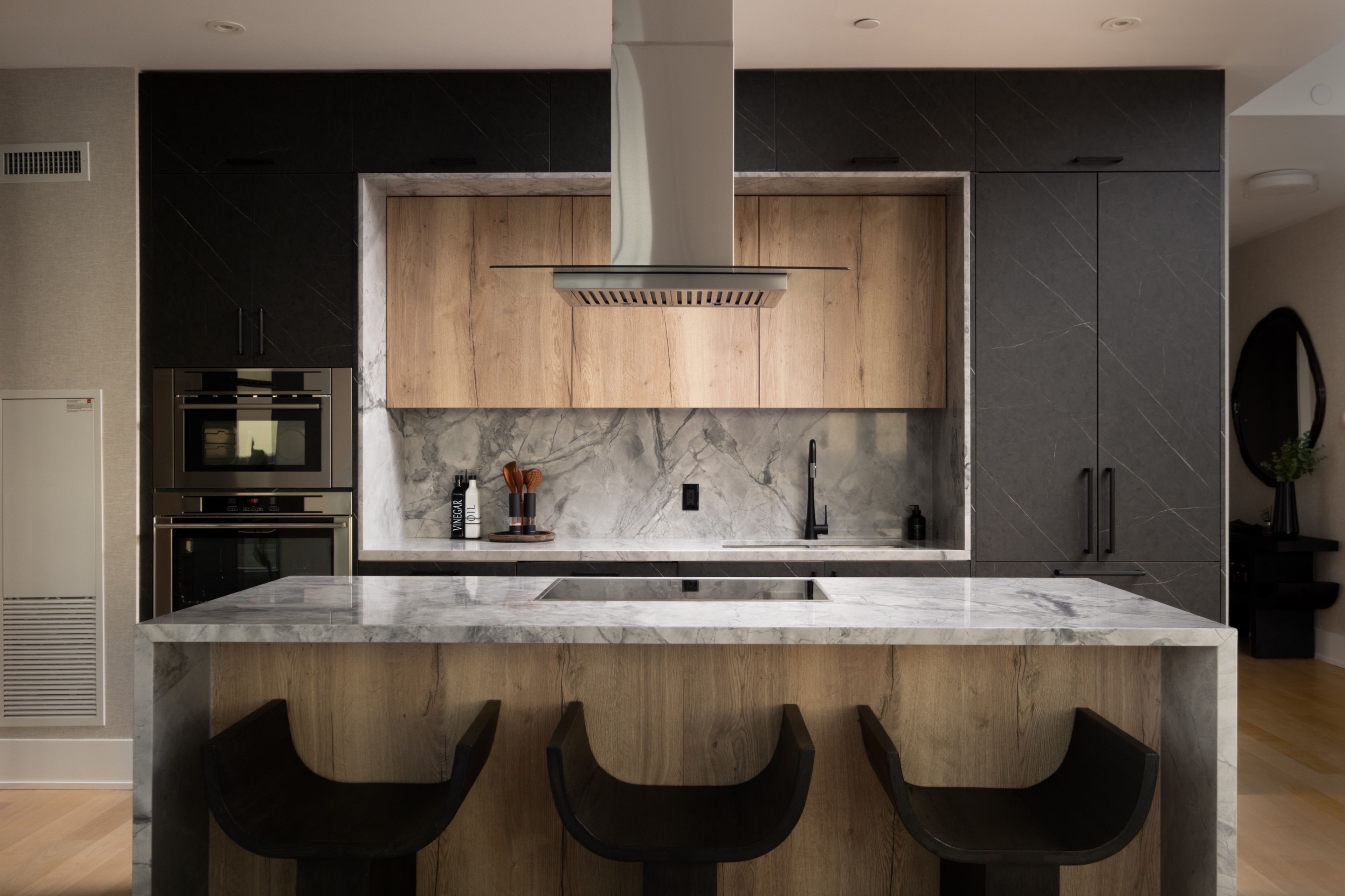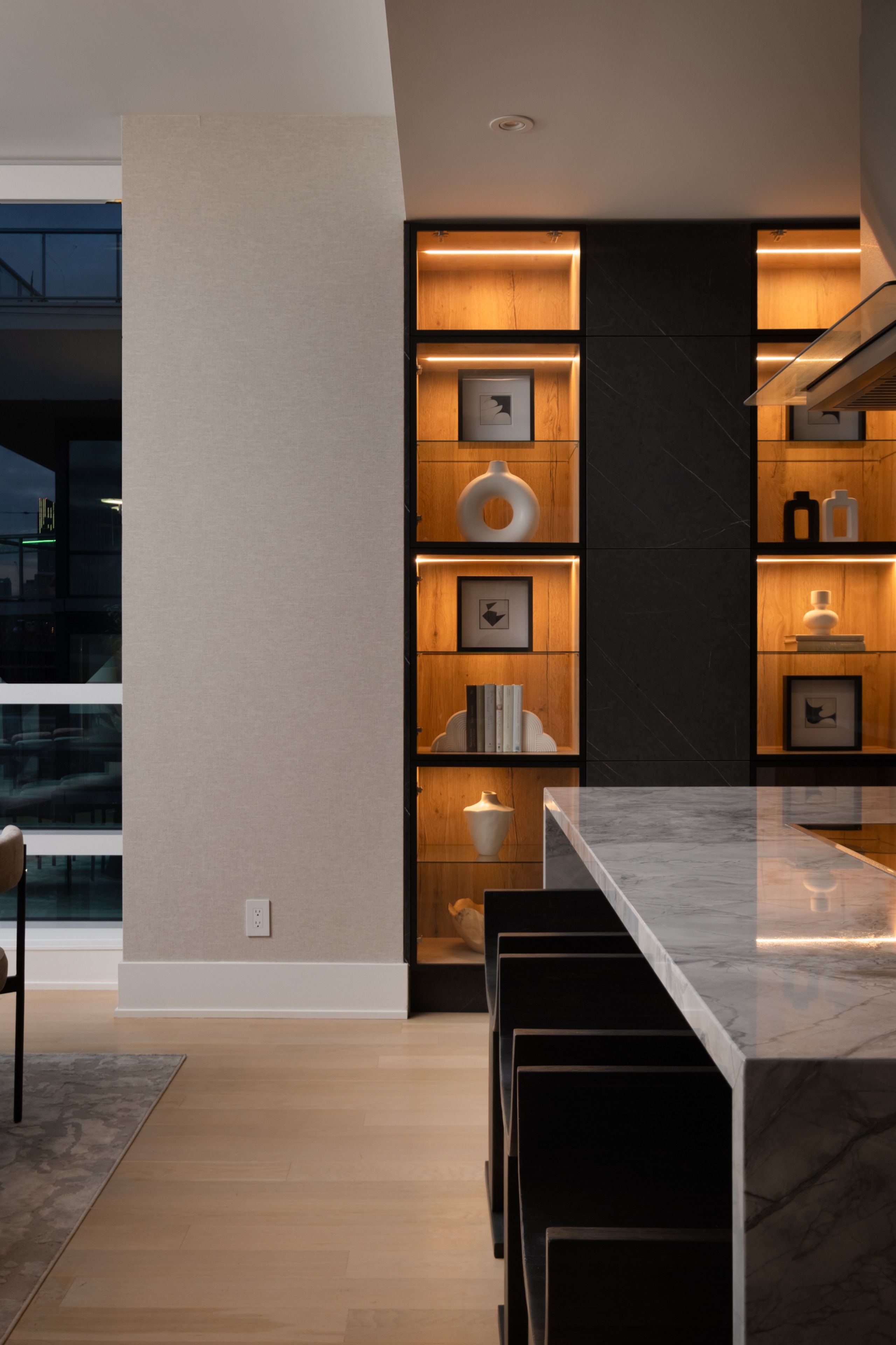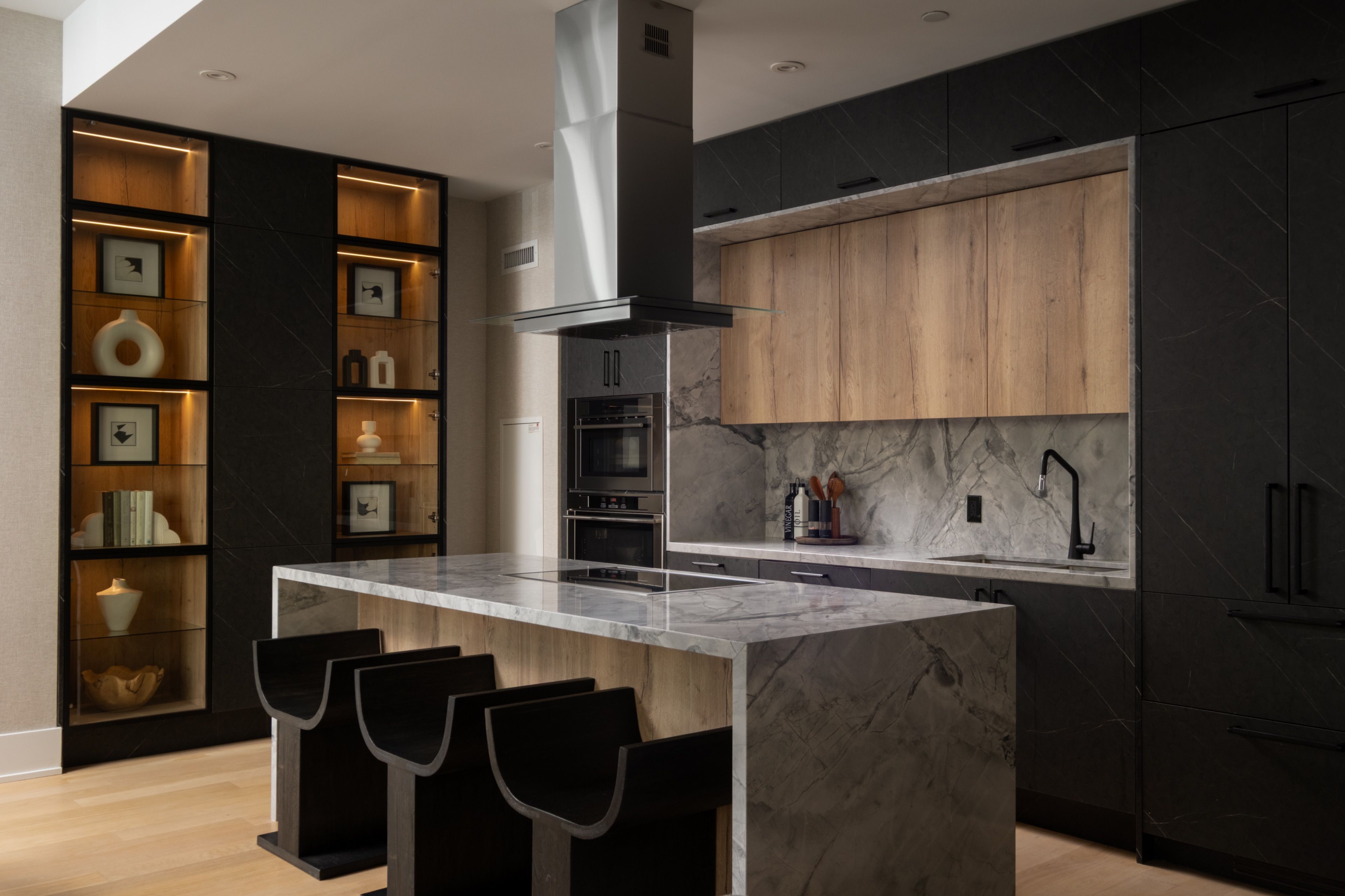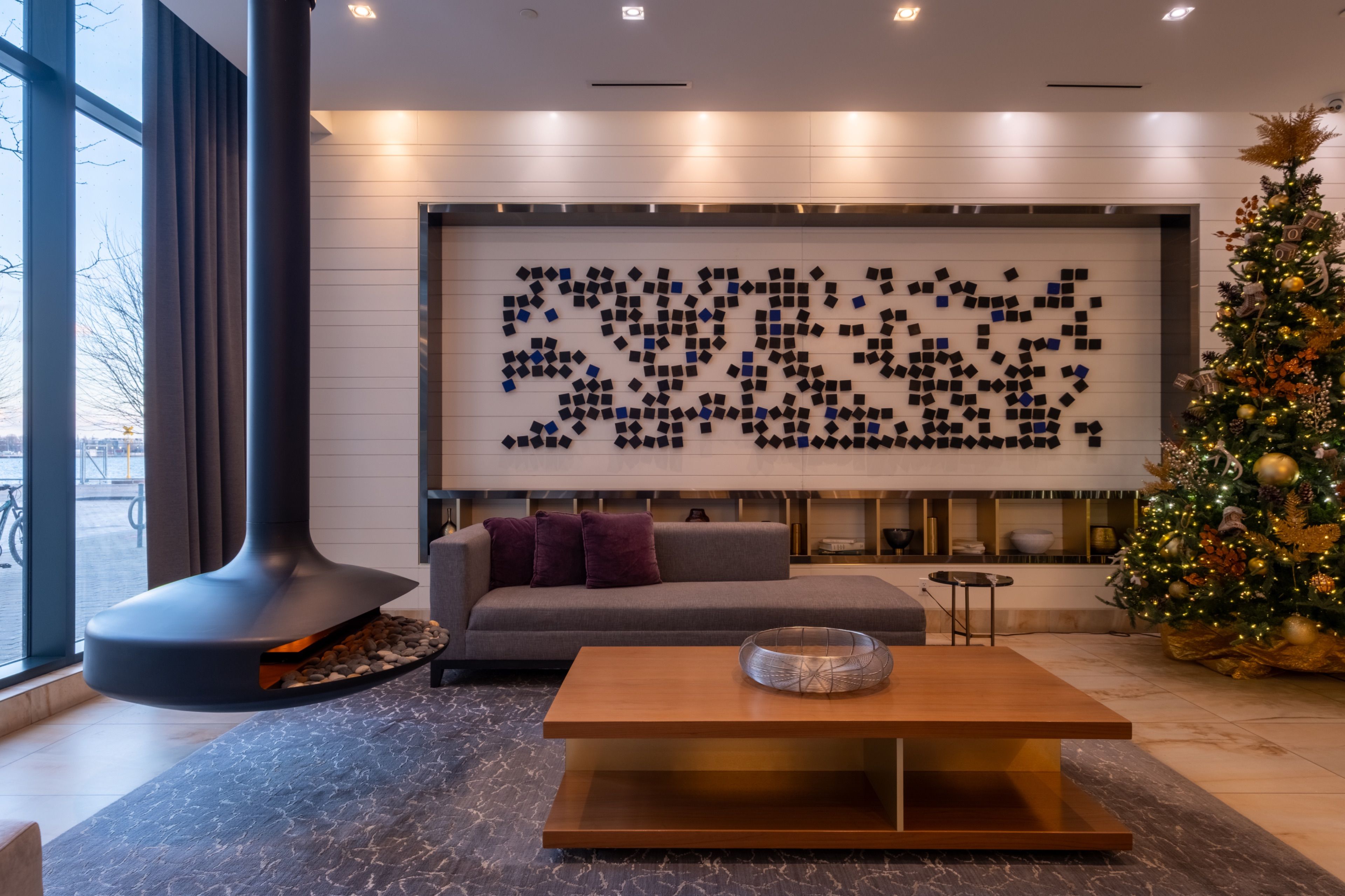 Welcome to 55 Merchants' Wharf, an exceptional waterfront residence where sophisticated design, bespoke finishes, and sweeping lake and city views define elevated downtown living. Thoughtfully curated throughout, this home offers a seamless blend of modern elegance and timeless craftsmanship.The expansive open-concept living space is anchored by a dramatic custom wood-slat feature wall with integrated ambient lighting and a sleek wall-mounted TV, creating an architectural focal point ideal for both refined entertaining and everyday living. Floor-to-ceiling windows bathe the interior in natural light and frame tranquil water views, while neutral tones, clean lines, and premium finishes create a calm, upscale atmosphere that flows effortlessly into the chef-inspired kitchen featuring a dramatic waterfall island, integrated appliances, bespoke cabinetry and striking architectural details that blend warmth with modern sophistication. The dining area is perfectly positioned beside expansive windows, offering an ever-changing urban and waterfront backdrop for memorable meals and gatherings.he primary bedroom is a serene, hotel-inspired retreat with floor-to-ceiling windows, wide-plank hardwood flooring, designer lighting and detailing. The spa-like ensuite offers a freestanding soaker tub, glass-enclosed rainfall shower, double vanity with stone countertops, and elegant wood and marble finishes.A generously sized second bedroom provides flexibility as a guest suite or executive home office complemented by a private ensuite with sleek modern finishes. Step onto the private balcony and enjoy unobstructed views of Lake Ontario-perfect for morning coffee or sunset relaxation. Ideally located steps from the waterfront boardwalk and minutes from the Financial District, St. Lawrence Market, and Toronto's premier dining and cultural destinations, this residence delivers a rare opportunity for luxury waterfront living in one of the city's most sought-after addresses.
