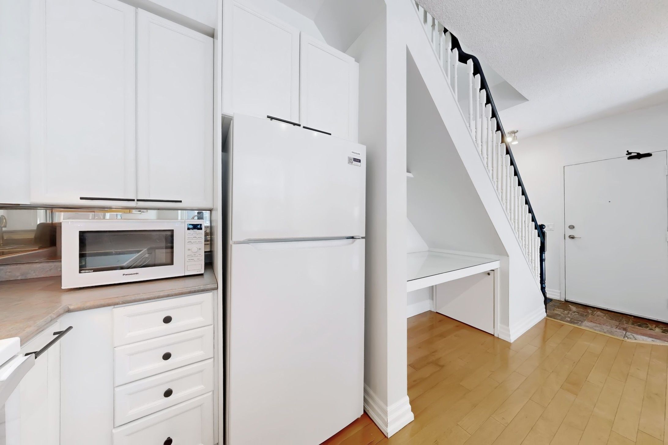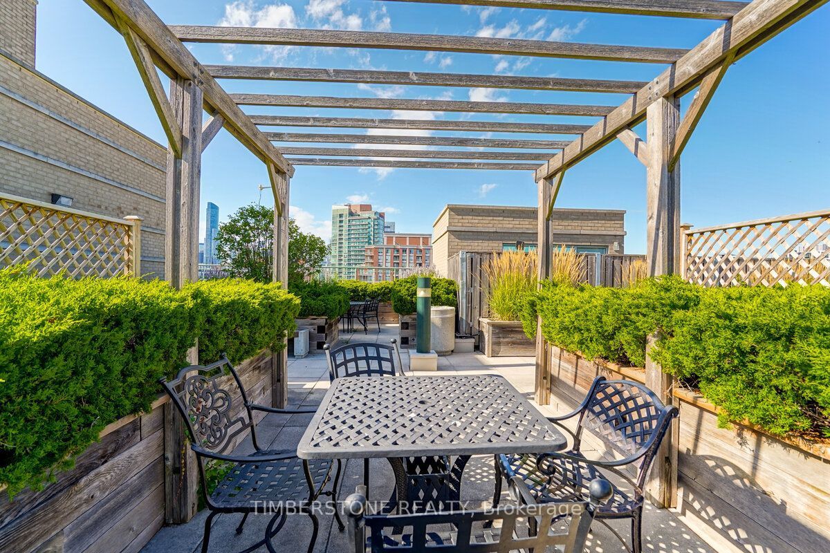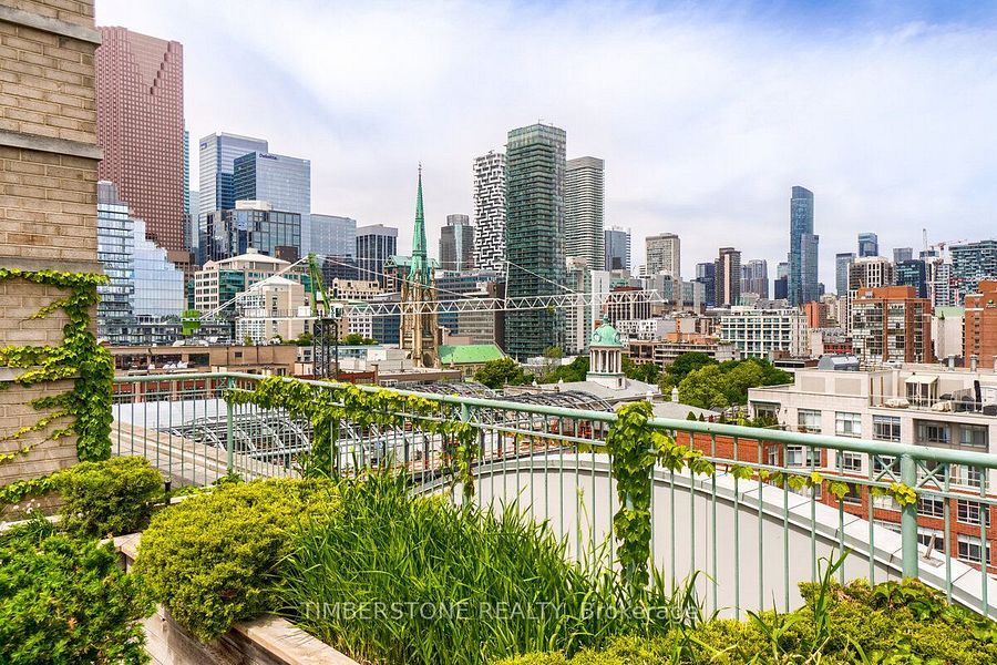 St. Lawrence Market Neighbourhood! Discover a rare two-level townhome (837 sq.ft) that offers a unique loft-like feel with two walkouts to a spacious private patio (539 sq.ft-BBQ allowed), a bright living area with 19 ft ceilings and floor-to-ceiling windows, a separate dining space and a built-in desk for a home office, ideally located across from St. Lawrence Market and minutes from the financial district and Union Station. With lots of windows, the interior offers lots of natural light. The kitchen is open concept with a breakfast bar, while the main floor features hardwood floors. The second floor includes a spacious bedroom, which will easily accommodate a king-sized bed plus space for a home office, two closets plus an ensuite washroom. Amenities include a concierge, gym, party room and stunning rooftop gardens with barbecues. Steps to local restaurants, cafes, shops and more. Easy access to the Gardiner Expressway and DVP. Walk score 100, transit 100, bike 98!