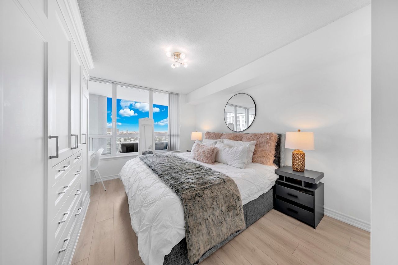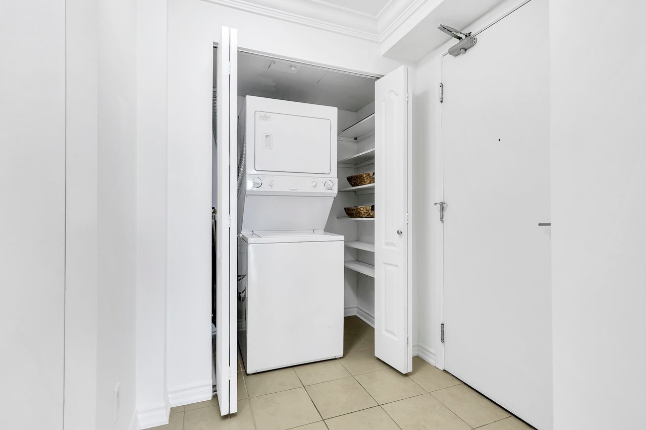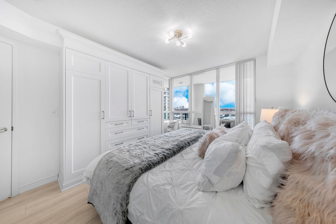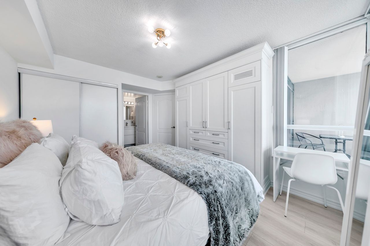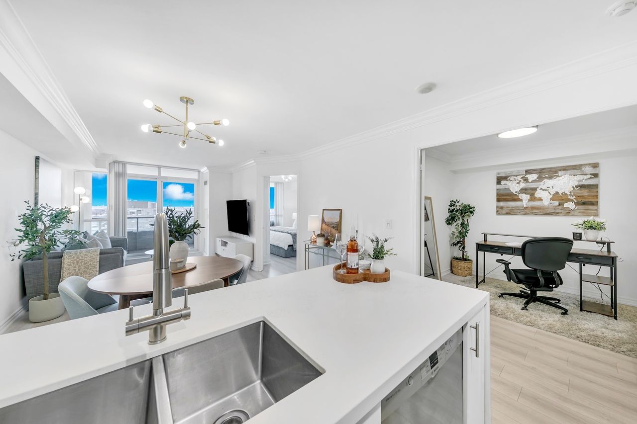 FULLY FURNISHED! Welcome To Your Completely Furnished Home That Includes Everything You Need To Live Comfortably; Just Move-In! This condo is a haven of brightness and space, filled with natural light throughout the day for a welcoming atmosphere. The large primary bedroom features wraparound windows that offer stunning views and a serene retreat, complete with a king-size hydraulic storage bed for optimal comfort and clever storage solutions. Enjoy the luxury of a primary ensuite bathroom plus a separate full bathroom for guests, ensuring privacy for everyone. Additional bedroom amenities include two modern side tables with LED lights and built-in charging, a built-in wardrobe, and a movable vanity with a jewelry mirror. The large den can serve as a second bedroom or a versatile work-from-home setup, equipped with French doors and privacy blinds. Storage is exceptional, thanks to a custom storage cabinet, a dedicated laundry area with built-in pantry storage, and a separate coat and shoe closet. Step out to the oversized private balcony for sweeping panoramic views, perfect for relaxing or enjoying the outdoors. The open living and dining layout is ideal for hosting gatherings, with an expandable dining table and four comfortable chairs that accommodate friends and family effortlessly. A quartz kitchen counter with four adjustable bar stools serves as a stylish focal point, while the cozy seating area and furnished balcony provide enchanting spots for entertaining. Enhance your events with a custom built bar cabinet next to the kitchen island, featuring dedicated glassware storage. Upgraded elegant lighting and fixtures add a touch of sophistication throughout, making every occasion feel special. Stay productive and comfortable with a dedicated ergonomic work-from-home setup, including a desk and ergonomic chair for all-day focus. Entertainment is elevated with an LG 65-inch 4K UHD Smart TV on a movable wall bracket, while Google Nest automated heating and cooling.
