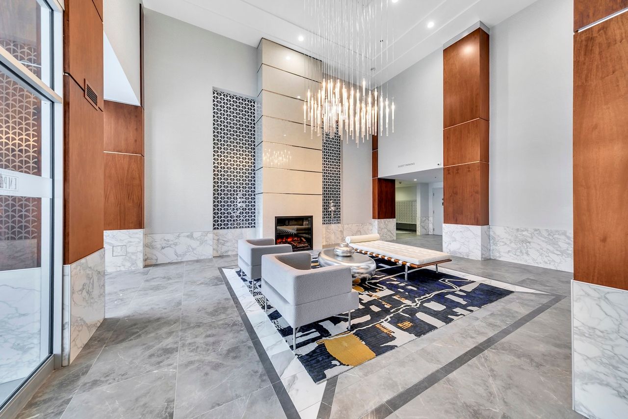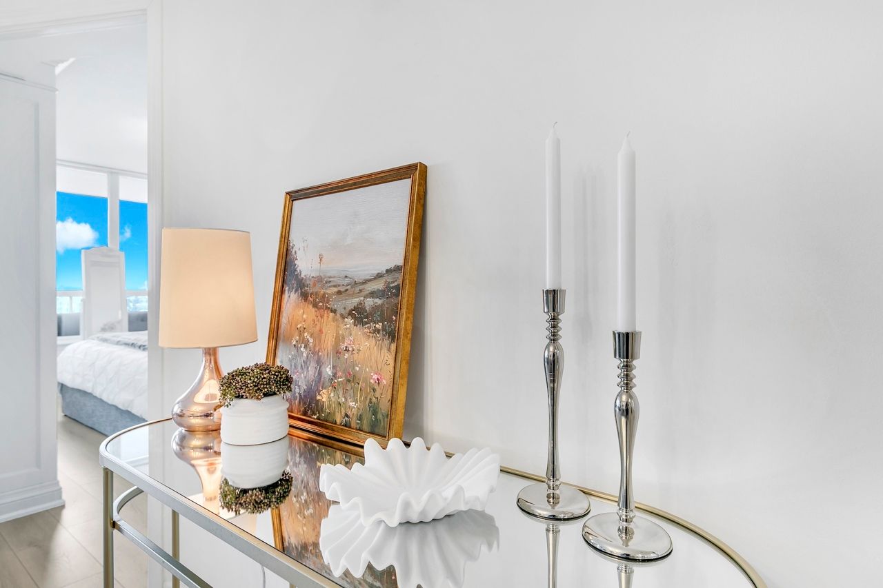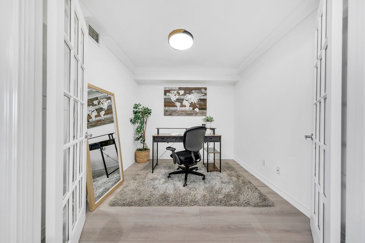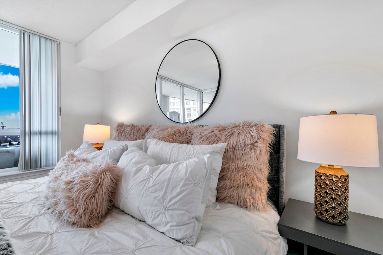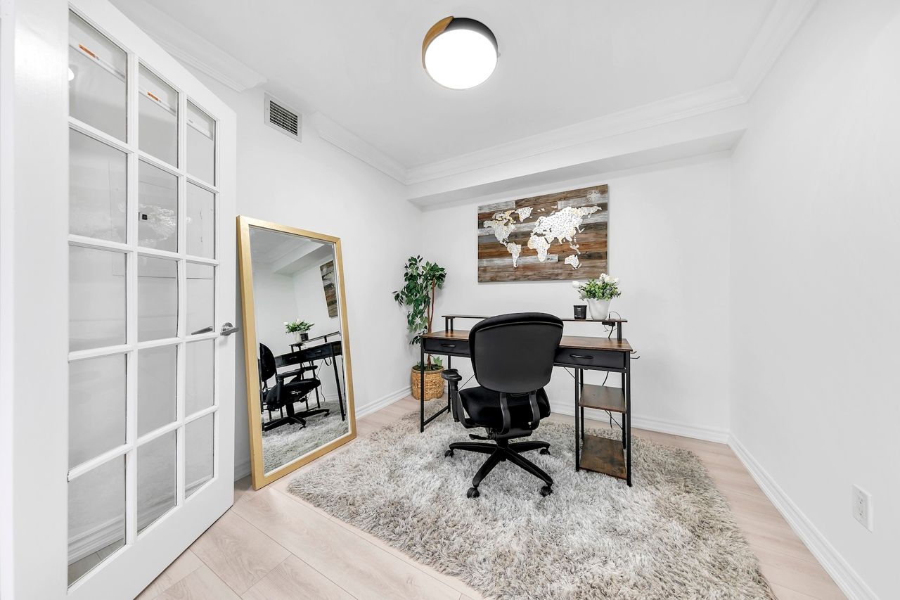 FULLY FURNISHED! Welcome To Your Completely Furnished Home That Includes Everything You Need To Live Comfortably; Just Move-In! This condo is a haven of brightness and space, filled with natural light throughout the day for a welcoming atmosphere. The large primary bedroom features wraparound windows that offer stunning views and a serene retreat, complete with a king-size hydraulic storage bed for optimal comfort and clever storage solutions. Enjoy the luxury of a primary ensuite bathroom plus a separate full bathroom for guests, ensuring privacy for everyone. Additional bedroom amenities include two modern side tables with LED lights and built-in charging, a built-in wardrobe, and a movable vanity with a jewelry mirror. The large den can serve as a second bedroom or a versatile work-from-home setup, equipped with French doors and privacy blinds. Storage is exceptional, thanks to a custom storage cabinet, a dedicated laundry area with built-in pantry storage, and a separate coat and shoe closet. Step out to the oversized private balcony for sweeping panoramic views, perfect for relaxing or enjoying the outdoors. The open living and dining layout is ideal for hosting gatherings, with an expandable dining table and four comfortable chairs that accommodate friends and family effortlessly. A quartz kitchen counter with four adjustable bar stools serves as a stylish focal point, while the cozy seating area and furnished balcony provide enchanting spots for entertaining. Enhance your events with a custom built bar cabinet next to the kitchen island, featuring dedicated glassware storage. Upgraded elegant lighting and fixtures add a touch of sophistication throughout, making every occasion feel special. Stay productive and comfortable with a dedicated ergonomic work-from-home setup, including a desk and ergonomic chair for all-day focus. Entertainment is elevated with an LG 65-inch 4K UHD Smart TV on a movable wall bracket, while Google Nest automated heating and cooling.