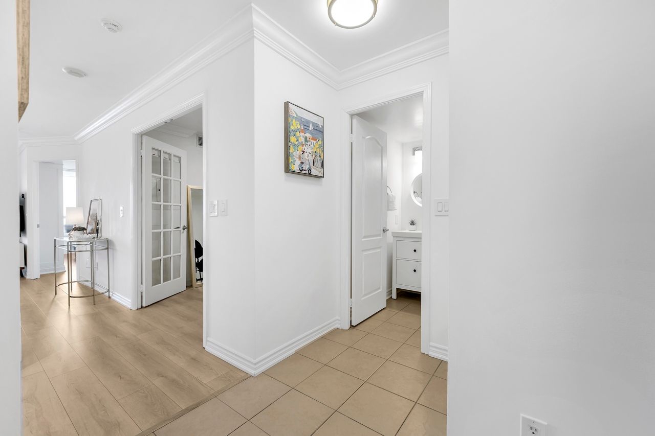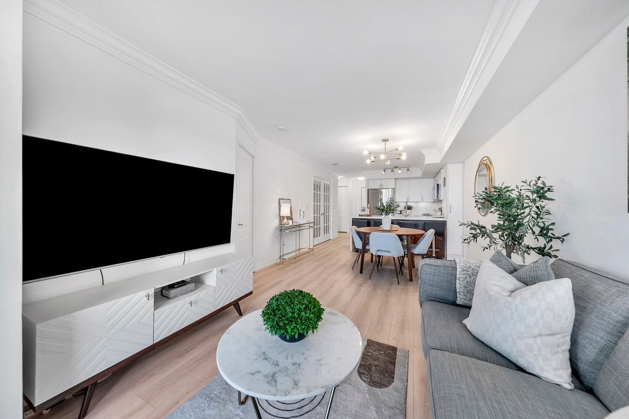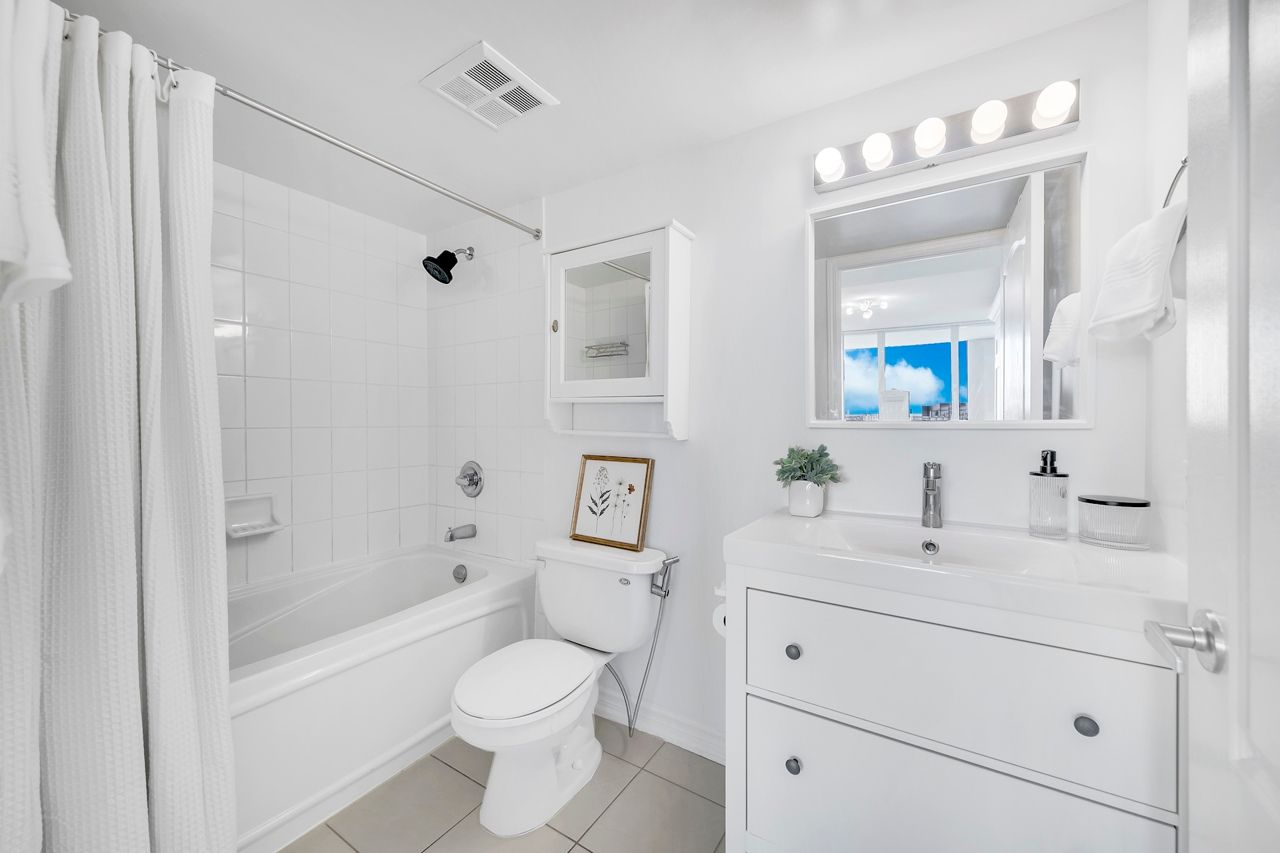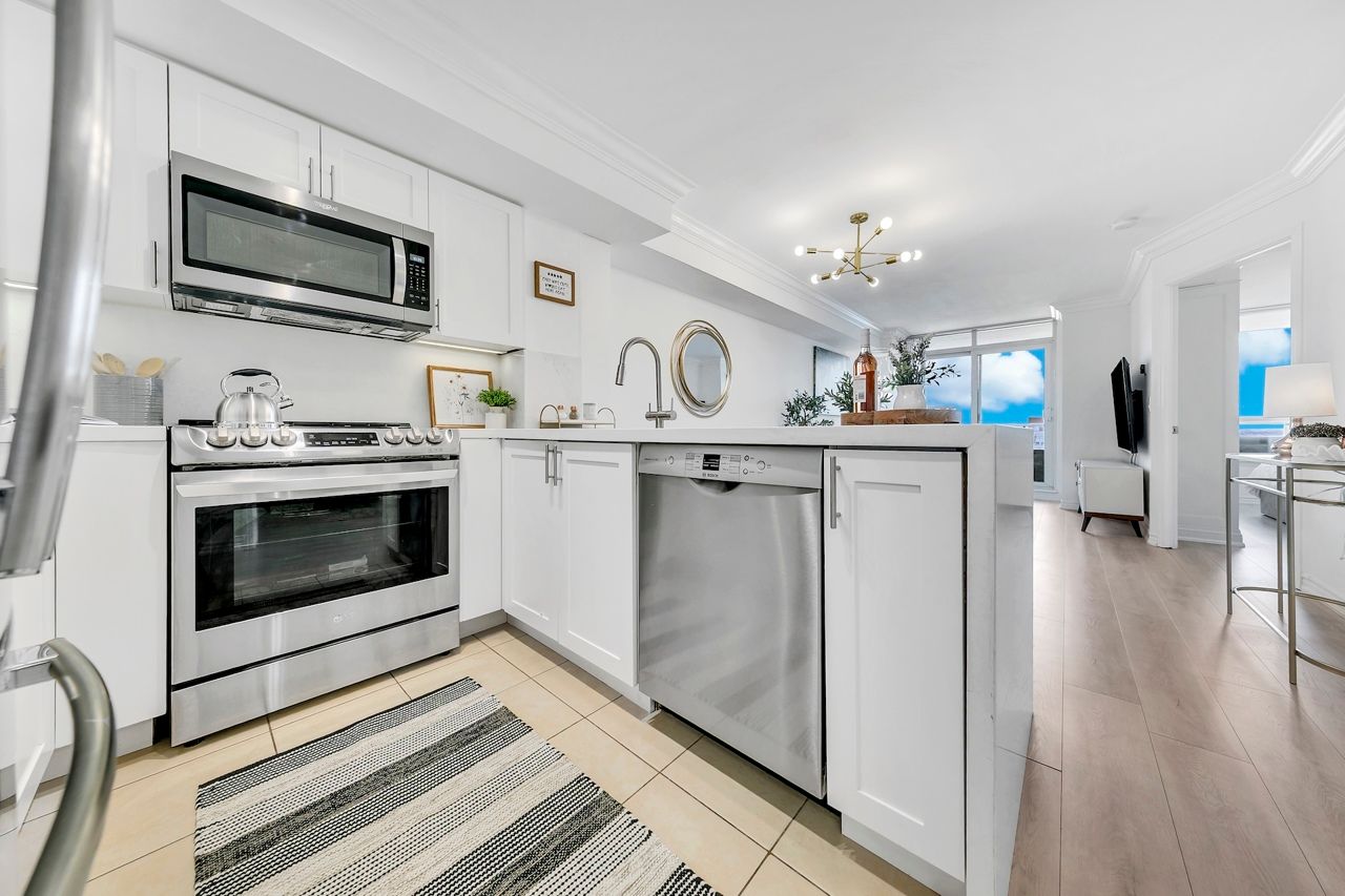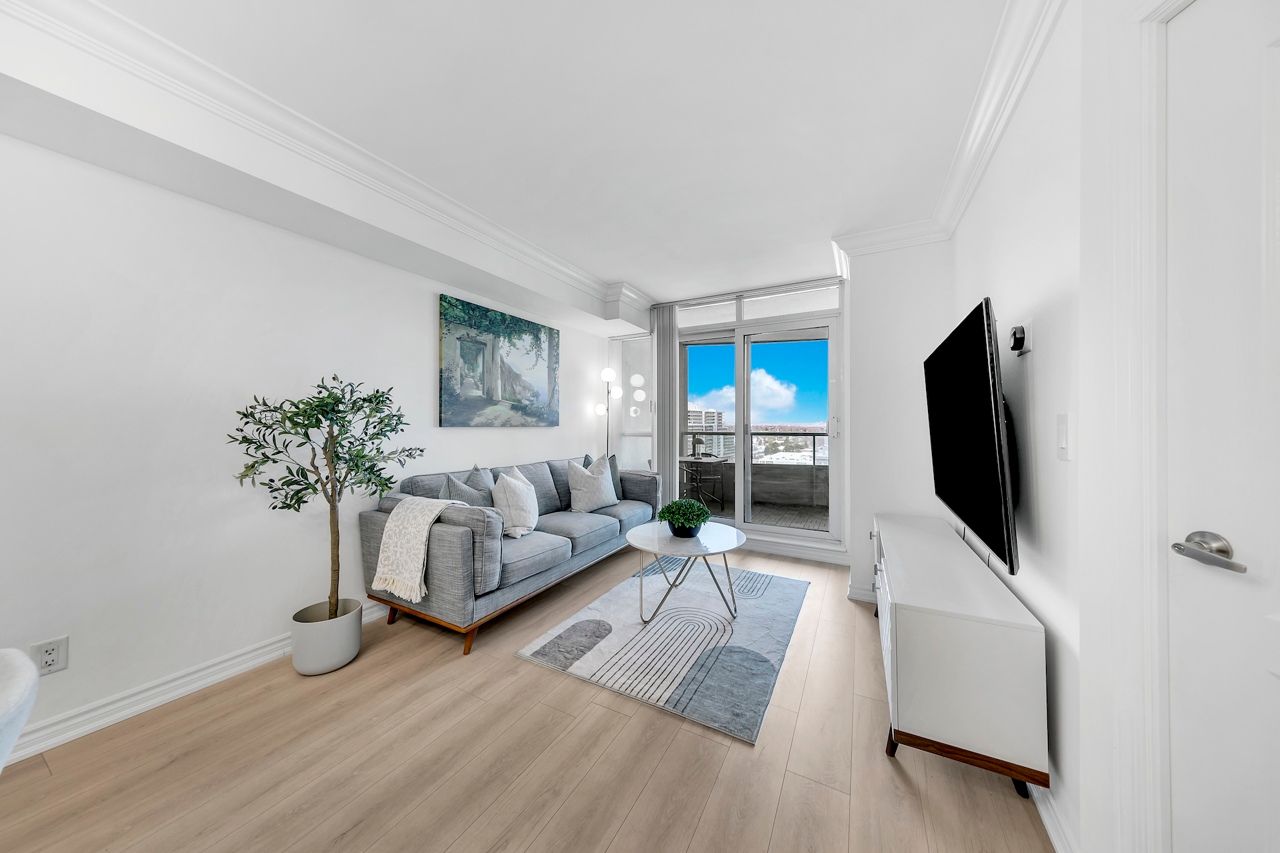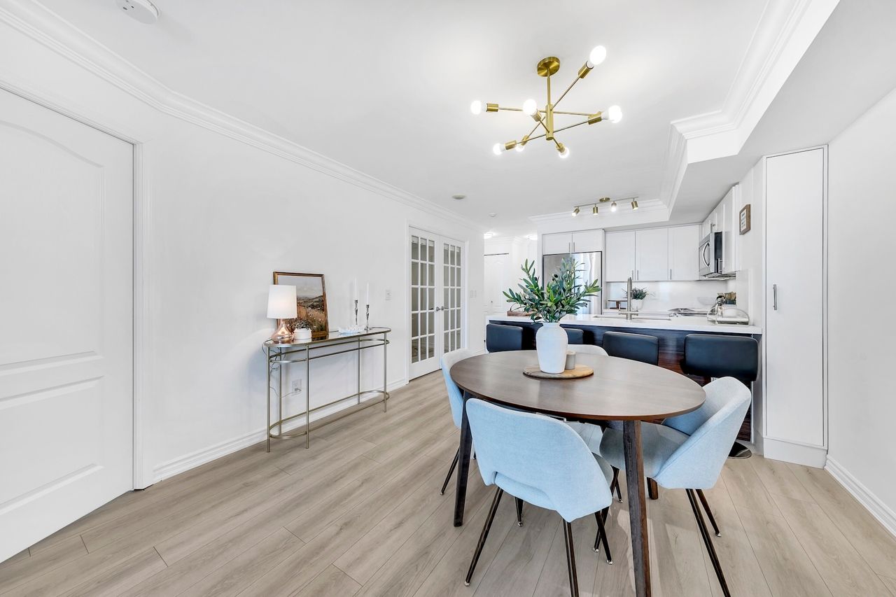 FULLY FURNISHED! Welcome To Your Completely Furnished Home That Includes Everything You Need To Live Comfortably; Just Move-In! This condo is a haven of brightness and space, filled with natural light throughout the day for a welcoming atmosphere. The large primary bedroom features wraparound windows that offer stunning views and a serene retreat, complete with a king-size hydraulic storage bed for optimal comfort and clever storage solutions. Enjoy the luxury of a primary ensuite bathroom plus a separate full bathroom for guests, ensuring privacy for everyone. Additional bedroom amenities include two modern side tables with LED lights and built-in charging, a built-in wardrobe, and a movable vanity with a jewelry mirror. The large den can serve as a second bedroom or a versatile work-from-home setup, equipped with French doors and privacy blinds. Storage is exceptional, thanks to a custom storage cabinet, a dedicated laundry area with built-in pantry storage, and a separate coat and shoe closet. Step out to the oversized private balcony for sweeping panoramic views, perfect for relaxing or enjoying the outdoors. The open living and dining layout is ideal for hosting gatherings, with an expandable dining table and four comfortable chairs that accommodate friends and family effortlessly. A quartz kitchen counter with four adjustable bar stools serves as a stylish focal point, while the cozy seating area and furnished balcony provide enchanting spots for entertaining. Enhance your events with a custom built bar cabinet next to the kitchen island, featuring dedicated glassware storage. Upgraded elegant lighting and fixtures add a touch of sophistication throughout, making every occasion feel special. Stay productive and comfortable with a dedicated ergonomic work-from-home setup, including a desk and ergonomic chair for all-day focus. Entertainment is elevated with an LG 65-inch 4K UHD Smart TV on a movable wall bracket, while Google Nest automated heating and cooling.