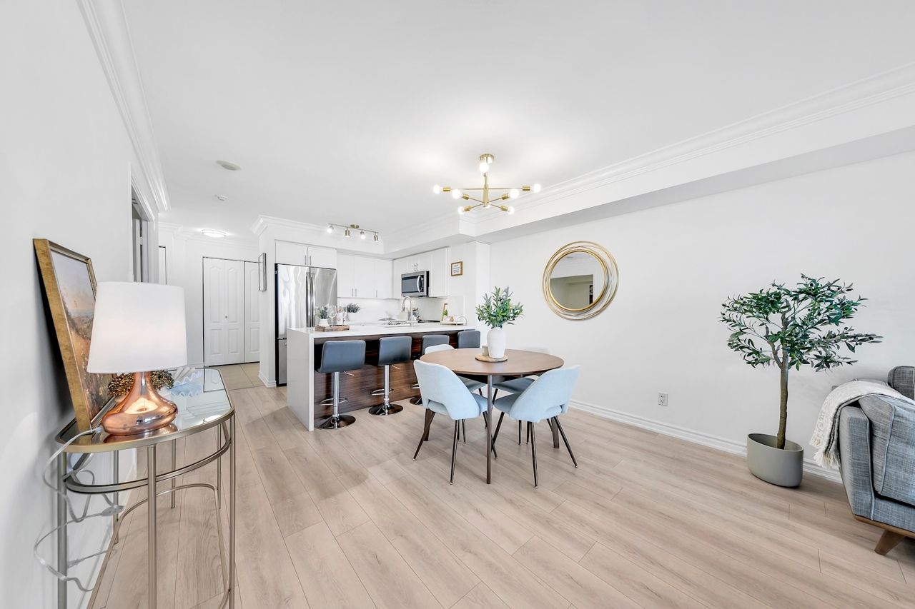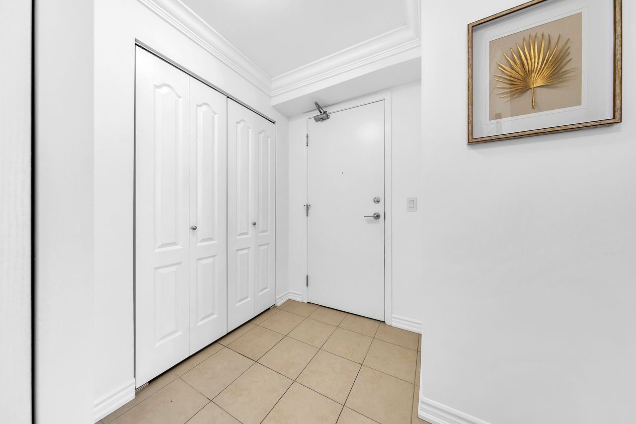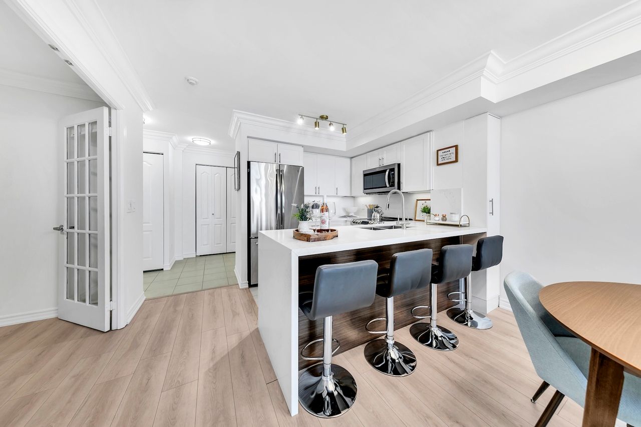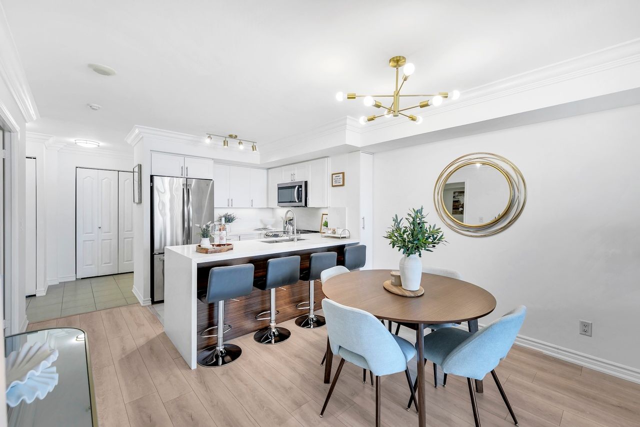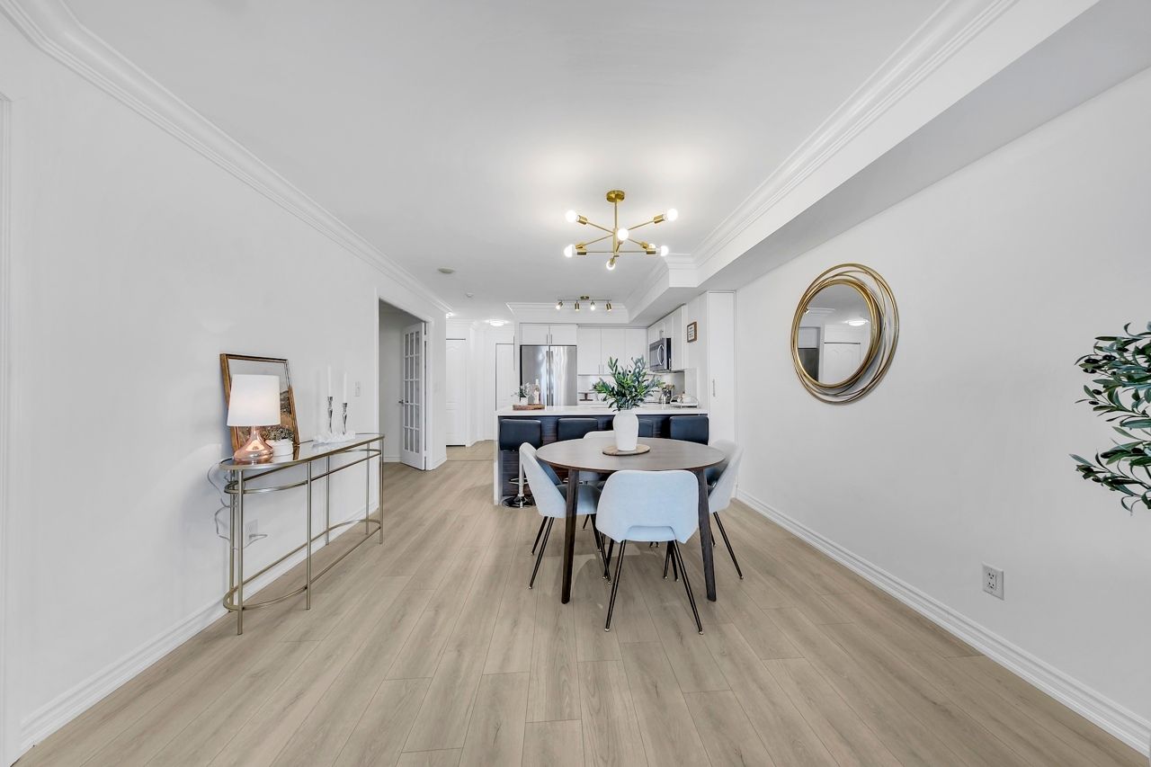 FULLY FURNISHED! Welcome To Your Completely Furnished Home That Includes Everything You Need To Live Comfortably; Just Move-In! This condo is a haven of brightness and space, filled with natural light throughout the day for a welcoming atmosphere. The large primary bedroom features wraparound windows that offer stunning views and a serene retreat, complete with a king-size hydraulic storage bed for optimal comfort and clever storage solutions. Enjoy the luxury of a primary ensuite bathroom plus a separate full bathroom for guests, ensuring privacy for everyone. Additional bedroom amenities include two modern side tables with LED lights and built-in charging, a built-in wardrobe, and a movable vanity with a jewelry mirror. The large den can serve as a second bedroom or a versatile work-from-home setup, equipped with French doors and privacy blinds. Storage is exceptional, thanks to a custom storage cabinet, a dedicated laundry area with built-in pantry storage, and a separate coat and shoe closet. Step out to the oversized private balcony for sweeping panoramic views, perfect for relaxing or enjoying the outdoors. The open living and dining layout is ideal for hosting gatherings, with an expandable dining table and four comfortable chairs that accommodate friends and family effortlessly. A quartz kitchen counter with four adjustable bar stools serves as a stylish focal point, while the cozy seating area and furnished balcony provide enchanting spots for entertaining. Enhance your events with a custom built bar cabinet next to the kitchen island, featuring dedicated glassware storage. Upgraded elegant lighting and fixtures add a touch of sophistication throughout, making every occasion feel special. Stay productive and comfortable with a dedicated ergonomic work-from-home setup, including a desk and ergonomic chair for all-day focus. Entertainment is elevated with an LG 65-inch 4K UHD Smart TV on a movable wall bracket, while Google Nest automated heating and cooling.