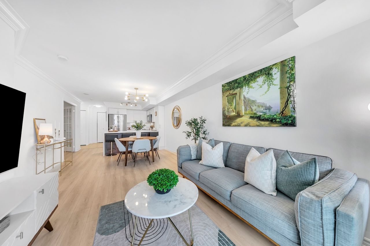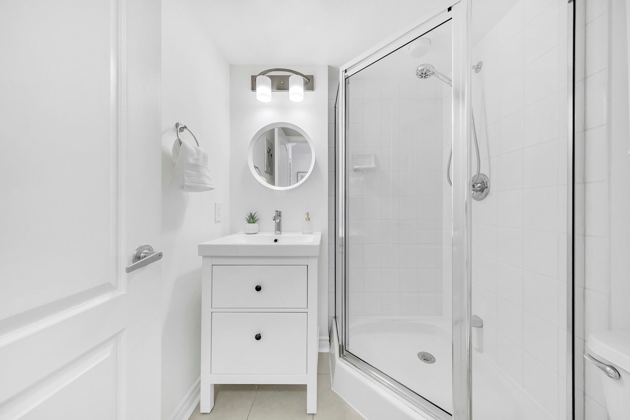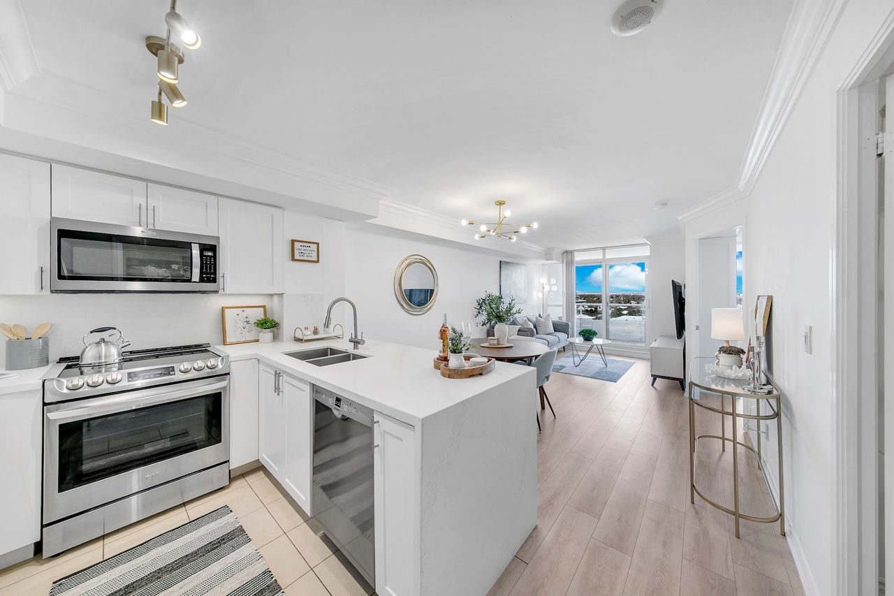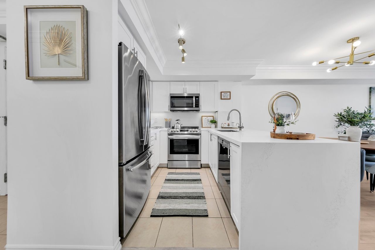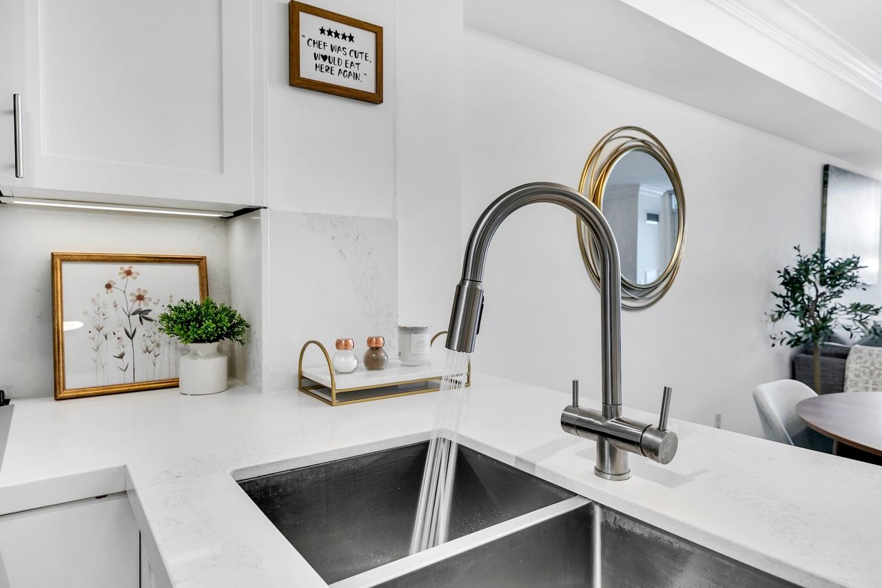 FULLY FURNISHED! Welcome To Your Completely Furnished Home That Includes Everything You Need To Live Comfortably; Just Move-In! This condo is a haven of brightness and space, filled with natural light throughout the day for a welcoming atmosphere. The large primary bedroom features wraparound windows that offer stunning views and a serene retreat, complete with a king-size hydraulic storage bed for optimal comfort and clever storage solutions. Enjoy the luxury of a primary ensuite bathroom plus a separate full bathroom for guests, ensuring privacy for everyone. Additional bedroom amenities include two modern side tables with LED lights and built-in charging, a built-in wardrobe, and a movable vanity with a jewelry mirror. The large den can serve as a second bedroom or a versatile work-from-home setup, equipped with French doors and privacy blinds. Storage is exceptional, thanks to a custom storage cabinet, a dedicated laundry area with built-in pantry storage, and a separate coat and shoe closet. Step out to the oversized private balcony for sweeping panoramic views, perfect for relaxing or enjoying the outdoors. The open living and dining layout is ideal for hosting gatherings, with an expandable dining table and four comfortable chairs that accommodate friends and family effortlessly. A quartz kitchen counter with four adjustable bar stools serves as a stylish focal point, while the cozy seating area and furnished balcony provide enchanting spots for entertaining. Enhance your events with a custom built bar cabinet next to the kitchen island, featuring dedicated glassware storage. Upgraded elegant lighting and fixtures add a touch of sophistication throughout, making every occasion feel special. Stay productive and comfortable with a dedicated ergonomic work-from-home setup, including a desk and ergonomic chair for all-day focus. Entertainment is elevated with an LG 65-inch 4K UHD Smart TV on a movable wall bracket, while Google Nest automated heating and cooling.