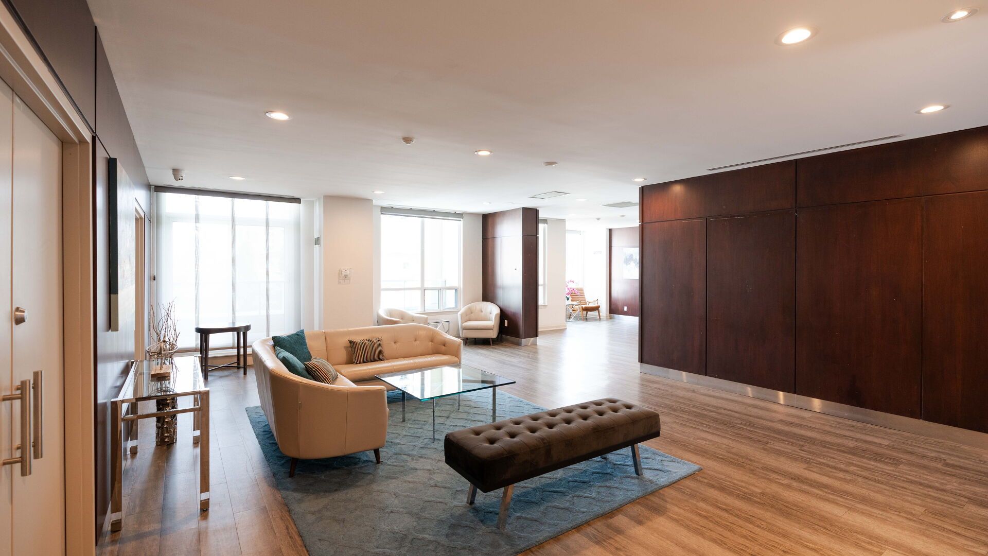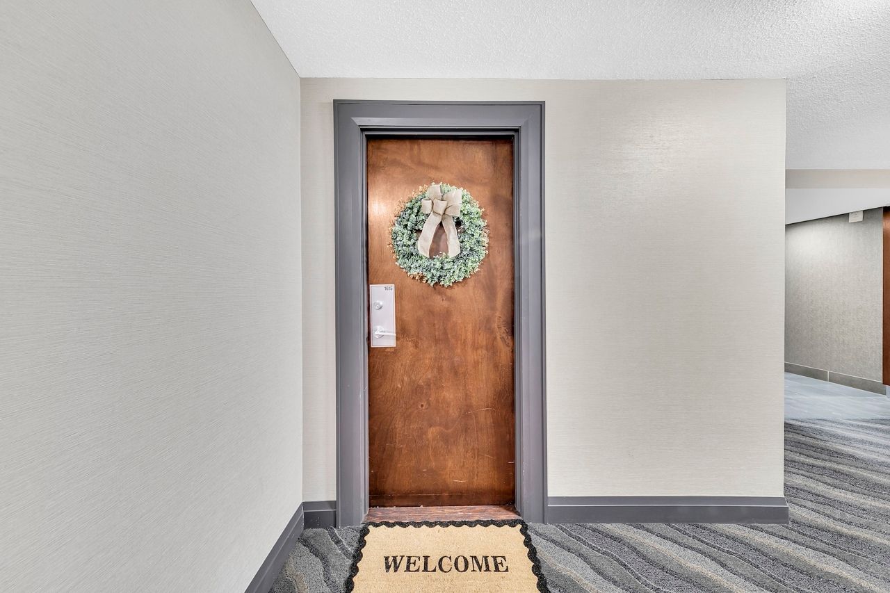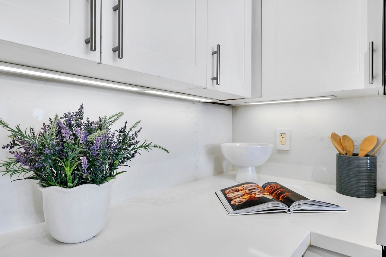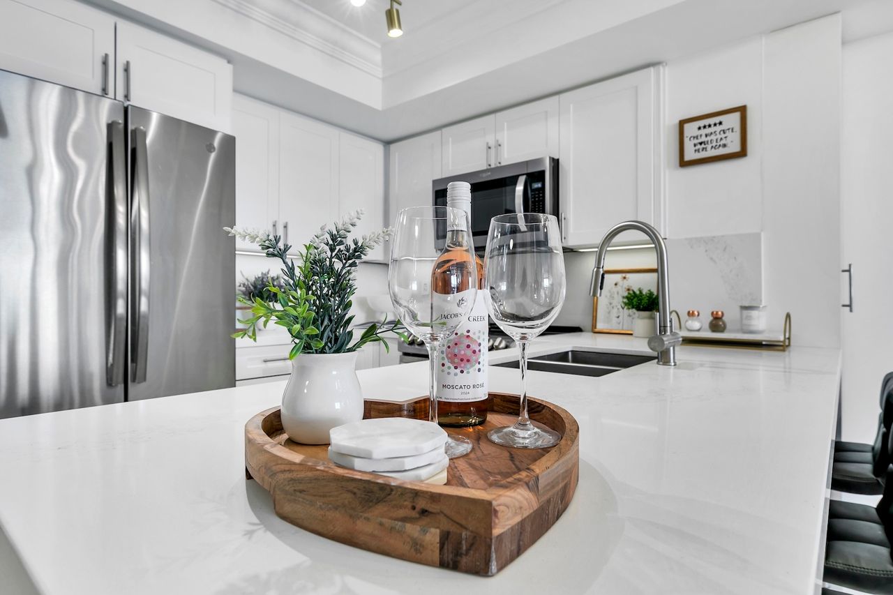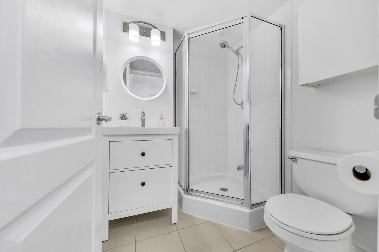 FULLY FURNISHED! Welcome To Your Completely Furnished Home That Includes Everything You Need To Live Comfortably; Just Move-In! This condo is a haven of brightness and space, filled with natural light throughout the day for a welcoming atmosphere. The large primary bedroom features wraparound windows that offer stunning views and a serene retreat, complete with a king-size hydraulic storage bed for optimal comfort and clever storage solutions. Enjoy the luxury of a primary ensuite bathroom plus a separate full bathroom for guests, ensuring privacy for everyone. Additional bedroom amenities include two modern side tables with LED lights and built-in charging, a built-in wardrobe, and a movable vanity with a jewelry mirror. The large den can serve as a second bedroom or a versatile work-from-home setup, equipped with French doors and privacy blinds. Storage is exceptional, thanks to a custom storage cabinet, a dedicated laundry area with built-in pantry storage, and a separate coat and shoe closet. Step out to the oversized private balcony for sweeping panoramic views, perfect for relaxing or enjoying the outdoors. The open living and dining layout is ideal for hosting gatherings, with an expandable dining table and four comfortable chairs that accommodate friends and family effortlessly. A quartz kitchen counter with four adjustable bar stools serves as a stylish focal point, while the cozy seating area and furnished balcony provide enchanting spots for entertaining. Enhance your events with a custom built bar cabinet next to the kitchen island, featuring dedicated glassware storage. Upgraded elegant lighting and fixtures add a touch of sophistication throughout, making every occasion feel special. Stay productive and comfortable with a dedicated ergonomic work-from-home setup, including a desk and ergonomic chair for all-day focus. Entertainment is elevated with an LG 65-inch 4K UHD Smart TV on a movable wall bracket, while Google Nest automated heating and cooling.