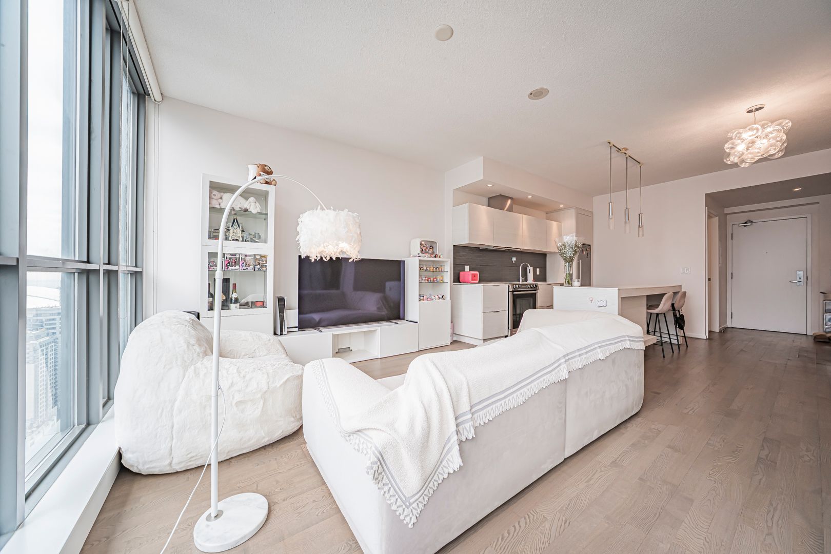 Welcome to Charlie Condos in the heart of King West! Suite 3004 offers one of the best 1+1 layouts on the market, combining luxury, brightness, and functionality. Freshly painted and featuring hardwood floors throughout, this spacious unit includes 2 full bathrooms, a rare and highly desirable feature for a 1+1 configuration. This bright and spacious residence features floor-to-ceiling windows that flood the space with natural light, 9-ft ceilings, and an open-concept layout that feels both modern and inviting.The versatile den is ideal as a second bedroom or home office, making this suite exceptionally practical. The contemporary kitchen showcases a large island, and stainless steel appliances, perfect for everyday living and entertaining. The primary bedroom is generously sized, complemented by ample storage and a spa-inspired bath for a true luxury feel. Amazing building amenities include a yoga & gym area, party room, lounge, billiards/games room, sauna, fully landscaped outdoor garden/deck area with pool and BBQ lounge, 24-hour concierge, and visitor parking. Steps to transit, top restaurants and bars, parks, grocery stores, TIFF Lightbox, Queen West shopping, Chinatown, the Entertainment District, Rogers Centre, and the iconic CN Tower - truly downtown living at its finest. Note Home is partially virtually staged.