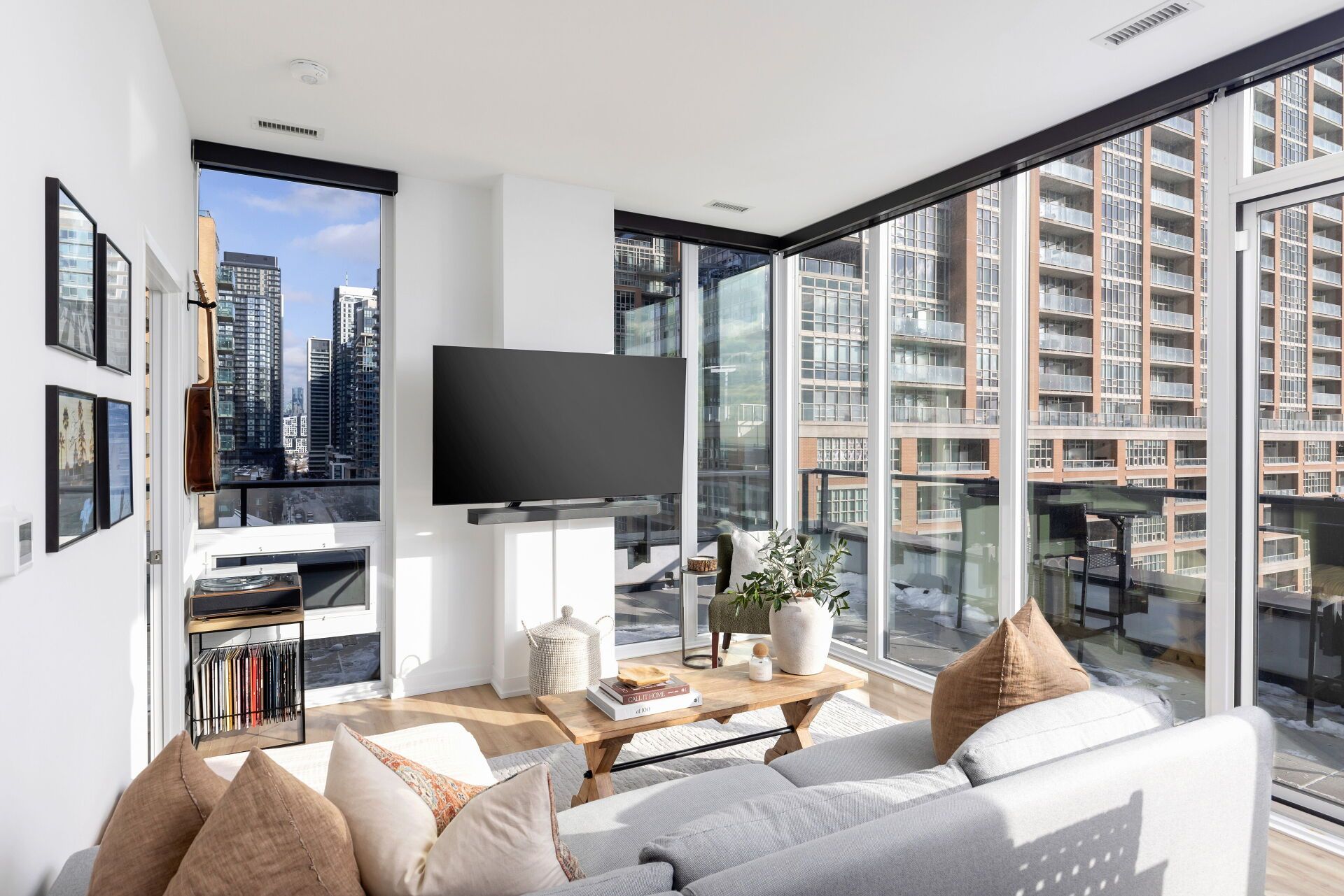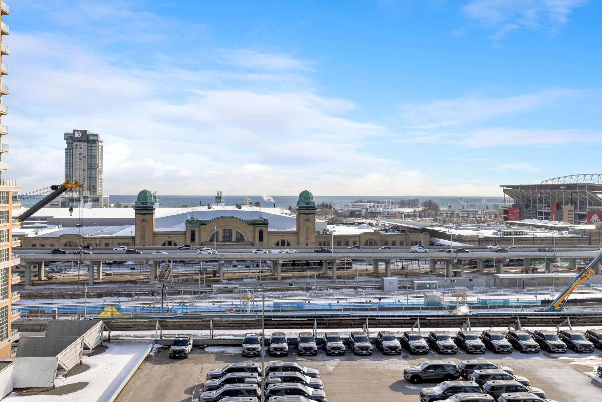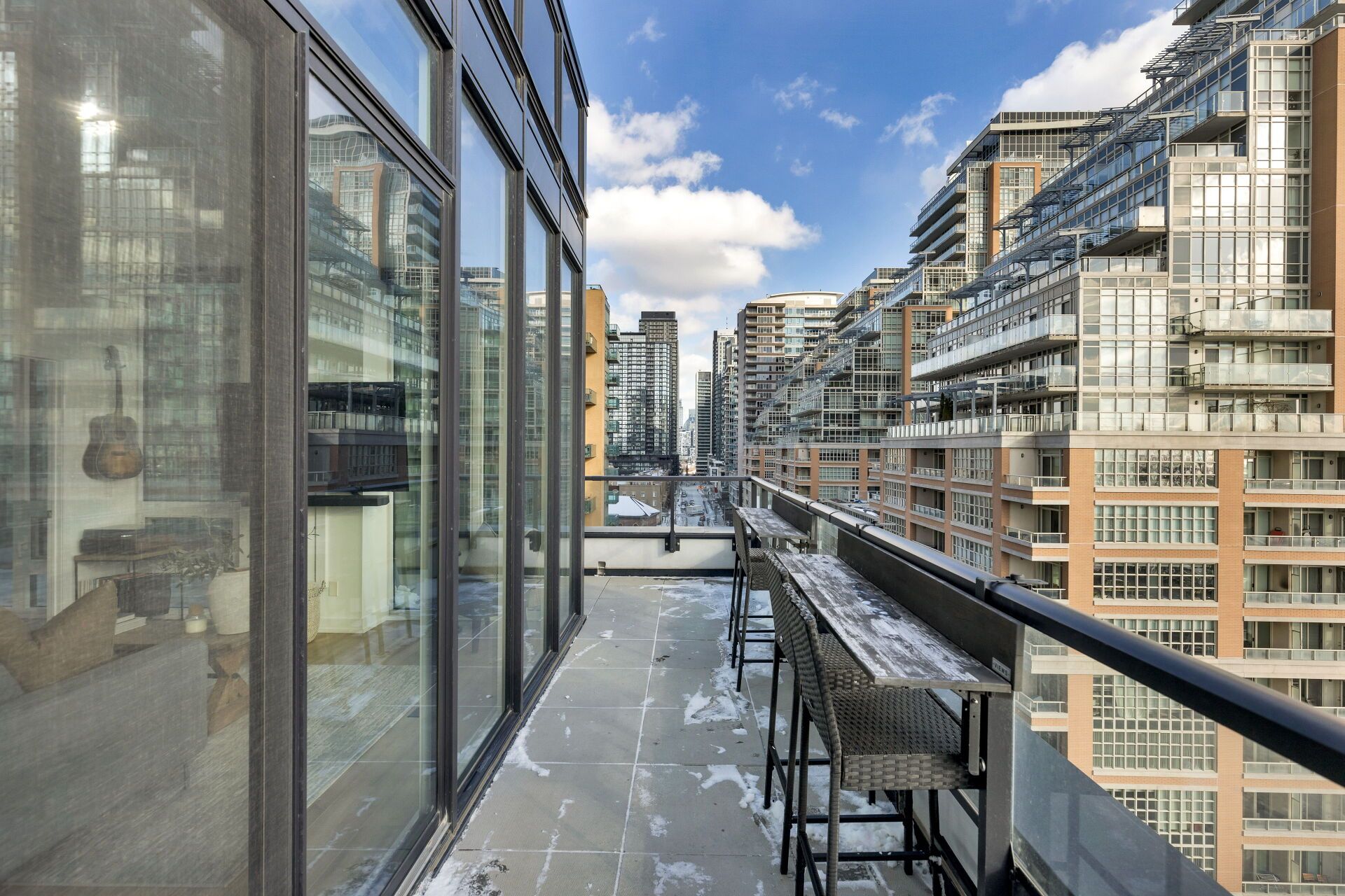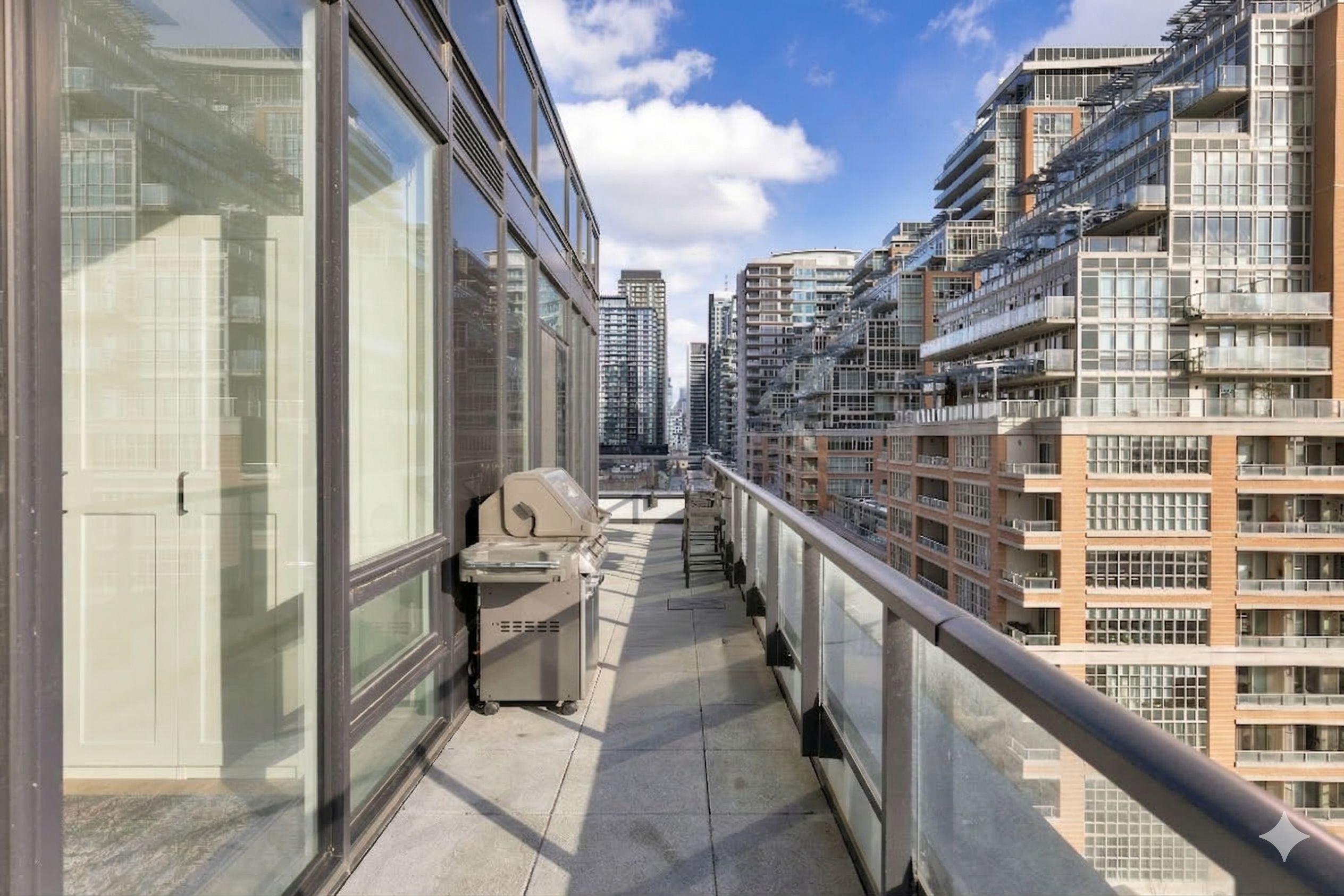 Experience the best of summer with this rare 500-square-foot wraparound terrace and gas line hookup - Liberty Village's premier outdoor living opportunity. This corner 3-bedroom + den residence at 135 East Liberty offers breathtaking unobstructed lake views from its expansive south-east terrace, complemented by custom motorized floor-to-ceiling blinds throughout. Built in 2021, this modern suite showcases thoughtful design throughout - from 9-and-a-half-foot ceilings and floor-to-ceiling windows without bulkheads, to engineered hardwood floors and sound-attenuated windows that create a peaceful sanctuary above the city. The intelligent layout maximizes privacy with most walls unshared with neighbours. The chef's kitchen features premium finishes including quartz countertops and backsplash, custom island, stainless steel appliances (integrated fridge/dishwasher), and soft-close cabinetry. Adjacent custom bar area with beverage/wine cooler and built-in console creates the perfect entertaining space. Three generous bedrooms include a primary suite with south-facing lake views, direct terrace access, and 4-piece ensuite. The versatile second bedroom functions perfectly as a home office for work-from-home professionals. Corner third bedroom boasts eastern city views through a wall of windows. Premium building amenities (gym, party room, rooftop terrace, communal BBQs, shared workspace, concierge), one indoor parking spot, and a premium locker (close to parking space - huge bonus). Steps to Trinity Bellwoods, King West entertainment, Liberty Village dining, and waterfront trails. Easy access to Gardiner/DVP, Exhibition GO and Waterfront Streetcar loop, for commuters moving to the city. Maintenance: $1,035.32 includes heat, cac, common elements, internet and building insurance.