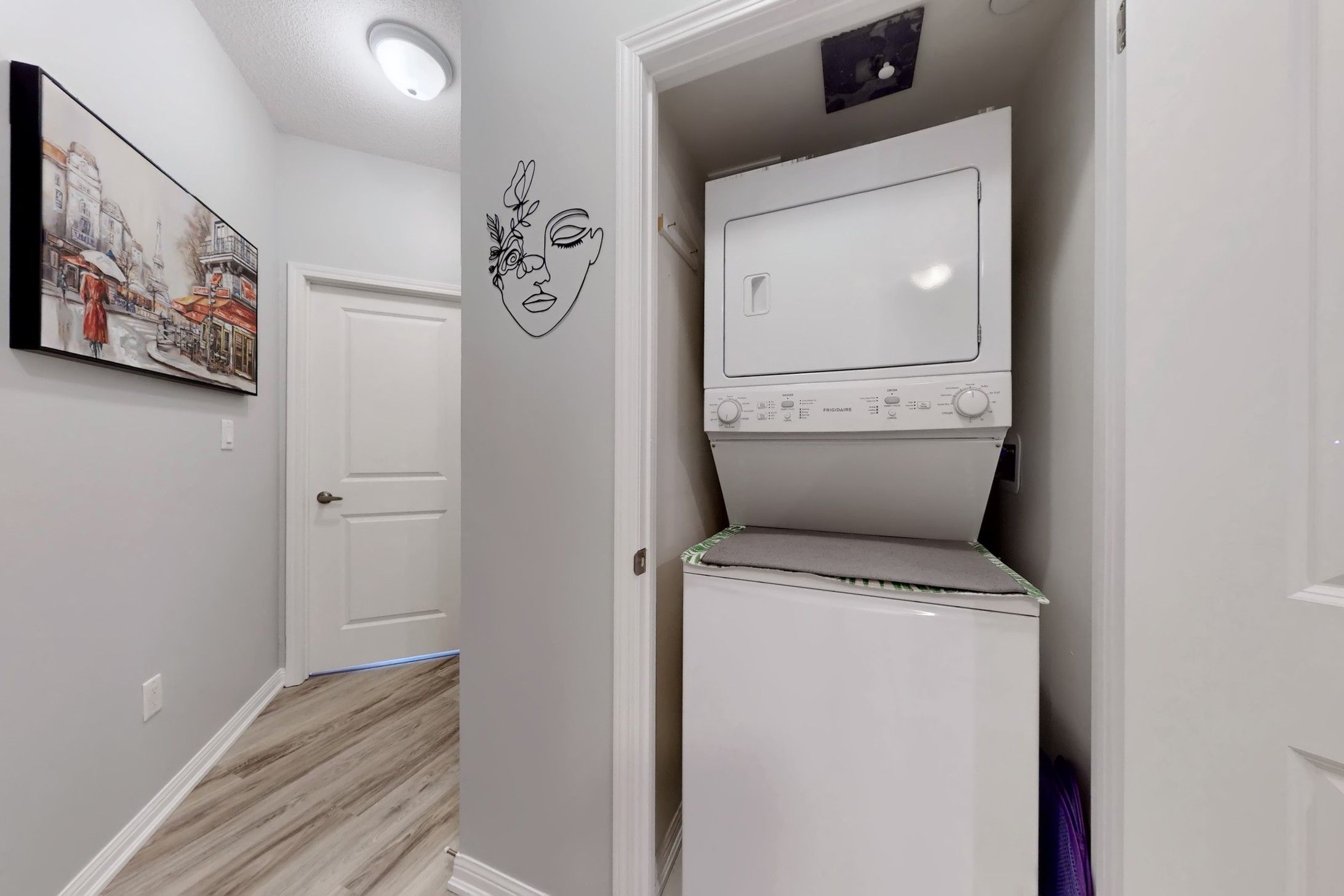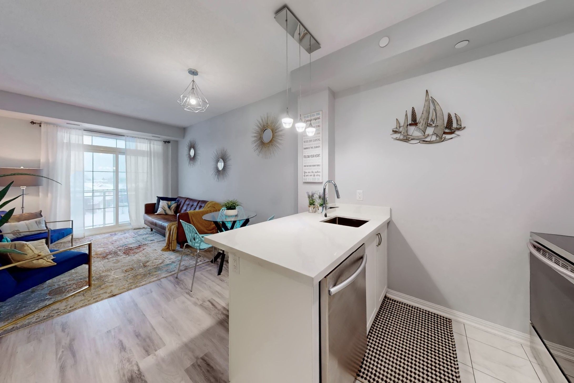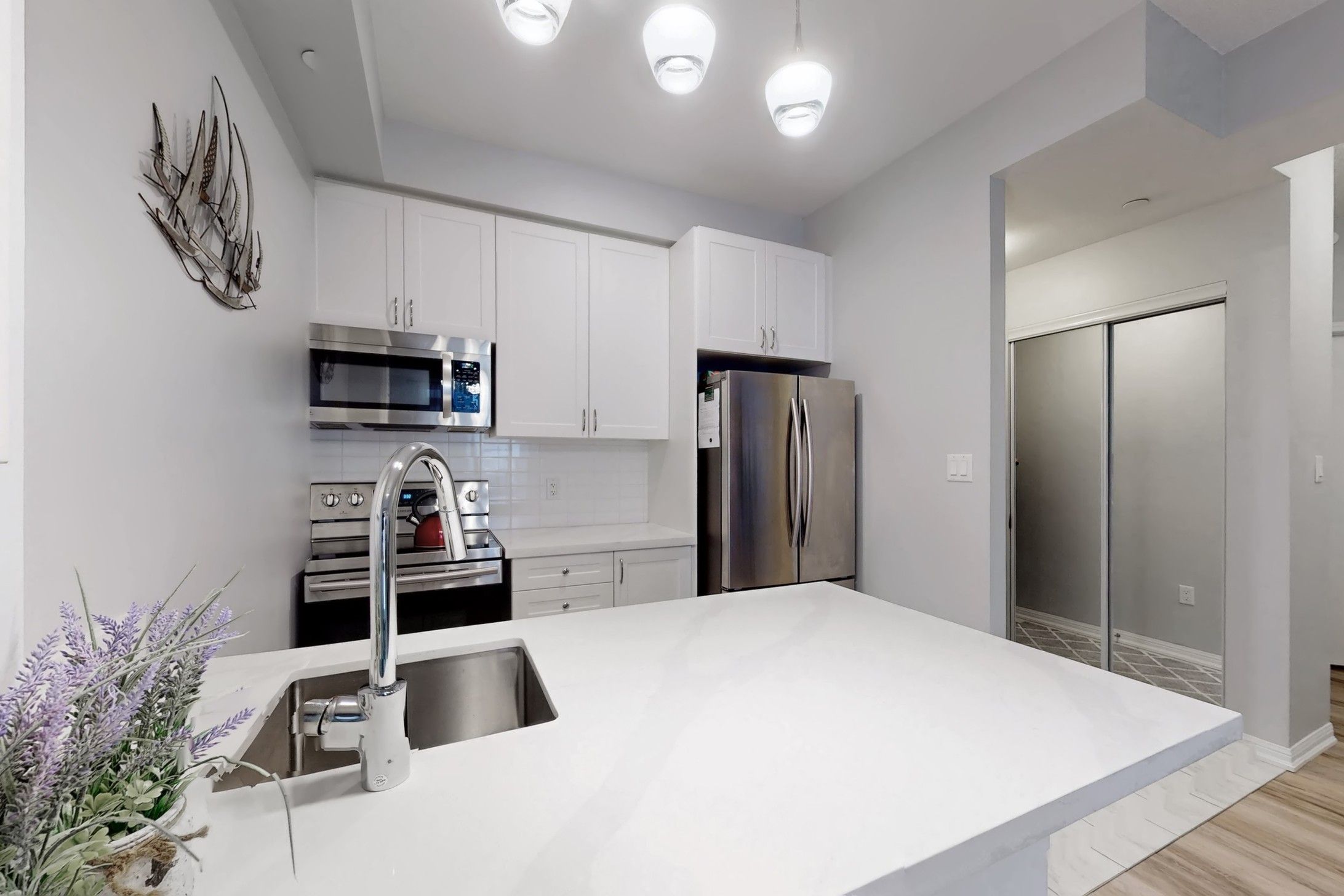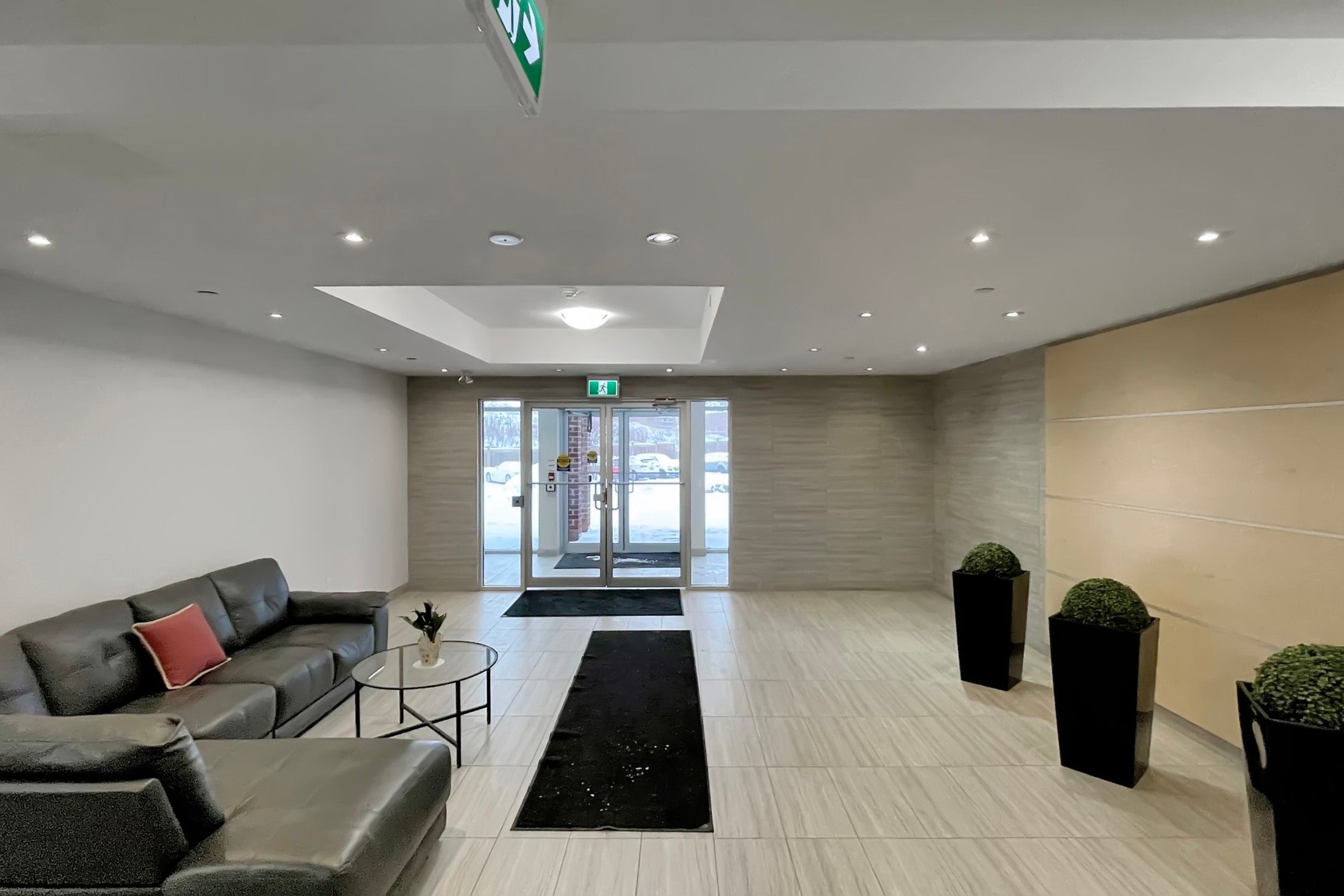 Absolutely stunning and rarely offered top-floor 1+1 bedroom unit. Well-maintained building with elevator. Featuring all stainless steel appliances, quartz countertops, and a breakfast bar. Enjoy a spacious living and dining area with walkout to a private balcony. The primary bedroom retreat offers a semi-ensuite and two closets. This unit provides a rare and generous amount of storage space. The den can easily be used as a second bedroom, home office, or flex space. Conveniently located close to schools, shopping, public transit, and Hwy 401 for commuters.
