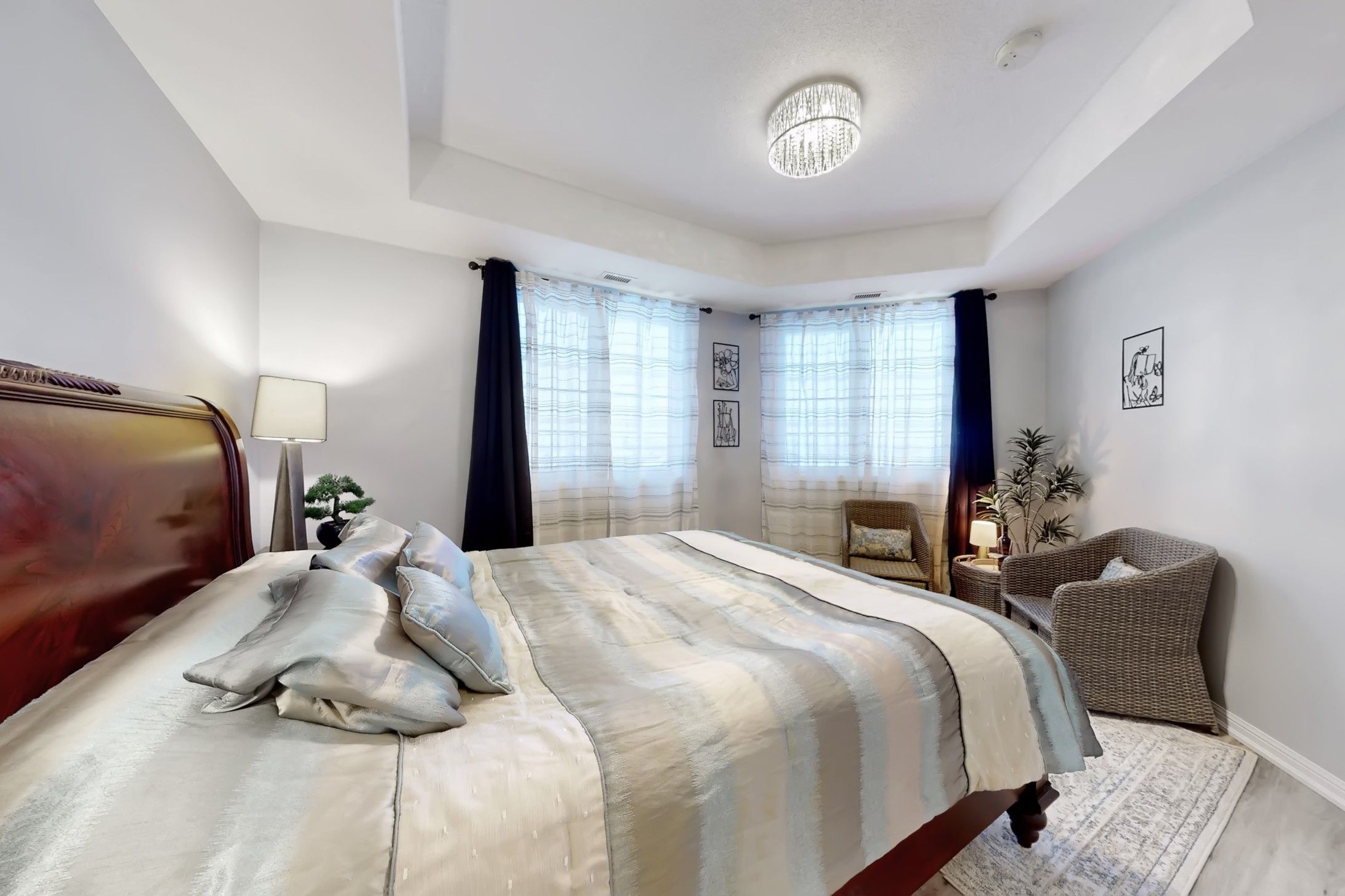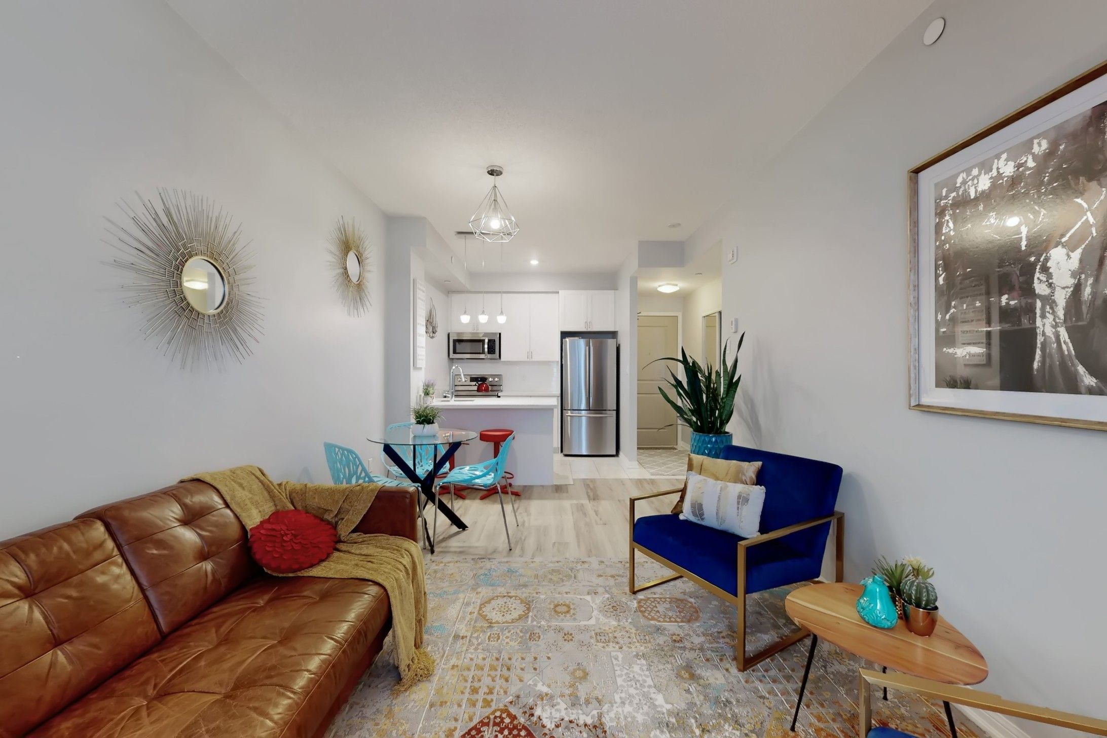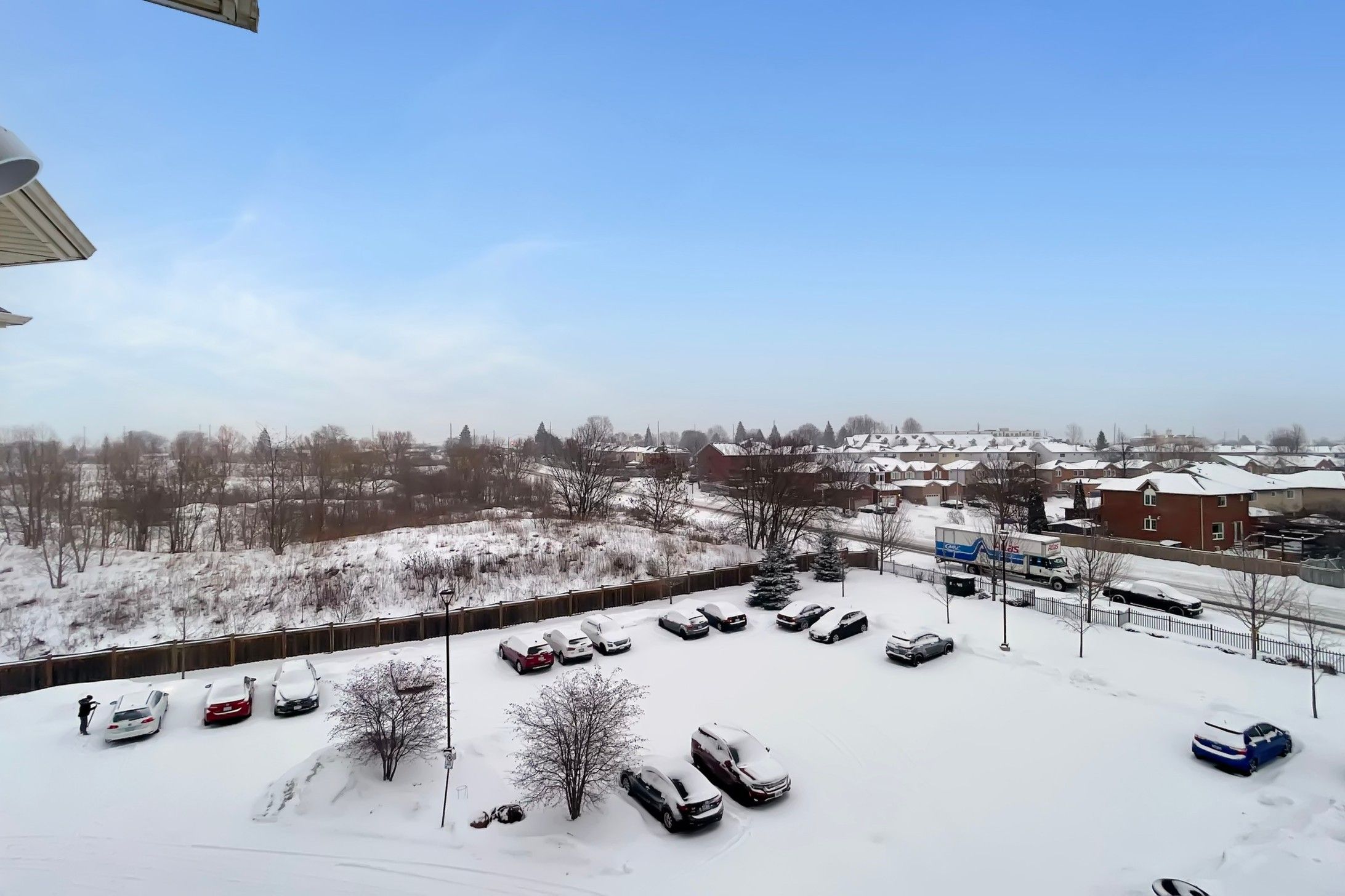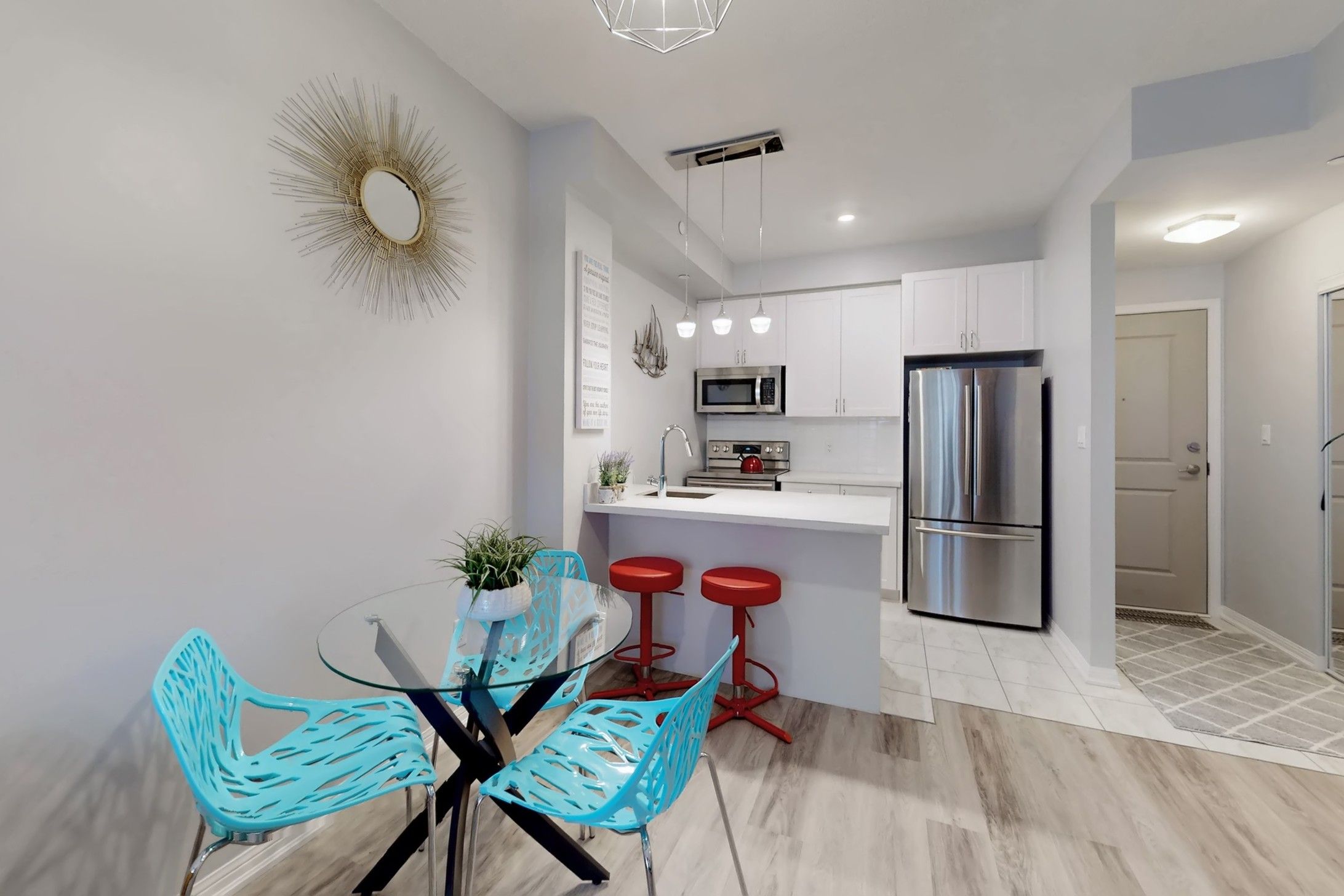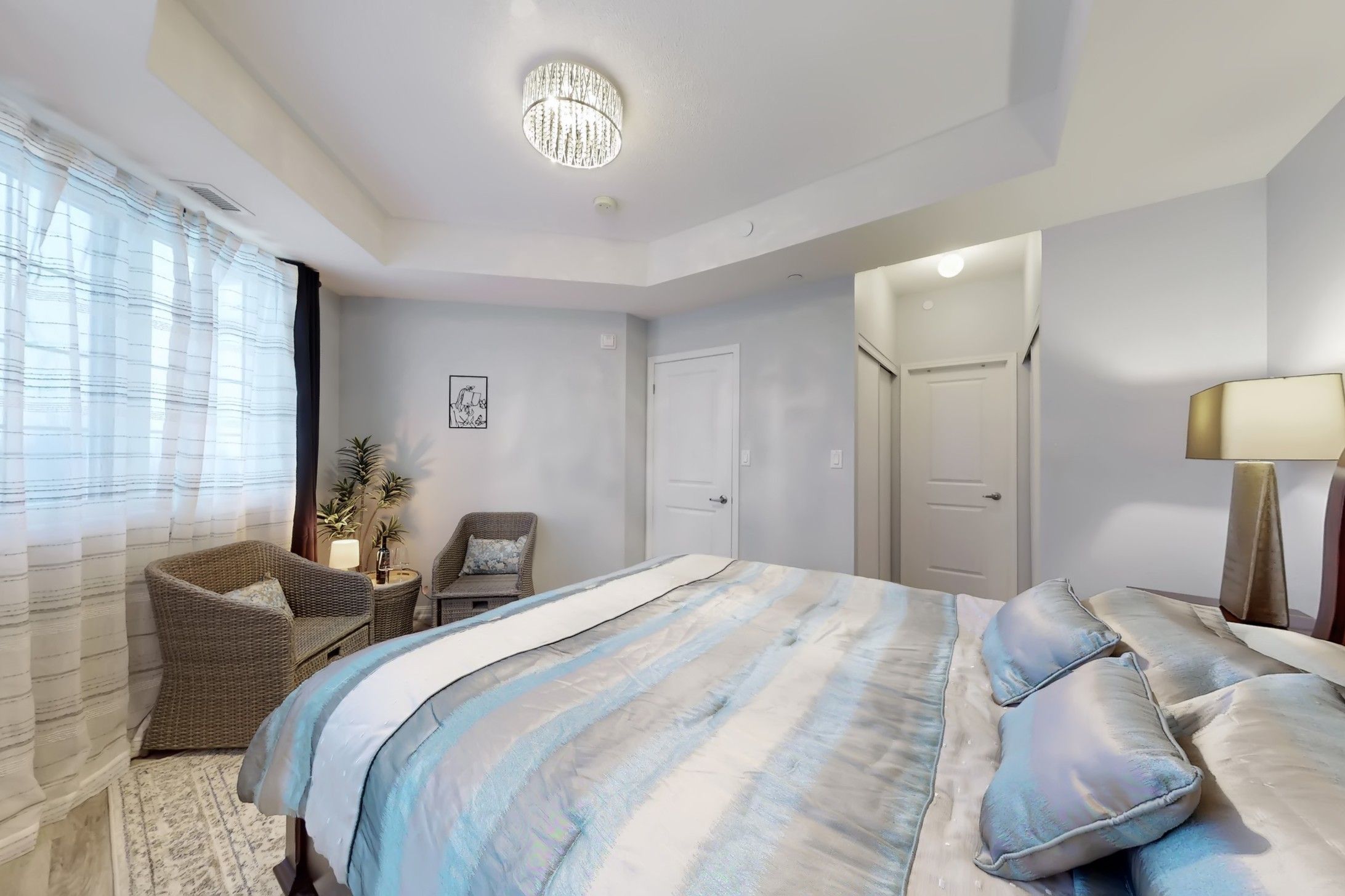 Absolutely stunning and rarely offered top-floor 1+1 bedroom unit. Well-maintained building with elevator. Featuring all stainless steel appliances, quartz countertops, and a breakfast bar. Enjoy a spacious living and dining area with walkout to a private balcony. The primary bedroom retreat offers a semi-ensuite and two closets. This unit provides a rare and generous amount of storage space. The den can easily be used as a second bedroom, home office, or flex space. Conveniently located close to schools, shopping, public transit, and Hwy 401 for commuters.