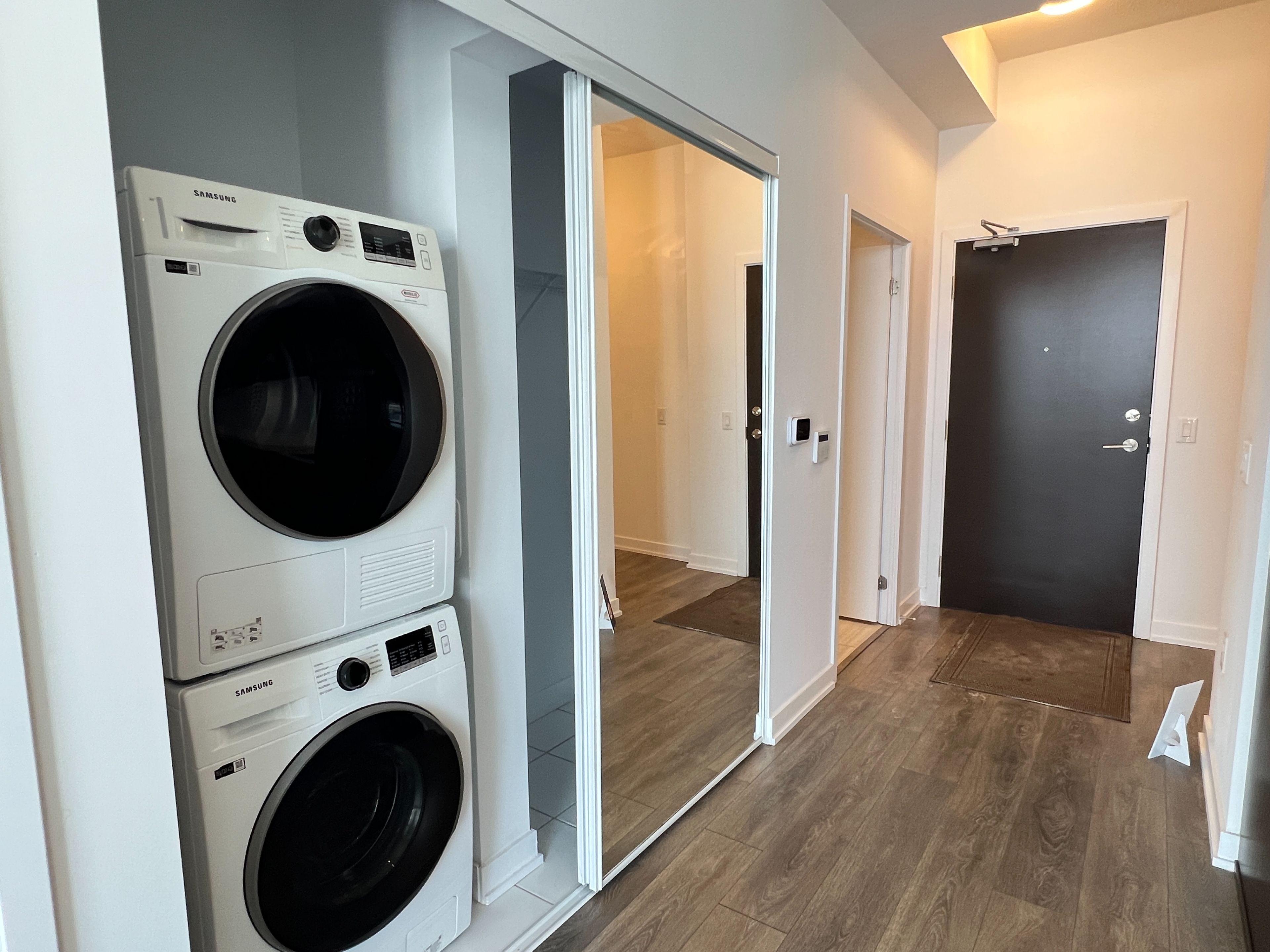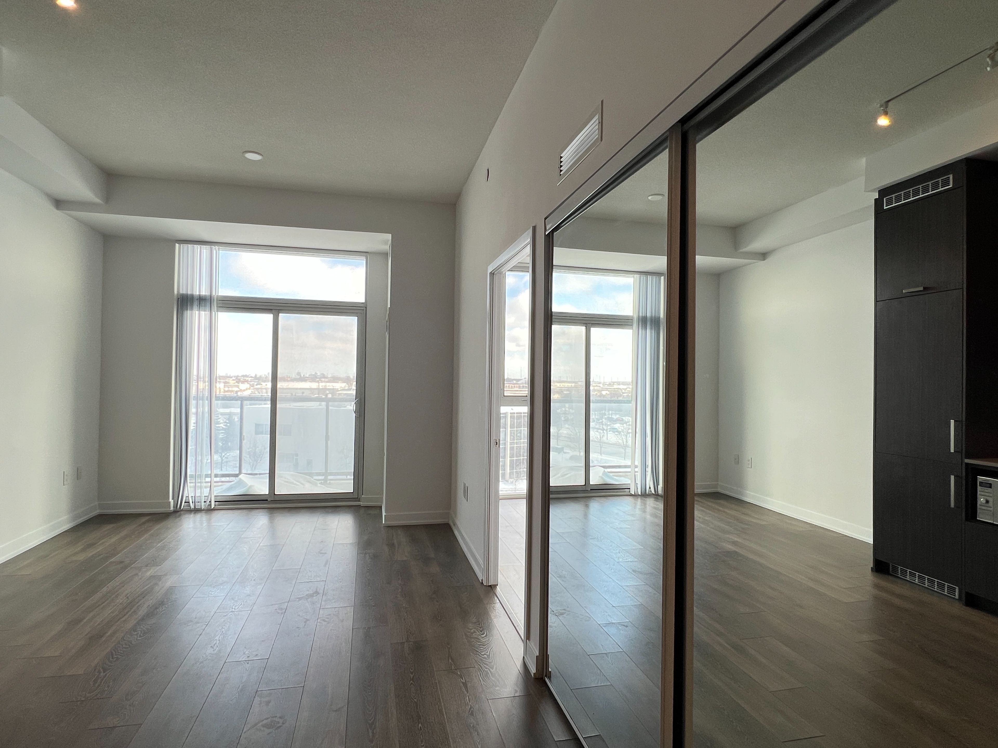 Modern 1-bedroom plus den condo in the Mobilio South Tower, offering a bright and functional open-concept layout with 10-foot ceilings, laminate flooring throughout, and large windows for plenty of natural light. The versatile den is ideal for a home office or extra living space. The sleek kitchen features built-in stainless steel appliances, quartz countertops, and plenty of cabinet space. Enjoy east-facing unobstructed views from the open balcony. Residents have access to premium amenities including a fitness centre, theatre, party room, guest suites, lounge, and BBQ terrace. Located steps from the Vaughan Metropolitan Centre subway and transit hub, offering excellent convenience for professionals and York University students, with quick access to major highways, shopping, and dining.