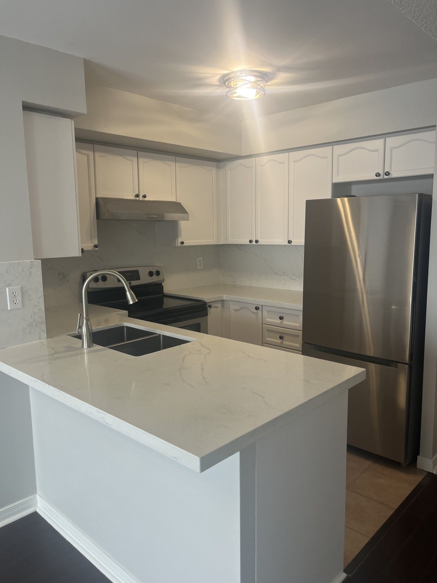 Welcome to this beautifully updated 1-bedroom + den condo in the heart of Richmond Hill. The spacious den is large enough to function as a second bedroom, offering flexibility for families, professionals. Thoughtfully upgraded to suit modern living, this unit features an open-concept layout highlighted by elegant marble kitchen countertops and a sleek backsplash, adding a touch of sophistication. The laminate flooring throughout ensures both style and low-maintenance living. Enjoy abundant natural light through large southwest-facing windows, creating a bright and welcoming atmosphere with scenic views. The generous primary bedroom includes ample closet space, while the versatile den is enhanced with custom sliding doors-ideal for a home office or guest space. The updated 4-piece bathroom showcases contemporary finishes, and the ensuite laundry offers added convenience with built-in shelving for extra storage. This well-maintained building offers excellent amenities, including a fully equipped gym, media room, and party/meeting space-perfect for both relaxation and entertaining. Added features include secure fob access, visitor parking, and bike storage. Ideally located just minutes from Yonge Street, top-rated schools, Highway 7, Highway 407, shopping, transit, and the GO Station-everything you need is within easy reach.