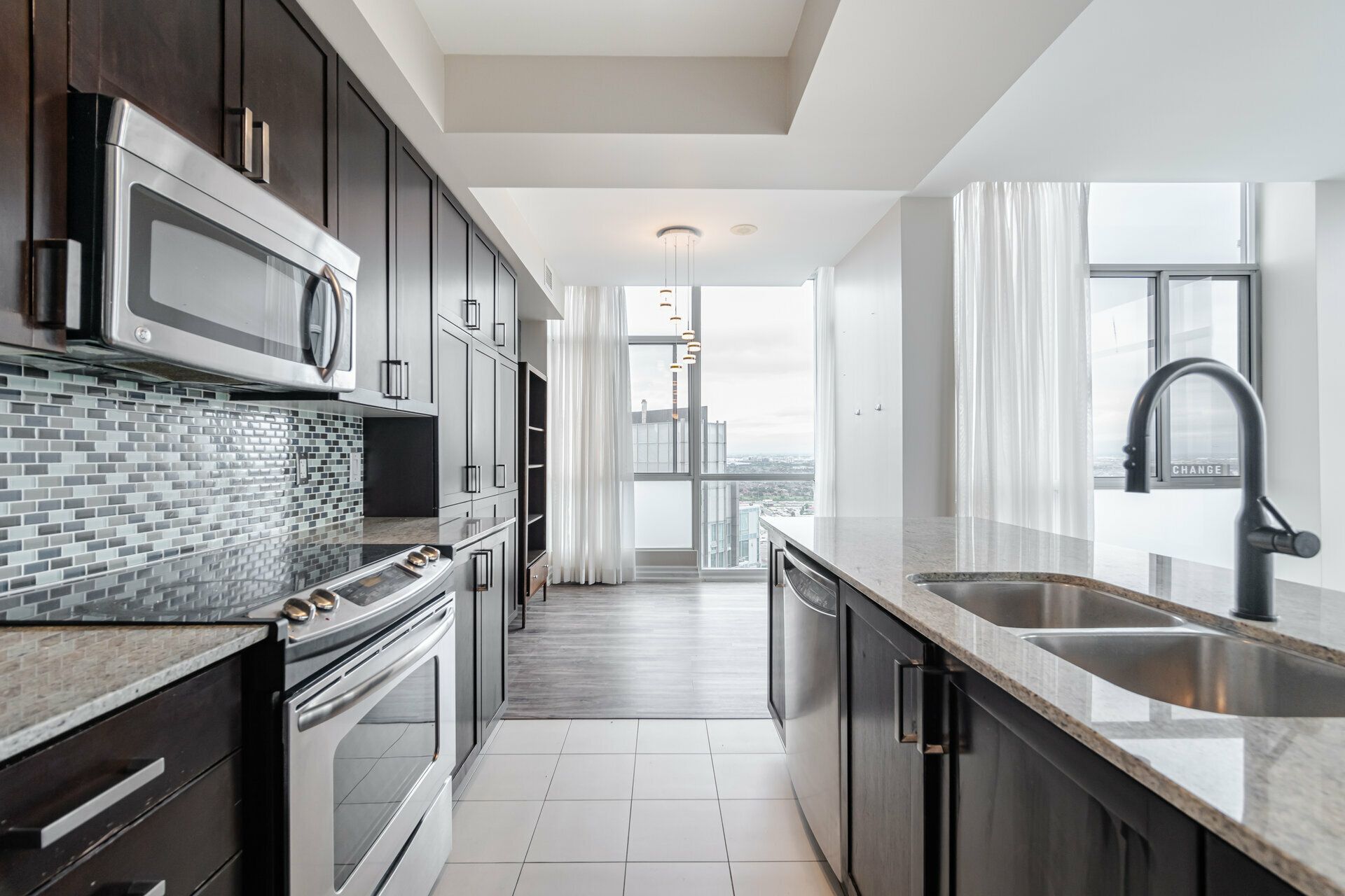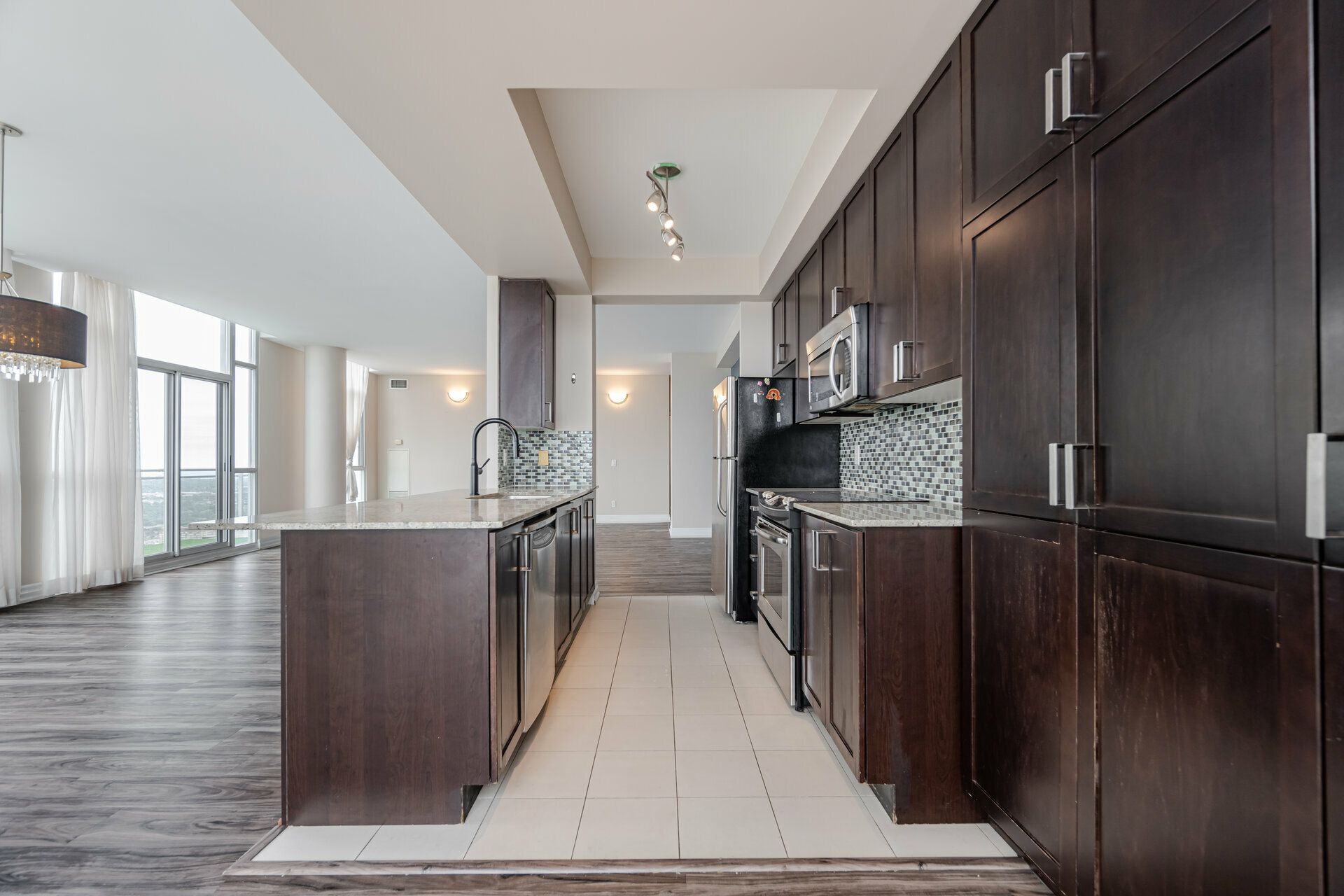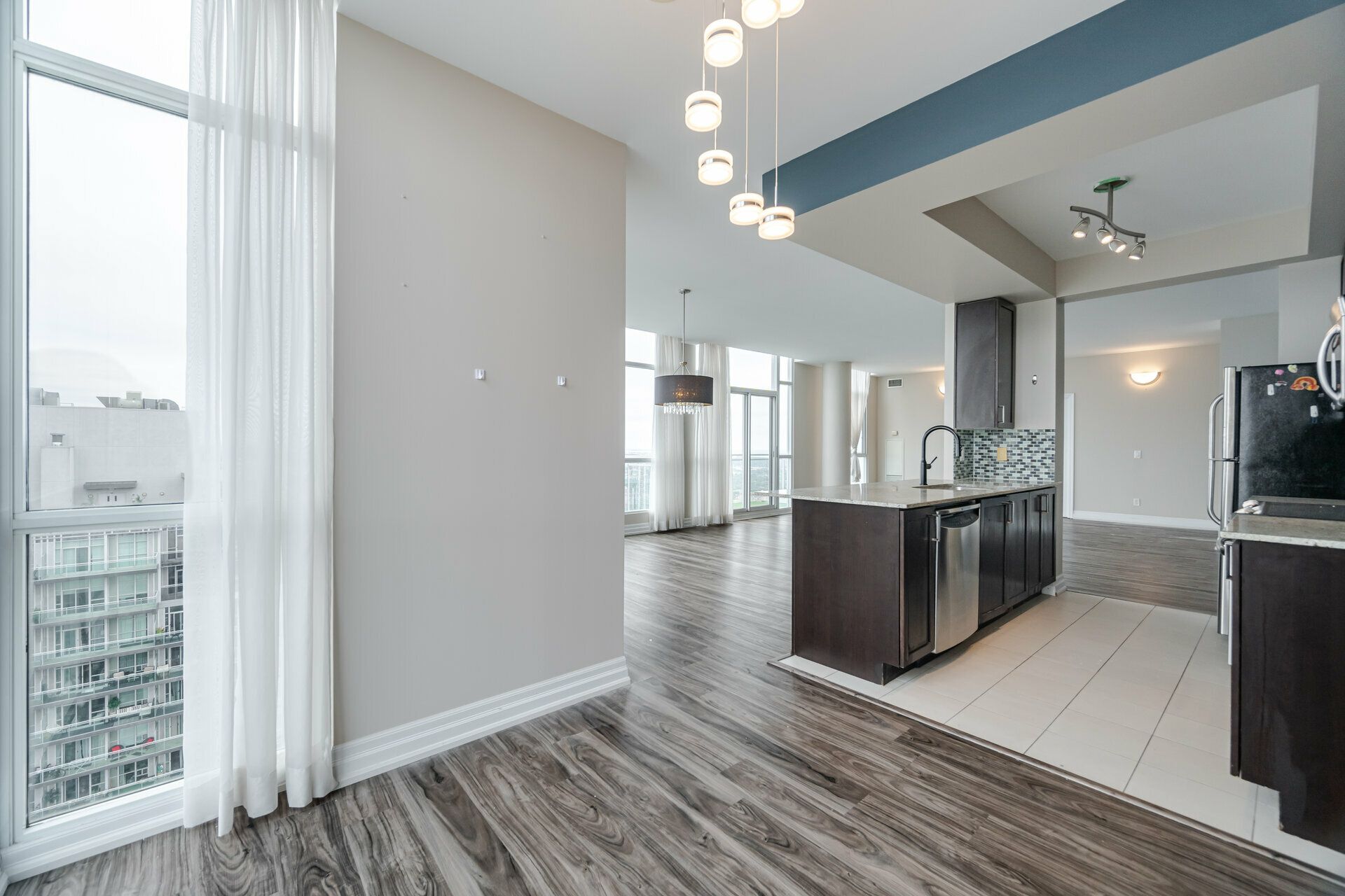 ***Beautiful PENTHOUSE for Lease***Absolutely stunning penthouse suite in Solstice Condominiums, offering breathtaking north-east panoramic views of downtown Toronto, the CN Tower, and Lake Ontario. This spacious open-concept Penthouse is the largest penthouse in the building and features an expansive 210 sq. ft. Balcony, perfect for taking in the incredible views. This Large suite boasts 10' ceilings, hardwood floors throughout, upgraded appliances, granite and marble countertops and an extra pantry in the kitchen, With an eat-in kitchen, large living and dining areas, and in-suite laundry, The two primary bedrooms each feature luxurious 5-piece ensuite, Double closets and large windows. This penthouse offers exceptional comfort. Comes with One Tandem parking (2 spaces) and a locker for additional storage. Located just 12 minutes from Pearson International Airport and 20 minutes from downtown Toronto, walk to celebration square, Square One Mall, fine dining and movies, Coffee shops, food court, Banks and coming soon LRT, this unit also offers executive-style living with access to five-star amenities, including a swimming pool, gym, meeting rooms, 24-hour concierge, and plenty of visitor parking. Utilities are included except for hydro , A must-see...