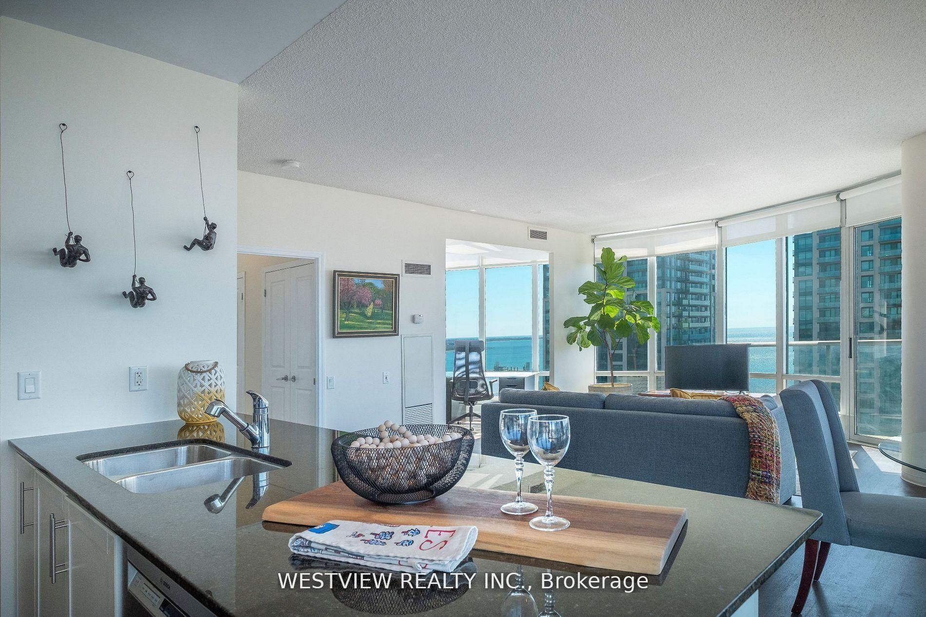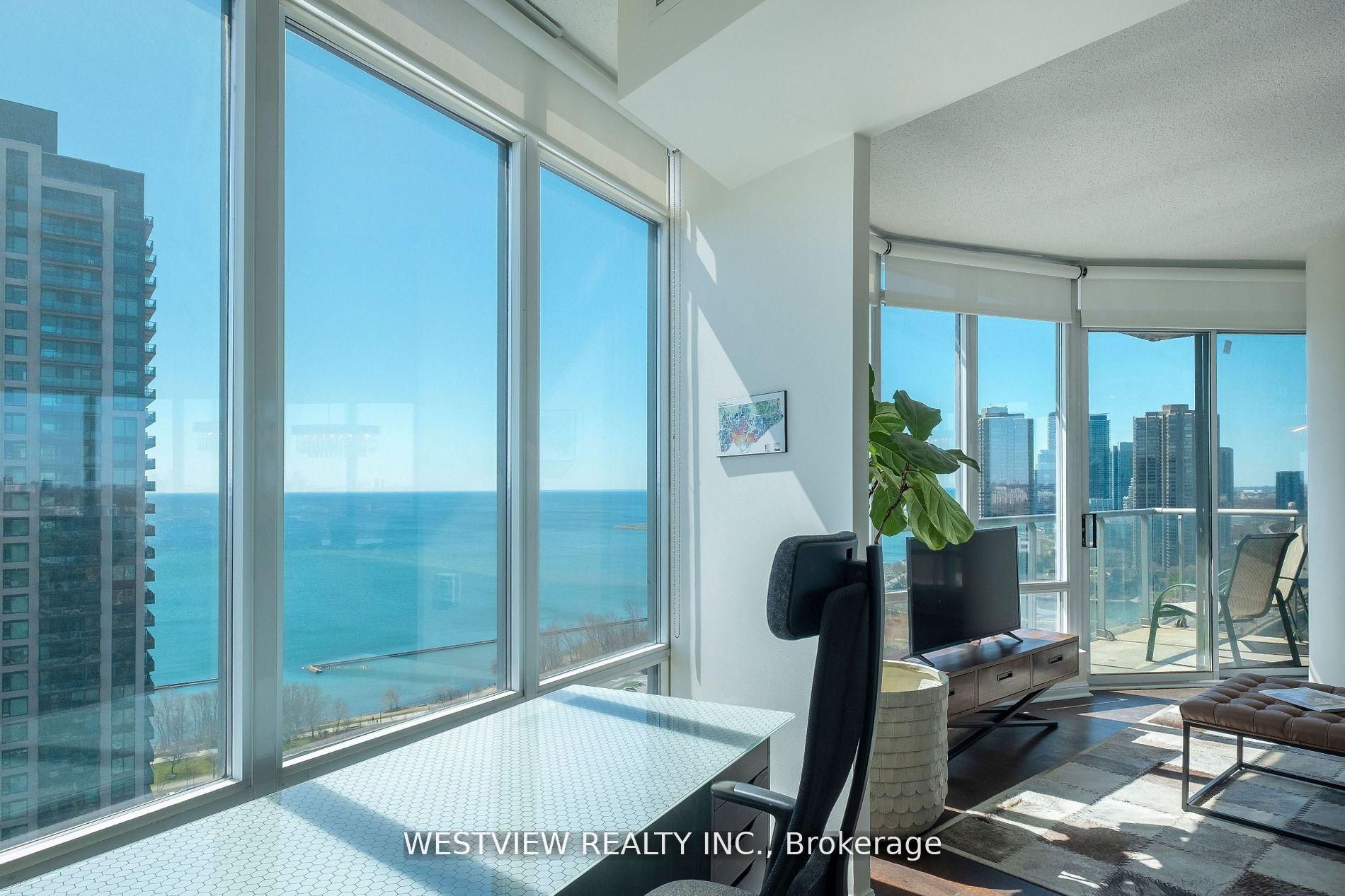 Good morning, Good afternoon & Good evening! That is what you can expect from this sun drenched two bedroom plus den waterfront gem, two floors from the top. Spanning over 1100 sqft of luxurious living space, offering very rare 270 degrees of stunning panoramic views. From the picturesque downtown skyline extending to Humber Bay, Grenadier pond and beyond. Enjoy both the colourful sunrises & sunsets along with watching planes come and go from both airports at a distance. All of which can be managed with your custom automated blinds. This is a Beautifully appointed condo, with post card views from all principal rooms. The modern kitchen features a large breakfast bar that overlooks the spacious living area & bright blue water of the lake. The bright den (potential office space) fit for any executive, features wrap around windows overlooking the Toronto downtown city-skyline as well as the lake to the west. Living in "Windermere By The Lake" you will be within steps to the miles of waterfront walking/ biking paths, High Park, Roncesvalles, Bloor West village, shopping, public transit & many more amenities. New Electric vehicle charging station has also been installed for your parking spot, for your convenience, storage locker on 2nd floor. You will look forward to coming home here!