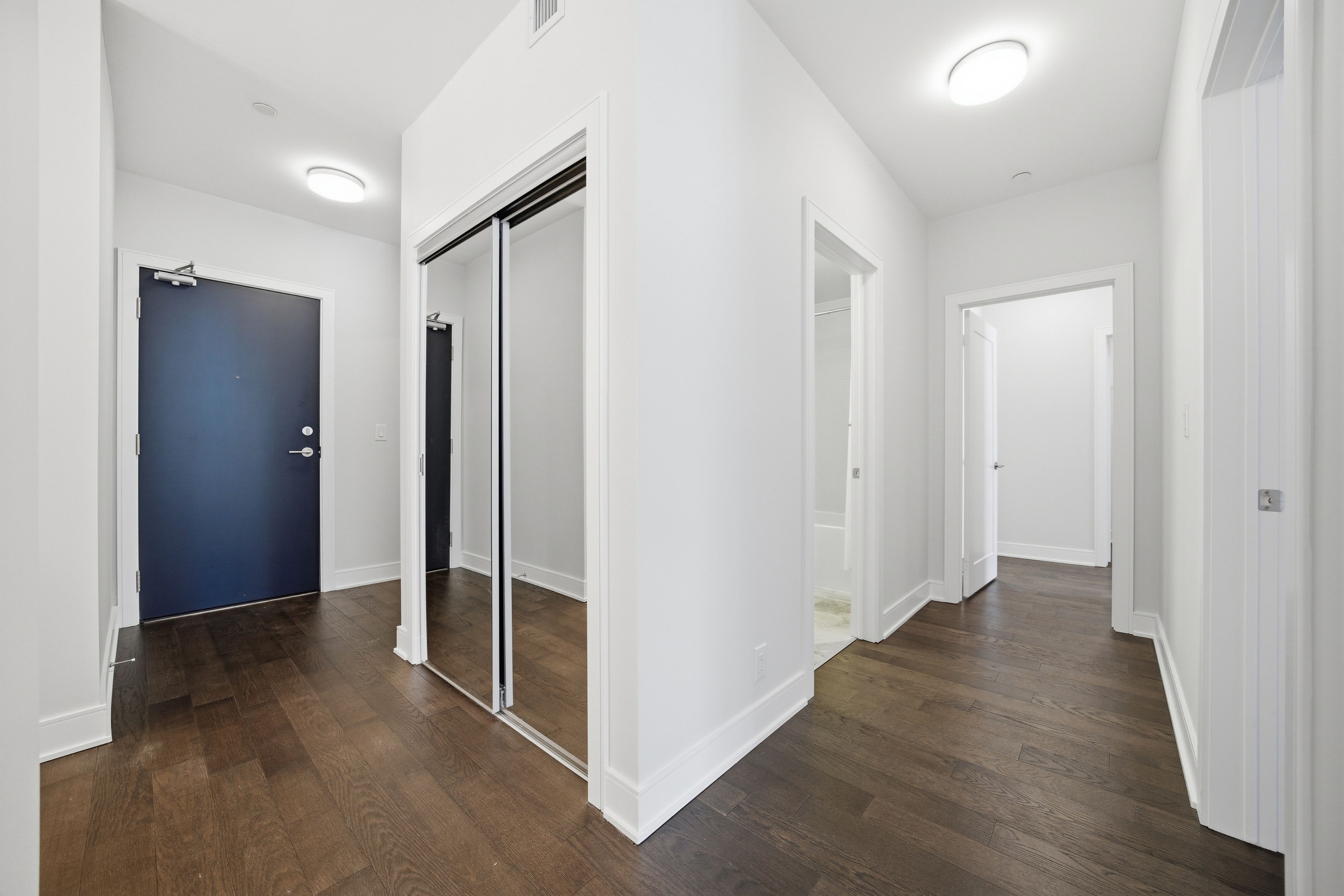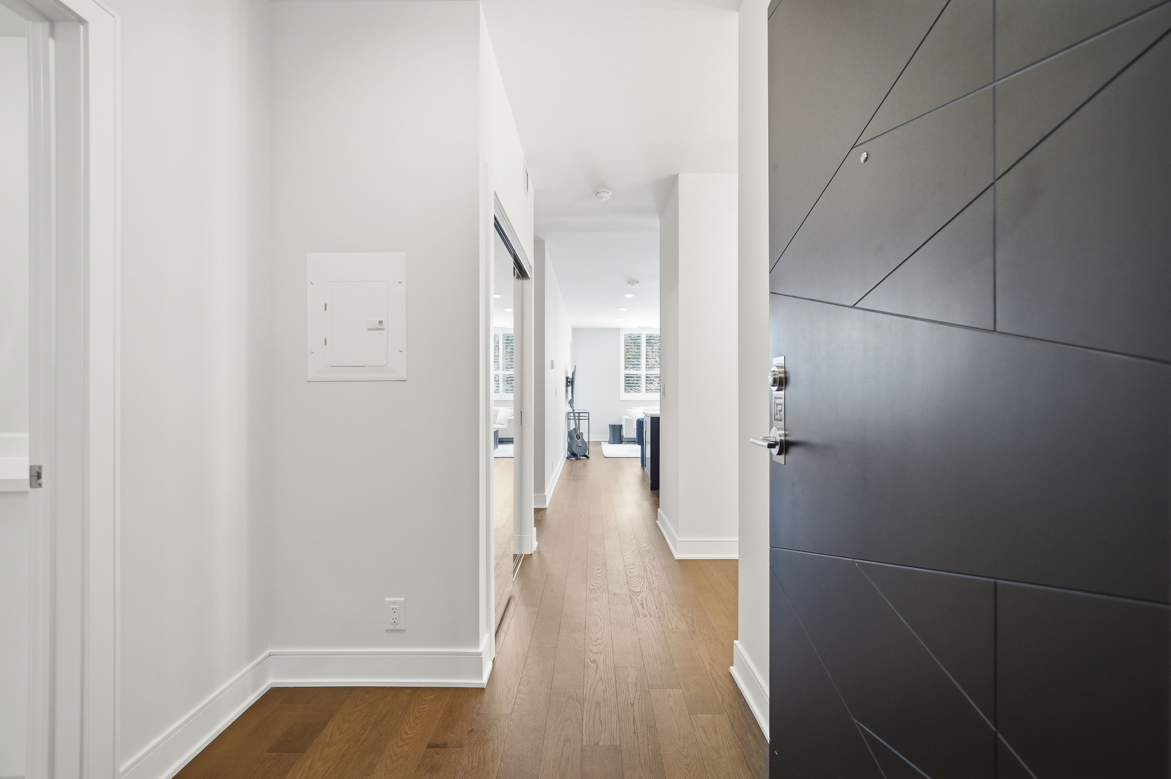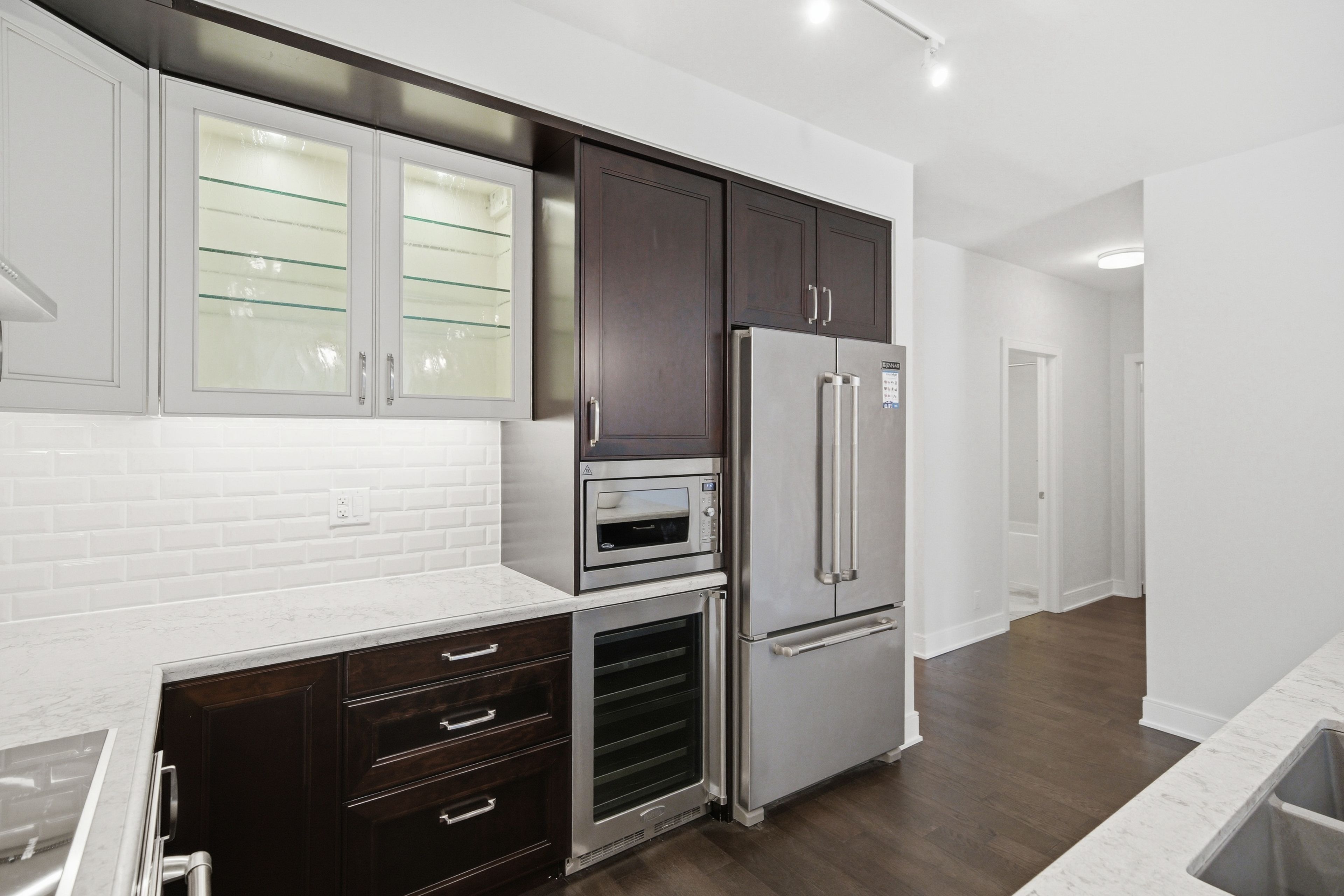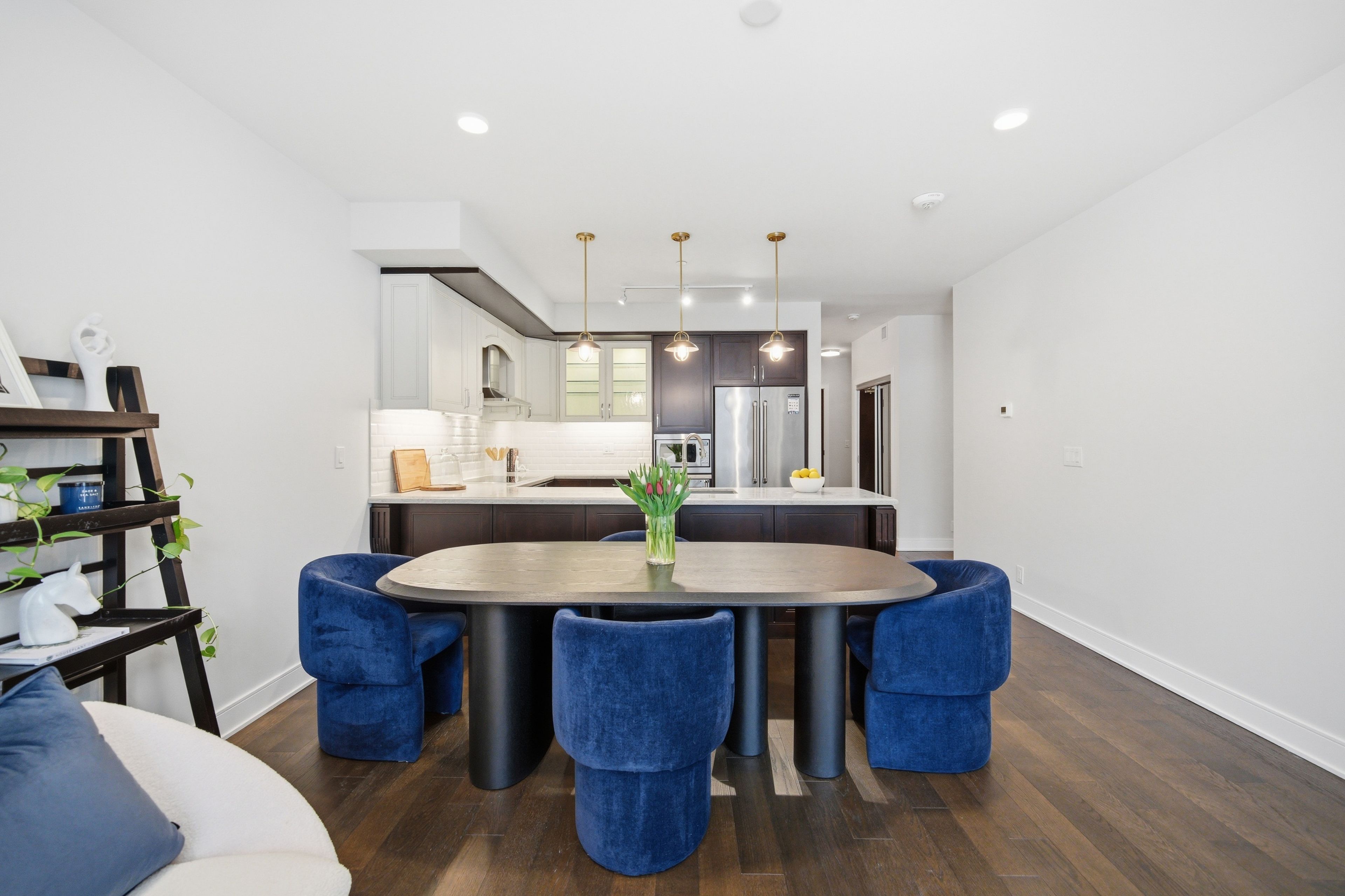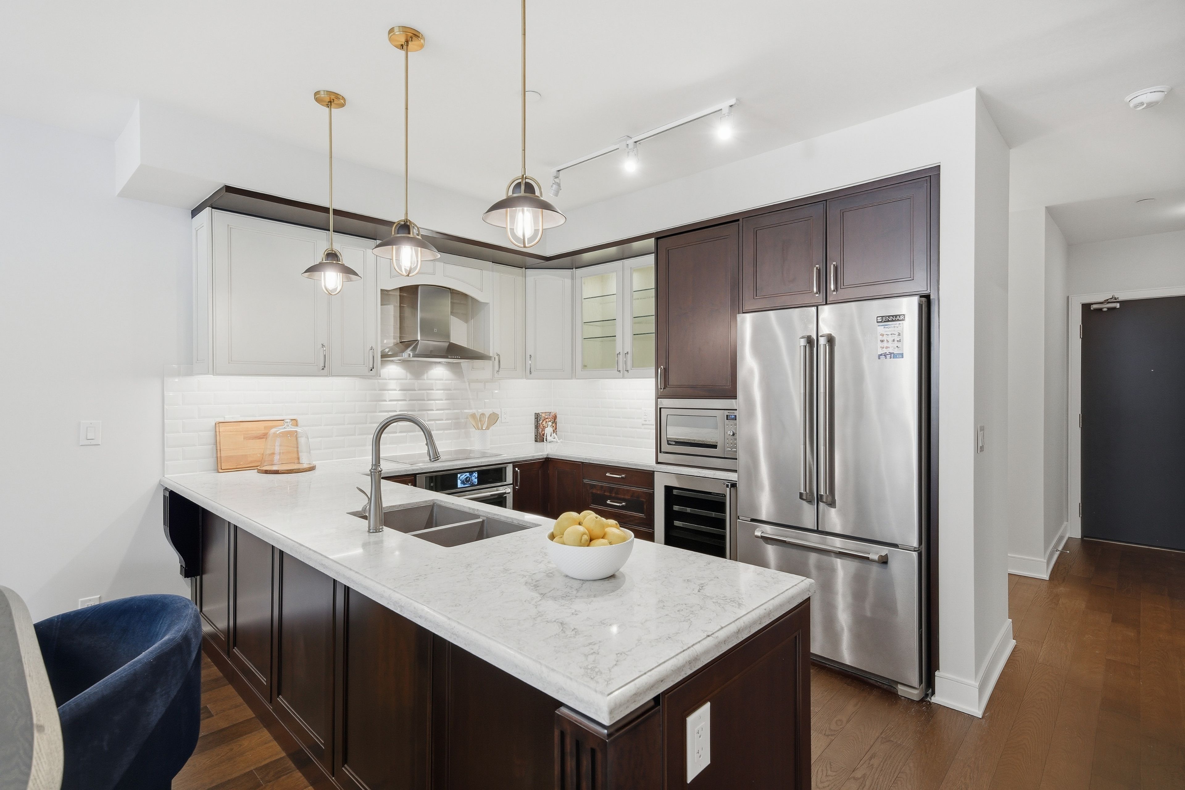 Most condos get built to rent or flip. This one was built to live in. Suite 117 at The Craftsman is a rare, end-user designed residence where quality and intention are evident throughout. The layout offers exceptional flow, living more like a bungalow than a condo, with bedrooms thoughtfully separated from the main living area. This allows for a better use of space and quieter, more private bedrooms. Throughout the suite, five-inch engineered hardwood floors replace typical builder finishes, while numerous pot lights and statement light fixtures, all on dimmers, seamlessly integrate with your smart home devices. The fully customized kitchen represents a significant investment and is the true heart of this home. Featuring marble-inspired counters, elegant two-tone cabinetry, and thoughtful storage solutions like Lazy Susans, deep pot drawers, and cabinet drawers for those hard-to-reach areas, every inch of this space was designed for functionality. Premium appliances include the JennAir-branded induction cooktop, smart oven, paneled dishwasher, 72-inch-high counter-depth fridge, and a Marvel built-in wine fridge, creating a space that is refined, practical, and perfect for entertaining. The primary retreat occupies its own exclusive wing with multiple closets, including a large walk-in, and a spa-inspired ensuite complete with a glass shower stall, soaker tub, large custom vanity, and hidden pull-out drawers with built-in under-counter outlets for seamless organization. A proper second bedroom with a walk-in closet and a spacious den finished with closet storage also provides true flexibility for guests or a home office. Additional highlights include California shutters, a large laundry room with a sink and extra cabinet storage, EV-ready parking located just steps from the elevator, and a storage locker directly across the hallway. For buyers who notice the difference, this suite delivers thoughtful upgrades, smarter storage, and a layout that simply feels right.