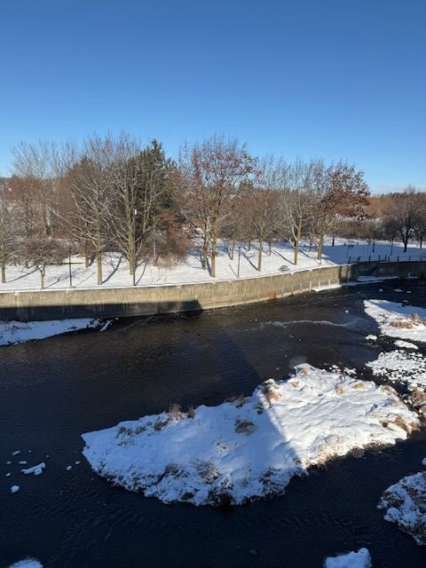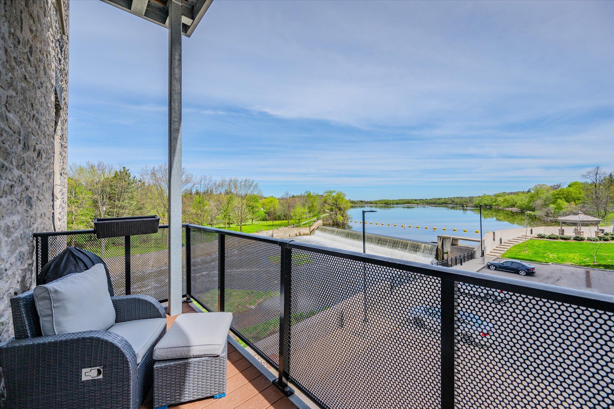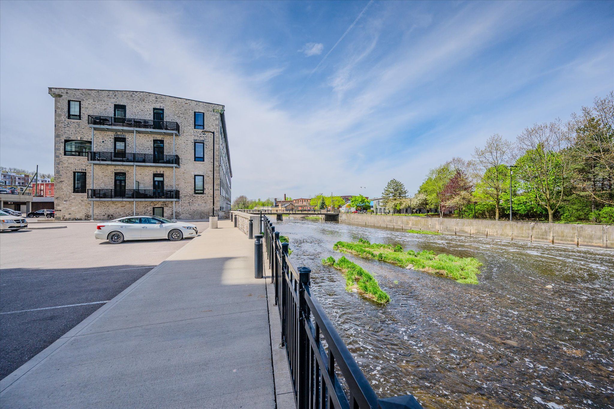 OPEN HOUSE SUNDAY JAN 18TH 2-4 PM Welcome to Riverbank Lofts, a boutique historic stone conversion on the Speed River in the heart of Hespeler Village. This rare corner unit offers luxury with 12' ceilings, exposed beams, and oversized windows showcasing river and waterfall views. Featuring 2 bedrooms with private ensuites, a powder room, and a show-stopping 18' island kitchen with built-in appliances, servery, and pantry.High-end finishes include European white oak flooring, heated floors in baths and laundry, custom built-ins, automatic blinds, and designer lighting. One of only three units with a private river-view balcony and a 2-car garage. Enjoy amenities like a fitness centre, common lounges, bike storage, and direct access to trails and the river.Steps to shops, restaurants, and cafes, with easy access to Hwy 401-this is elevated loft living in one of Cambridge's most desirable locations.