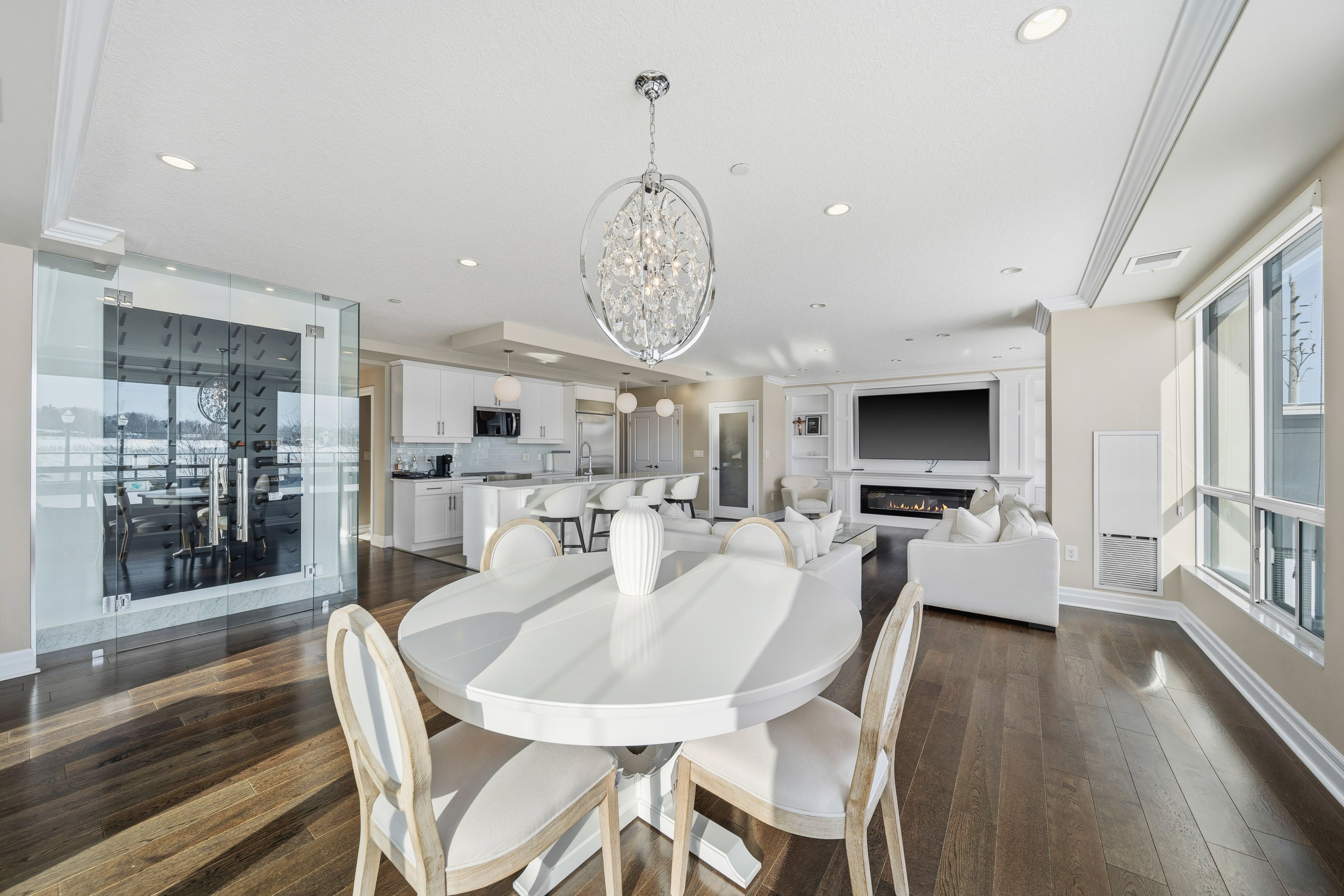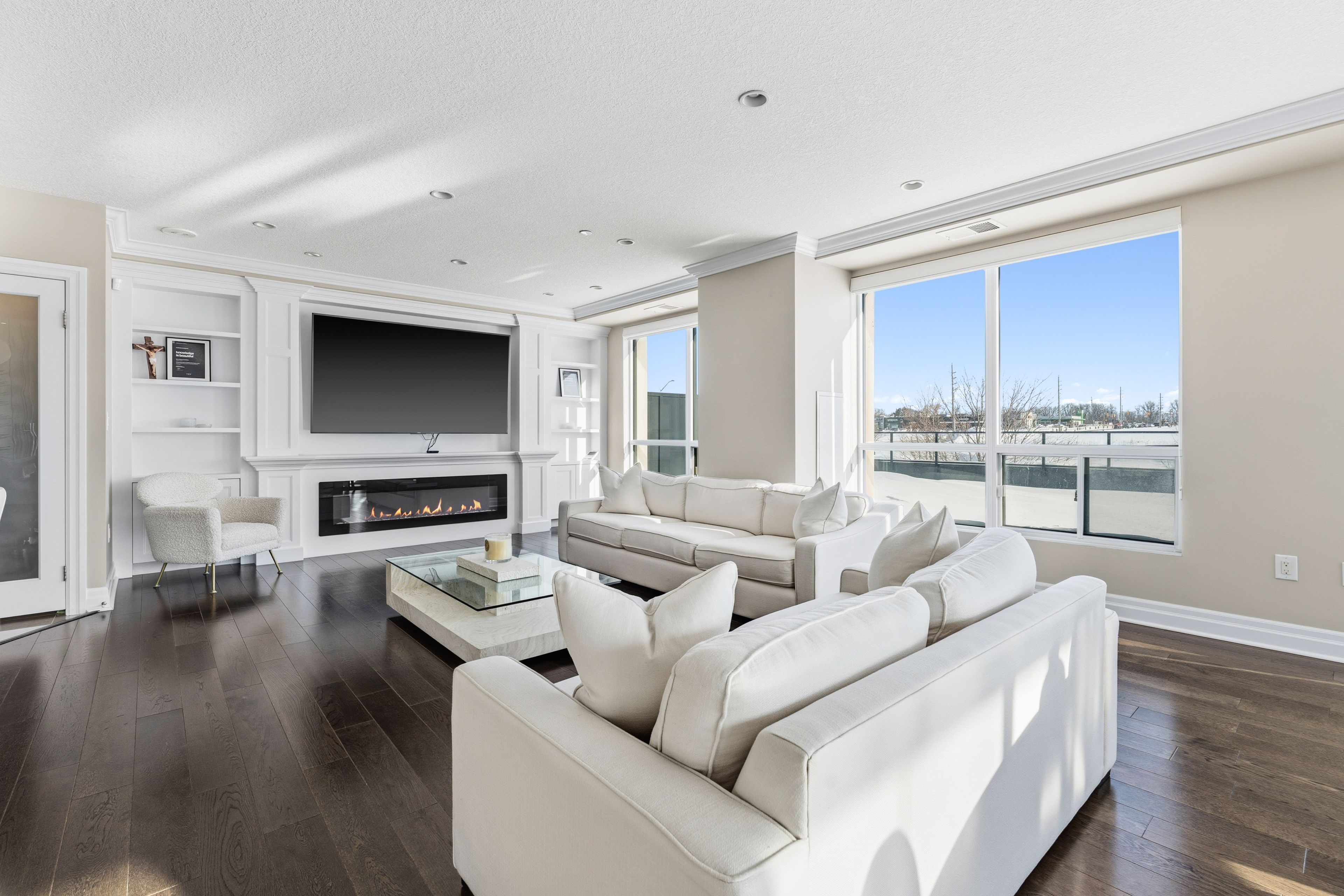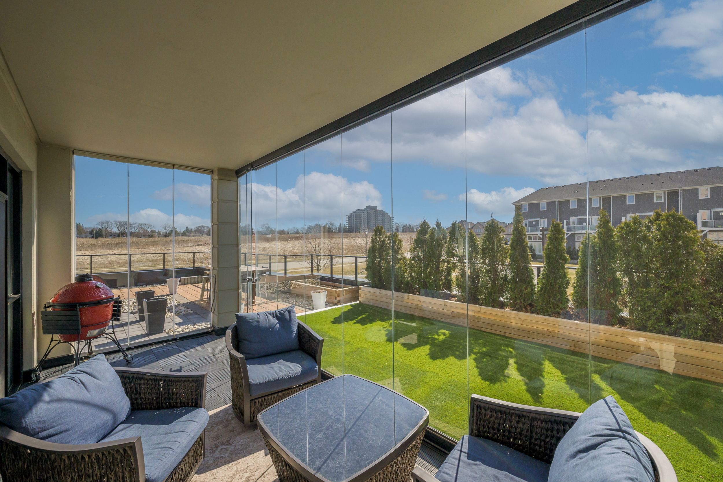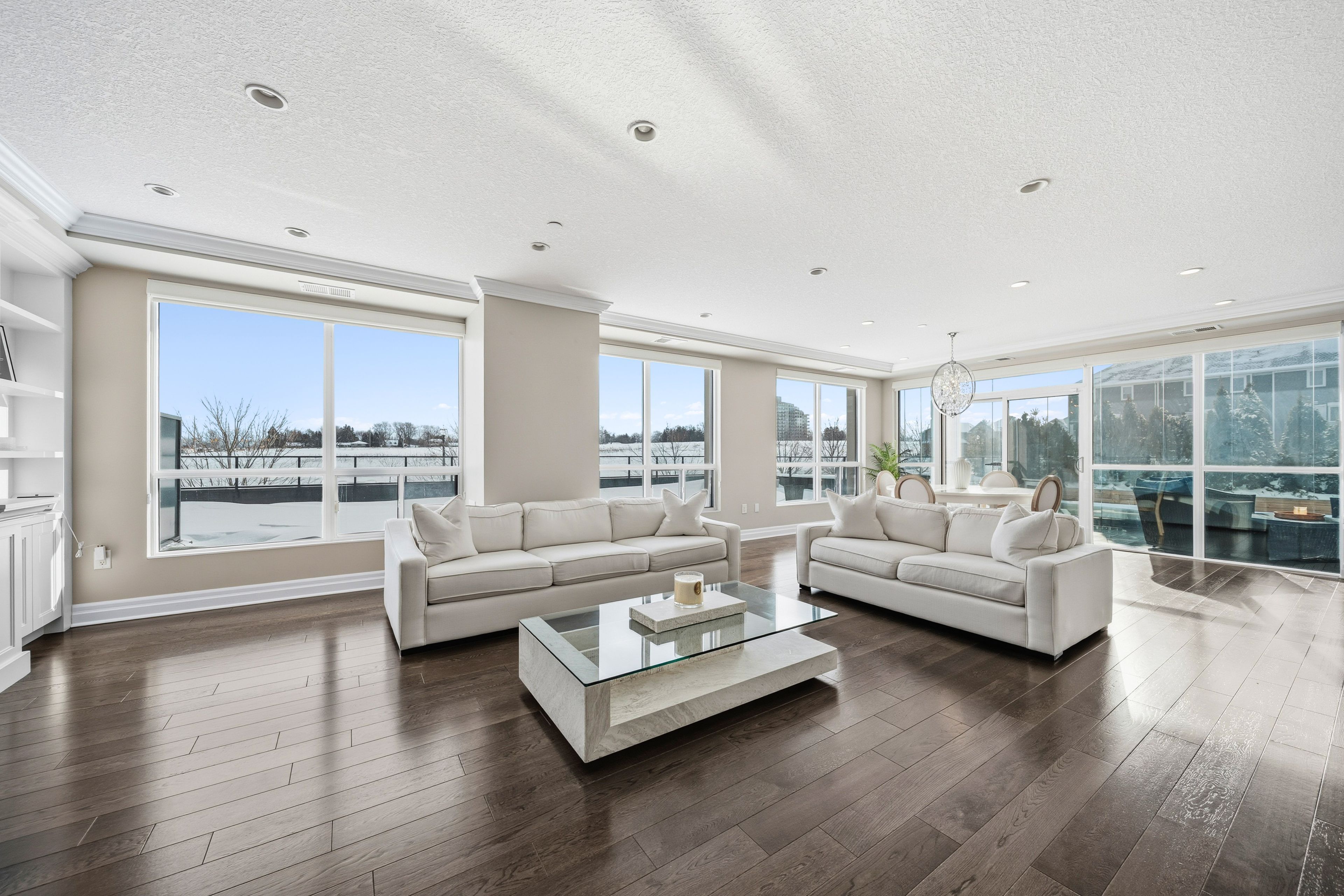An exceptional executive residence offering the scale, privacy, and outdoor living of a penthouse-without high floors or long elevator wait times. This beautifully upgraded suite features 1,615 sq. ft. of refined interior space paired with a rare 2,342 sq. ft. exclusive-use terrace, creating an outstanding indoor-outdoor lifestyle.The open-concept Great Room is ideal for everyday living and elegant entertaining, seamlessly integrating generous living and dining areas with a striking chef's kitchen, all surrounded by expansive windows and natural light. Premium finishes include hardwood and porcelain tile flooring, extensive pot lighting, upgraded fixtures, and heated bathroom floors.The gourmet kitchen offers ceiling-height white cabinetry, quartz countertops, stainless steel appliances including a built in counter-depth refrigerator, designer tile backsplash, an oversized 12-foot island with seating for four, and a walk-in pantry. The living area features custom built-ins and an extended linear fireplace, with the dining space accented by a glass-enclosed wine display. The primary bedroom retreat accommodates a king-size bed and includes a walk-in closet and a spa-inspired five-piece ensuite with granite countertops, double vanity, glass and tile shower, soaker tub, and heated floors. The second bedroom is ideal as a guest suite or home office. A three-season Lumon sunroom with floor-to-ceiling retractable glass and UV protection extends year-round enjoyment. Outdoor living is exceptional, with a south-facing terrace featuring astroturf and cedar hedge border, plus an expansive open patio with eastern exposure-perfect for entertaining and sunrise views.Includes four underground parking spaces and an owned storage locker. Building amenities include an indoor pool, fitness centre, dining room, billiards room, library/lounge, and theatre. Desirable North London location near shopping, golf, hospitals, and nature trails. Condo fees include heat and air conditioning.