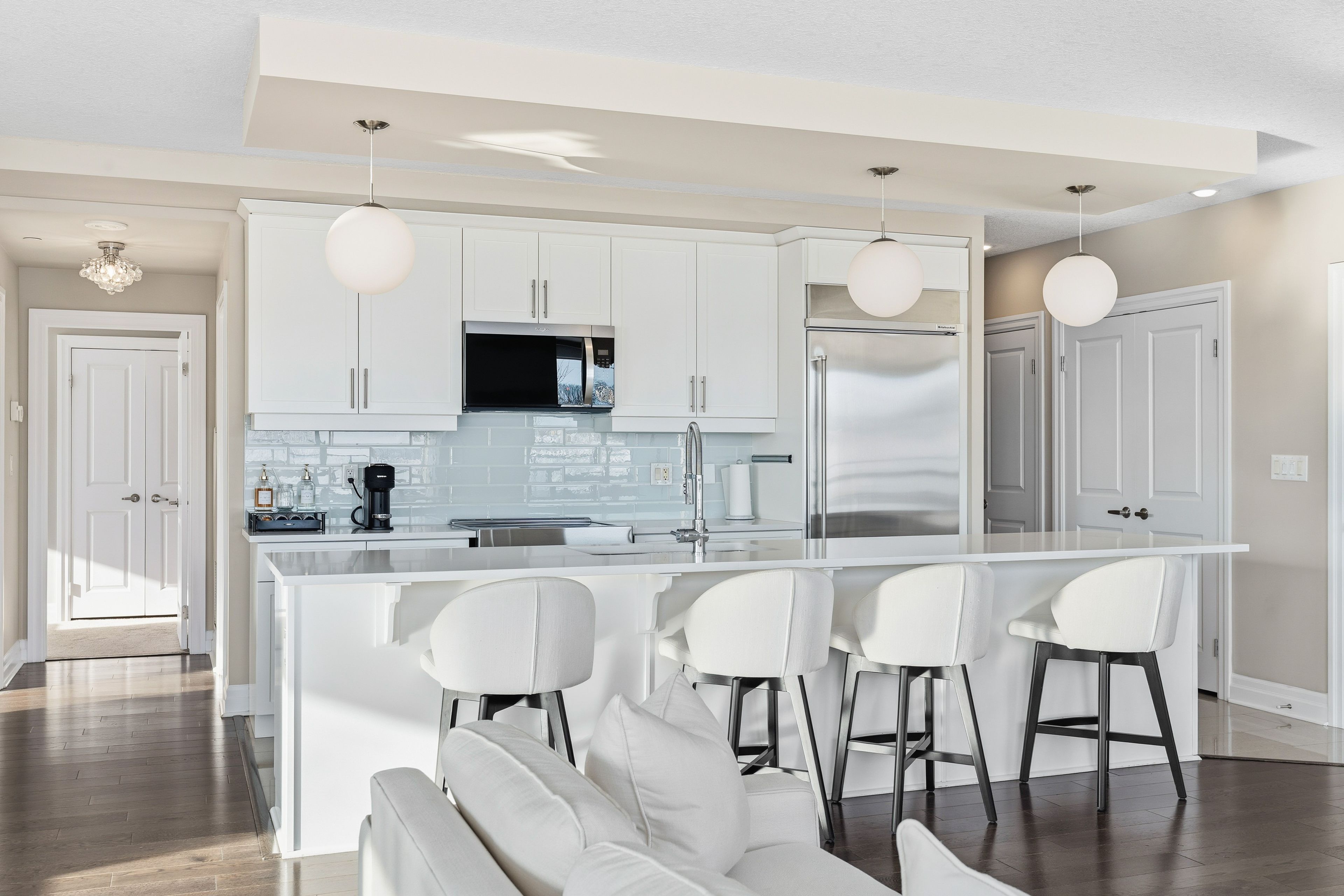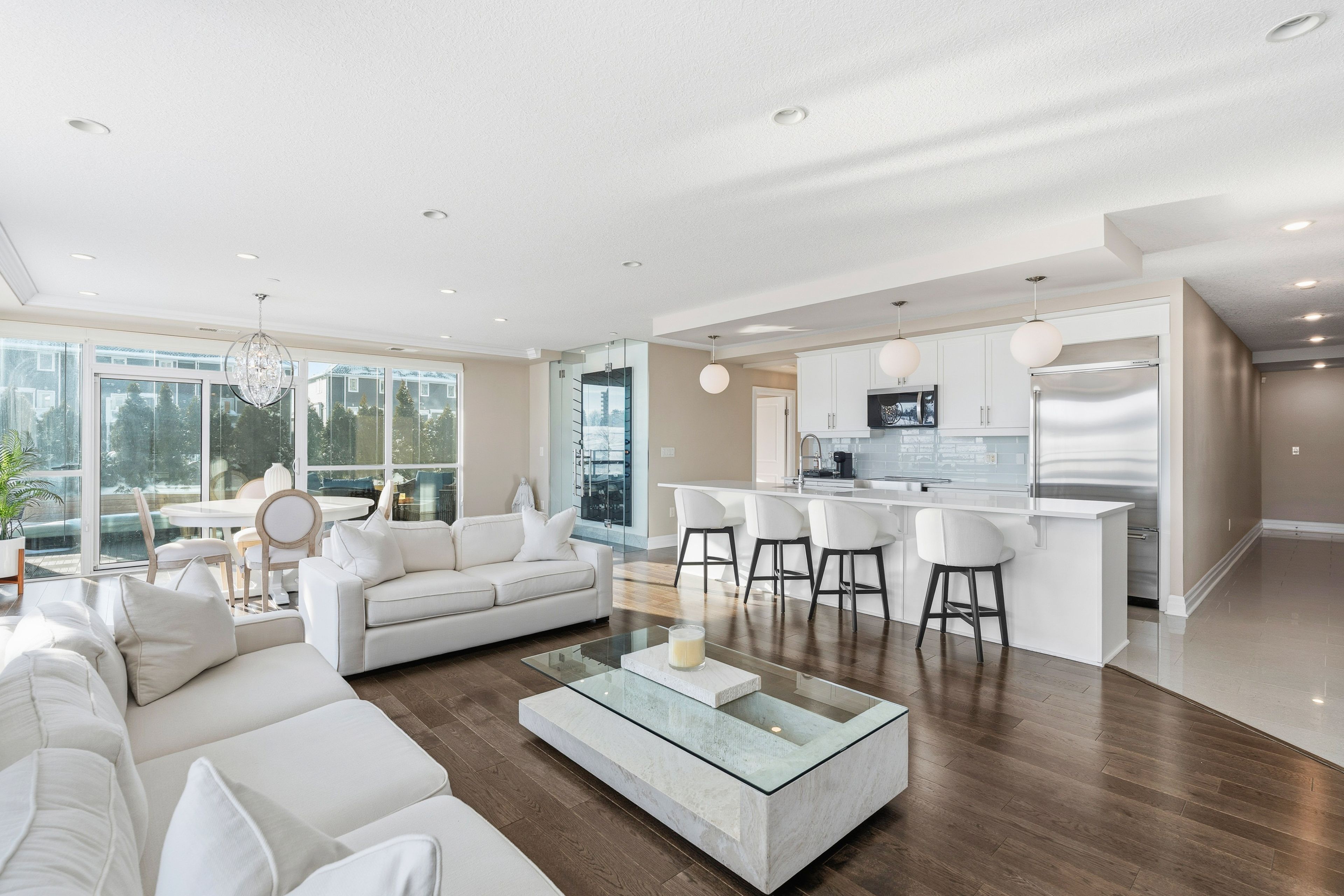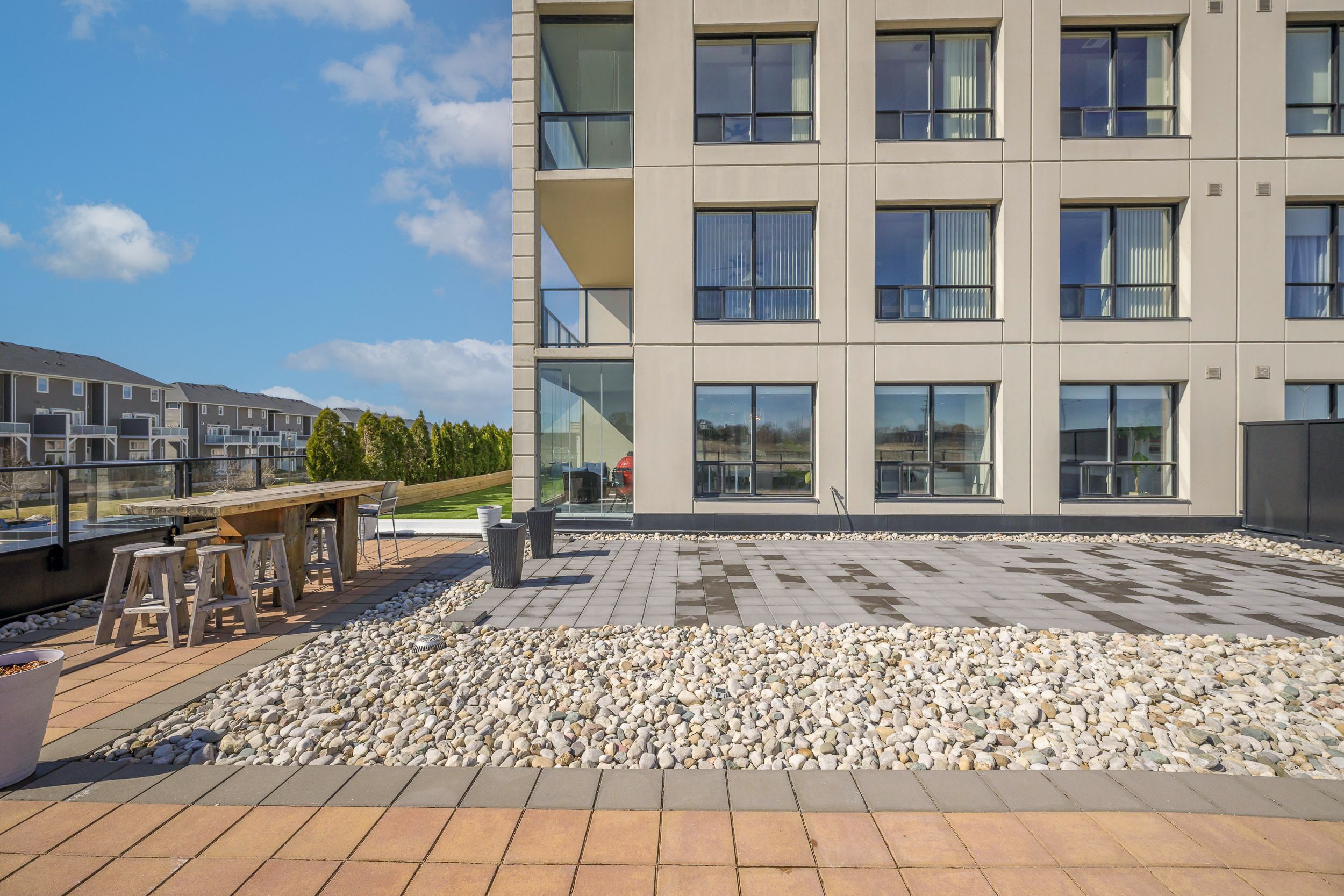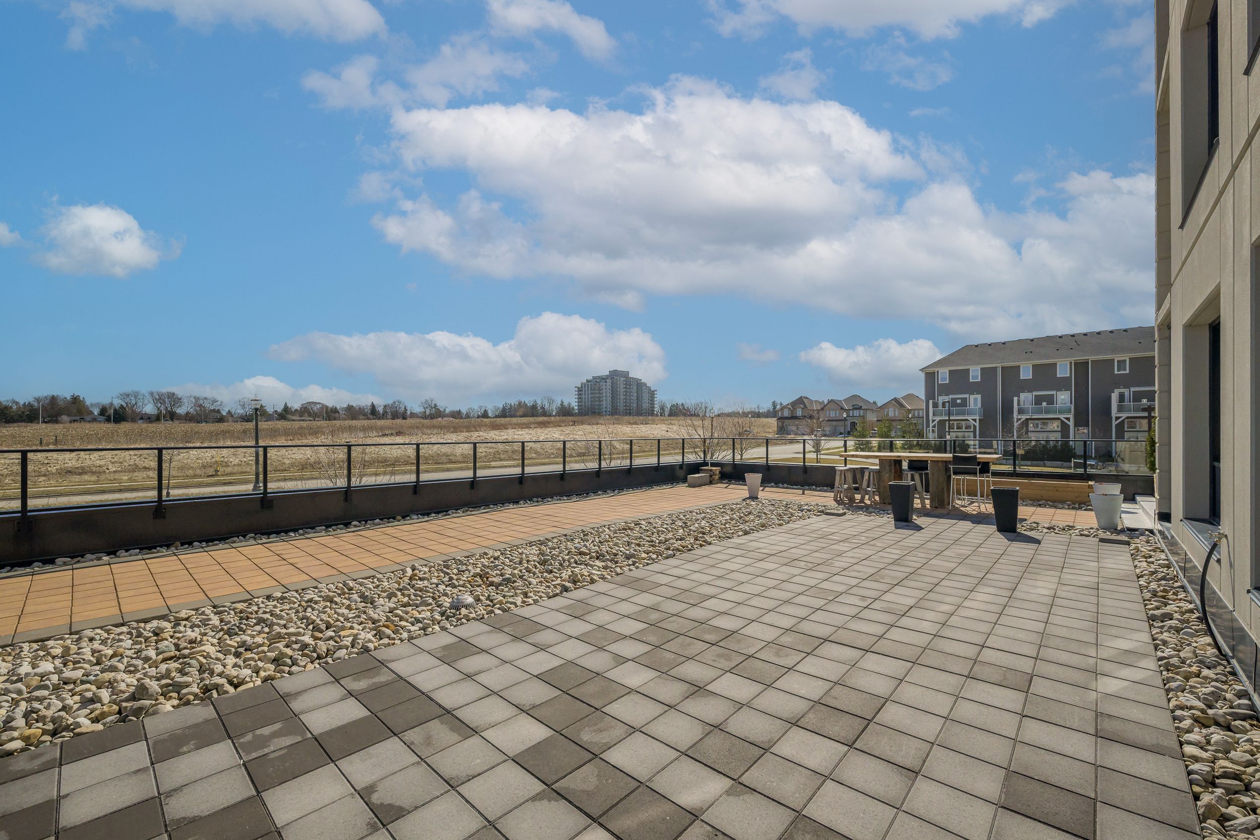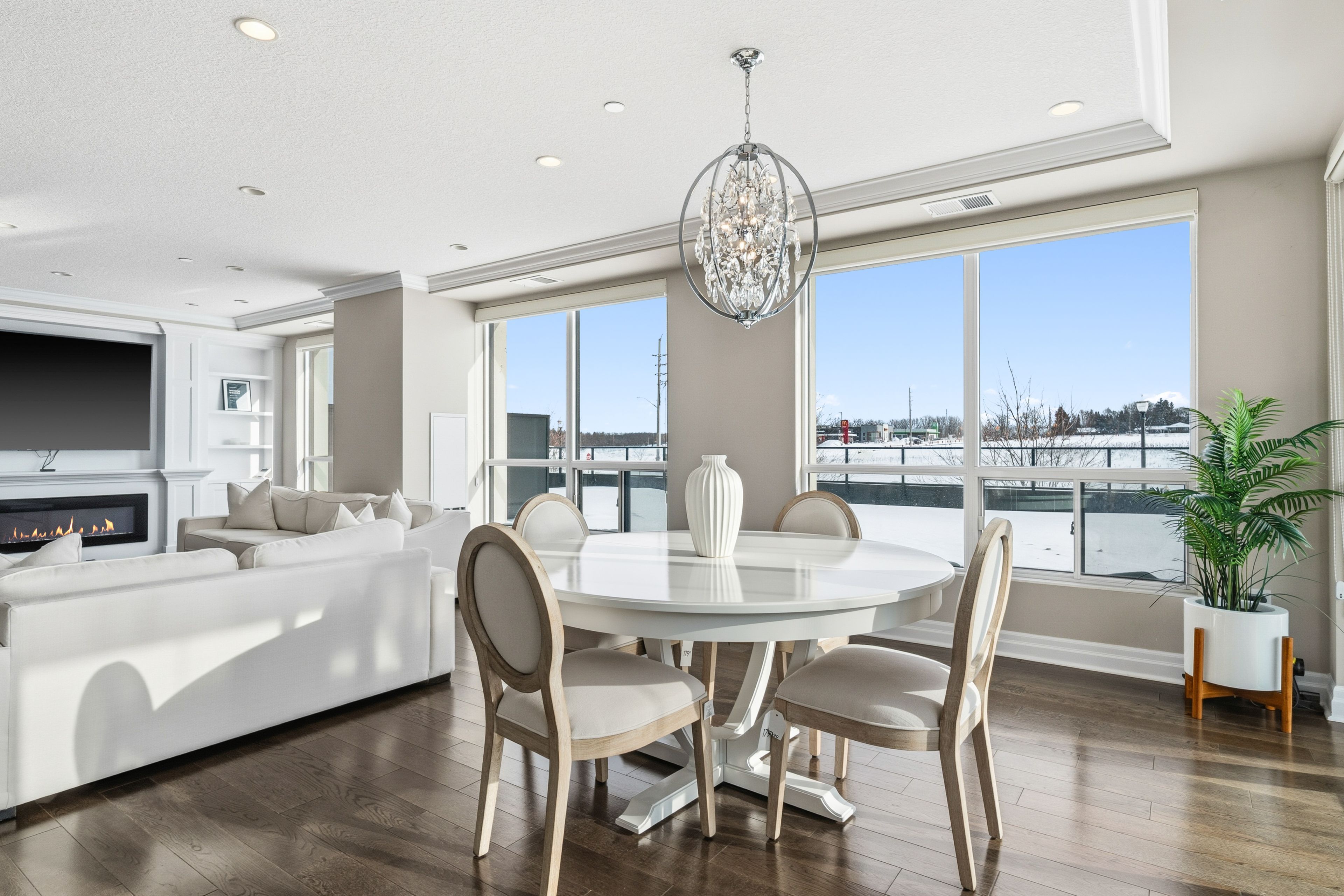 An exceptional executive residence offering the scale, privacy, and outdoor living of a penthouse-without high floors or long elevator wait times. This beautifully upgraded suite features 1,615 sq. ft. of refined interior space paired with a rare 2,342 sq. ft. exclusive-use terrace, creating an outstanding indoor-outdoor lifestyle.The open-concept Great Room is ideal for everyday living and elegant entertaining, seamlessly integrating generous living and dining areas with a striking chef's kitchen, all surrounded by expansive windows and natural light. Premium finishes include hardwood and porcelain tile flooring, extensive pot lighting, upgraded fixtures, and heated bathroom floors.The gourmet kitchen offers ceiling-height white cabinetry, quartz countertops, stainless steel appliances including a built in counter-depth refrigerator, designer tile backsplash, an oversized 12-foot island with seating for four, and a walk-in pantry. The living area features custom built-ins and an extended linear fireplace, with the dining space accented by a glass-enclosed wine display. The primary bedroom retreat accommodates a king-size bed and includes a walk-in closet and a spa-inspired five-piece ensuite with granite countertops, double vanity, glass and tile shower, soaker tub, and heated floors. The second bedroom is ideal as a guest suite or home office. A three-season Lumon sunroom with floor-to-ceiling retractable glass and UV protection extends year-round enjoyment. Outdoor living is exceptional, with a south-facing terrace featuring astroturf and cedar hedge border, plus an expansive open patio with eastern exposure-perfect for entertaining and sunrise views.Includes four underground parking spaces and an owned storage locker. Building amenities include an indoor pool, fitness centre, dining room, billiards room, library/lounge, and theatre. Desirable North London location near shopping, golf, hospitals, and nature trails. Condo fees include heat and air conditioning.