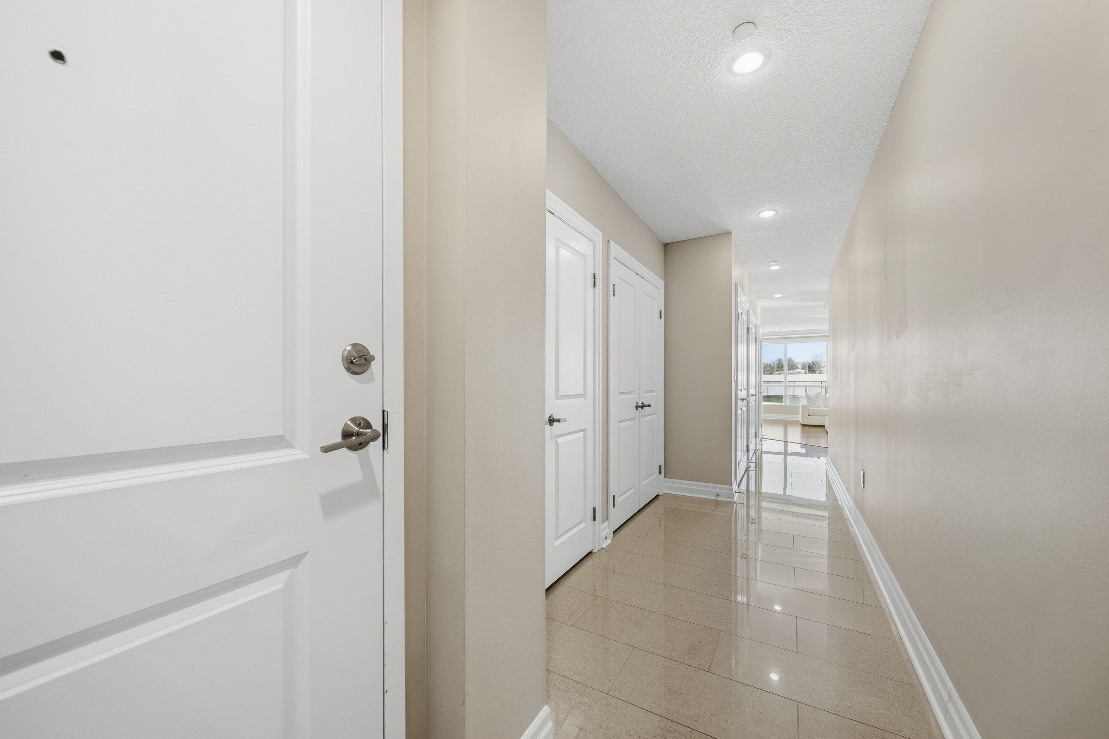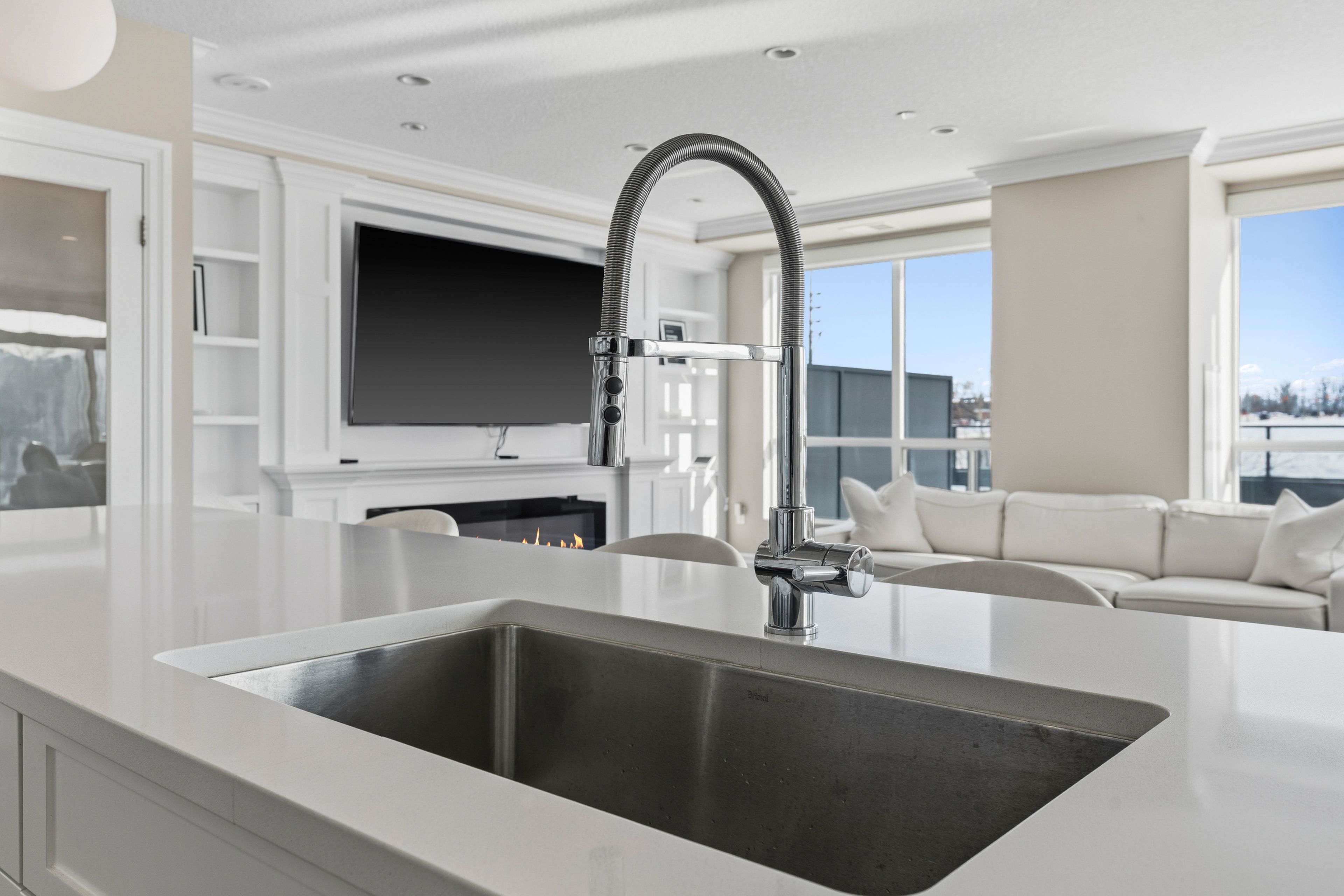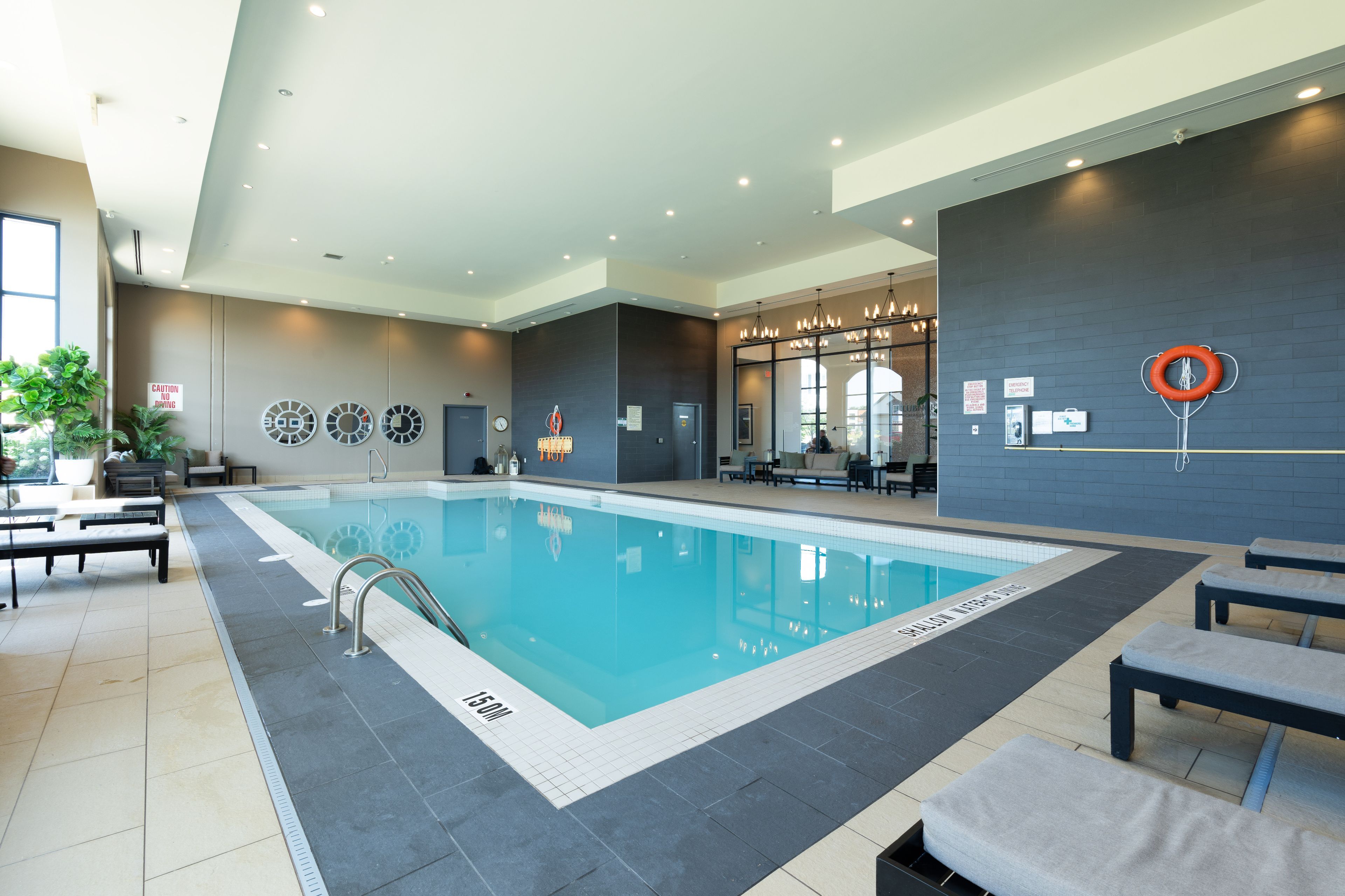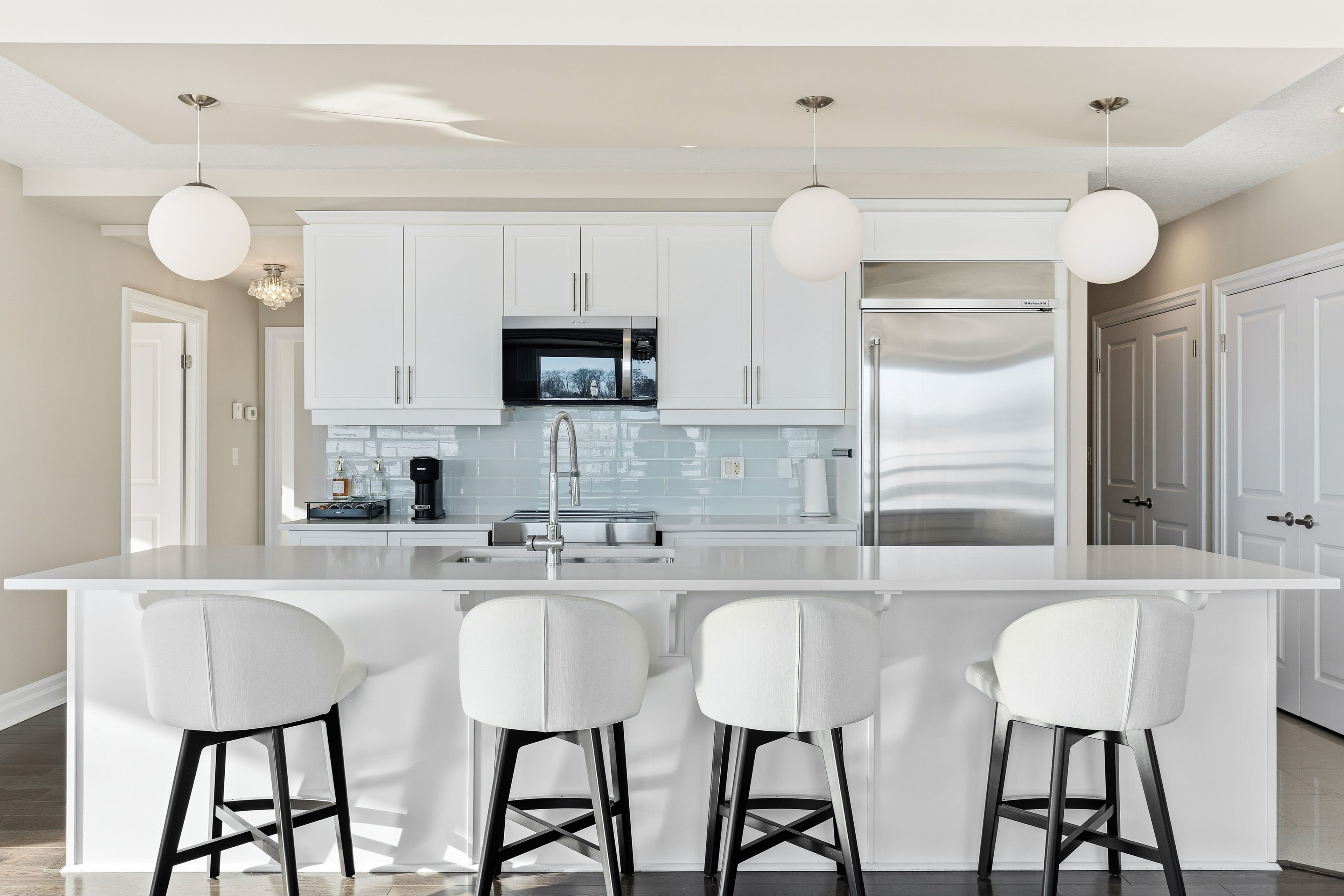 An exceptional executive residence offering the scale, privacy, and outdoor living of a penthouse-without high floors or long elevator wait times. This beautifully upgraded suite features 1,615 sq. ft. of refined interior space paired with a rare 2,342 sq. ft. exclusive-use terrace, creating an outstanding indoor-outdoor lifestyle.The open-concept Great Room is ideal for everyday living and elegant entertaining, seamlessly integrating generous living and dining areas with a striking chef's kitchen, all surrounded by expansive windows and natural light. Premium finishes include hardwood and porcelain tile flooring, extensive pot lighting, upgraded fixtures, and heated bathroom floors.The gourmet kitchen offers ceiling-height white cabinetry, quartz countertops, stainless steel appliances including a built in counter-depth refrigerator, designer tile backsplash, an oversized 12-foot island with seating for four, and a walk-in pantry. The living area features custom built-ins and an extended linear fireplace, with the dining space accented by a glass-enclosed wine display. The primary bedroom retreat accommodates a king-size bed and includes a walk-in closet and a spa-inspired five-piece ensuite with granite countertops, double vanity, glass and tile shower, soaker tub, and heated floors. The second bedroom is ideal as a guest suite or home office. A three-season Lumon sunroom with floor-to-ceiling retractable glass and UV protection extends year-round enjoyment. Outdoor living is exceptional, with a south-facing terrace featuring astroturf and cedar hedge border, plus an expansive open patio with eastern exposure-perfect for entertaining and sunrise views.Includes four underground parking spaces and an owned storage locker. Building amenities include an indoor pool, fitness centre, dining room, billiards room, library/lounge, and theatre. Desirable North London location near shopping, golf, hospitals, and nature trails. Condo fees include heat and air conditioning.