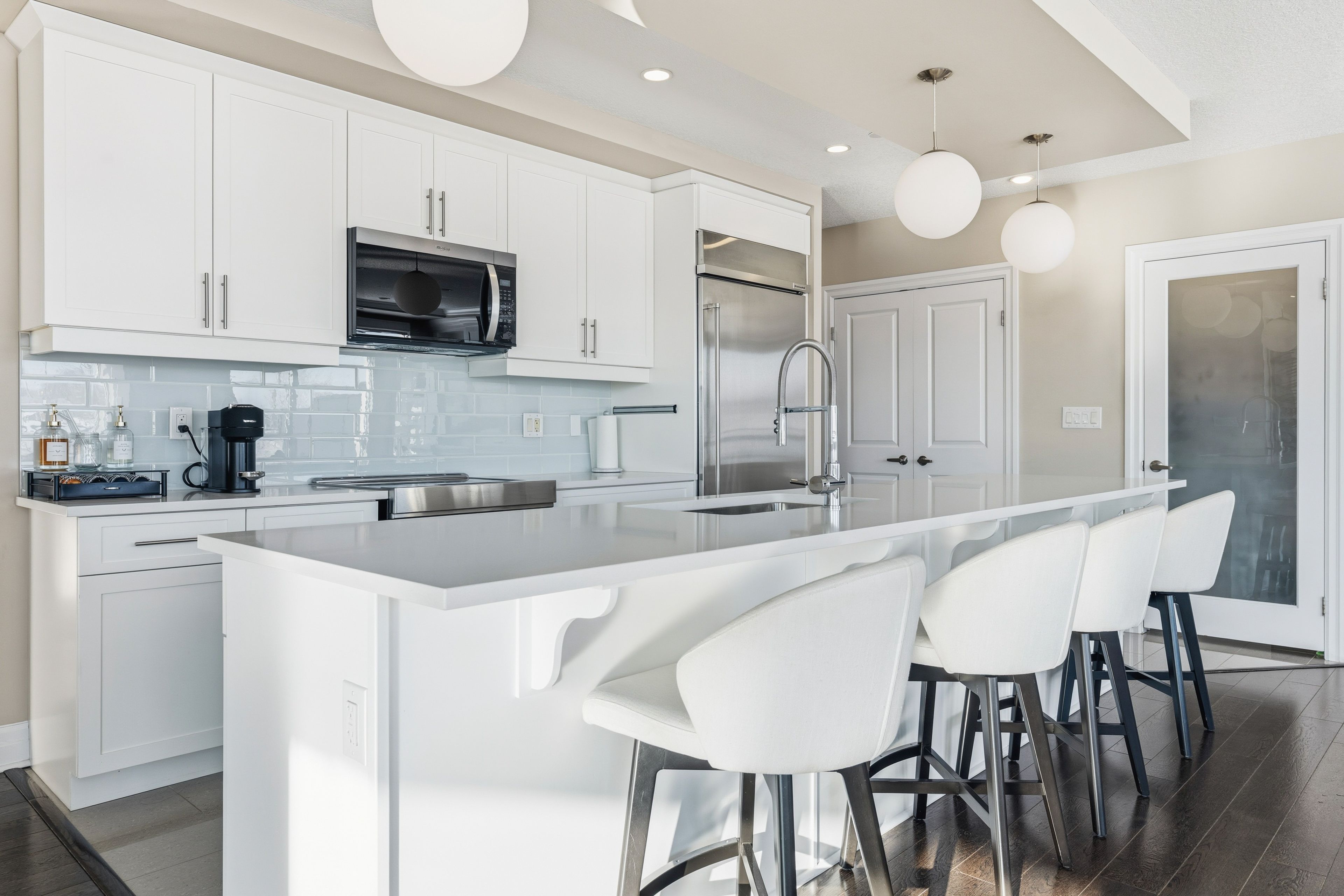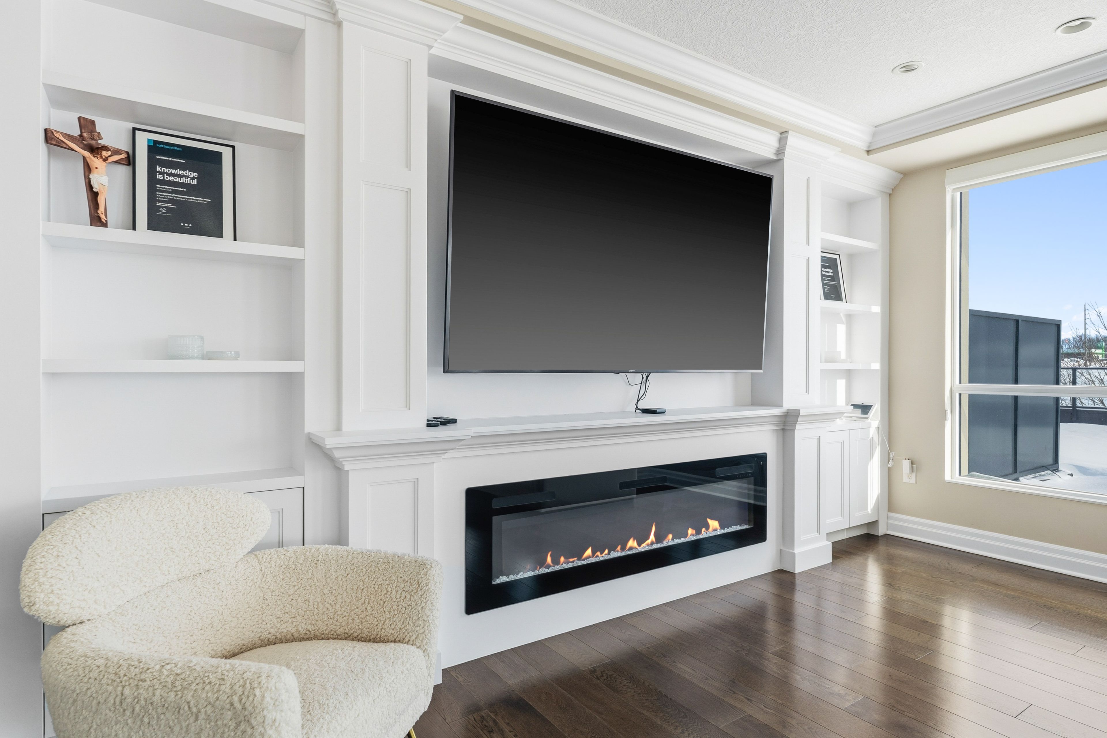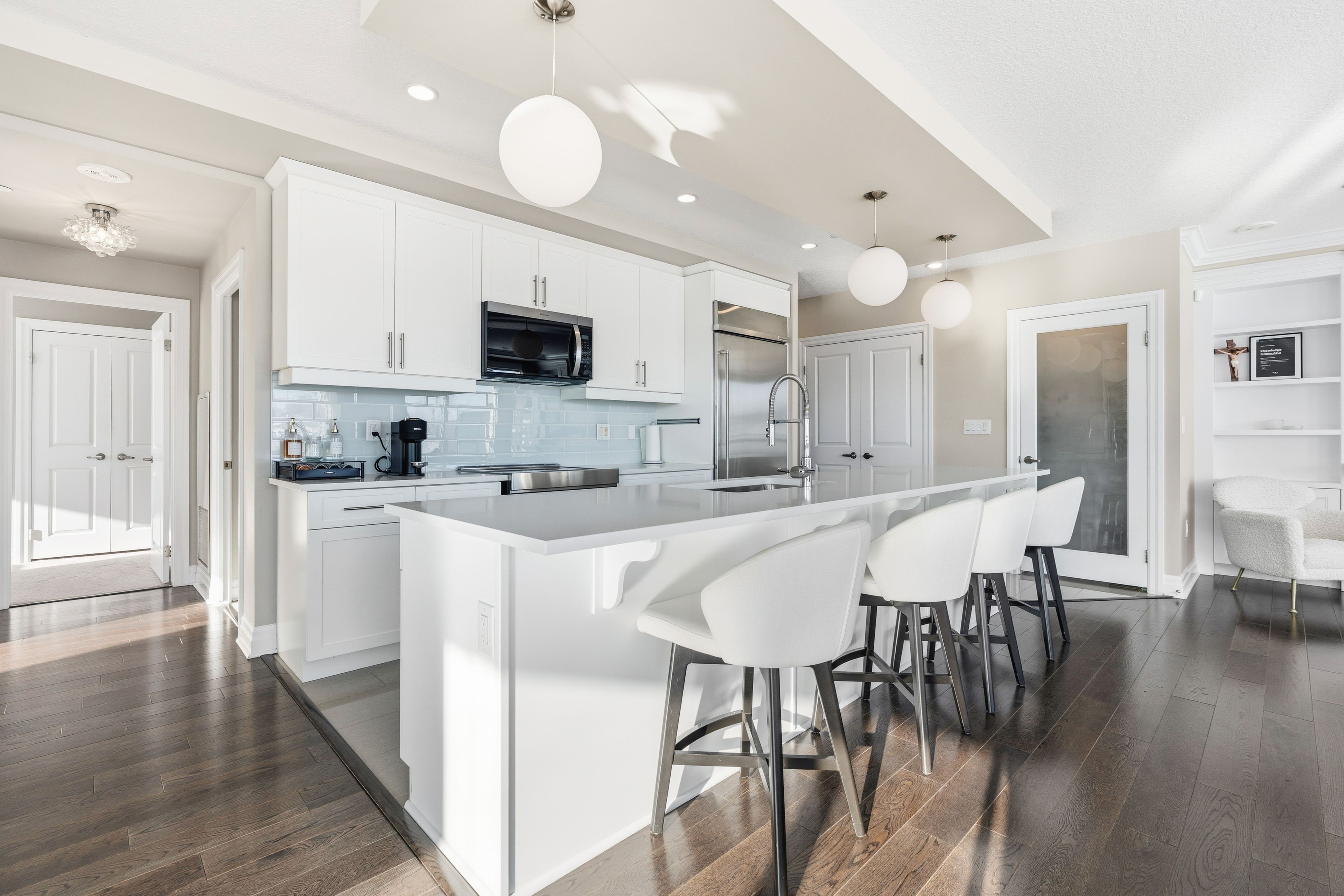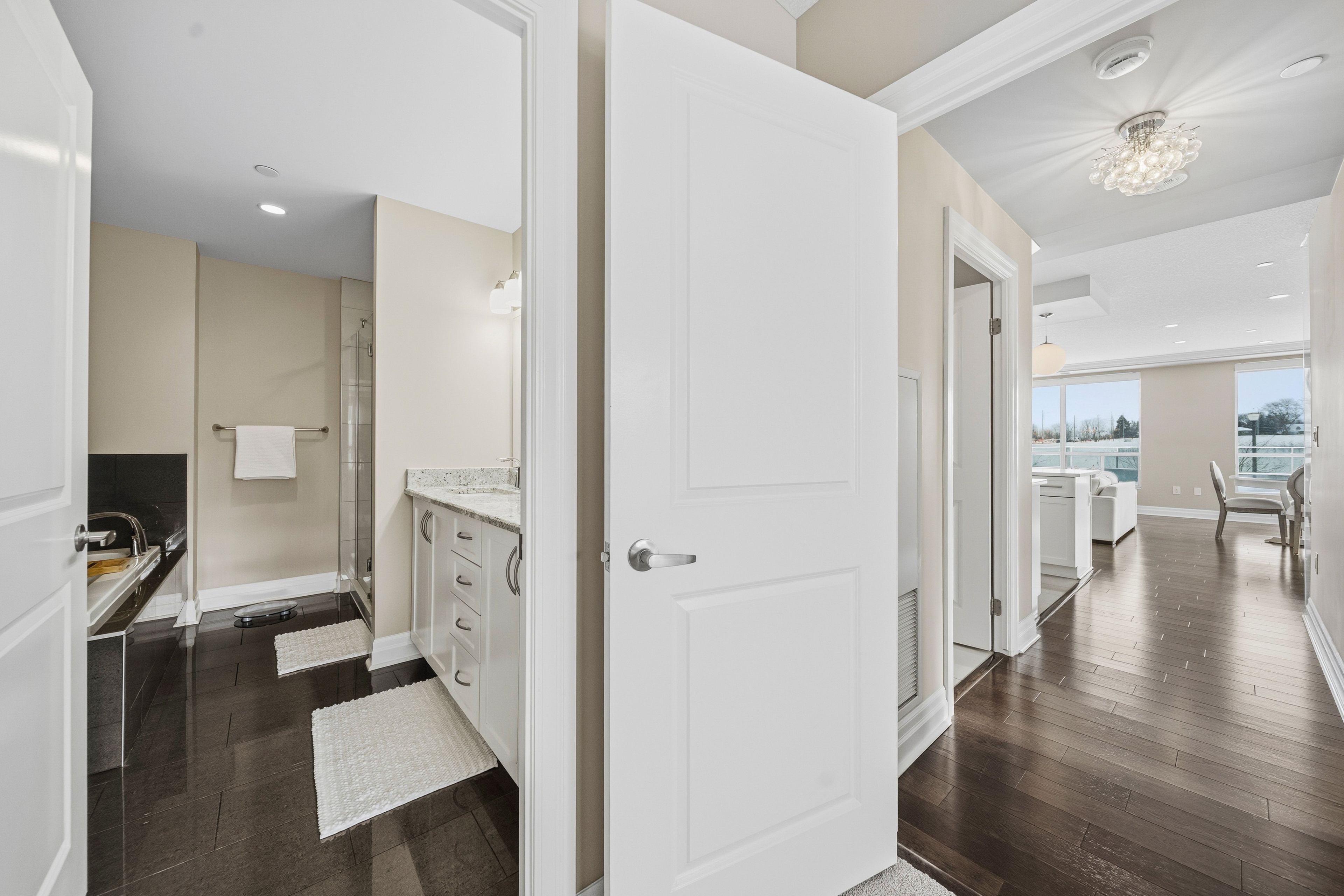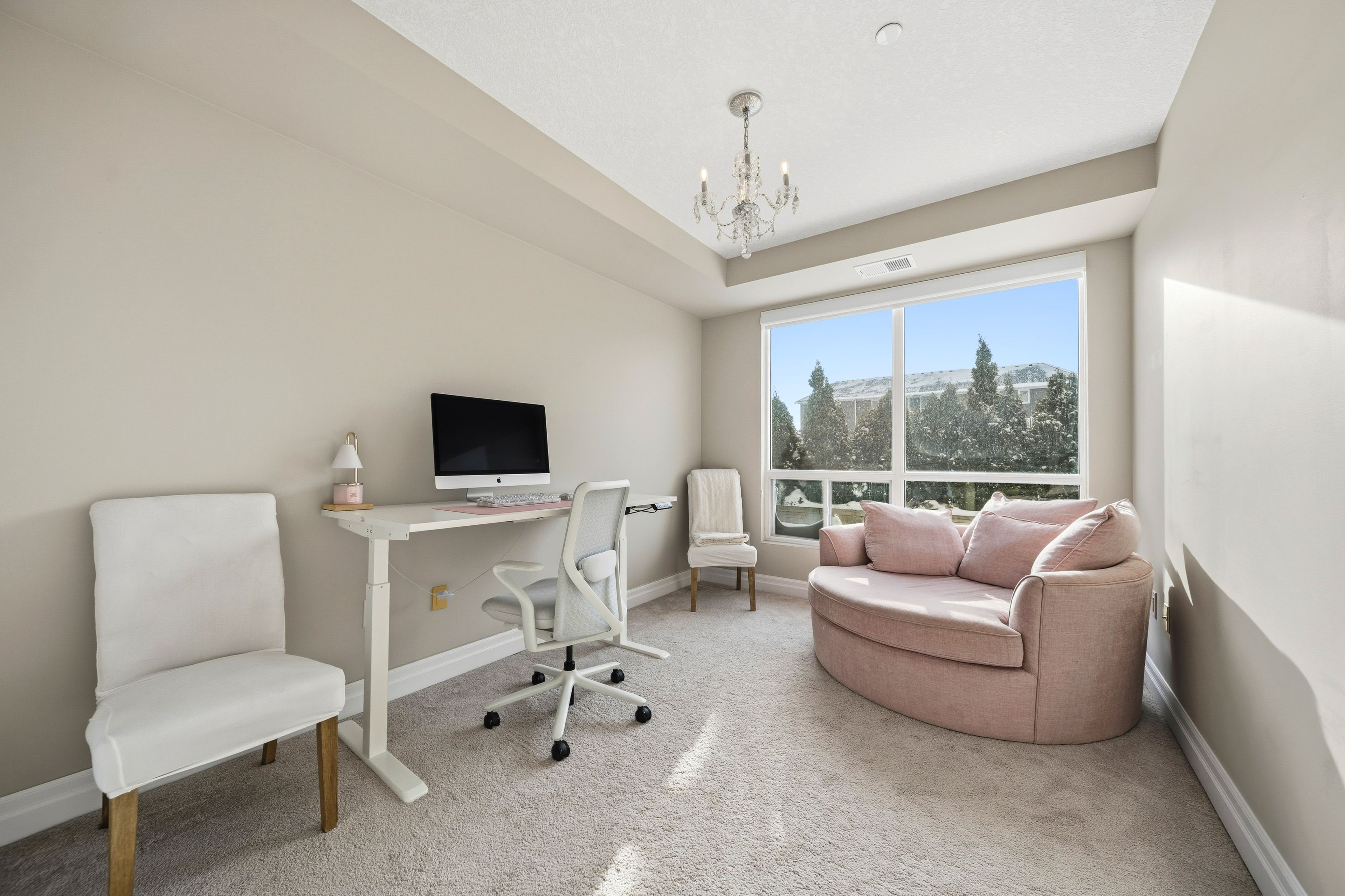 An exceptional executive residence offering the scale, privacy, and outdoor living of a penthouse-without high floors or long elevator wait times. This beautifully upgraded suite features 1,615 sq. ft. of refined interior space paired with a rare 2,342 sq. ft. exclusive-use terrace, creating an outstanding indoor-outdoor lifestyle.The open-concept Great Room is ideal for everyday living and elegant entertaining, seamlessly integrating generous living and dining areas with a striking chef's kitchen, all surrounded by expansive windows and natural light. Premium finishes include hardwood and porcelain tile flooring, extensive pot lighting, upgraded fixtures, and heated bathroom floors.The gourmet kitchen offers ceiling-height white cabinetry, quartz countertops, stainless steel appliances including a built in counter-depth refrigerator, designer tile backsplash, an oversized 12-foot island with seating for four, and a walk-in pantry. The living area features custom built-ins and an extended linear fireplace, with the dining space accented by a glass-enclosed wine display. The primary bedroom retreat accommodates a king-size bed and includes a walk-in closet and a spa-inspired five-piece ensuite with granite countertops, double vanity, glass and tile shower, soaker tub, and heated floors. The second bedroom is ideal as a guest suite or home office. A three-season Lumon sunroom with floor-to-ceiling retractable glass and UV protection extends year-round enjoyment. Outdoor living is exceptional, with a south-facing terrace featuring astroturf and cedar hedge border, plus an expansive open patio with eastern exposure-perfect for entertaining and sunrise views.Includes four underground parking spaces and an owned storage locker. Building amenities include an indoor pool, fitness centre, dining room, billiards room, library/lounge, and theatre. Desirable North London location near shopping, golf, hospitals, and nature trails. Condo fees include heat and air conditioning.