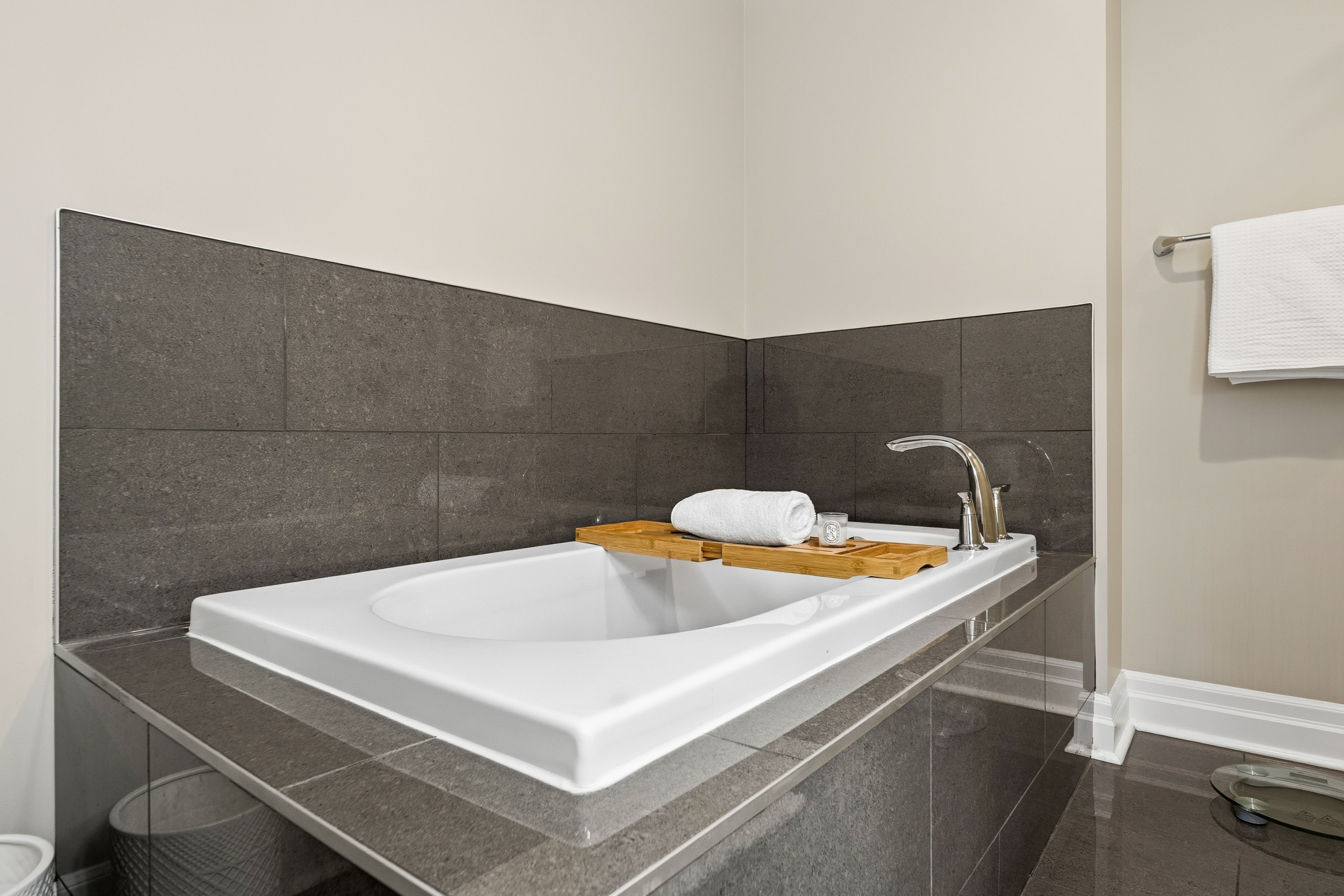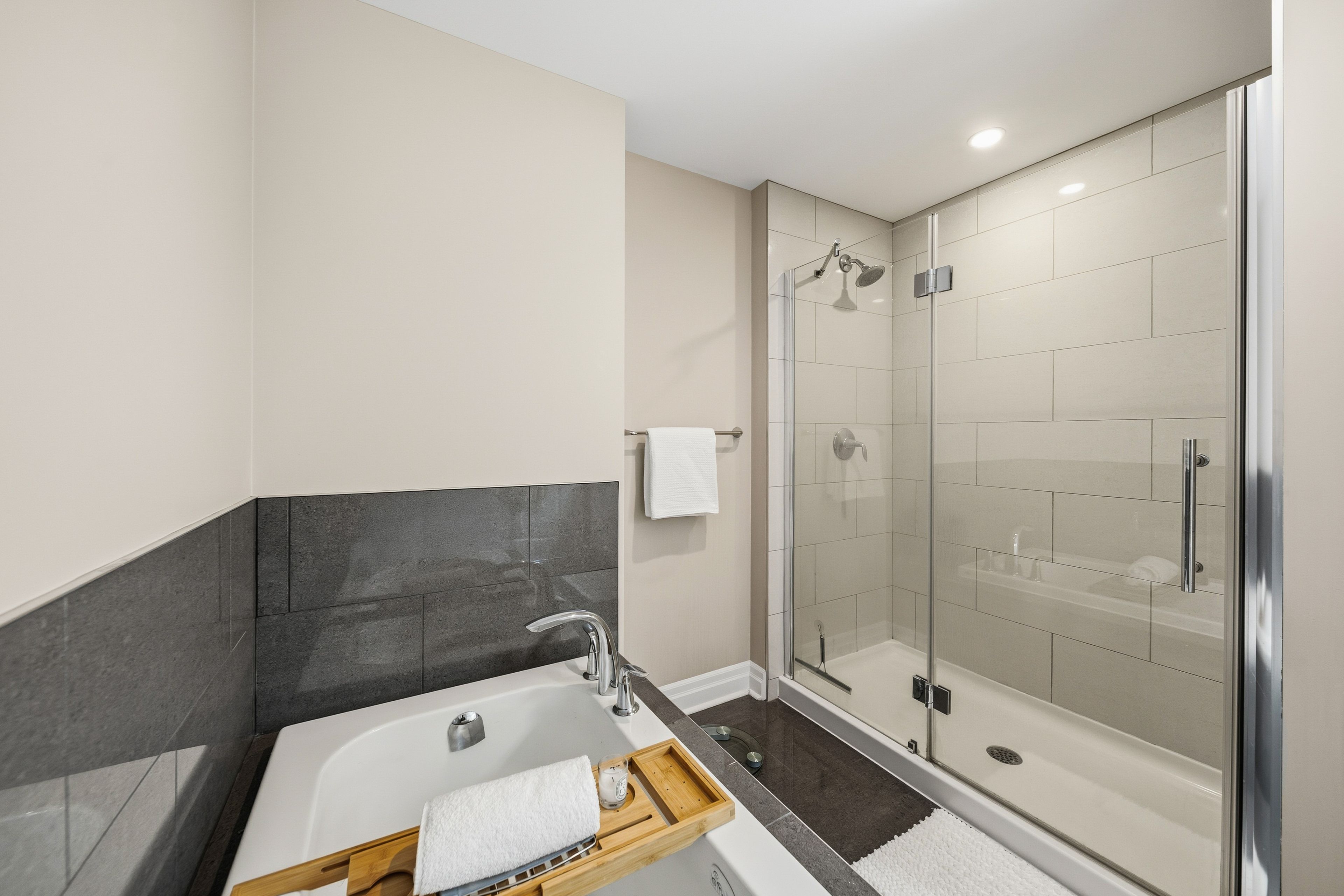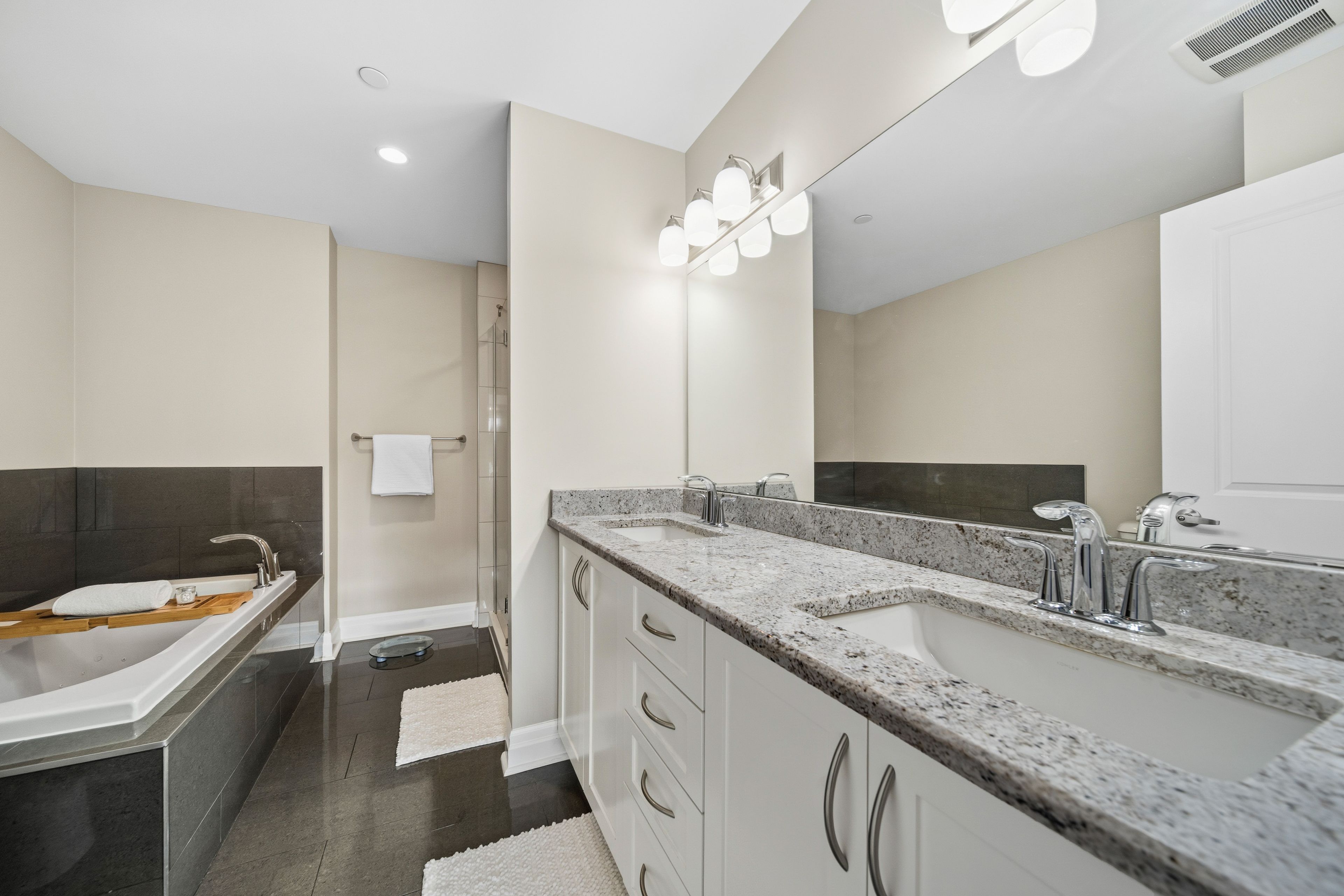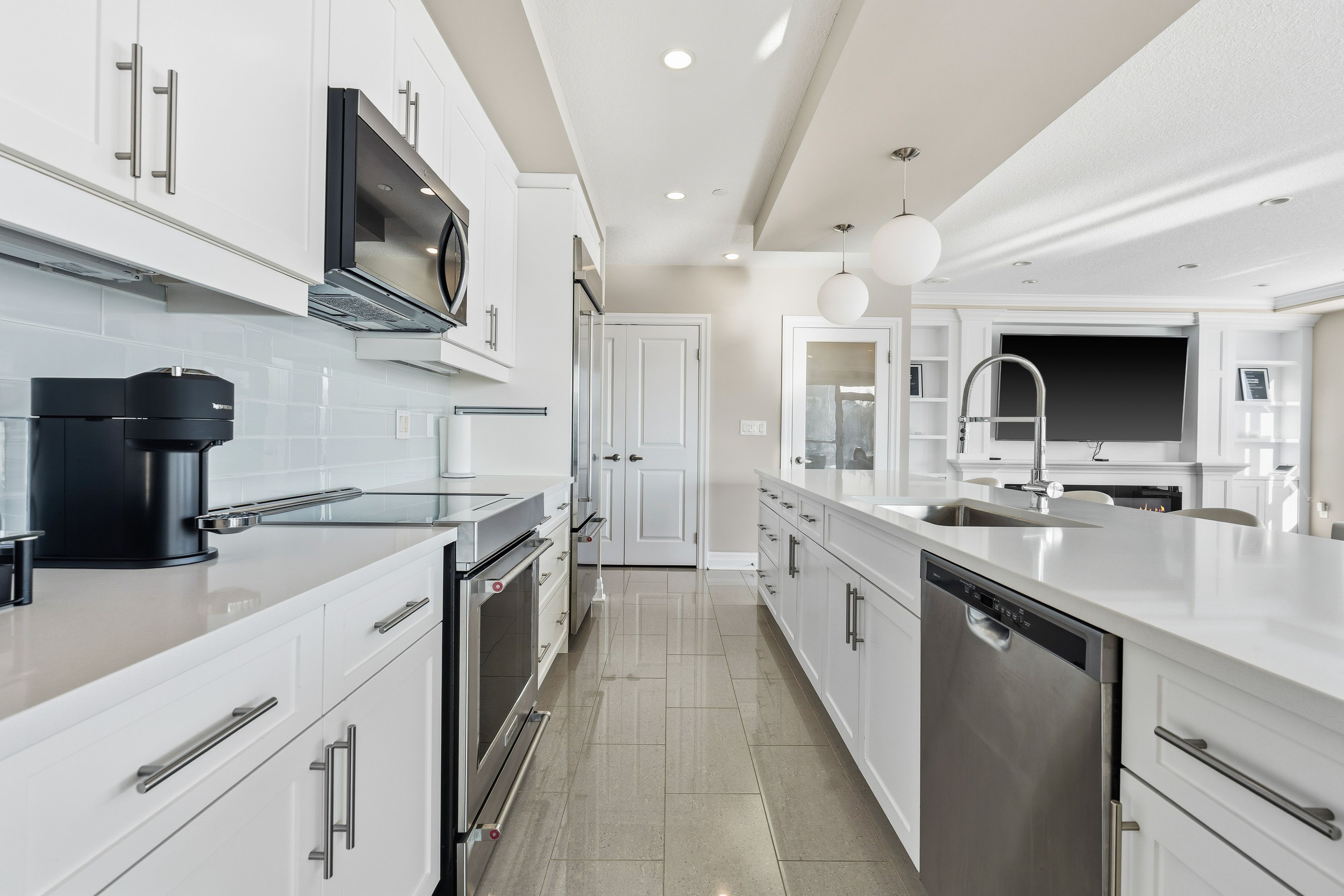 An exceptional executive residence offering the scale, privacy, and outdoor living of a penthouse-without high floors or long elevator wait times. This beautifully upgraded suite features 1,615 sq. ft. of refined interior space paired with a rare 2,342 sq. ft. exclusive-use terrace, creating an outstanding indoor-outdoor lifestyle.The open-concept Great Room is ideal for everyday living and elegant entertaining, seamlessly integrating generous living and dining areas with a striking chef's kitchen, all surrounded by expansive windows and natural light. Premium finishes include hardwood and porcelain tile flooring, extensive pot lighting, upgraded fixtures, and heated bathroom floors.The gourmet kitchen offers ceiling-height white cabinetry, quartz countertops, stainless steel appliances including a built in counter-depth refrigerator, designer tile backsplash, an oversized 12-foot island with seating for four, and a walk-in pantry. The living area features custom built-ins and an extended linear fireplace, with the dining space accented by a glass-enclosed wine display. The primary bedroom retreat accommodates a king-size bed and includes a walk-in closet and a spa-inspired five-piece ensuite with granite countertops, double vanity, glass and tile shower, soaker tub, and heated floors. The second bedroom is ideal as a guest suite or home office. A three-season Lumon sunroom with floor-to-ceiling retractable glass and UV protection extends year-round enjoyment. Outdoor living is exceptional, with a south-facing terrace featuring astroturf and cedar hedge border, plus an expansive open patio with eastern exposure-perfect for entertaining and sunrise views.Includes four underground parking spaces and an owned storage locker. Building amenities include an indoor pool, fitness centre, dining room, billiards room, library/lounge, and theatre. Desirable North London location near shopping, golf, hospitals, and nature trails. Condo fees include heat and air conditioning.