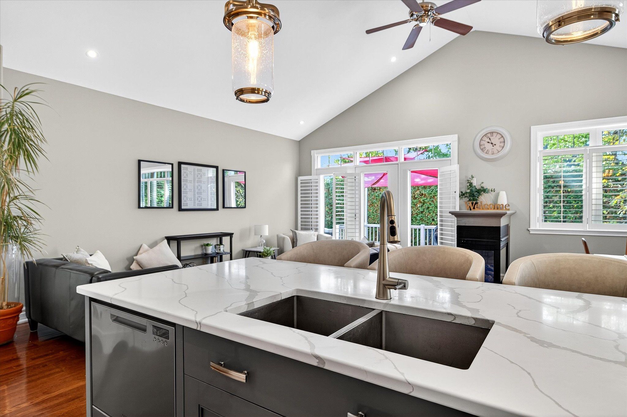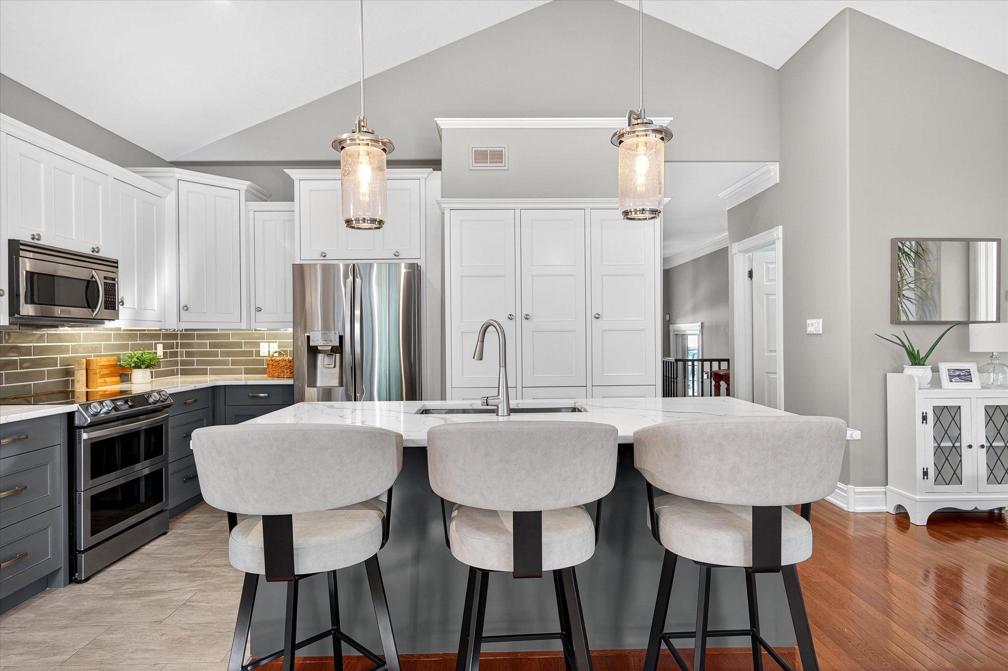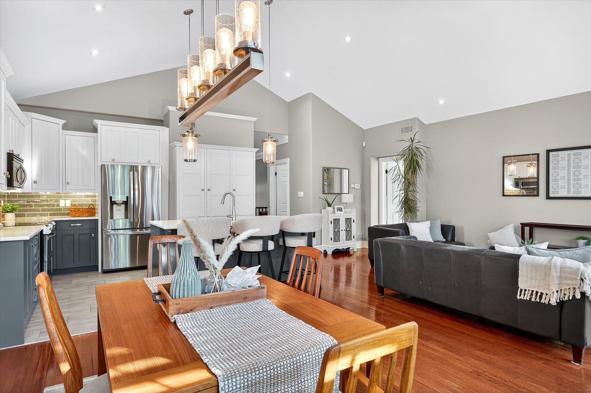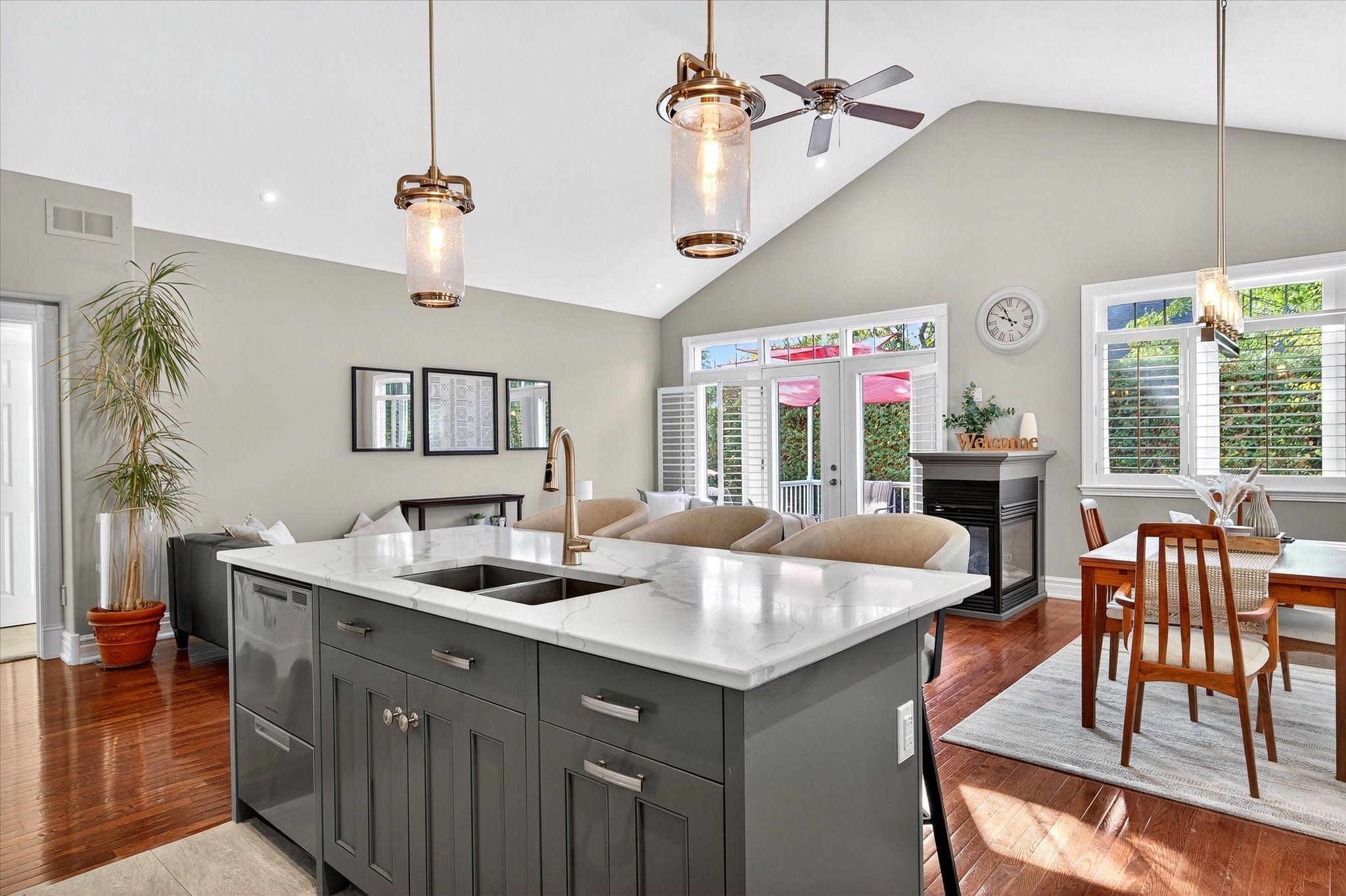 This beautifully appointed 2+2-bedroom, 3 bath raised bungalow exudes elegance. The main living area features hard surfaces throughout with a bright, open concept living space, with vaulted ceiling, that combines the living room, dining room and kitchen with natural separations provided by the three-sided gas fireplace and serviced kitchen island with room for seating. Spacious kitchen with SS appliances including double oven and pantry nearby. The living room exits onto the back patio for convenient hosting or outdoor cooking in a very private backyard. The laundry is located on the main floor, and all four bedrooms are generously sized with a primary that features a 4-piece ensuite and walk in closet. The lower level has ample storage room, a third 4-piece bathroom, a second gas fireplace in the rec room and nine-foot ceilings providing lots of air space. Extra bonus is an installed Generlink with generator/cable. Pre-inspected for your convenience. Don't miss your chance to make this gem your own!