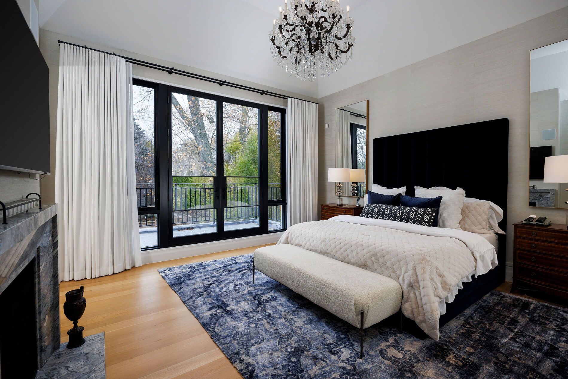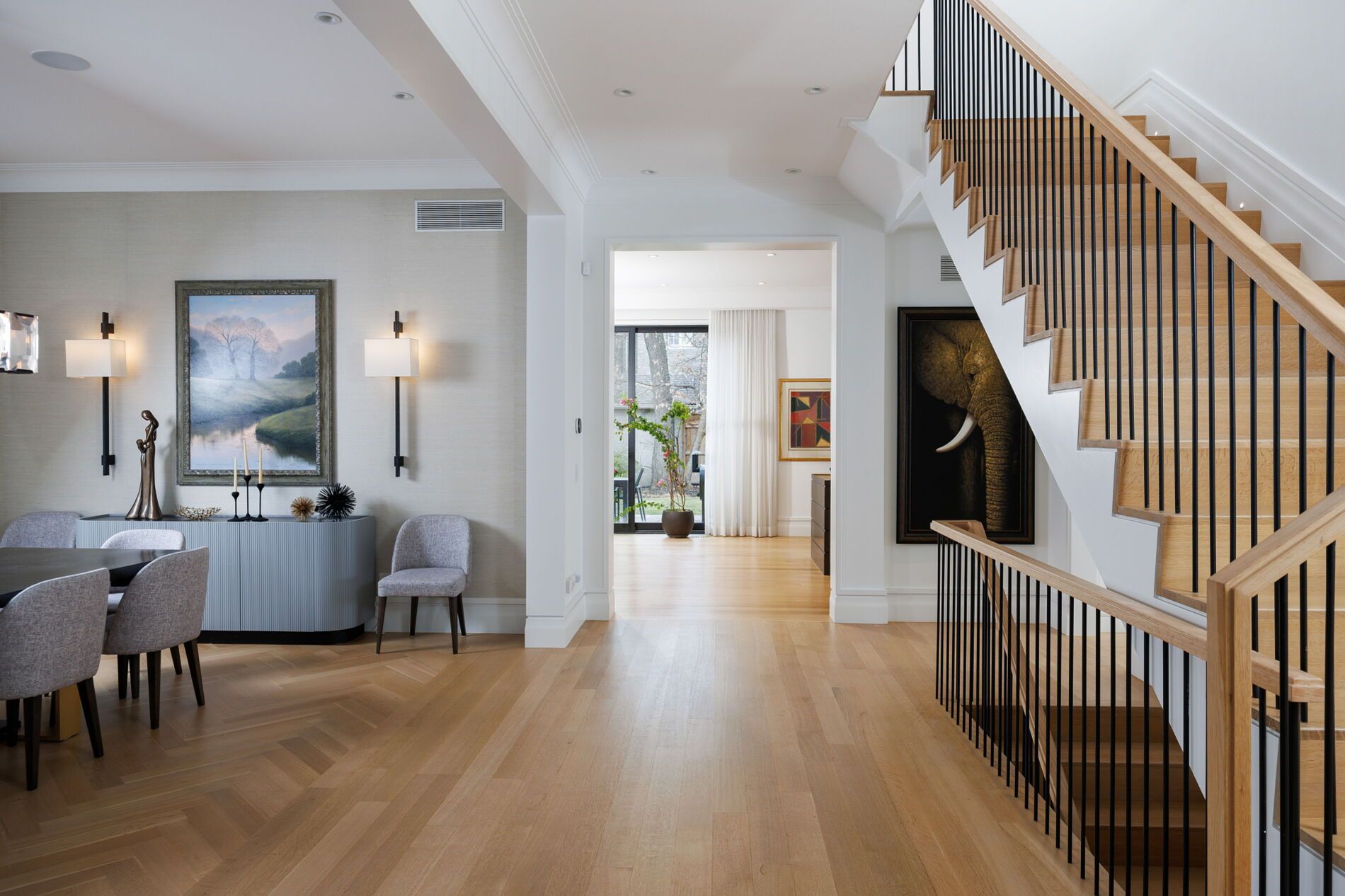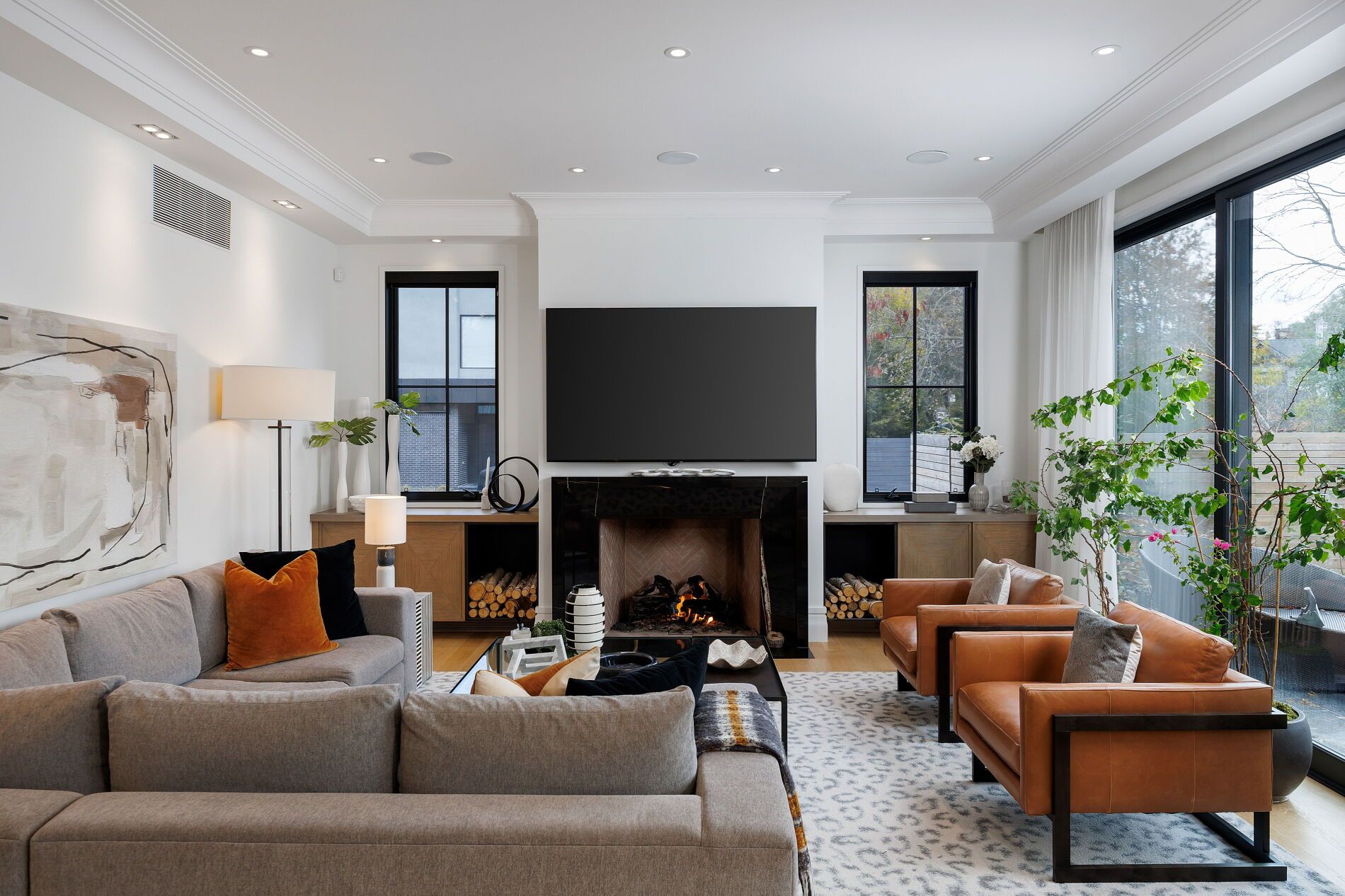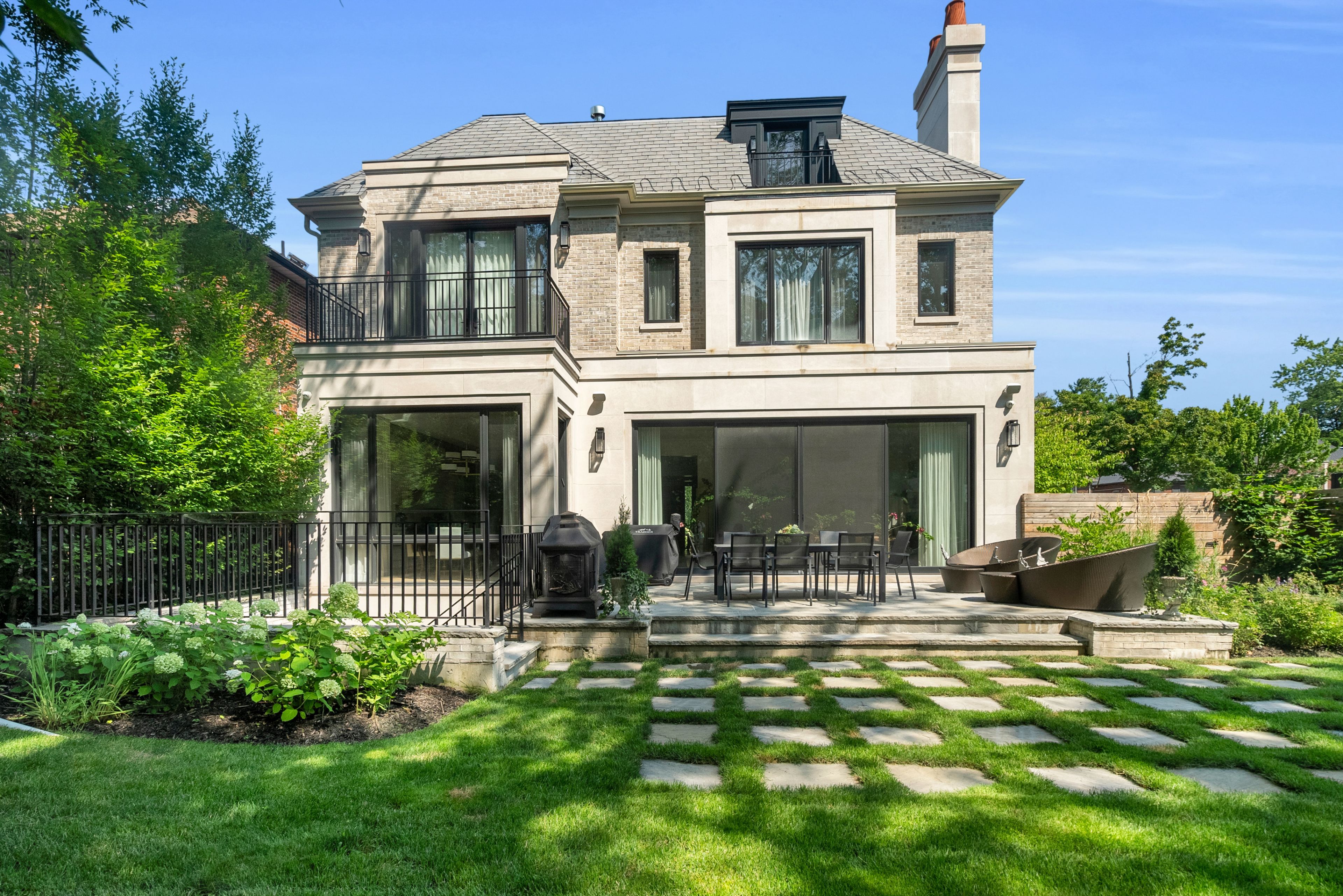 Nestled on a quiet, tree-lined street in Lytton Park, 207 Strathallan Blvd is a bespoke 5+ bedroom residence offering over 6,500 sq.ft. of elegantly crafted total living space. Built in 2019 by Teddington Homes & realized with uncompromising craftsmanship & a refined palette of luxury materials, the home was conceived under the architectural direction of Limor Benmor-Mizrahi (formerly of Peter Higgins Architect) & finished with interiors by Debra Salmoni, embodying a balance of modern sophistication & enduring comfort. A monumental front door opens into a refined foyer with a custom marble-inlay floor. A powder room is conveniently located off the foyer, across from the executive office. White oak & heated stone flooring, soaring ceilings & abundant natural light create an atmosphere of calm refinement. At the front, the executive office is anchored by a sleek see-through gas fireplace that also serves the open-concept formal living & dining areas, where French doors walk out to a flagstone terrace. The centre hall leads into the sun-filled family room with floor-to-ceiling windows & oversized sliders extending the space to the backyard. The south-facing breakfast area enjoys another walk-out. The kitchen, both a design statement & a culinary workspace, features integrated pro-grade appliances, custom Bellini cabinetry, marble countertops & backsplash, an oversized limestone island with seating, extended-height cabinetry & a fully outfitted butler's pantry with access to the mudroom & garage. Upstairs, the primary suite is a private retreat with a gas fireplace, balcony, soaring ceiling & spa-inspired 5pc ensuite. Three additional bedrooms each offer a private ensuite & custom walk-in closet. The 3rd level provides a flexible 5th bedroom suite with a 3pc ensuite & balcony. The lower level features a large entertainment room with kitchenette & walkup, a glass-enclosed fitness studio, a 6th bedroom with 3pc ensuite, the main laundry room, a 2pc bath & a cold room.
