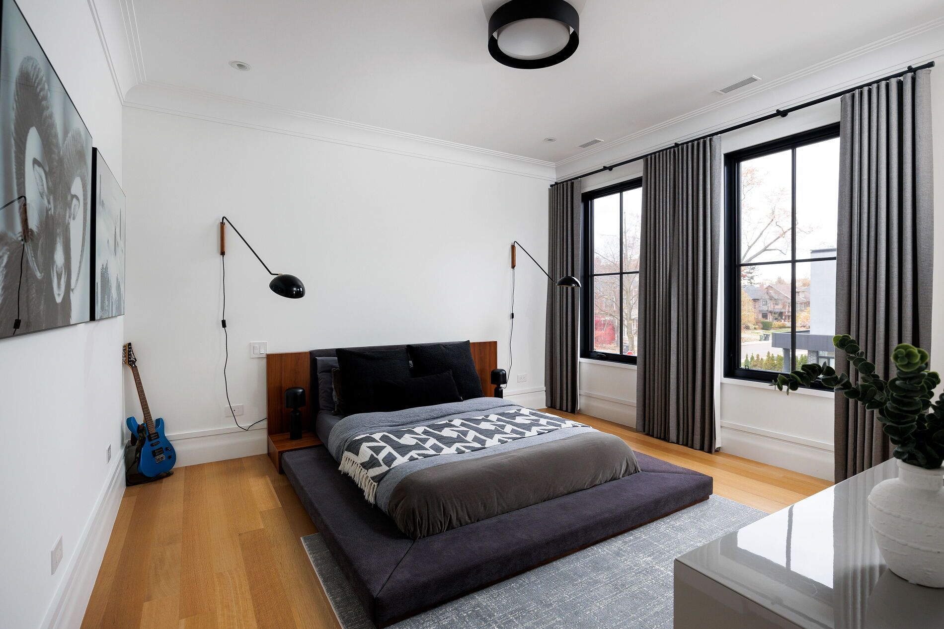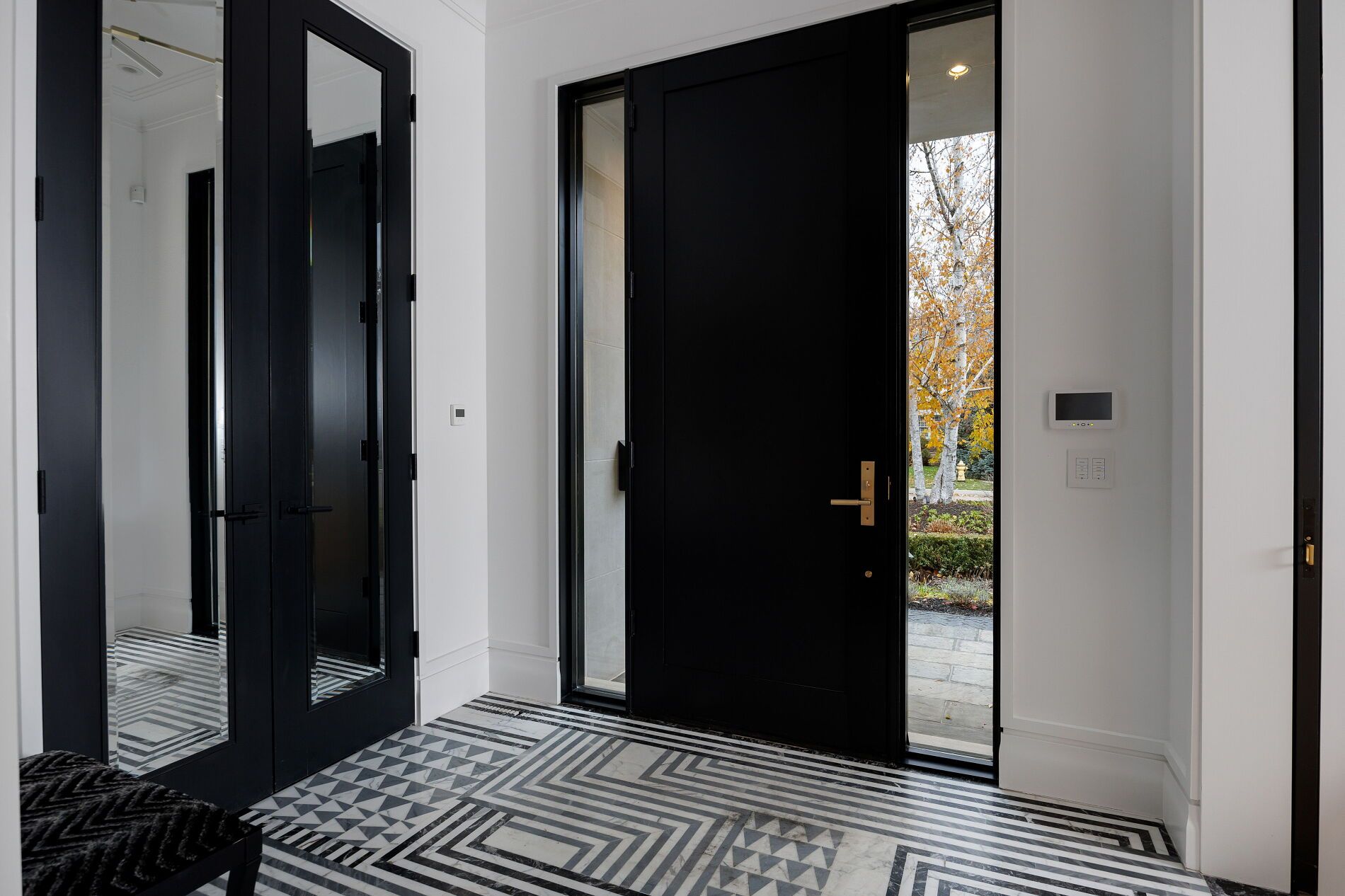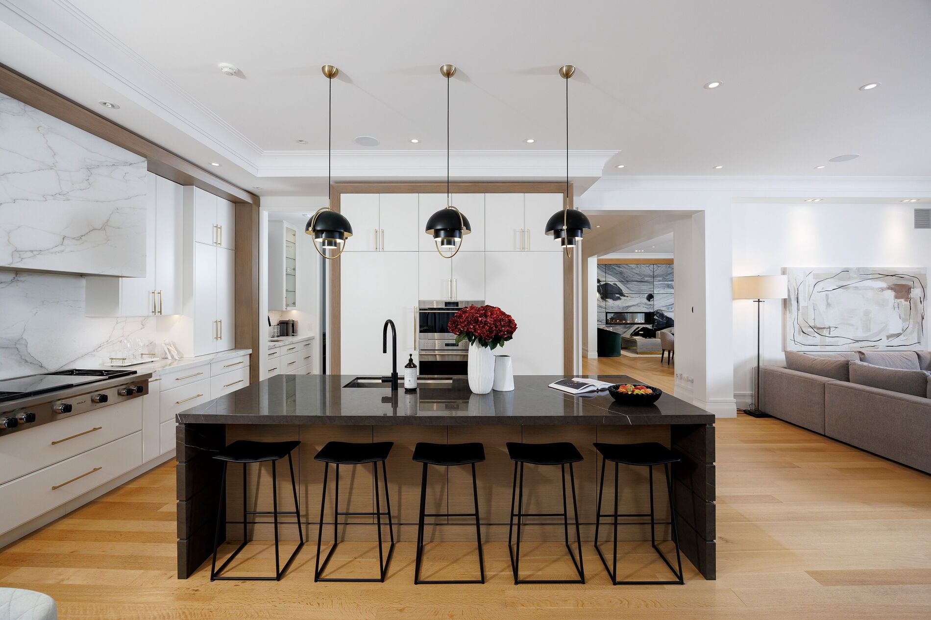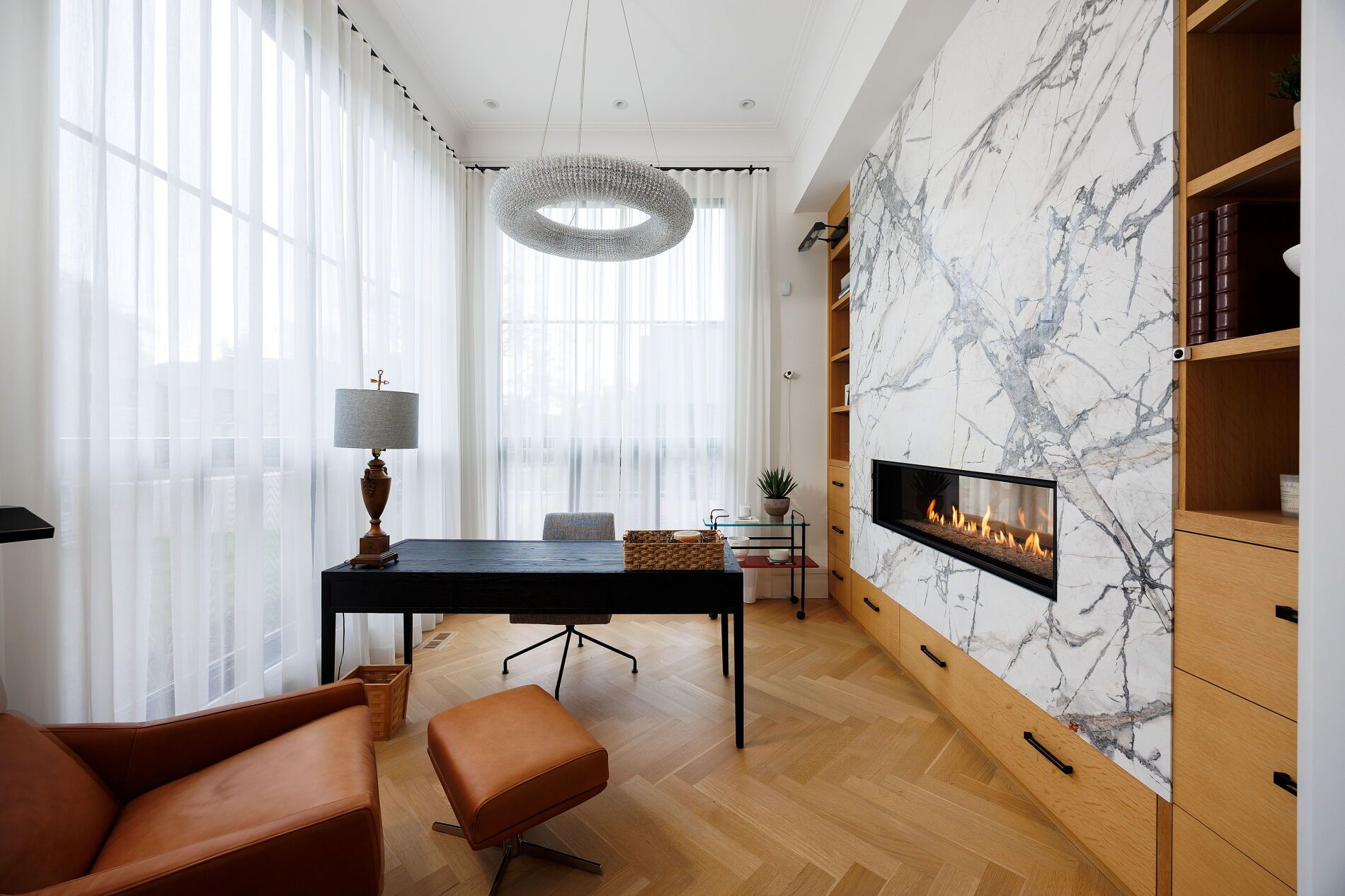 Nestled on a quiet, tree-lined street in Lytton Park, 207 Strathallan Blvd is a bespoke 5+ bedroom residence offering over 6,500 sq.ft. of elegantly crafted total living space. Built in 2019 by Teddington Homes & realized with uncompromising craftsmanship & a refined palette of luxury materials, the home was conceived under the architectural direction of Limor Benmor-Mizrahi (formerly of Peter Higgins Architect) & finished with interiors by Debra Salmoni, embodying a balance of modern sophistication & enduring comfort. A monumental front door opens into a refined foyer with a custom marble-inlay floor. A powder room is conveniently located off the foyer, across from the executive office. White oak & heated stone flooring, soaring ceilings & abundant natural light create an atmosphere of calm refinement. At the front, the executive office is anchored by a sleek see-through gas fireplace that also serves the open-concept formal living & dining areas, where French doors walk out to a flagstone terrace. The centre hall leads into the sun-filled family room with floor-to-ceiling windows & oversized sliders extending the space to the backyard. The south-facing breakfast area enjoys another walk-out. The kitchen, both a design statement & a culinary workspace, features integrated pro-grade appliances, custom Bellini cabinetry, marble countertops & backsplash, an oversized limestone island with seating, extended-height cabinetry & a fully outfitted butler's pantry with access to the mudroom & garage. Upstairs, the primary suite is a private retreat with a gas fireplace, balcony, soaring ceiling & spa-inspired 5pc ensuite. Three additional bedrooms each offer a private ensuite & custom walk-in closet. The 3rd level provides a flexible 5th bedroom suite with a 3pc ensuite & balcony. The lower level features a large entertainment room with kitchenette & walkup, a glass-enclosed fitness studio, a 6th bedroom with 3pc ensuite, the main laundry room, a 2pc bath & a cold room.