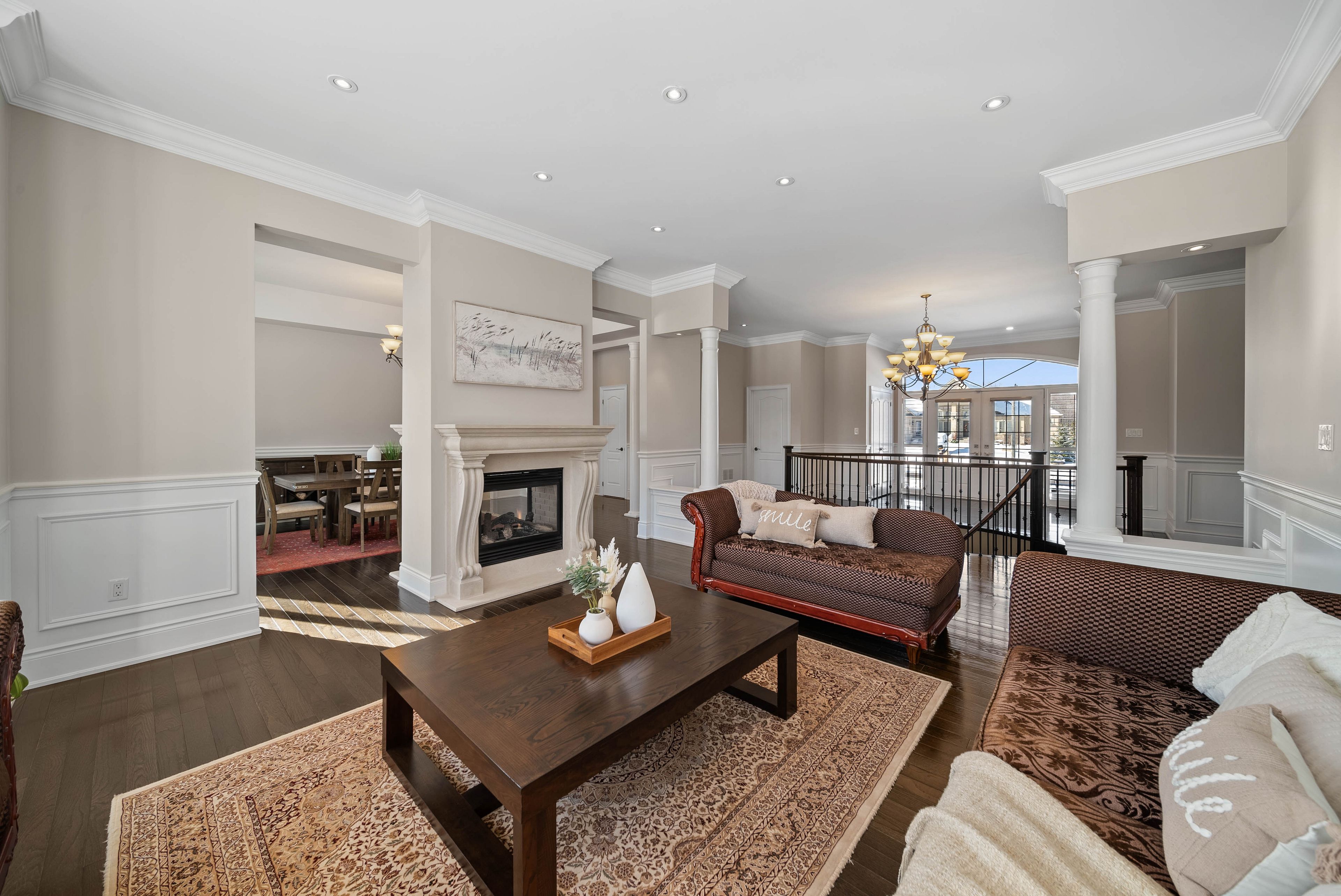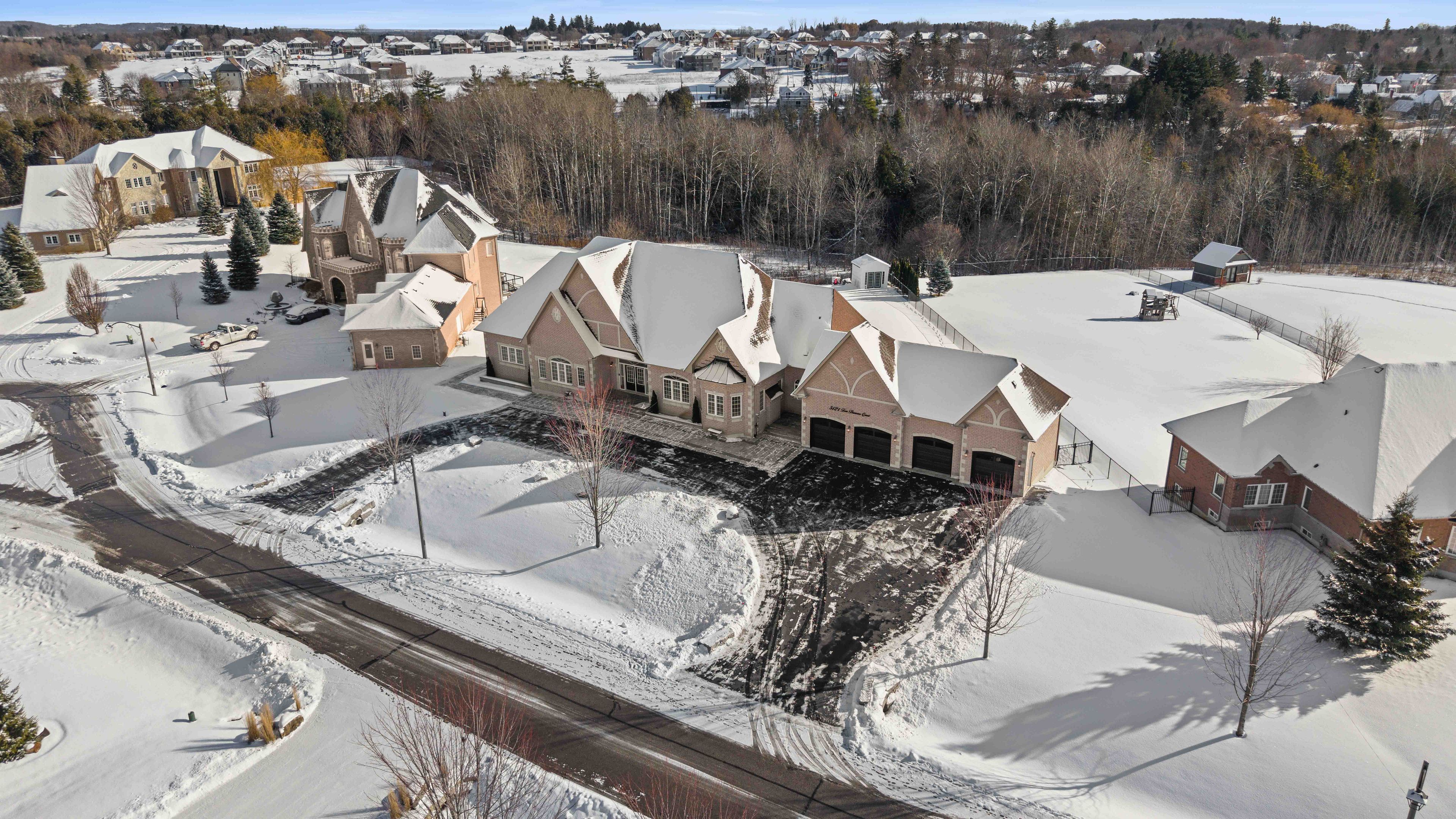 Welcome to an extraordinary custom estate in the heart of Claremont-one of Pickering's most exclusive and tightly held communities. Set on a private lot just under one acre at the end of a quiet, prestigious court, this residence offers rare estate-level scale, privacy, and refined living. Offering 7,956 SF of total living space and nearly $450,000 in recent renovations, the home blends timeless architecture with modern luxury. A newly constructed crescent driveway accommodates up to 20 vehicles and leads to an oversized 4-car garage. Professionally landscaped grounds and interlocking stone extend to the rear, where two tiers of custom decks with glass railings create exceptional outdoor living spaces. Inside, the main level showcases custom millwork, wainscoting, and an executive office with built-in shelving. The oversized chef's kitchen offers extensive cabinetry and prep space, ideal for entertaining. The family and dining rooms are anchored by a dramatic double-sided custom stone gas fireplace. A rare highlight is the four generously sized bedroom suites on the main level, each with its own private ensuite. The primary suite features a luxurious 7-piece ensuite with dual vanities, deep soaker tub, glass shower, and generous closet space. The lower level spans over 4,000 SF, featuring high ceilings, wall-to-wall windows, and bright open-concept living areas that feel above grade. Large bedrooms with ensuite baths support multi-generational living, while an additional unfinished area just under 1,000 SF offers flexibility for a future suite, gym, or studio. Freshly painted, meticulously maintained, and move-in ready, this exceptional residence is moments from scenic trails, everyday amenities, the Old Elm GO Station, and Highway 407. A rare opportunity to own a fully re-positioned Claremont estate combining scale, craftsmanship, and lifestyle.