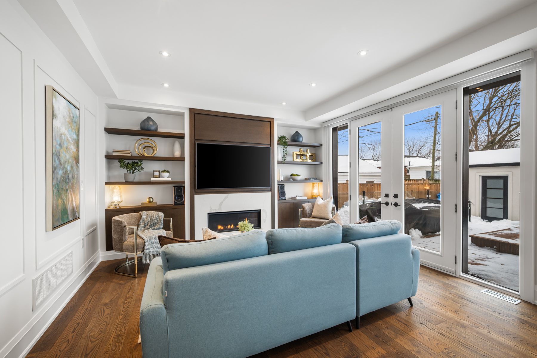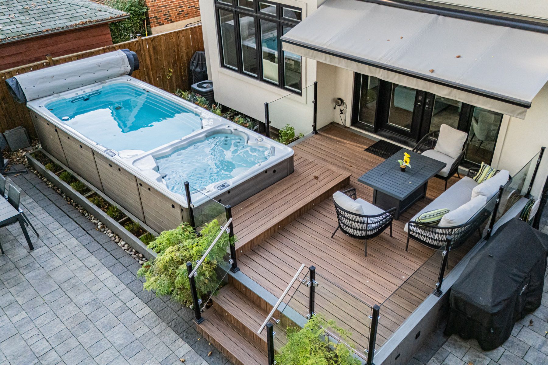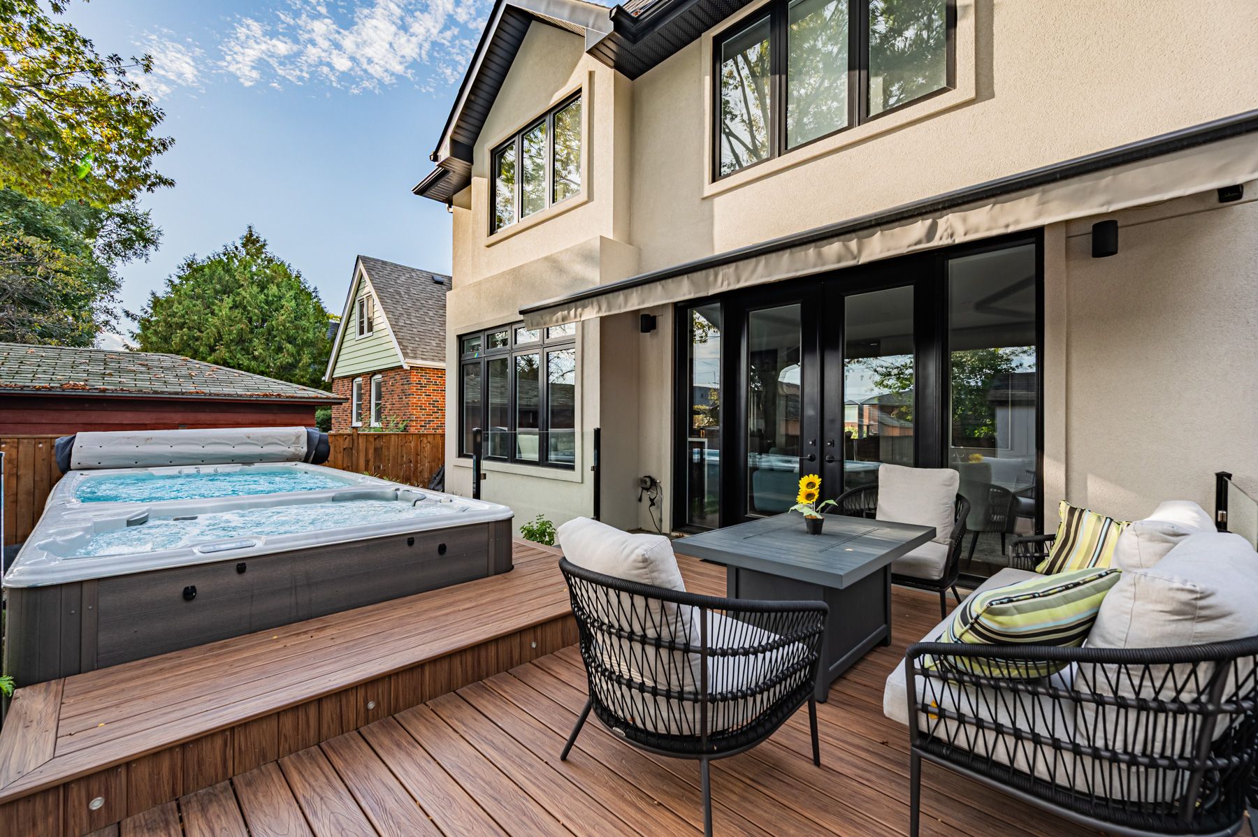 Set on a 40-foot wide lot in sought-after Topham Park, this custom-built (2020) home offers exceptional scale with over 3,500 square feet of indoor living space plus a south facing resort-style backyard sanctuary. High ceilings and expansive windows fill the home with natural light. The main floor is designed for daily routines and effortless entertaining, with elegant living and dining areas & a powder room. The show-stopping kitchen features a walk-through pantry/dry bar, sunny breakfast area, oversized quartz waterfall island, and premium Dacor appliances including a gas stove. Relax fireside in the handsome family room and step out to a backyard that defines luxury living, complete with year-round heated swim spa & hot tub, upgraded composite deck with glass railings and motorized awning, gas line for bbq, plus a lower garden retreat with mini putting green, outdoor TV lounge, water feature and dining area. Upstairs, every bedroom has an ensuite. The king-sized primary boasts a custom walk-in closet and dreamy spa-like bath with dual vanity, freestanding tub, and oversized shower. A large skylight illuminates the upper level, and convenient second-floor laundry adds everyday ease. The fully finished lower level, accessible via a side entrance, is ready for movie nights and includes space for a home gym & office, plus a fifth bedroom, full bath, and abundant storage. Central vac, a rough-in for a second laundry room, high-efficiency mechanicals, and dual sump pumps provide added flexibility and peace of mind. Smart upgrades include automated blinds, USB ports, and a Tesla/electric vehicle charger in the built-in garage. Beautiful landscaping and interlock paving enhance curb appeal. Close to the DVP for easy commuting, rapid transit incl TTC Crosstown, great schools, shopping, dining, parks, public tennis courts and nature trails. This is more than a house; it's a place where lifelong memories are made.