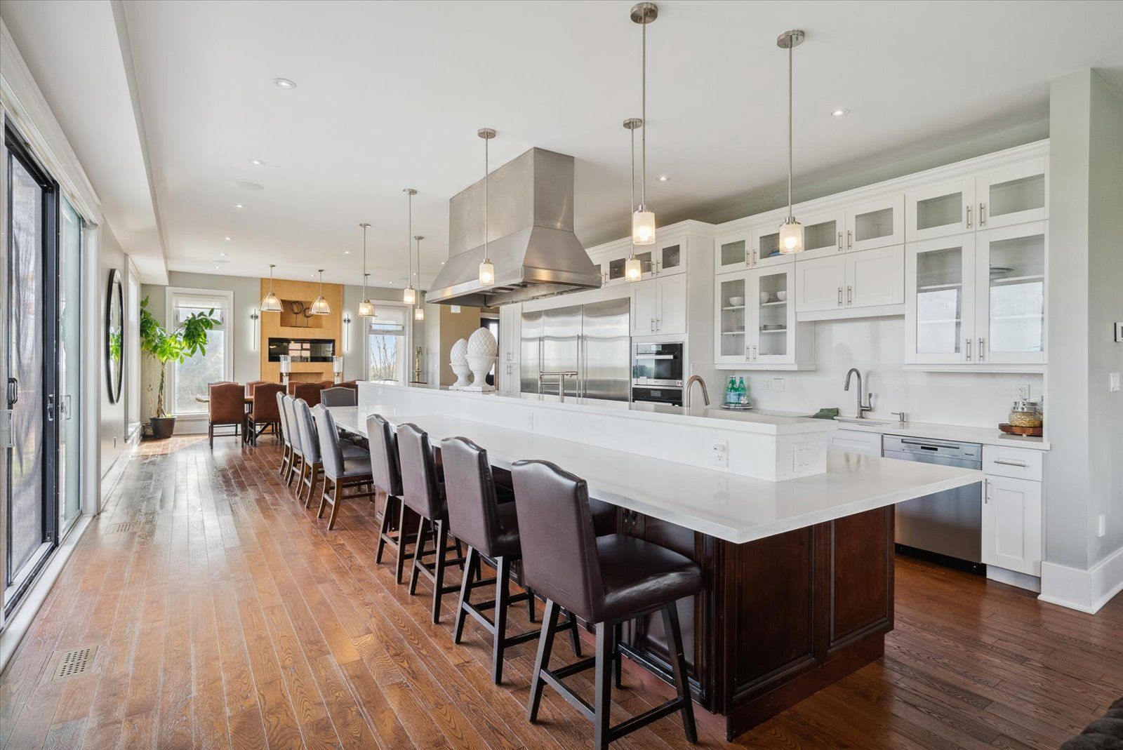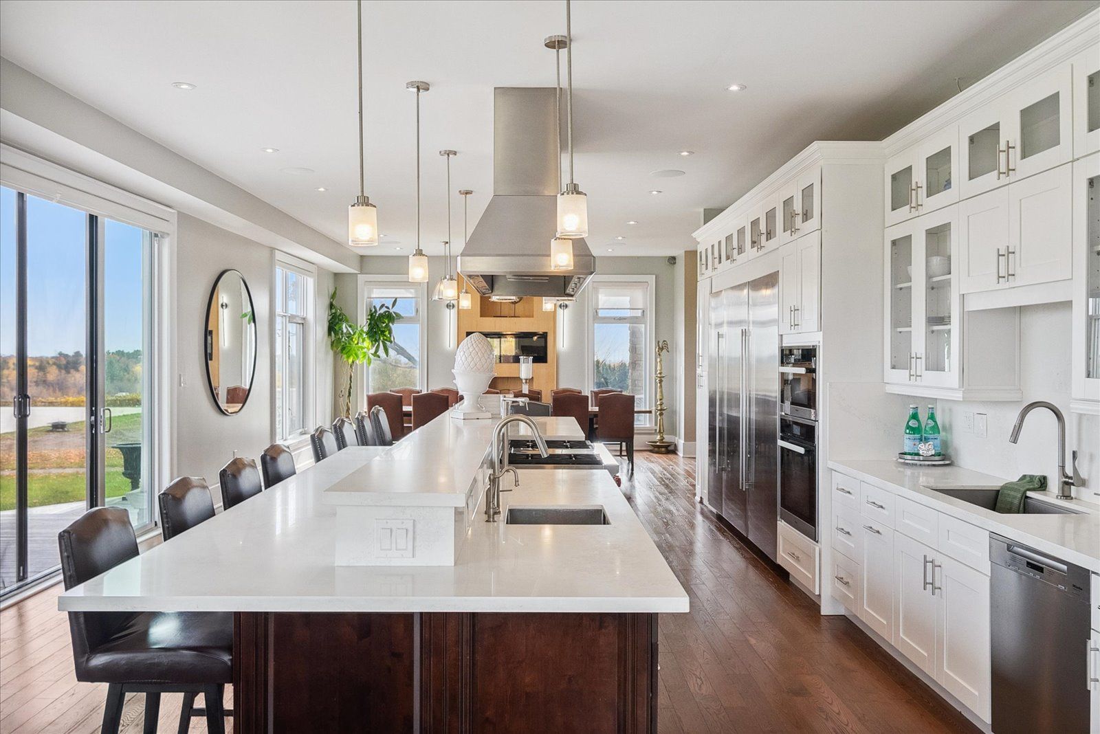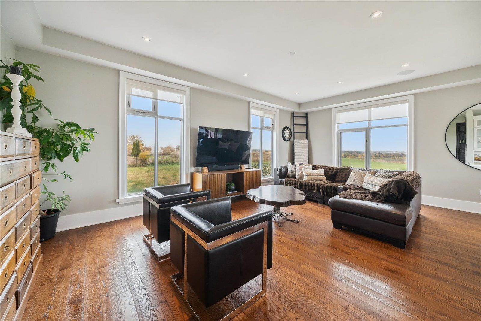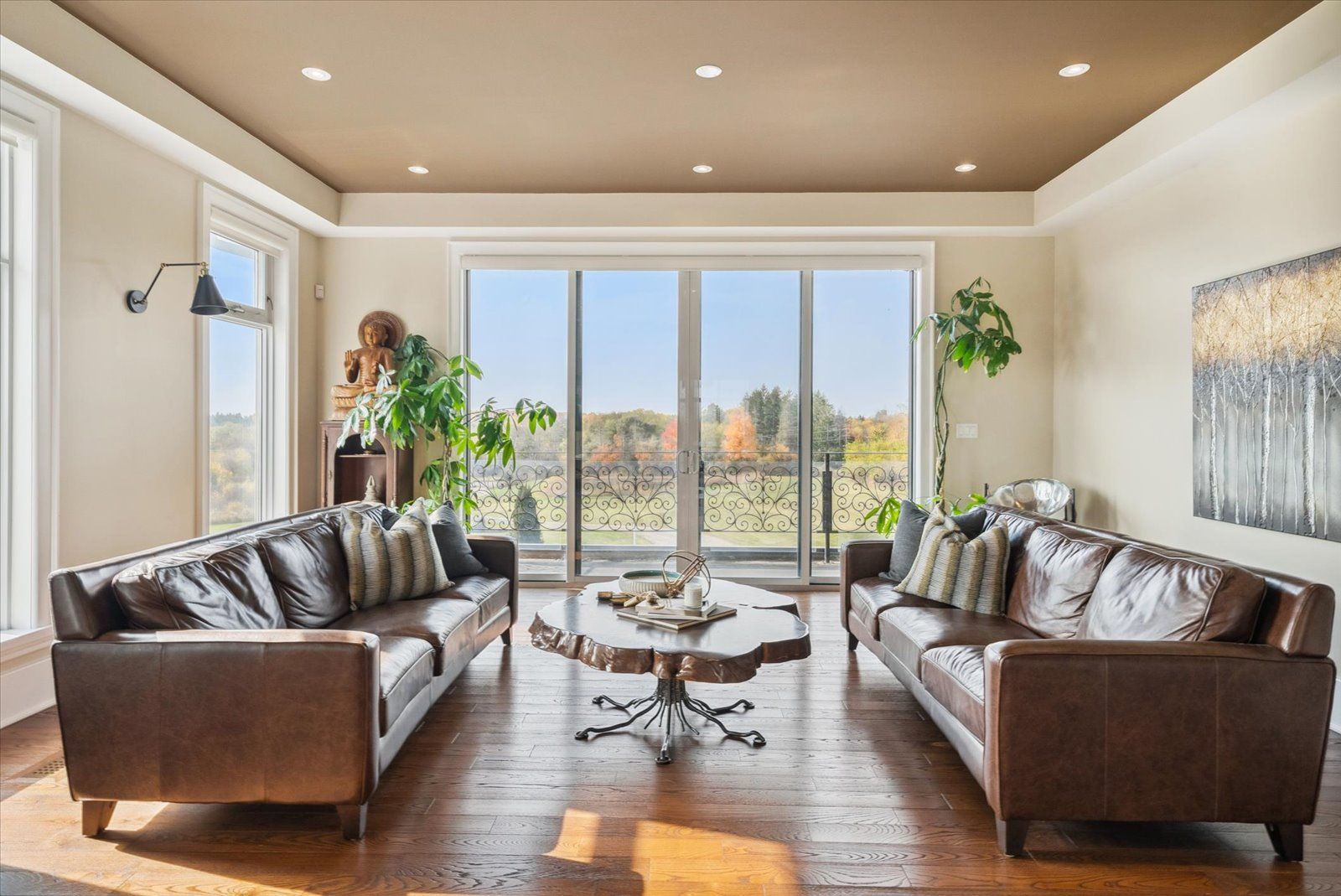 Power of Sale (mortgage foreclosure) opportunity with financing available. The vendor is willing to provide a first mortgage loan of up to $2,000,000 at a competitive interest rate, offering a rare and flexible financing opportunity for qualified buyers. Built only 10 years ago, this custom 7 bedroom, 8 bathroom estate is privately set behind gates on a serene premium 6+ acre lot. Designed for tranquility, security, and privacy, the fully fenced property features a scenic natural water feature and expansive sports court, creating a resort-style atmosphere.The heart of the home is an impressive open-concept kitchen anchored by a stunning 25-foot quartz centre island with abundant seating, complete with a Wolf gas stove, dual Sub-Zero refrigerators, two Miele built-in ovens, under-cabinet lighting, and premium finishes throughout. The kitchen flows seamlessly into the family and dining areas with walkout access to the backyard patio overlooking the scenic grounds.A separate formal living room opens onto a balcony spanning the front of the home. The main floor also offers a private in-law suite with coffee bar, two bedrooms, 3-piece bath, and a dedicated office. Upstairs features five generously sized bedrooms, each with its own ensuite, plus a convenient second-floor laundry room.The primary suite includes a walk-in closet with custom shelving and a spa-inspired 5-piece ensuite with steam shower, fireplace, and Juliette balcony. The fully finished basement features radiant heated floors. Additional highlights include geothermal heating, gated and fenced grounds, a 5-car garage, and custom motorized blinds with individual remotes. A rare opportunity to own a private estate with flexible vendor financing in place.