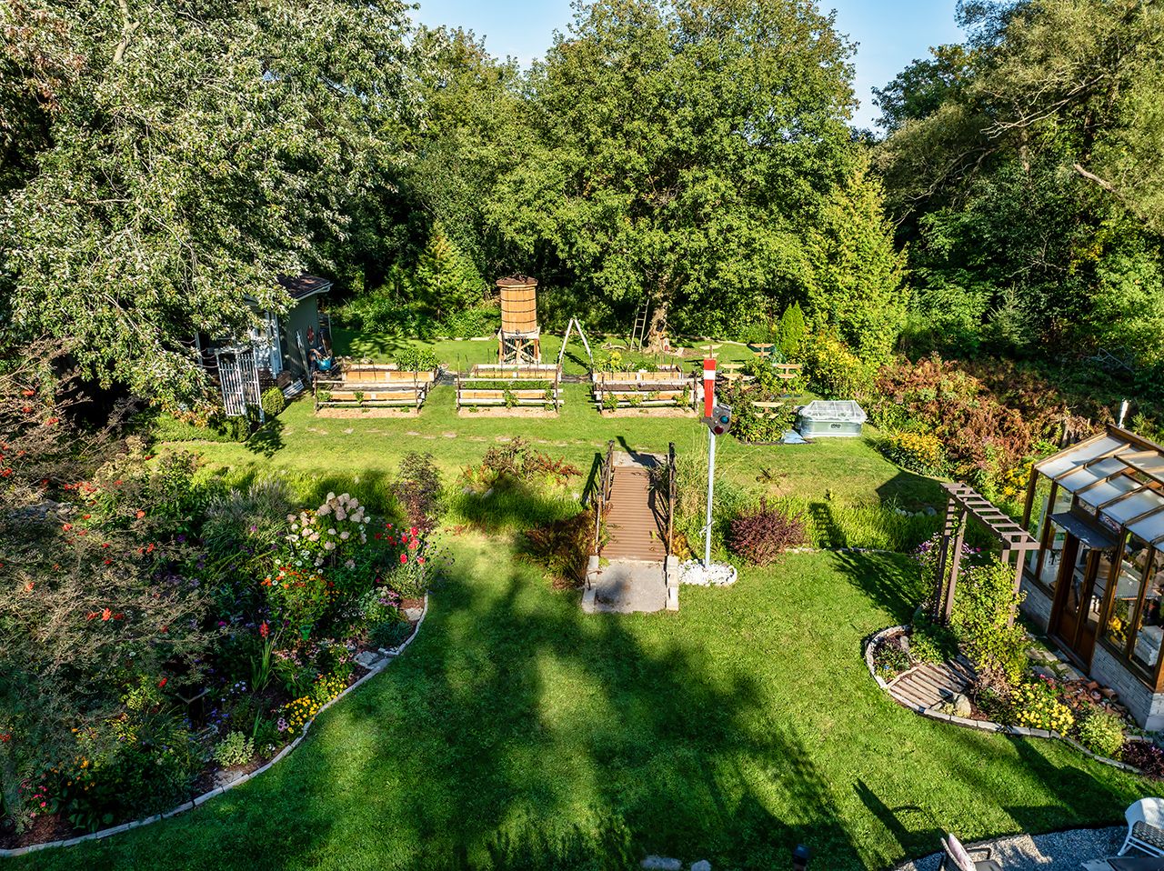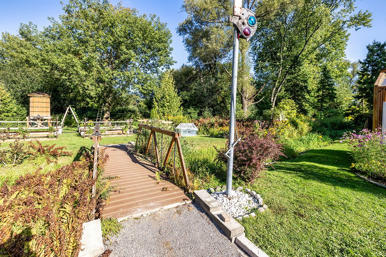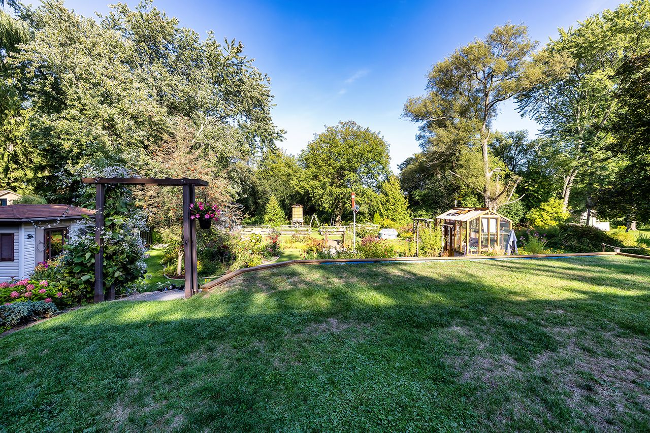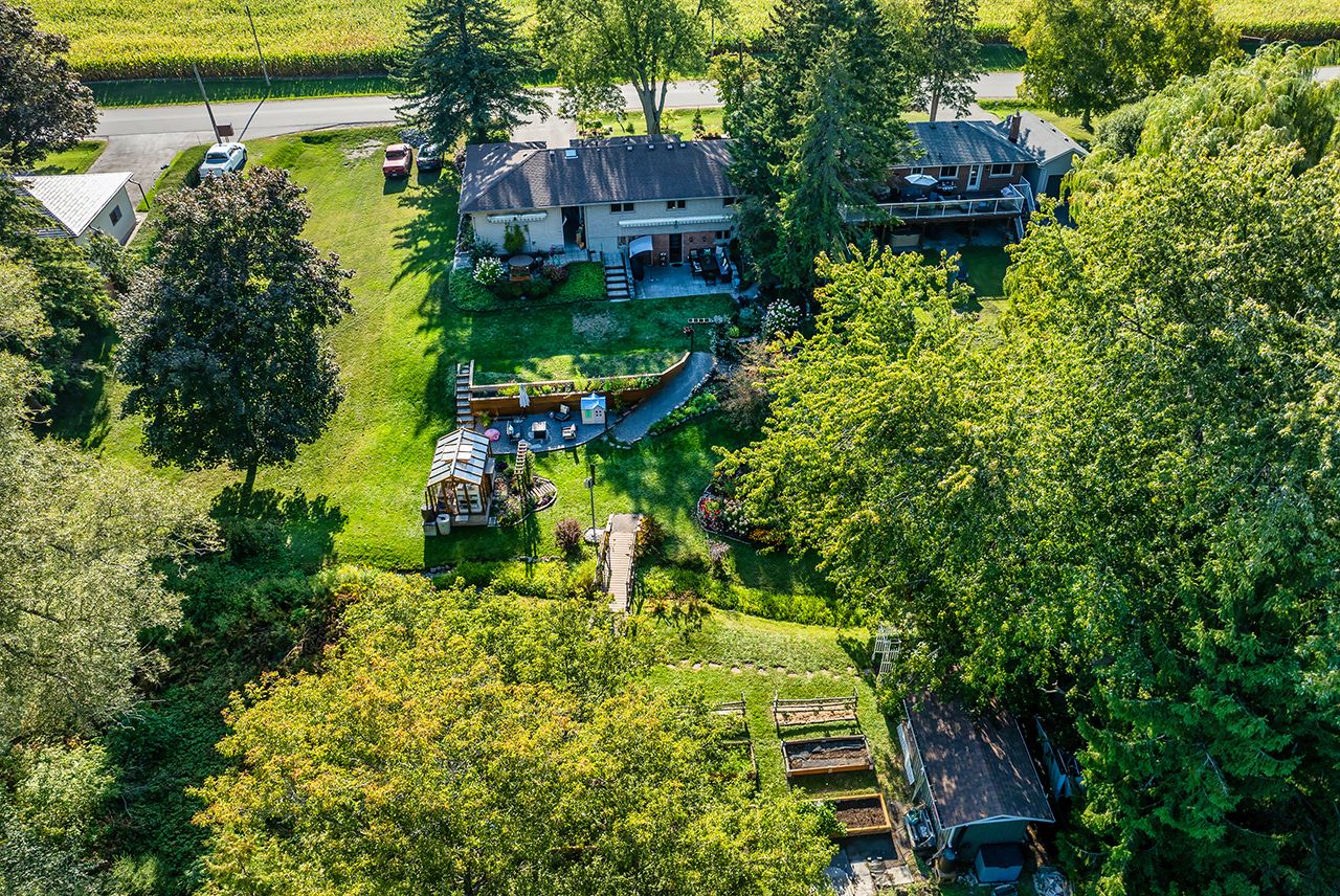 Welcome to this stunning country bungalow, a true retreat for nature lovers & garden enthusiasts alike. Nestled among mature trees & beautifully manicured perennial gardens, this home offers a rare blend of charm, functionality, & outdoor living at its finest. Step inside to an inviting living room, complete with a large bay window that fills the space with natural light, and electric fireplace. The heart of the home is the custom kitchen, showcasing stainless steel appliances, a double oven, double-drawer dishwasher, and a convenient breakfast bar. Custom cabinetry provides both style & storage, making this kitchen as practical as it is beautiful! The main floor features three spacious bedrooms, each with large windows & ample closet space. Halfway down the stairs you'll find one of the hardest-working spaces in the house, the laundry room. Equipped with heated floors & direct access to the oversized two-car garage, this room makes everyday tasks effortless. The garage itself is ideal for hobbyists or professionals alike, with a built-in workshop, storage, and access to both the front and back yards. Continue to the fully finished basement, where a versatile kitchenette with plenty of storage adds convenience and flexibility. Just off this area, a dedicated cold room provides the perfect space for canning, or garden harvest storage. The large recreation room features a gas fireplace and a walk-out to the backyard, seamlessly blending indoor and outdoor living. Step outside to experience a backyard oasis unlike any other. Meandering walkways guide you through perennial gardens, vegetable plots with their own water tower & irrigation systems, and tranquil water features including a seasonal stream create a peaceful atmosphere. A greenhouse provides year-round gardening opportunities, while an enchanting bunkie complete with a double bed offers a delightful retreat for guests! Private well, refurbished in 2011, provides reliable high-quality water.