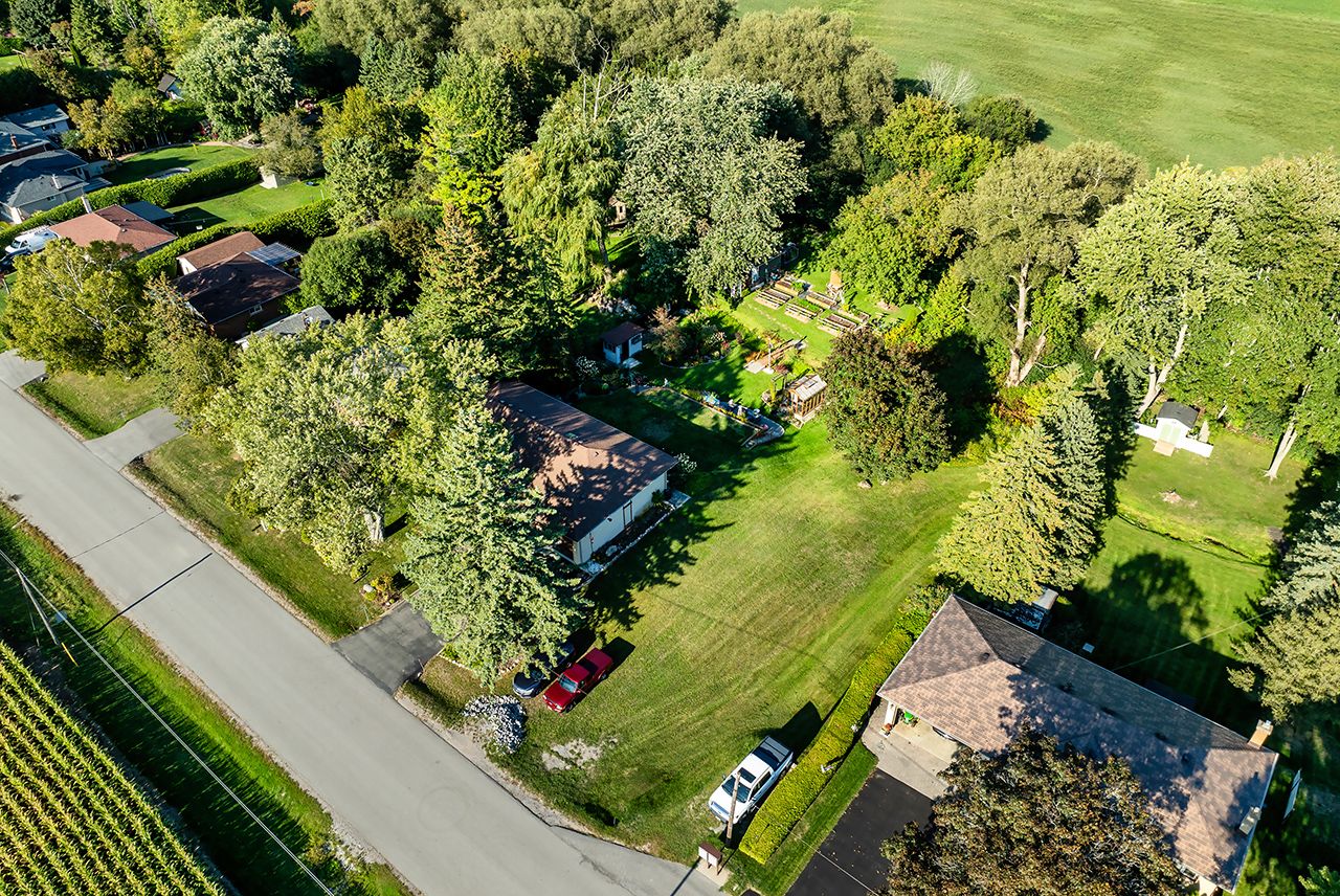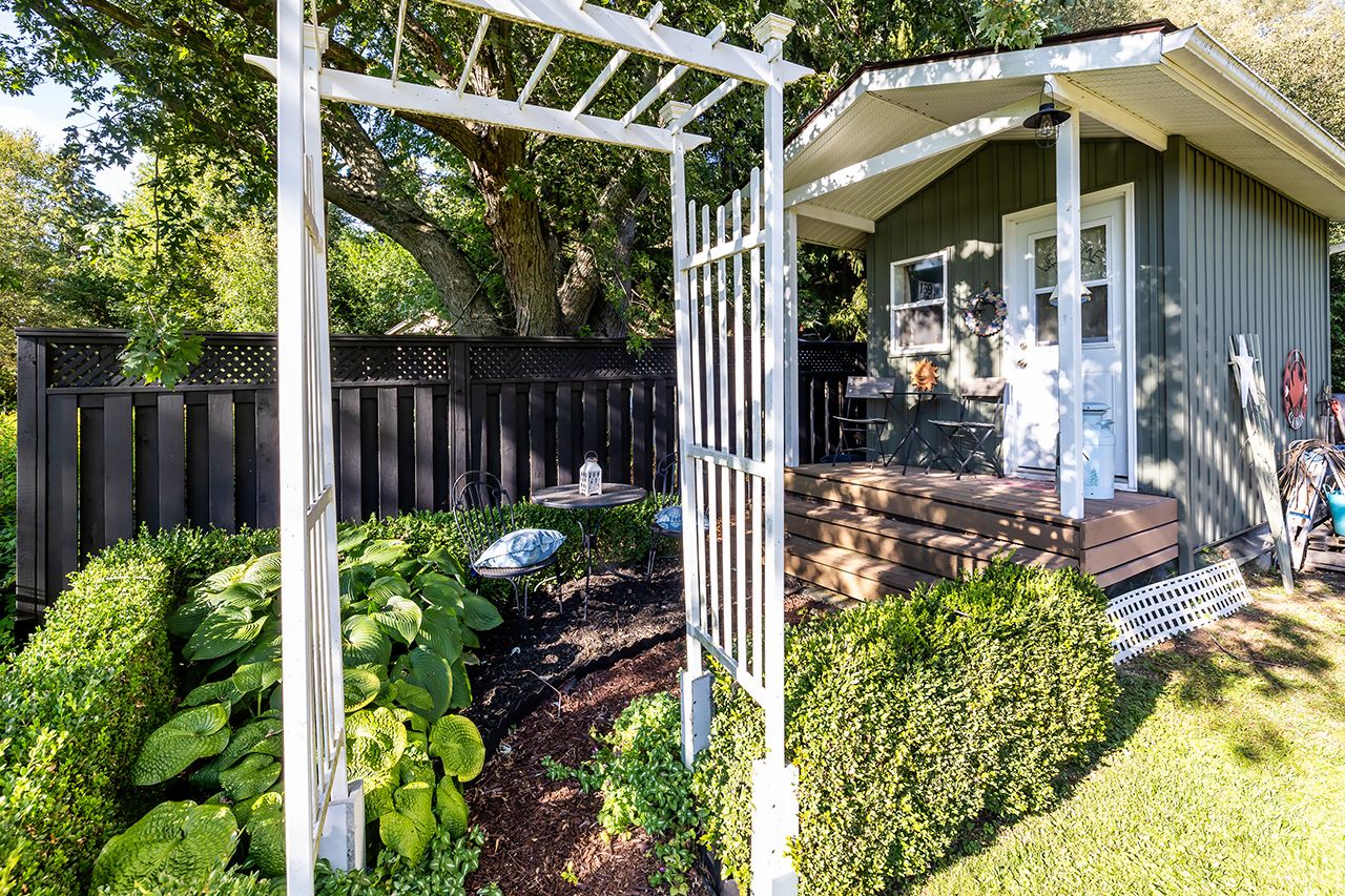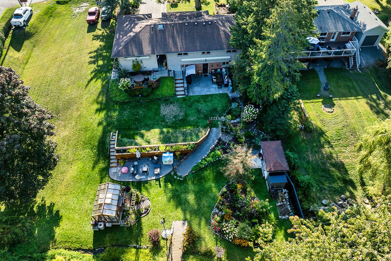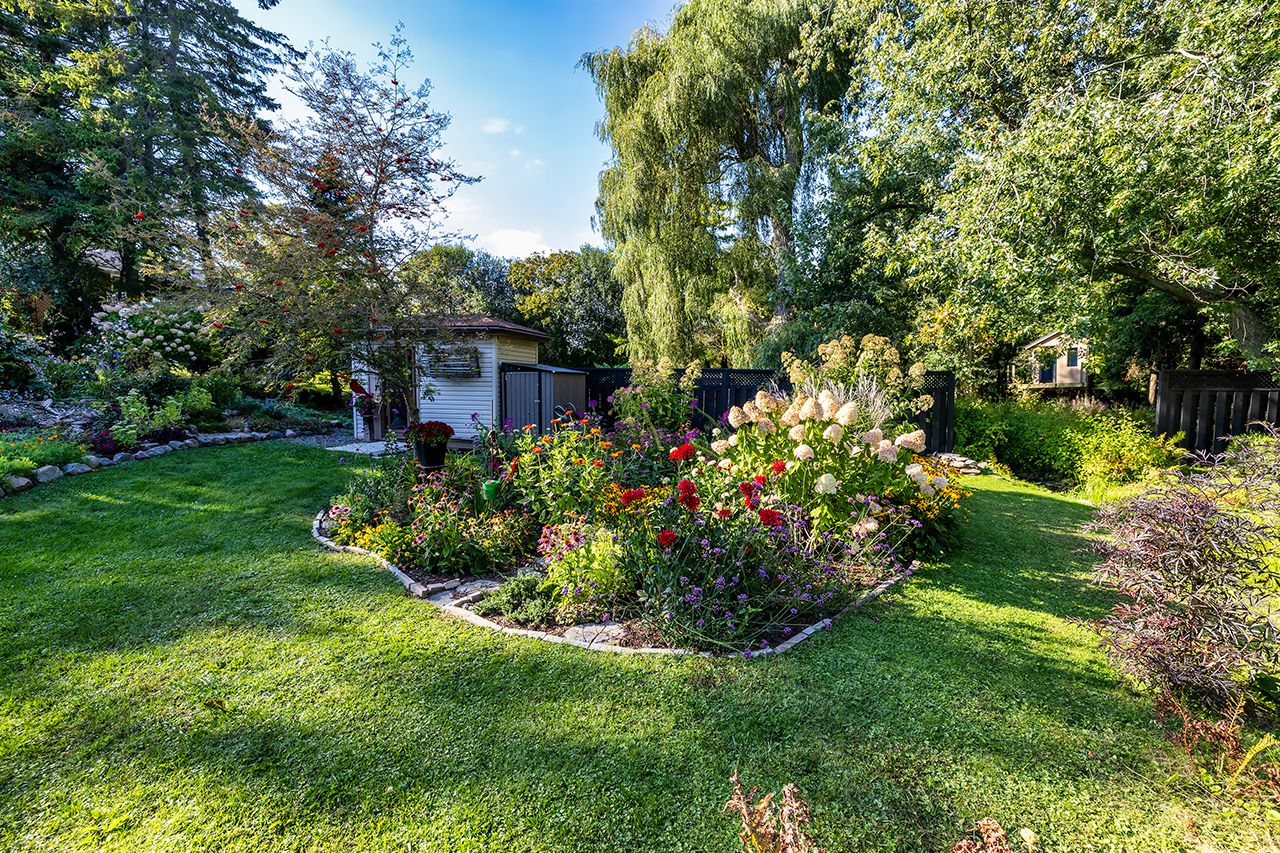 Welcome to this stunning country bungalow, a true retreat for nature lovers & garden enthusiasts alike. Nestled among mature trees & beautifully manicured perennial gardens, this home offers a rare blend of charm, functionality, & outdoor living at its finest. Step inside to an inviting living room, complete with a large bay window that fills the space with natural light, and electric fireplace. The heart of the home is the custom kitchen, showcasing stainless steel appliances, a double oven, double-drawer dishwasher, and a convenient breakfast bar. Custom cabinetry provides both style & storage, making this kitchen as practical as it is beautiful! The main floor features three spacious bedrooms, each with large windows & ample closet space. Halfway down the stairs you'll find one of the hardest-working spaces in the house, the laundry room. Equipped with heated floors & direct access to the oversized two-car garage, this room makes everyday tasks effortless. The garage itself is ideal for hobbyists or professionals alike, with a built-in workshop, storage, and access to both the front and back yards. Continue to the fully finished basement, where a versatile kitchenette with plenty of storage adds convenience and flexibility. Just off this area, a dedicated cold room provides the perfect space for canning, or garden harvest storage. The large recreation room features a gas fireplace and a walk-out to the backyard, seamlessly blending indoor and outdoor living. Step outside to experience a backyard oasis unlike any other. Meandering walkways guide you through perennial gardens, vegetable plots with their own water tower & irrigation systems, and tranquil water features including a seasonal stream create a peaceful atmosphere. A greenhouse provides year-round gardening opportunities, while an enchanting bunkie complete with a double bed offers a delightful retreat for guests! Private well, refurbished in 2011, provides reliable high-quality water.