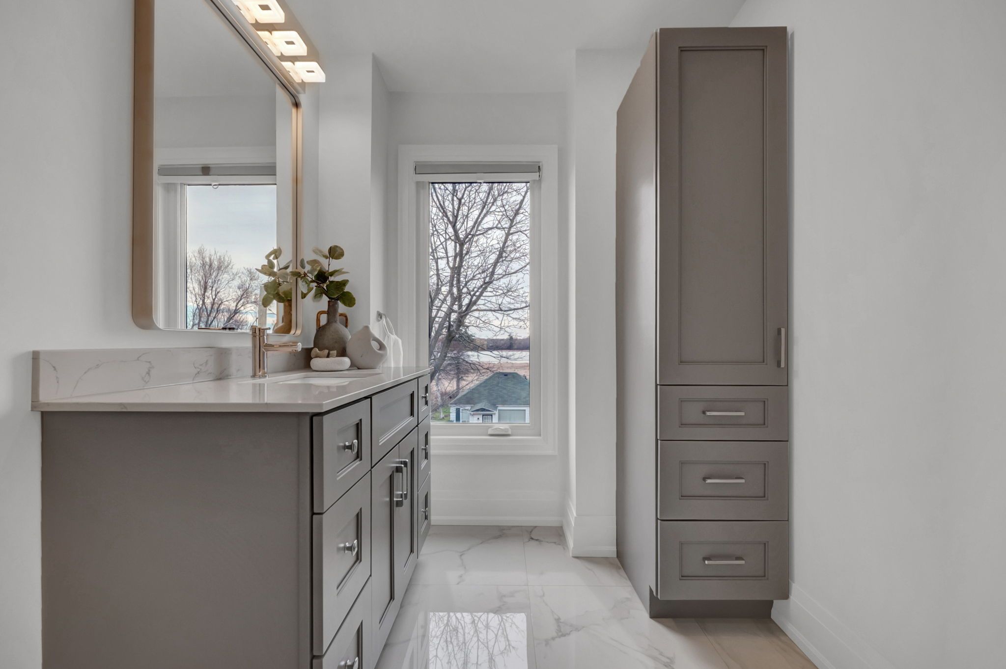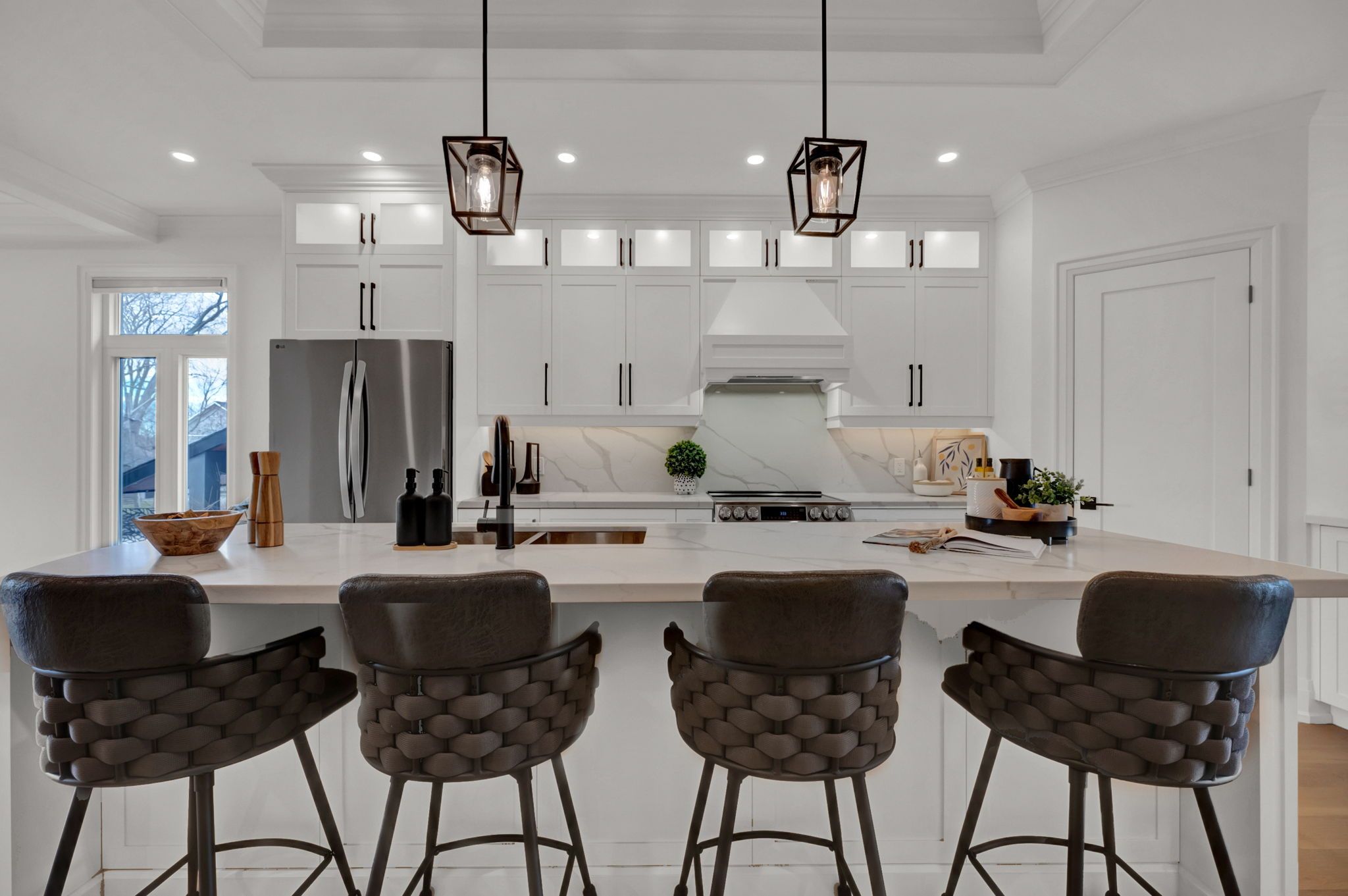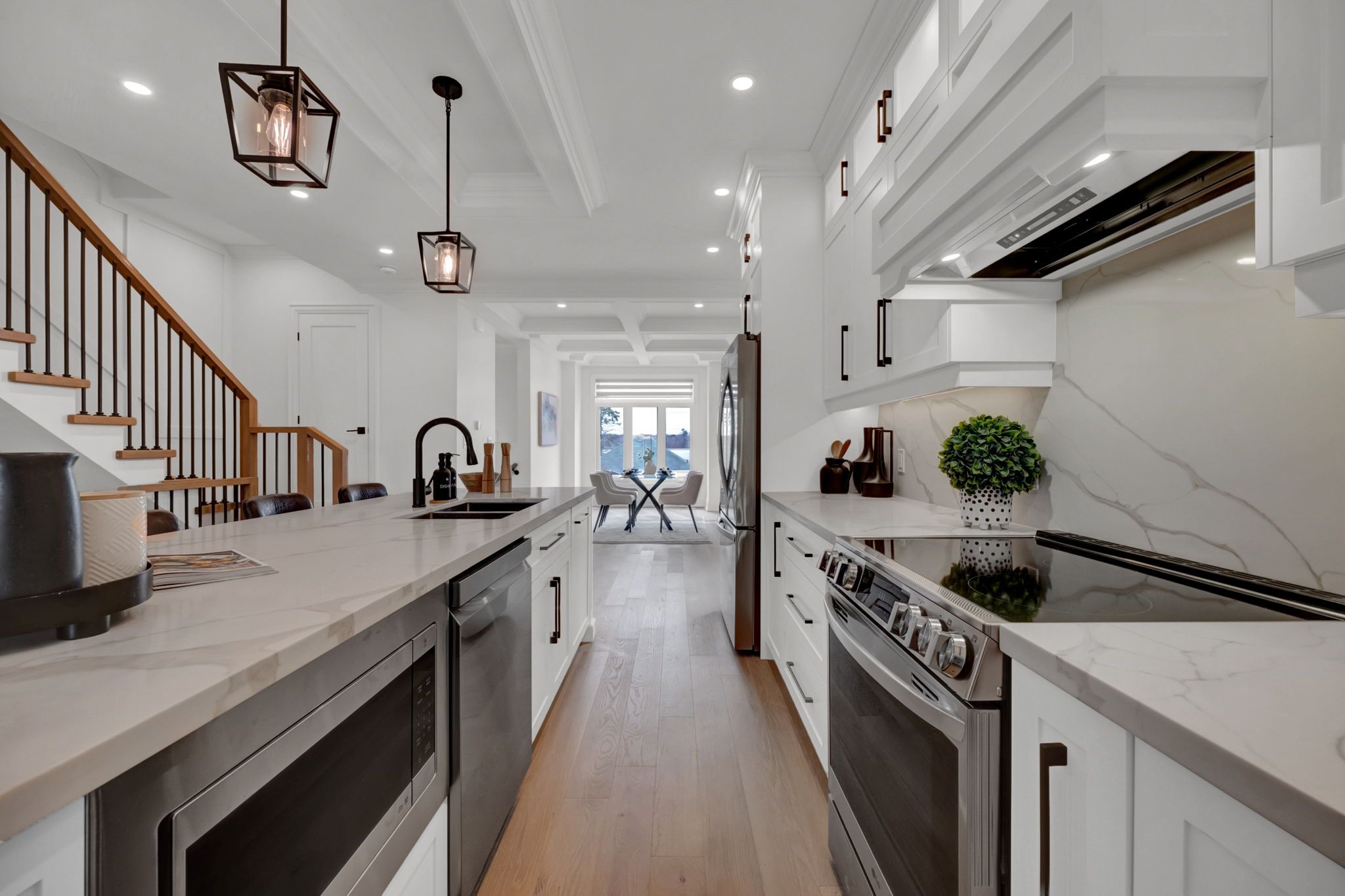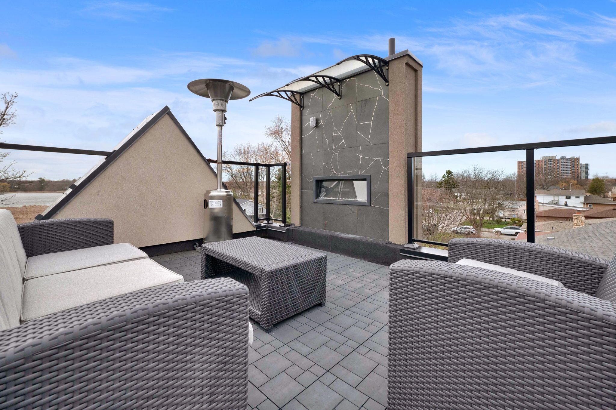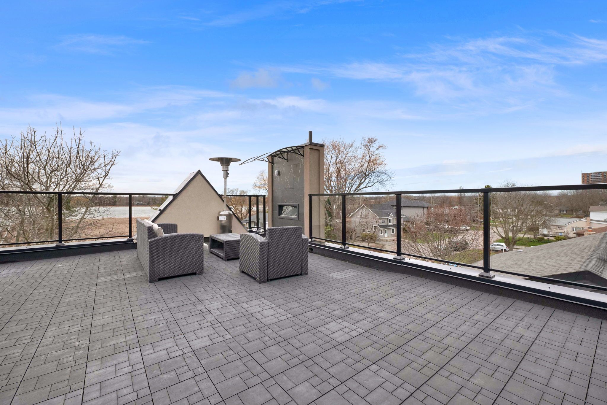With stunning views of Frenchman's Bay, this rarely offered 3-storey modern, custom-built detached home with 4-stop ELEVATOR is thoughtfully designed for multigenerational living! A dramatic main foyer with 13-ft ceilings sets the tone, leading into an elegant dining area with lake views and a cozy gas fireplace. The open concept main floor is designed for entertaining, featuring white oak hardwood flooring and coffered ceilings throughout! At the heart of the home, the chef-inspired kitchen showcases quartz countertops, custom cabinetry, a centre island with seating for four, an additional prep sink, beverage fridge, and two extra bar seating areas, along with valance lighting and a walk-in pantry! Double sliding glass patio doors create a seamless transition to the backyard deck, blending indoor and outdoor living! The primary suite is a private retreat with vaulted ceilings, a gas fireplace, and a spa-like 5-piece ensuite complete with a freestanding soaker tub, glass-enclosed shower, and heated floors. Take in breathtaking sunset views from the approx. 450 sq ft rooftop terrace, featuring a Napoleon electric fireplace, canopy-covered outdoor TV area, and gas line for BBQs, perfect for elevated entertaining. The lower level offers exceptional versatility with a full 4-piece bathroom and a flexible space ideal as a fourth bedroom, gym, office, or additional living area, with walkout access to the backyard. Located just steps from the waterfront, enjoy the best of the neighbourhood including shops and dining, Nautical Village, Beachfront Park, Millennium Square, Pickering GO Station, Pickering Town Centre, and easy access to Highway 401.