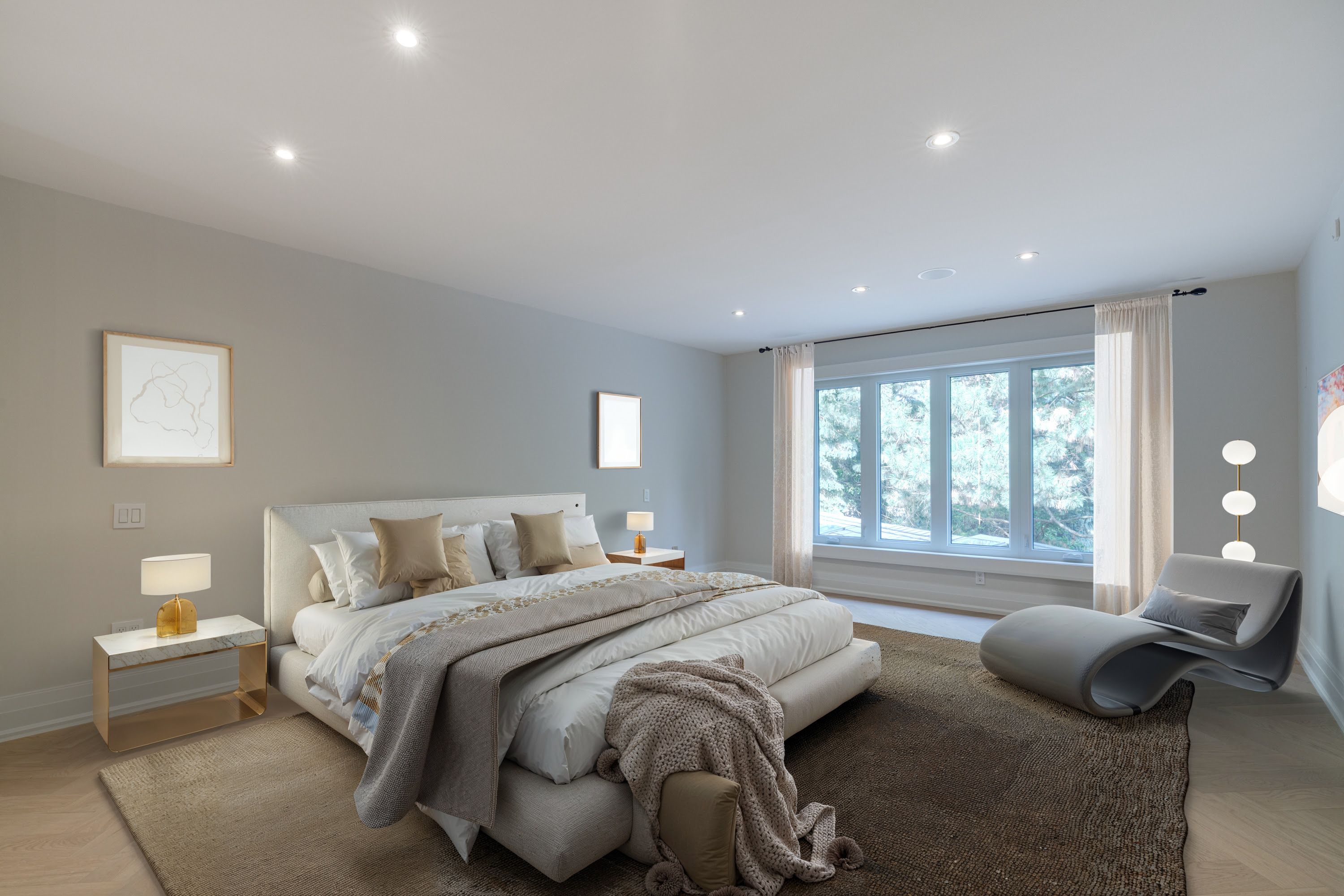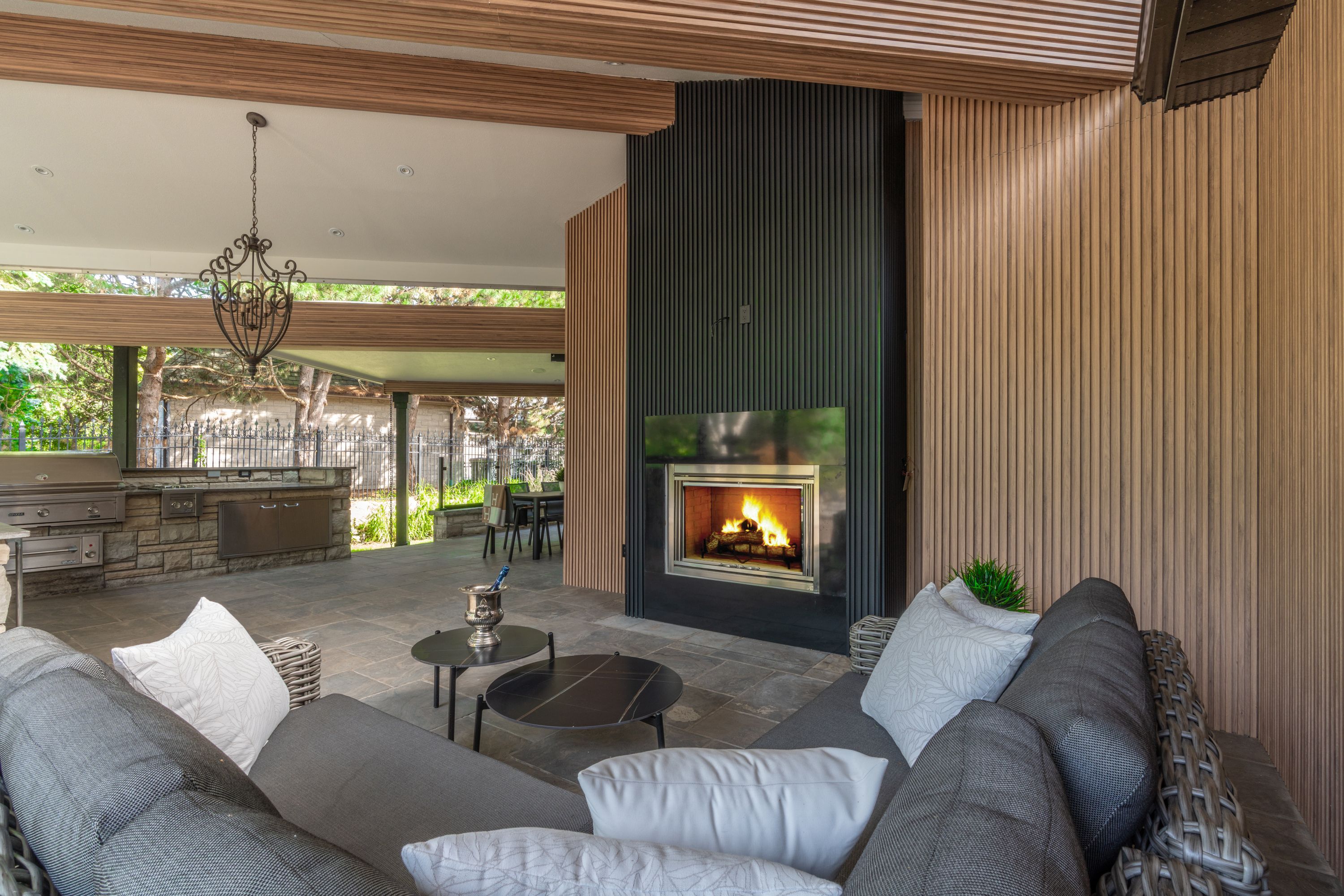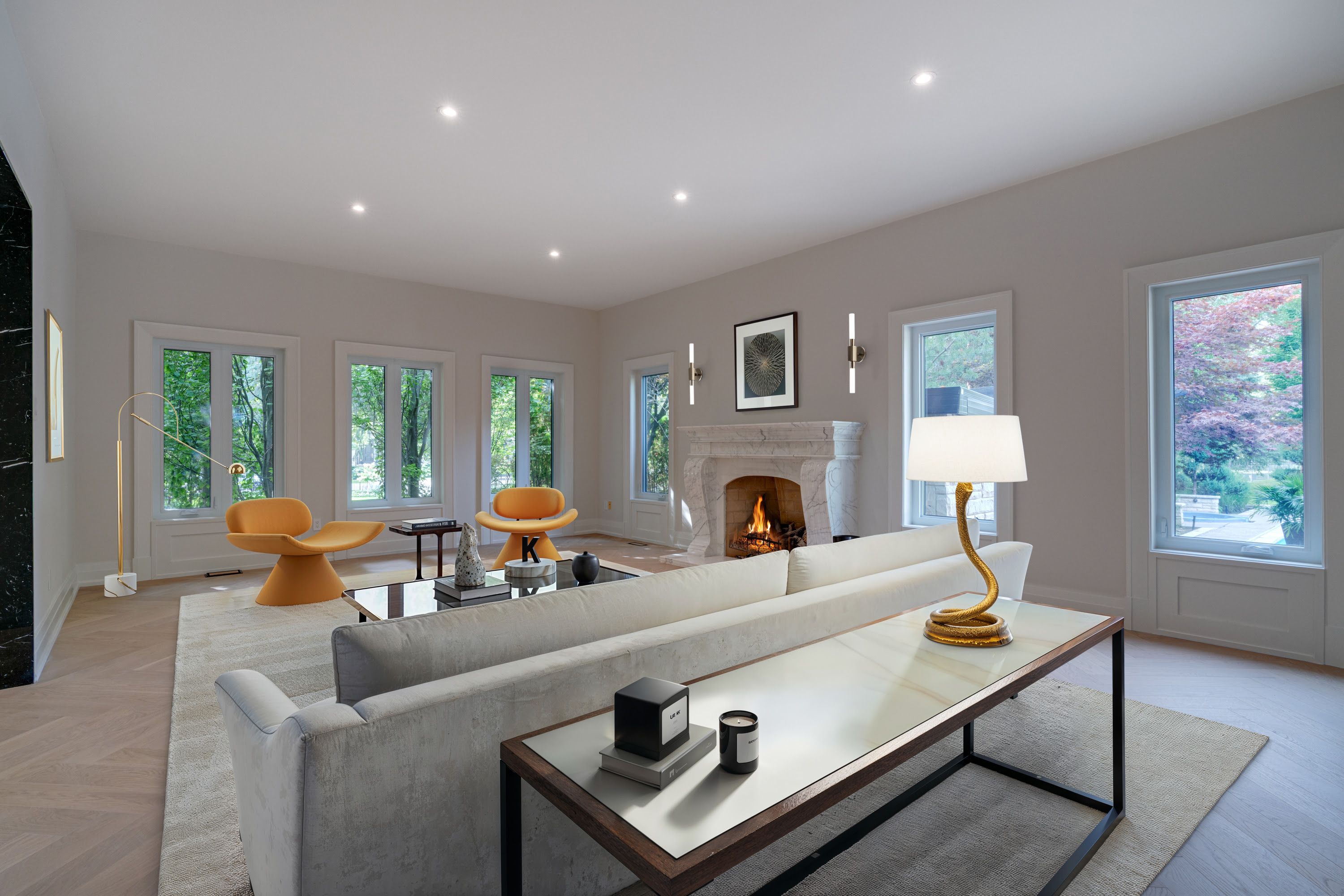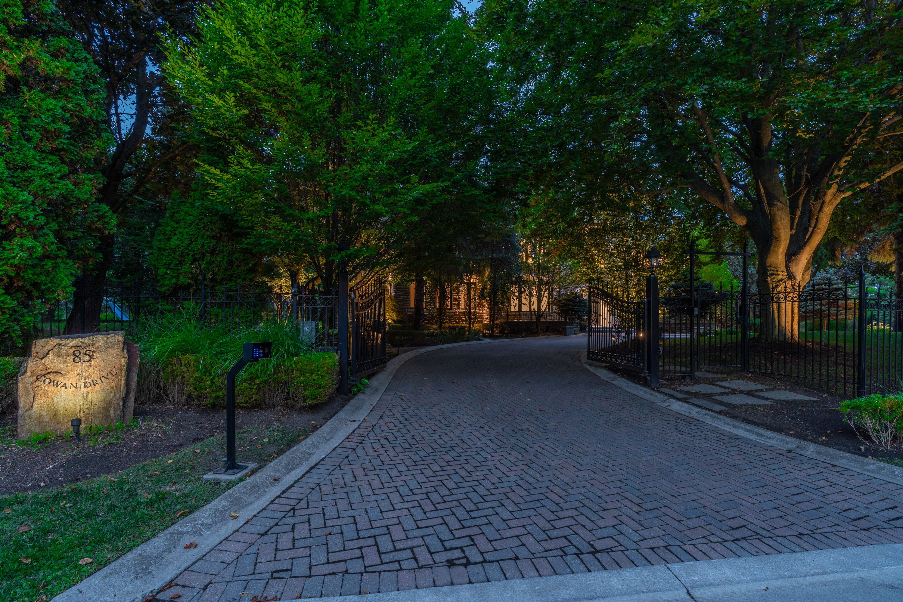 Fully renovated, this 5+1-bedroom, 8-bathroom transitional estate backs onto holes 6 and 7 of the prestigious National Golf Course in Woodbridge. Set on a private 1+ acre lot with dual-gated entrances, intricate stonework, professional landscape lighting, mature trees, and striking black glass doors at both the entrance and garages, the property blends quiet elegance with secure living. Inside, refined craftsmanship is showcased through slab stone finishes, marble fireplaces, and a grand reception entrance with a 3-storey floating staircase. The residence offers: A primary suite with a Fendi Casa inspired walk-in closet and spa-like bath, ensuite baths and built-in closets in every upper-level bedroom; 3+1 kitchens and 2 laundry rooms for ultimate convenience; a wellness area with heated floors, change room, powder room and contemporary spa-shower plus direct pool access. Media and games rooms, sauna, home gym (or nanny's suite), and a dedicated space for a customized panic room. The resort-style backyard is designed for entertaining with an inground pool, covered loggia with outdoor kitchen and fireplace, dining and seating areas, and open, park-like grounds perfect for growing an organic vegetable garden or children's play. Parking for 15 vehicles includes a 3-car garage with lift-ready capacity. Move-in ready before Christmas, this estate combines contemporary luxury, privacy, and security - perfect for the discerning buyer. *Some pictures are virtually furnished.