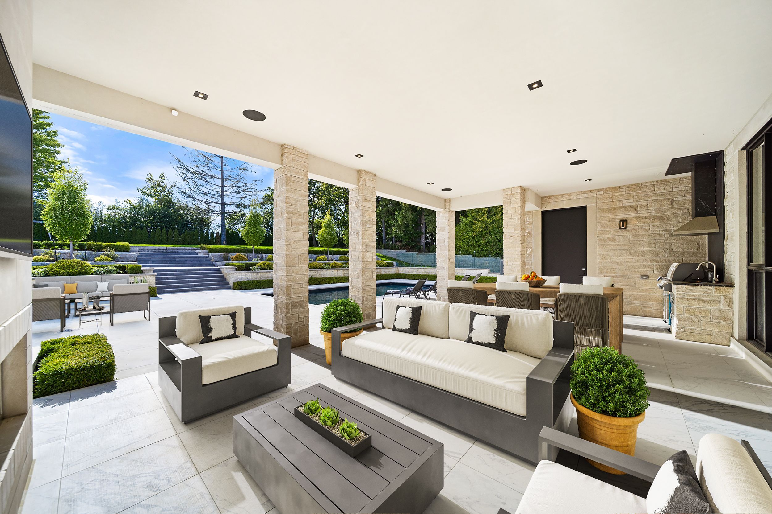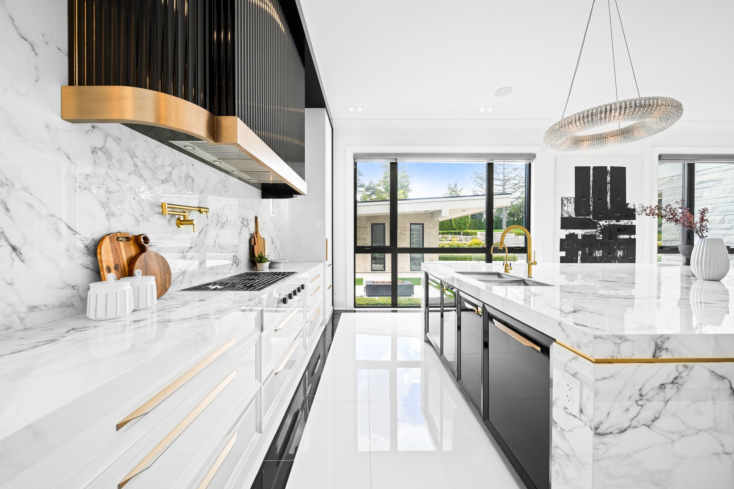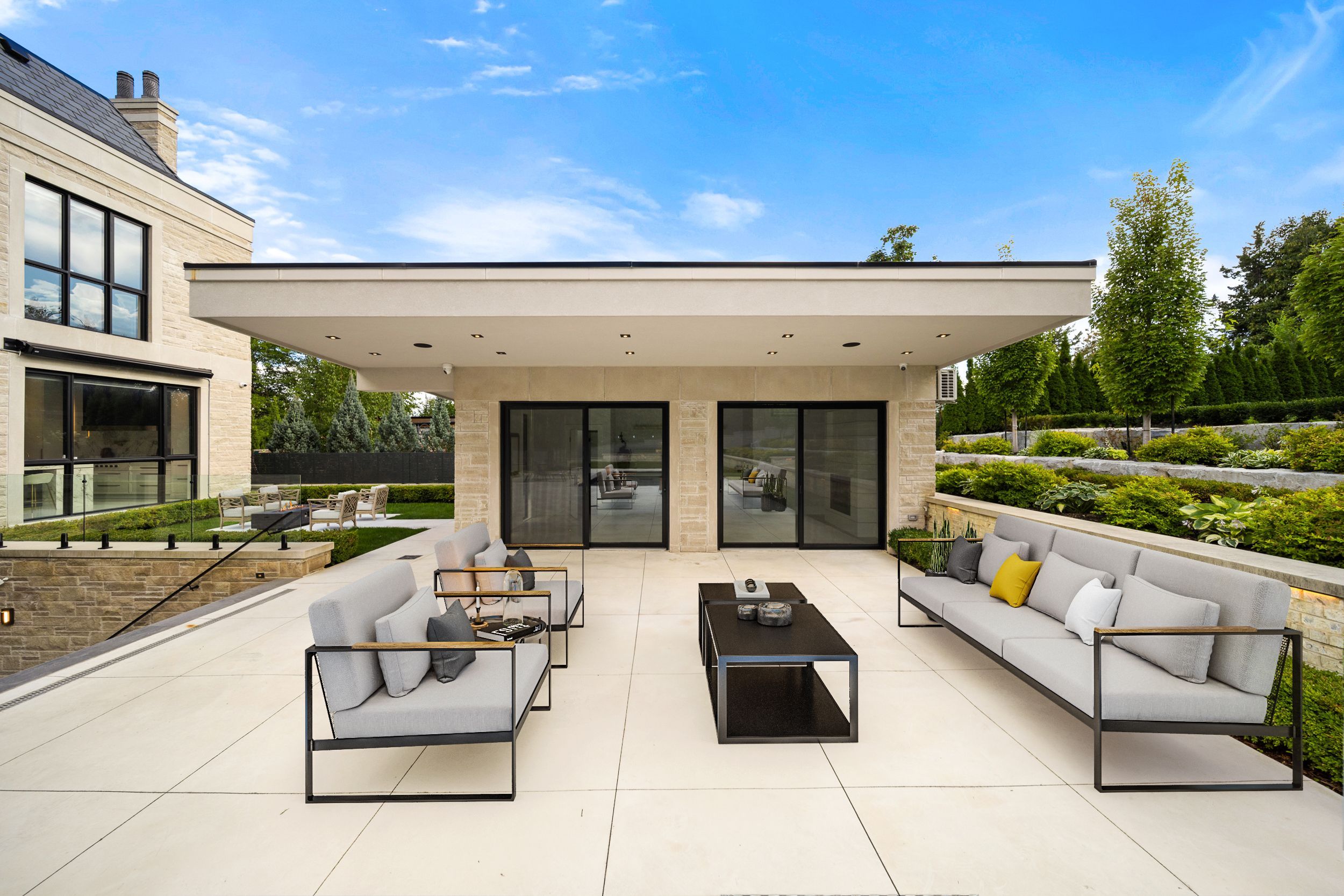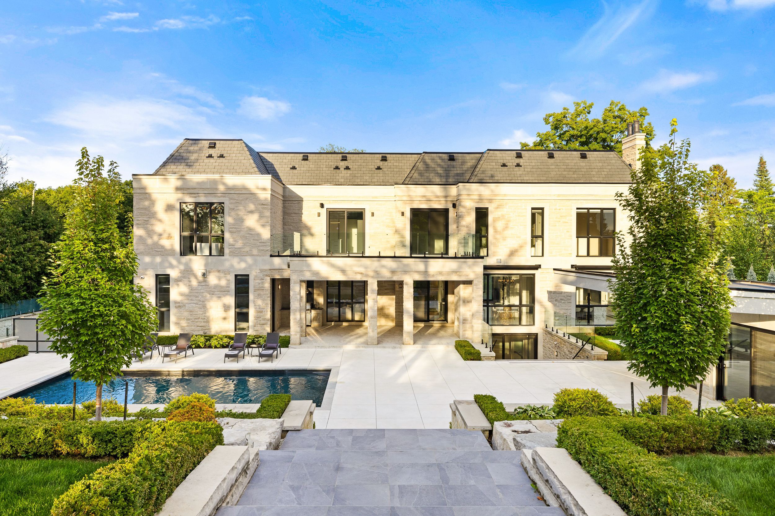 Welcome to this breathtaking French chateau-inspired residence in the heart of Woodbridge, where timeless European elegance meets modern luxury. Set on a landscaped lot, this approx. 10,000 sq ft of living space limestone masterpiece was crafted by Stonebrooke Homes in collaboration with designer Marin Zabzuni featured in Living Luxe and Dolce Magazine. His signature style blends refined luxury with the warmth of transitional design, inspired by the worlds most iconic five-star hotels. Inside, oversized windows and skylights flood the home with natural light, highlighting architectural millwork, polished Ciot stone finishes, suede accents, and 7 chevron white oak floors. Upstairs, four ensuite bedrooms include a stunning primary retreat with spa bath, Aquabrass fixtures, and a private 1,000 sq ft terrace overlooking the backyard oasis. A guest or nanny suite awaits on the lower level. Radiant heated floors span the entire lower level and all bathrooms. At the heart of the home is an Art Deco inspired chefs kitchen with oversized fluted hood, Miele/SubZero appliances, and striking focal point. Smartly connected through Control4, enjoy intuitive control of lighting, audio, TVs, security, cameras, and access gates. A private elevator links all levels. Designed for entertaining, the residence offers a dramatic glass wine display, LED-lit cellar, full theatre with 120 screen, wellness gym with steam room, and a lower-level kitchenette with pantry. Outdoors, a 16x32 saltwater pool, cabana with wet bar and bath, outdoor kitchen with BBQ, firepit lounge, and lush gardens create a private resort. Heated terraces, walkways, porches, and stairs provide year-round comfort. Additional features include a snowmelt driveway, four-car epoxy garage with lift-ready height, dual laundry rooms, walk-in safe room, and automated blinds and awnings.