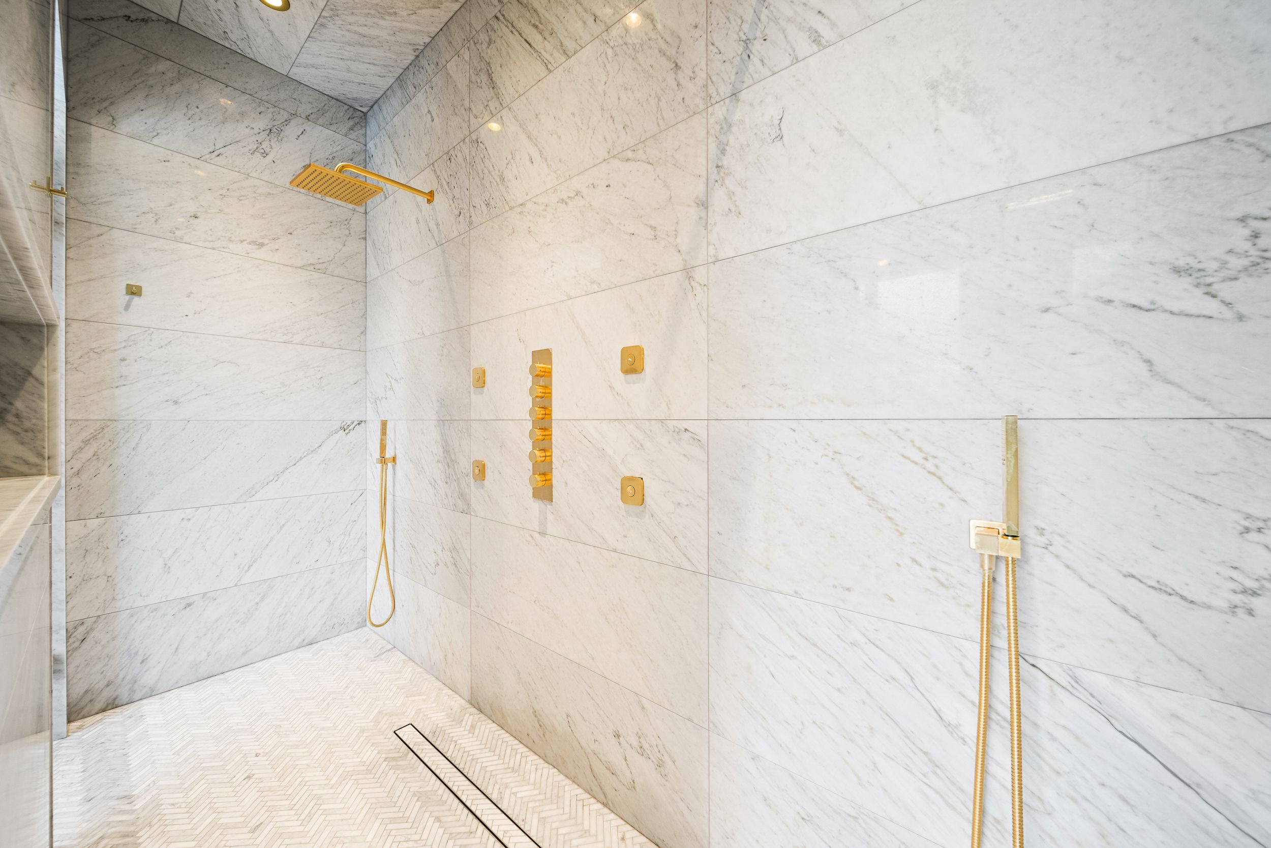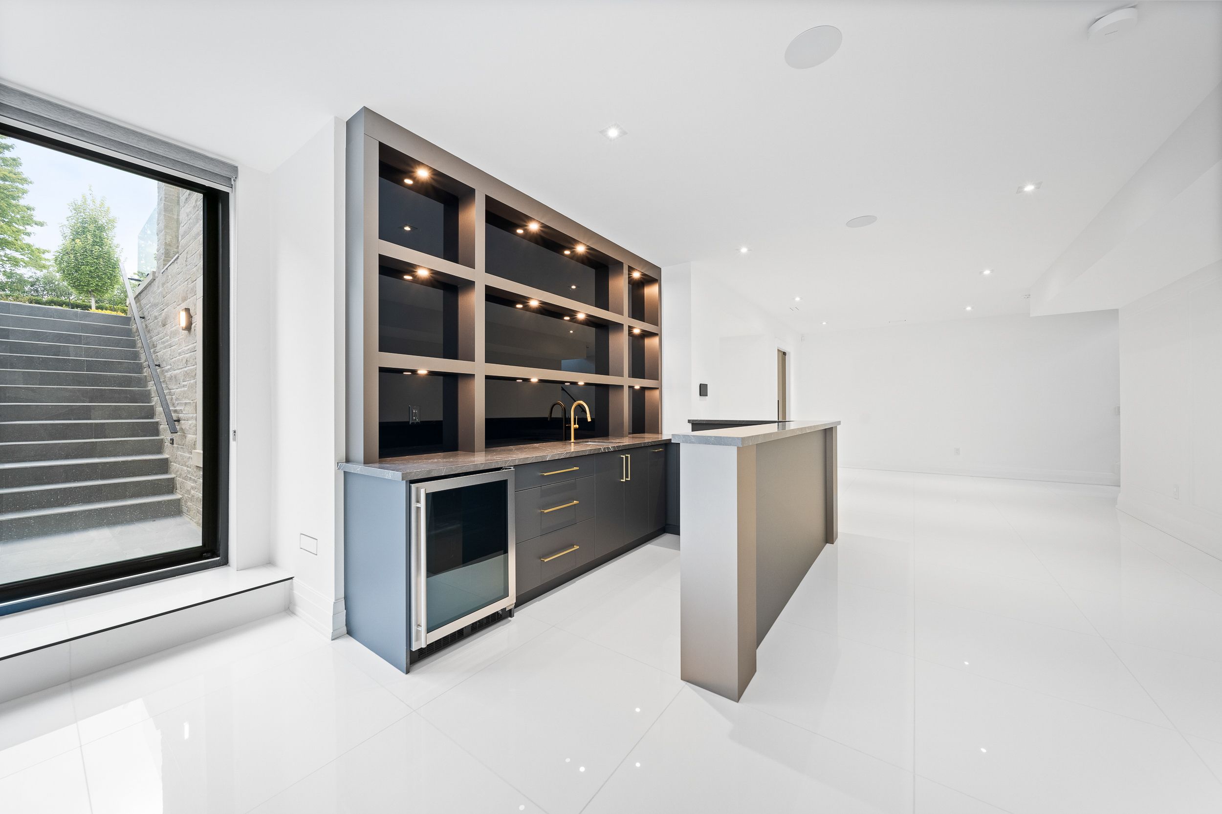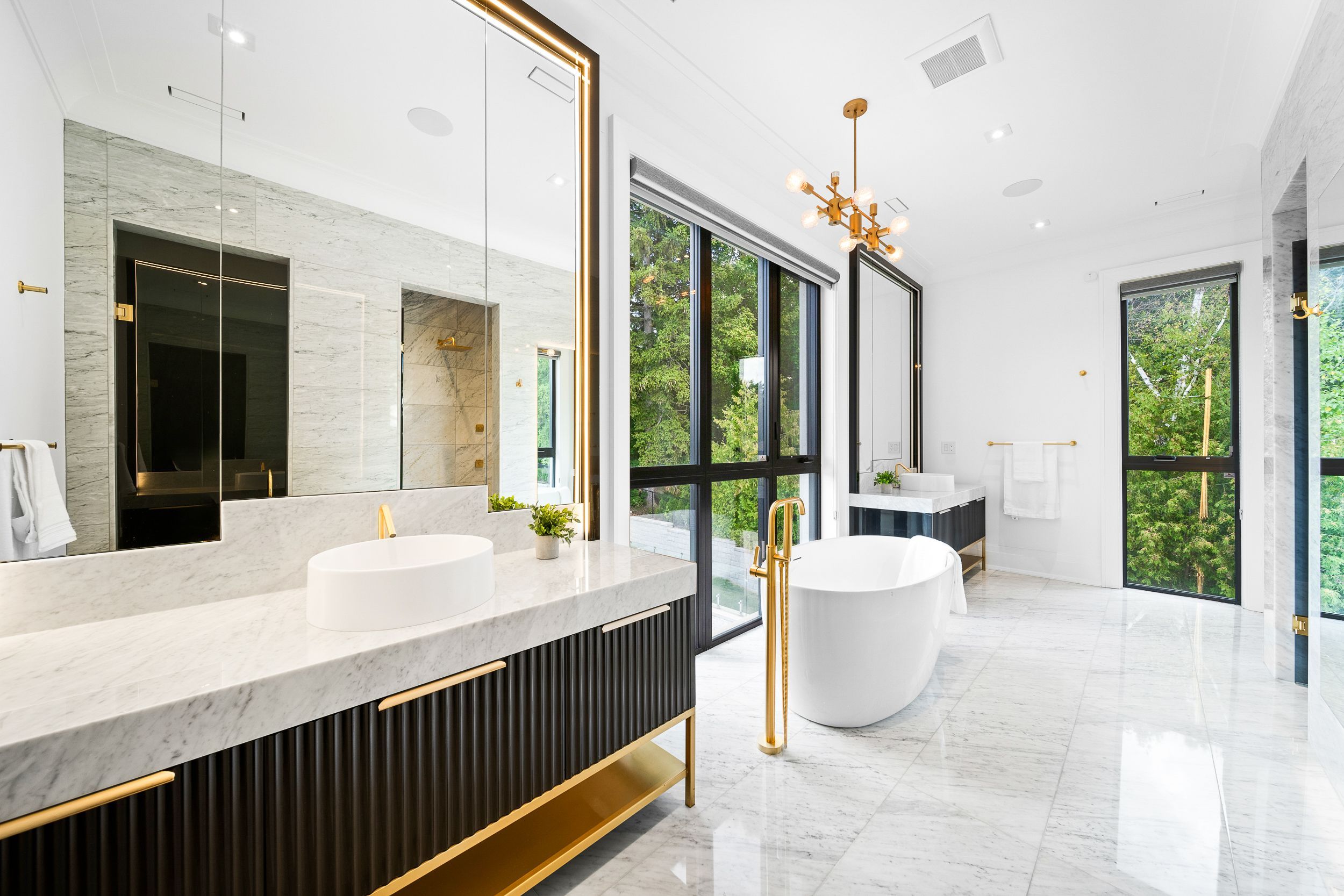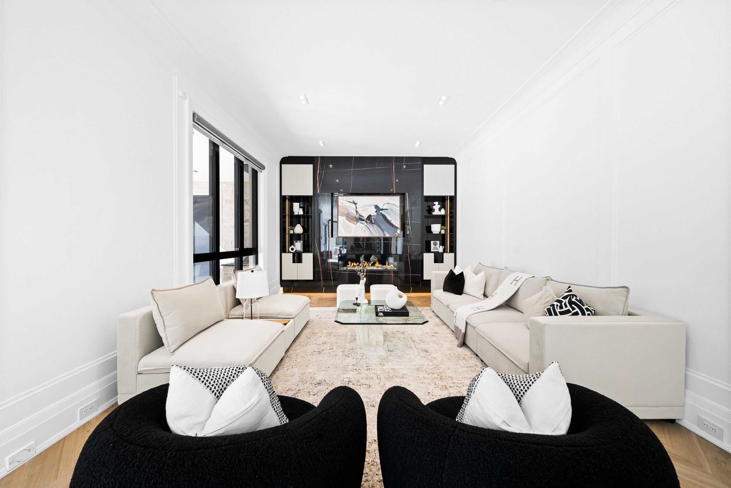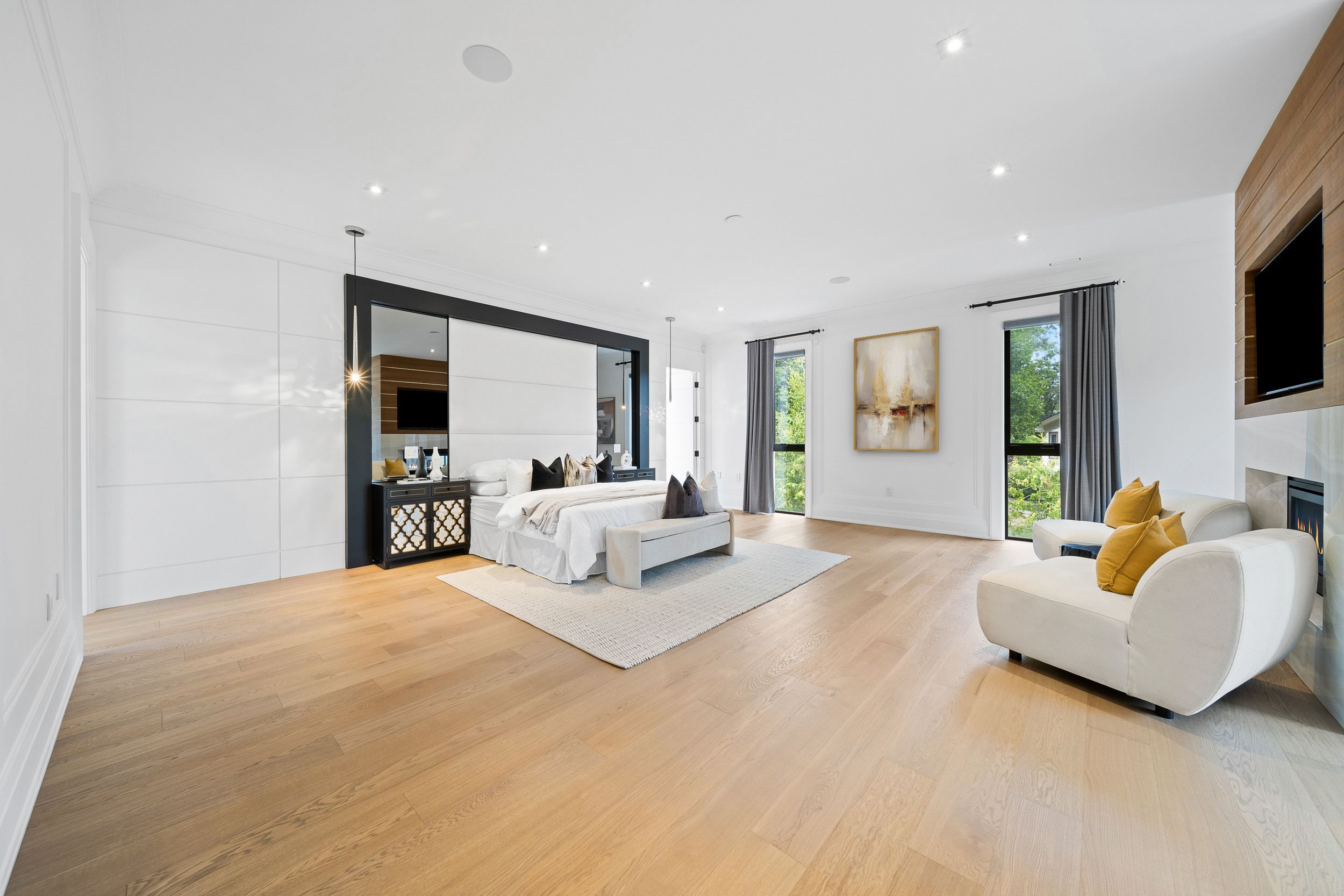Welcome to this breathtaking French chateau-inspired residence in the heart of Woodbridge, where timeless European elegance meets modern luxury. Set on a landscaped lot, this approx. 10,000 sq ft of living space limestone masterpiece was crafted by Stonebrooke Homes in collaboration with designer Marin Zabzuni featured in Living Luxe and Dolce Magazine. His signature style blends refined luxury with the warmth of transitional design, inspired by the worlds most iconic five-star hotels. Inside, oversized windows and skylights flood the home with natural light, highlighting architectural millwork, polished Ciot stone finishes, suede accents, and 7 chevron white oak floors. Upstairs, four ensuite bedrooms include a stunning primary retreat with spa bath, Aquabrass fixtures, and a private 1,000 sq ft terrace overlooking the backyard oasis. A guest or nanny suite awaits on the lower level. Radiant heated floors span the entire lower level and all bathrooms. At the heart of the home is an Art Deco inspired chefs kitchen with oversized fluted hood, Miele/SubZero appliances, and striking focal point. Smartly connected through Control4, enjoy intuitive control of lighting, audio, TVs, security, cameras, and access gates. A private elevator links all levels. Designed for entertaining, the residence offers a dramatic glass wine display, LED-lit cellar, full theatre with 120 screen, wellness gym with steam room, and a lower-level kitchenette with pantry. Outdoors, a 16x32 saltwater pool, cabana with wet bar and bath, outdoor kitchen with BBQ, firepit lounge, and lush gardens create a private resort. Heated terraces, walkways, porches, and stairs provide year-round comfort. Additional features include a snowmelt driveway, four-car epoxy garage with lift-ready height, dual laundry rooms, walk-in safe room, and automated blinds and awnings.