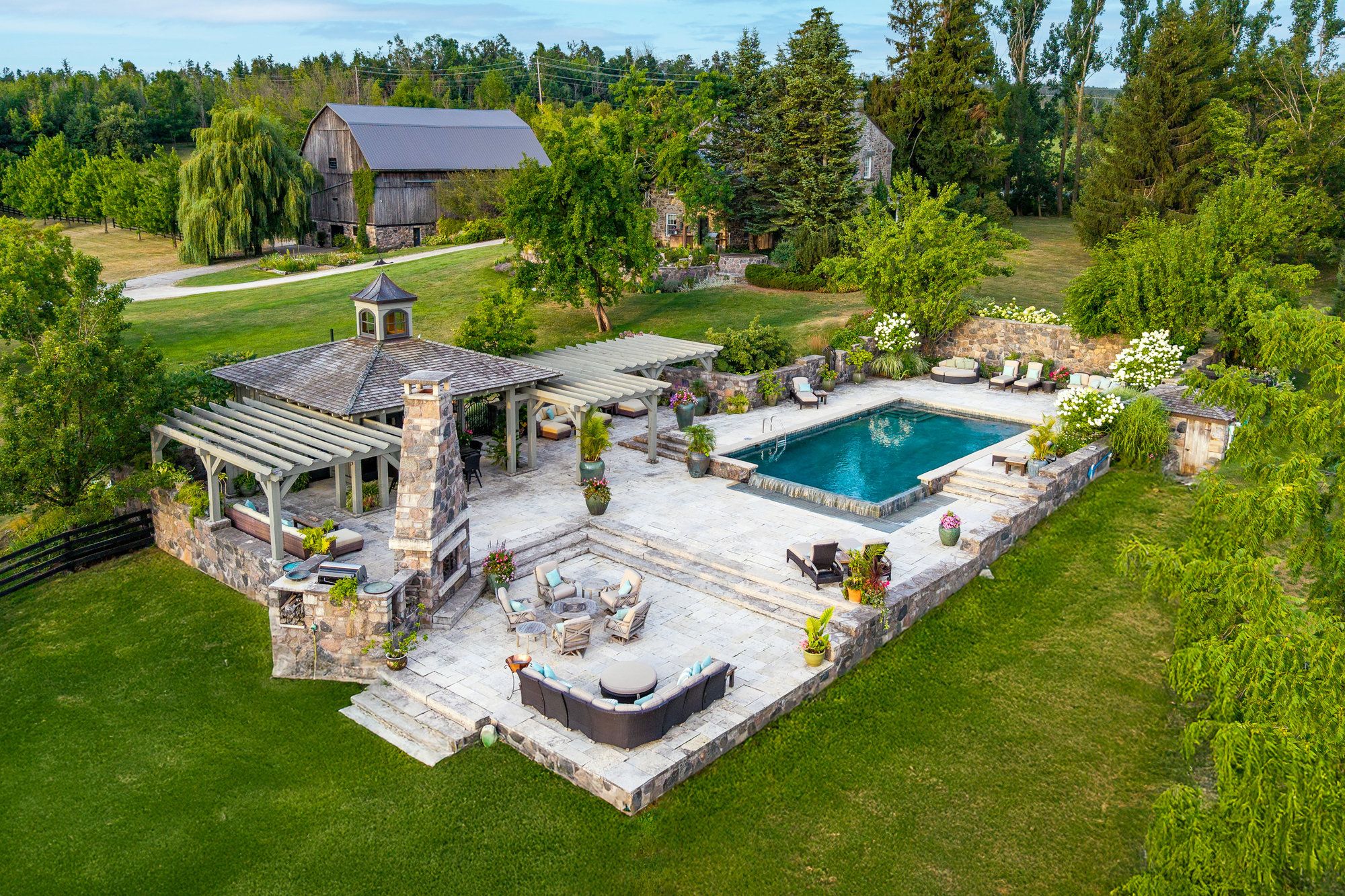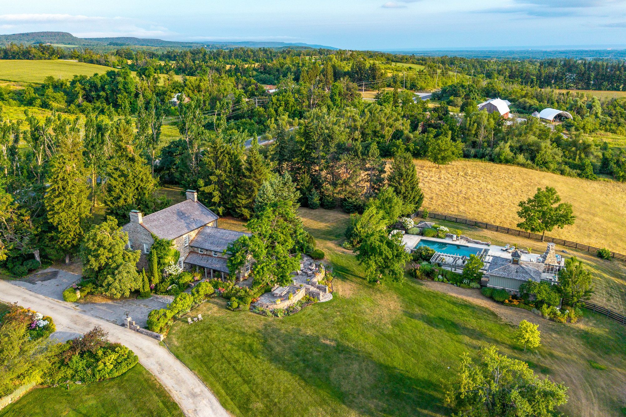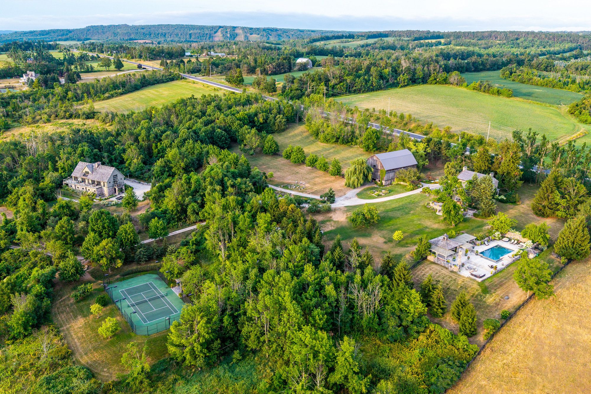 TALLY HO! A LANDMARK ESTATE RICH IN HISTORY - Once a bustling stagecoach stop in the 1850s, Tally Ho has evolved over the past 30 years into one of the most Breathtaking Estates in the Georgian Triangle. As one of the oldest homes in the region, it blends rich history with modern elegance often leaving visitors saying, 'This is my favourite home!' An Outdoor Oasis: Set on 106 rolling acres -the stunning resort-style pool with sweeping panoramic views evokes the glamour of the South of France. A remarkable 9-car garage with a kitchenette, bedroom/office and powder room has already been approved to accommodate 4 additional bedrooms and 2 bathrooms. This versatile space offers endless opportunities for hosting guests or accommodating extended family. Equestrian enthusiasts will be impressed by the State-of-the-Art Stables designed with the highest standards of care and functionality. The 7 stalls feature a Tack Room, Horse Shower, Automatic Water Feeders, premium 'Stable Comfort' flooring system and a beautiful Paddock.The expansive barn, painstakingly reinforced by Mennonite Craftsmen, provides ample space for equipment and storage, blending heritage craftsmanship with modern utility. Recreational amenities abound, including sweeping gardens and trails, a tennis and basketball court, and professionally designed greenhouse for year-round gardening and seasonal plant storage. Just minutes away from Devils Glen Ski Club, Georgian Bay and the Mad River Golf Club. Whether you are seeking a luxurious rural retreat, a working equestrian facility or a rare piece of Ontario's living history - Tally Ho offers it all.