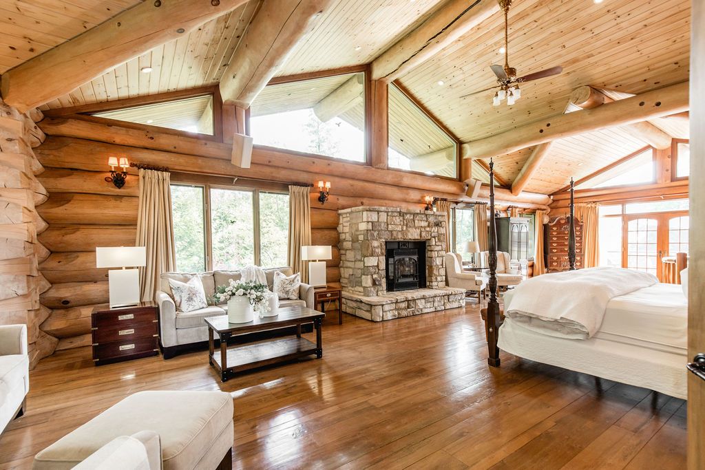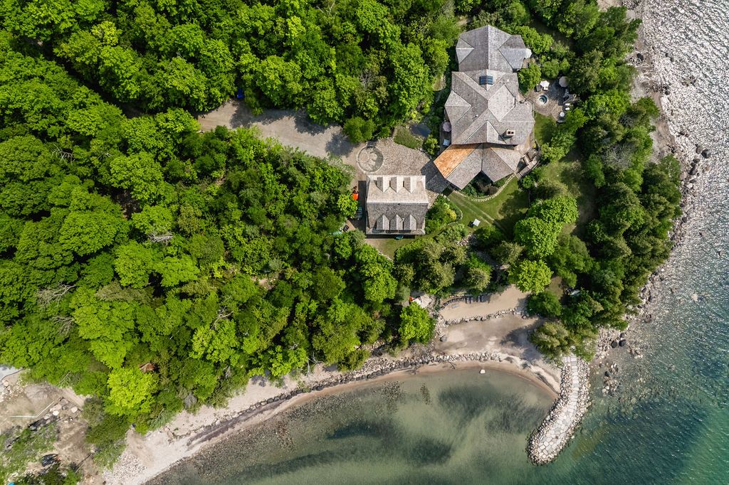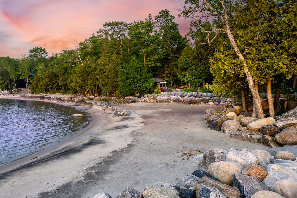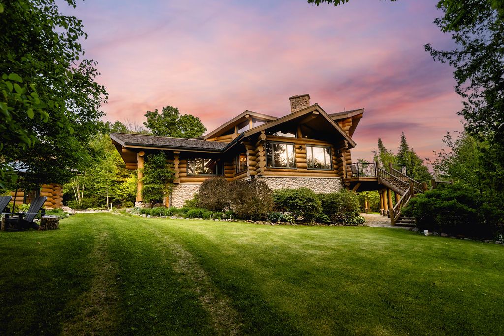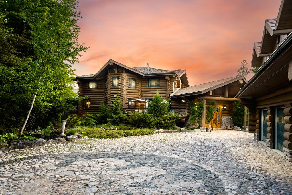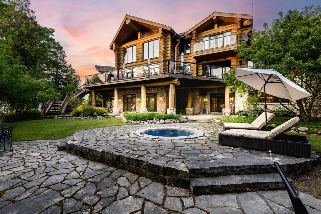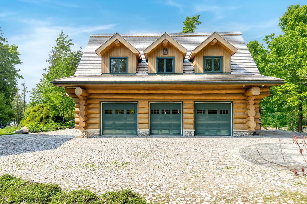 Welcome to one of Canada's most iconic luxury log homes, a rare Georgian Bay waterfront estate often described as the "Yellowstone of the North." Located at the very tip of Cedar Point on Georgian Bay, this one-of-a-kind waterfront mansion offers exceptional privacy, panoramic bay views & an irreplaceable point-of-land setting.Built in 2002 as a private resort-style retreat, this custom log estate sits on 4.37 acres with 412+ ft of shoreline, featuring both sandy & pebble beaches, a 90ft stone pier & an 80ft seasonal dock - ideal for boating, swimming & luxury waterfront living. With approximately 14,000 sq ft of living space, the home showcases master craftsmanship, soaring vaulted ceilings, exposed timber construction & uninterrupted water views from nearly every room.The main residence offers 8 bedrooms & 8 bathrooms, plus separate guest or staff quarters w/ 2 additional bedrooms & 2 bathrooms, making it ideal for multi-generational living, executive retreats or luxury hosting. A striking 20-ft grand foyer w/ hand-carved log doors & a rare carved centerpiece sets the tone for this architectural masterpiece.Designed for entertaining, the home features formal & casual living areas, a chef's kitchen with premium Dacor, Thermador & Sub-Zero appliances, butler's pantry, stone fireplaces, wet bar, private office & a spectacular main-floor primary suite with vaulted ceilings, spa-style ensuite & private waterfront deck. The walk-out lower level includes a newly constructed accessible bedroom w/ ensuite, games room, gym, home theatre & an unforgettable 20-seat English-style pub.Outdoors, enjoy landscaped grounds, gentle streams, cabana, private beach & an 8-person in-ground hot tub. Additional features include in-floor radiant heating, heated 4-car garage, cedar shingle roof, irrigation system, cobblestone driveway, Starlink high-speed internet & reliable cell service. A true Georgian Bay luxury estate, offering rare frontage, resort-level amenities & legacy-level value.